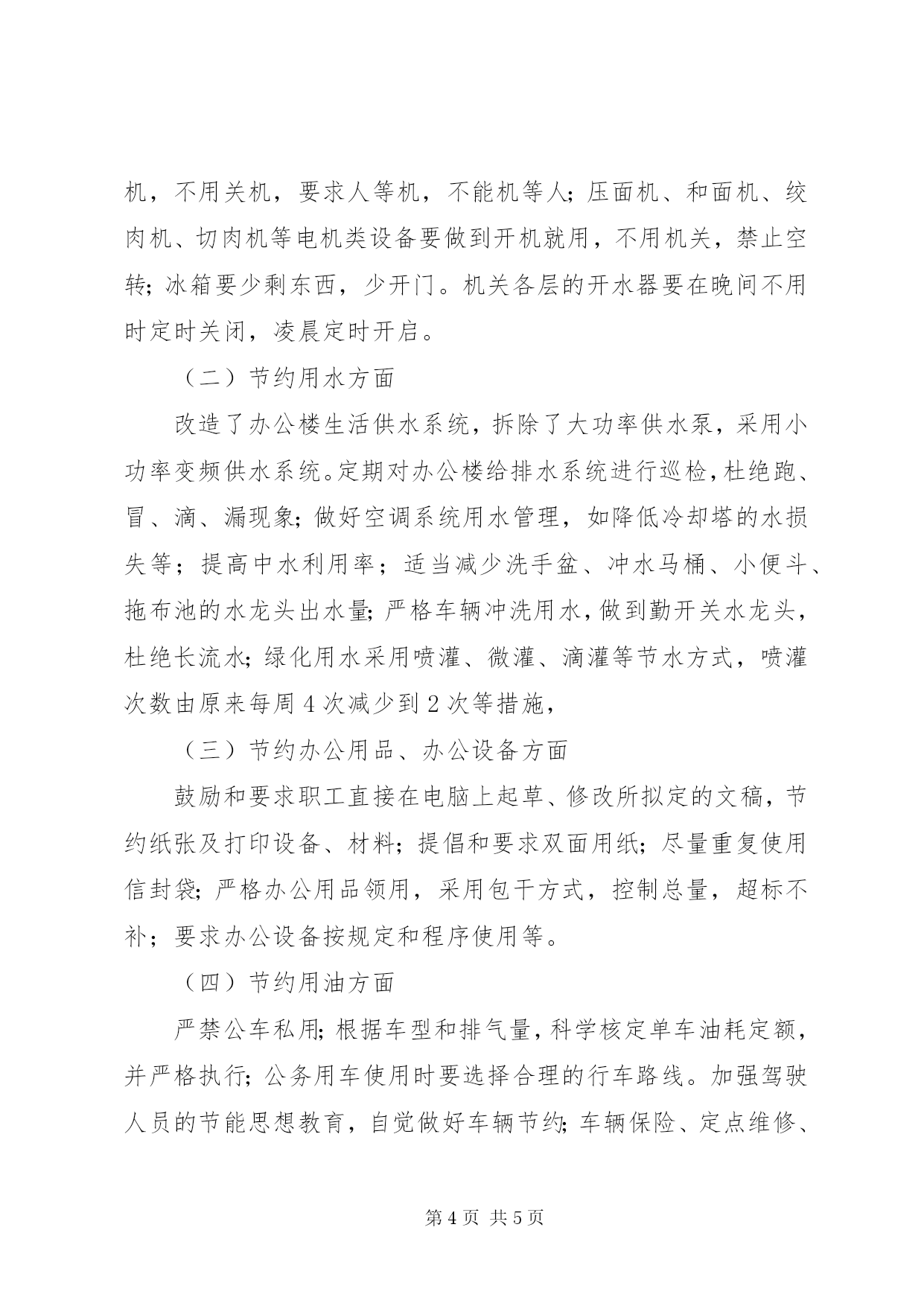第PAGE\*Arabic\*MERGEFORMAT5页共NUMPAGES\*MERGEFORMAT5页开发区公共机构节能单位推荐材料编者按:本文主要从领导高度重视,狠抓组织落实;加强宣传教育,增强节约意识;制定具体措施,确保取得实效进行讲述。其中,主要包括:为全面贯彻落实党中央、国务院、省、市关于建设节约型社会的要求、增强机关职工资源节约意识,形成崇尚节约的好风气、节约用电方面、节约用水方面、节约办公用品、办公设备方面、节约用油方面、充分利用机关一层大厅电子屏、宣传栏等,宣传资源节约的基本知识、根据国家发改委等十四部门联合下发的《关于开展2009年节能宣传周活动安排意见》的通知精神、是在机关内外人员聚集地张贴了5套节能宣传图画等,具体材料请详见:开展资源节约活动,是实现国民经济持续快速协调健康发展的有效途径;是转变经济增长方式,走新兴工业化道路,实现全面建设小康社会目标的重要措施;是落实科学发展观、促进人与自然和谐发展的必然要求。根据党中央、国务院、省、市关于开展公共机构节能工作的有关文件精神和要求,机管局开展了形式多样的资源节约活动,取得了初步成效。一、领导高度重视,狠抓组织落实为全面贯彻落实党中央、国务院、省、市关于建设节约型社会的要求,区管委会成立了机关公共机构节能活动领导小组和办公室,领导亲自参与研究制定开展资源节约活动的工作方案和相关措施,并要求机关各部门指定一名领导同志负责本部门资源节约工作,明确责任,科学合理地设置考核指标,实行量化管理,把资源节约的指标落实到每个部门、每个岗位。加强对资源节约的监督检查,总结经验,发现问题,采取措施,认真整改,促进节约。二、加强宣传教育,增强节约意识为增强机关职工资源节约意识,形成崇尚节约的好风气,把党党中央、国务院、省、市关于资源节约的指示精神落到实处,机管局开展了形式多样的资源节约宣传活动:一是充分利用机关一层大厅电子屏、宣传栏等,宣传资源节约的基本知识。二是根据国家发改委等十四部门联合下发的《关于开展2009年节能宣传周活动安排意见》的通知精神和开展资源节约活动的实际情况,2009年6月14日至20日,区机关举办了2009年区机关节能宣传周活动。围绕“依法节能,全民行动”的活动主题,以《节约能源法》的宣传贯彻为主线,以节电、节水、节油等为重点,对今年的宣传周活动进行了总体部署。一是制订了《2009区机关节能宣传周活动方案》;二是在一楼大厅电子屏幕显示“依法节能、全民行动”等公益字幕的活动主题口号;三是在机关内外人员聚集地张贴了5套节能宣传图画;四是印制了4条节能标语悬挂在机关周边;五是印制了350份《节能减排倡议书》和350本《南昌经开区机关节能手册》于6月16日上午向每位机关工作人员发送;六是在机关大门前设置了大型彩虹门1座,宣传气球4个。三、制定具体措施,确保取得实效根据上级部门的工作部署,结合区机关实际,我们提出了开展资源节约活动的主要工作目标和具体措施。(一)节约用电方面空调系统。定期清洗制冷机组冷凝器,提高换热效率;做好空调水管的保温,减小热损失,达到节能效果;在夏季运行之前对空调循环水泵进行维护保养工作,减小其运行能耗;调整制冷机组用电负荷率到90%;在空调循环泵上加装变频器;夏季办公楼温度控制在26摄氏度等。照明系统。所有公共区域(如走道、楼梯、车库、大厅等区域)只开一半灯具,在满足基本照明及监控需要的同时,再尽量减少走道格栅灯及卫生间灯等部分灯具内灯管数量。鼓励有窗户的办公室充分利用自然光;所有公共服务、功能房间在不用时关闭所有灯具;加强电力电容补偿的投入运行管理,提高功率因数。办公设备。工作完成之后,关闭电脑、复印机等设备;减少电脑待机时间,电脑待机1小时以上可先关机,使用时再打开;淘汰能耗大、维修费用高的旧设备。机关食堂设备。烤箱、蒸箱等热能型用电设备要做到用时开机,不用关机,要求人等机,不能机等人;压面机、和面机、绞肉机、切肉机等电机类设备要做到开机就用,不用机关,禁止空转;冰箱要少剩东西,少开门。机关各层的开水器要在晚间不用时定时关闭,凌晨定时开启。(二)节约用水方面改造了办公楼生活供水系统,拆除了大功率供水泵,采用小功率变频供水系统。定期对办公楼给排水系统进行巡检,杜绝跑、冒、滴、漏现象;做好空调系统用水管理,如降低冷却塔的水损失等;提高中水利用率;适当减少洗手盆、冲水马桶、小便斗、拖布池的水龙头出水量;严格车辆冲洗用水,做到勤开关水龙头,杜绝长流水;绿化用水采用喷灌、微灌、滴灌等节水方式,喷灌次数由原来每周4次减少到2次等措施,(三)节约办公用品、办公设备方面鼓励和要求职工直接在电脑上起草、修改所拟定的文稿,节约纸张及打印设备、材料;提倡和要求双面用纸;尽量重复使用信封袋;严格办公用品领用,采用包干方式,控制总量,超标