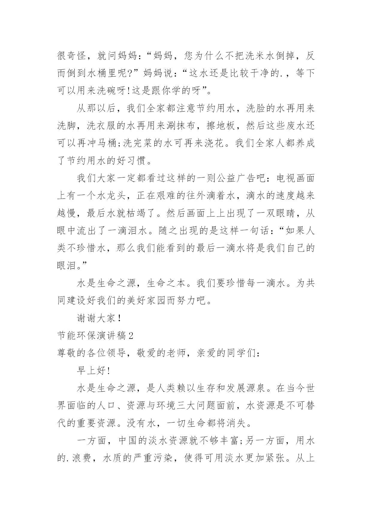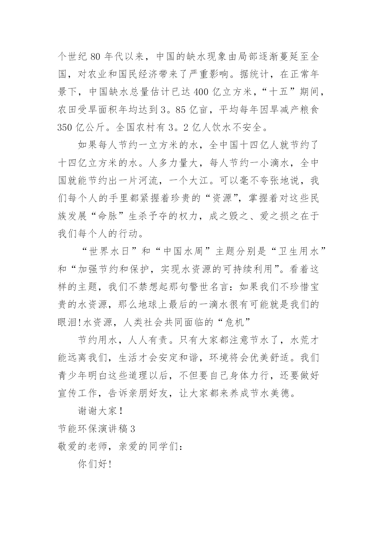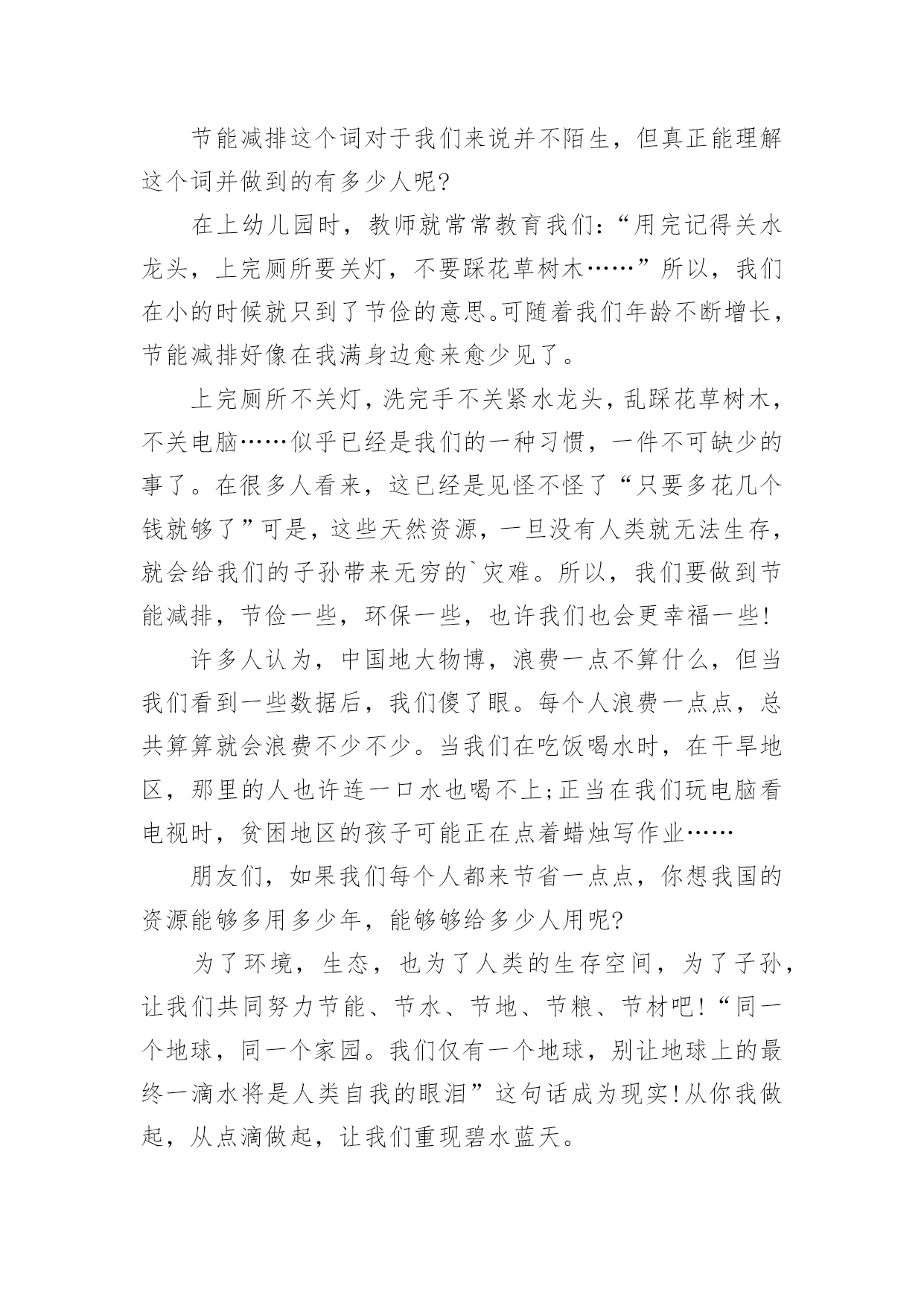 节能环保演讲稿节能环保演讲稿演讲稿要求内容充实,条理清楚,重点突出。现如今,越来越多人会去使用演讲稿,还是对演讲稿一筹莫展吗?以下是小编收集整理的节能环保演讲稿,仅供参考,欢迎大家阅读。节能环保演讲稿1亲爱的同学们:大家好!虽然我对低碳理解的不是很深,但爸爸妈妈对我说,低碳主要是指减少二氧化碳的排放,是一种节能、环保的生活方式。低碳的生活离我们每个人都很近,在日常生活中从自己做起,从小事做起,节约能源,就是低碳生活。我想,节水是节能,也是一种低碳生活吧。在学校开展“环保小卫士”活动时,有一天放学回家,我去卫生间洗手,妈妈看见了说:“你把水管开大点,这样洗得干净。我说:妈妈,我们学校正在开展”环保小卫士“活动,要节约用水,现在有很多人用不上清洁的水,我们大家都应该省着点用”。妈妈高兴的对爸爸说:我们的孩子长大了,就是不一样,你看她现在多懂事,都知道节约用水了。有一次,妈妈把洗米后的水倒进一个小水桶里,我觉得很奇怪,就问妈妈:“妈妈,您为什么不把洗米水倒掉,反而倒到水桶里呢?”妈妈说:“这水还是比较干净的.,等下可以用来洗碗呀!这是跟你学的呀”。从那以后,我们全家都注意节约用水,洗脸的水再用来洗脚,洗衣服的水再用来涮抹布,擦地板,然后这些废水还可以再冲马桶;洗完菜的水可再来浇花。我们全家人都养成了节约用水的好习惯。我们大家一定都看过这样的一则公益广告吧:电视画面上有一个水龙头,正在艰难的往外滴着水,滴水的速度越来越慢,最后水就枯竭了。然后画面上上出现了一双眼睛,从眼中流出了一滴泪水。随之出现的是这样一句话:“如果人类不珍惜水,那么我们能看到的最后一滴水将是我们自己的眼泪。”水是生命之源,生命之本。我们要珍惜每一滴水。为共同建设好我们的美好家园而努力吧。谢谢大家!节能环保演讲稿2尊敬的各位领导,敬爱的老师,亲爱的同学们:早上好!水是生命之源,是人类赖以生存和发展源泉。在当今世界面临的人口、资源与环境三大问题面前,水资源是不可替代的重要资源。没有水,一切生命都将消失。一方面,中国的淡水资源就不够丰富;另一方面,用水的.浪费,水质的严重污染,使得可用淡水更加紧张。从上个世纪80年代以来,中国的缺水现象由局部逐渐蔓延至全国,对农业和国民经济带来了严重影响。据统计,在正常年景下,中国缺水总量估计已达400亿立方米,“十五”期间,农田受旱面积年均达到3。85亿亩,平均每年因旱减产粮食350亿公斤。全国农村有3。2亿人饮水不安全。如果每人节约一立方米的水,全中国十四亿人就节约了十四亿立方米的水。人多力量大,每人节约一小滴水,全中国就能节约出一片河流,一个大江。可以毫不夸张地说,我们每个人的手里都紧握着珍贵的“资源”,掌握着对这些民族发展“命脉”生杀予夺的权力,成之毁之、爱之损之在于我们每个人的行动。“世界水日”和“中国水周”主题分别是“卫生用水”和“加强节约和保护,实现水资源的可持续利用”。看着这样的主题,我们不禁想起那句警世名言:如果我们不珍惜宝贵的水资源,那么地球上最后的一滴水很有可能就是我们的眼泪!水资源,人类社会共同面临的“危机”节约用水,人人有责。只有大家都注意节水了,水荒才能远离我们,生活才会安定和谐,环境将会优美舒适。我们青少年明白这些道理以后,不但要自己身体力行,还要做好宣传工作,告诉亲朋好友,让大家都来养成节水美德。谢谢大家!节能环保演讲稿3敬爱的老师,亲爱的同学们:你们好!节能减排这个词对于我们来说并不陌生,但真正能理解这个词并做到的有多少人呢?在上幼儿园时,教师就常常教育我们:“用完记得关水龙头,上完厕所要关灯,不要踩花草树木……”所以,我们在小的时候就只到了节俭的意思。可随着我们年龄不断增长,节能减排好像在我满身边愈来愈少见了。上完厕所不关灯,洗完手不关紧水龙头,乱踩花草树木,不关电脑……似乎已经是我们的一种习惯,一件不可缺少的事了。在很多人看来,这已经是见怪不怪了“只要多花几个钱就够了”可是,这些天然资源,一旦没有人类就无法生存,就会给我们的子孙带来无穷的`灾难。所以,我们要做到节能减排,节俭一些,环保一些,也许我们也会更幸福一些!许多人认为,中国地大物博,浪费一点不算什么,但当我们看到一些数据后,我们傻了眼。每个人浪费一点点,总共算算就会浪费不少不少。当我们在吃饭喝水时,在干旱地区,那里的人也许连一口水也喝不上;正当在我们玩电脑看电视时,贫困地区的孩子可能正在点着蜡烛写作业……朋友们,如果我们每个人都来节省一点点,你想我国的资源能够多用多少年,能够够给多少人用呢?为了环境,生态,也为了人类的生存空间,为了子孙,让我们共同努力节能、节水、节地、节粮、节材吧!“同一个地球,同一个家园。我们仅有一个地球,别让地球上的最终一滴水将是人类自我的眼泪”这句话成为现实!从你我做起,从点滴做起,让我们重现碧水蓝天。谢谢大家!节能
