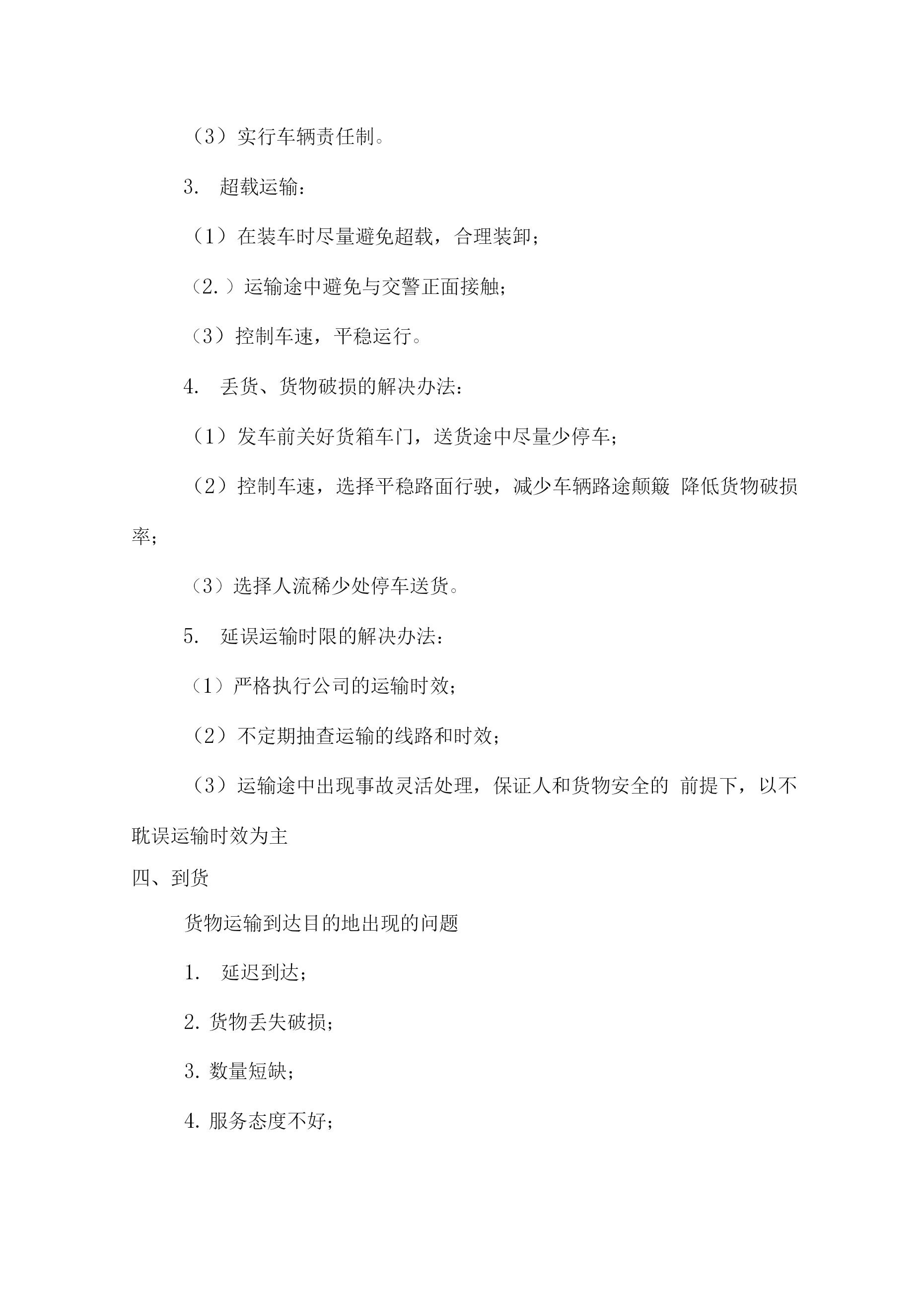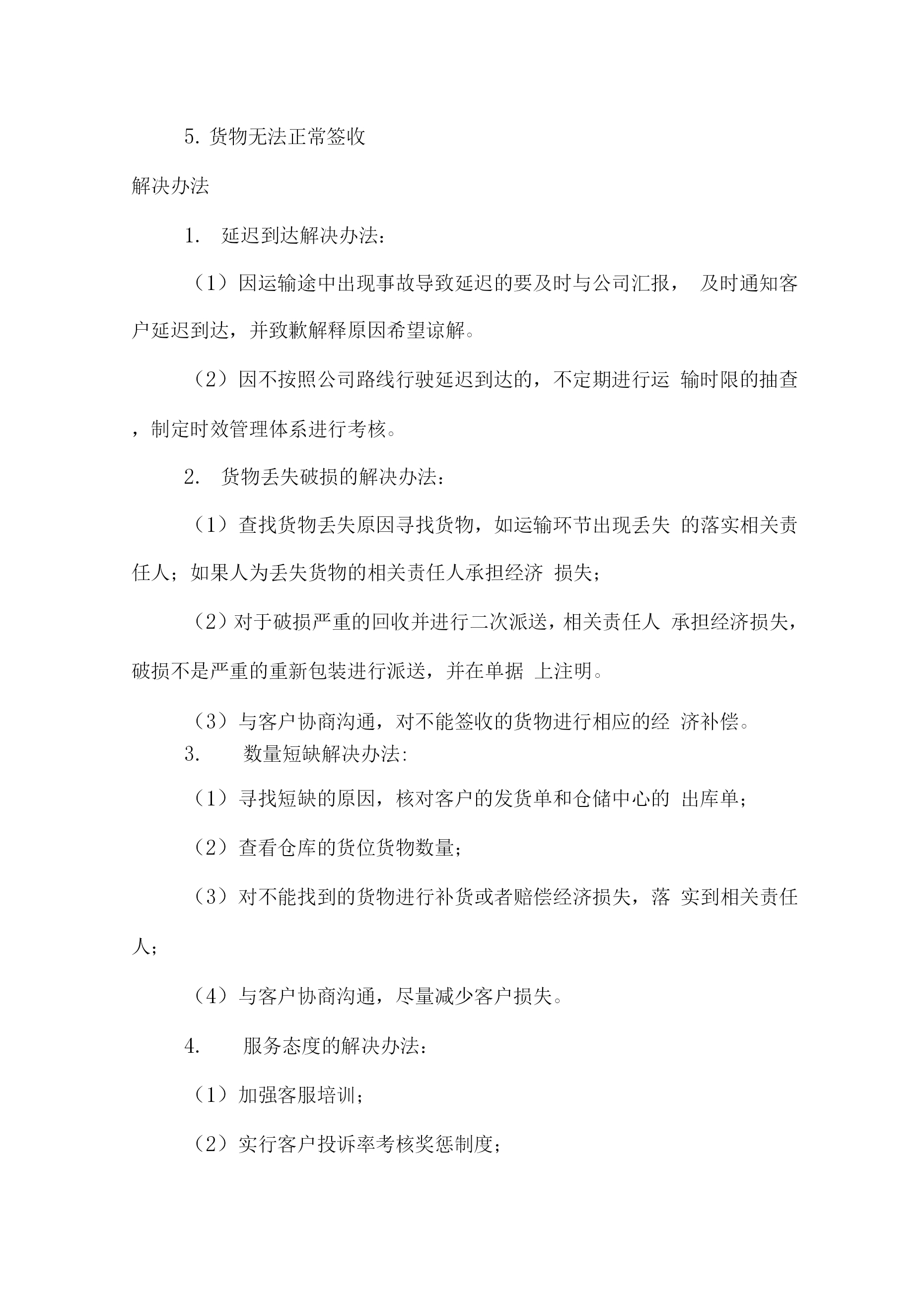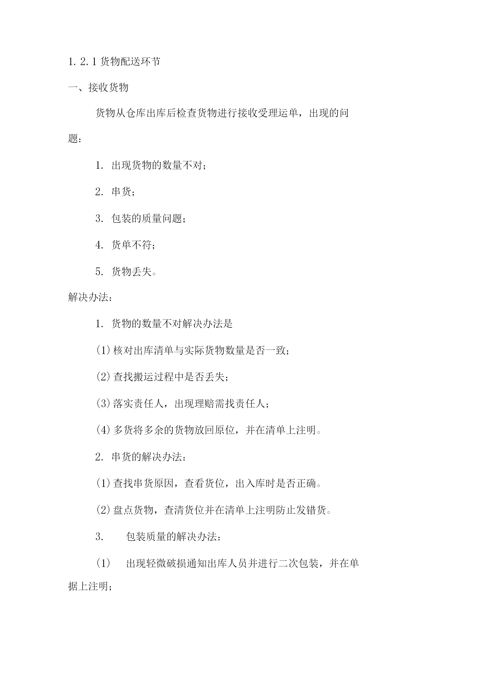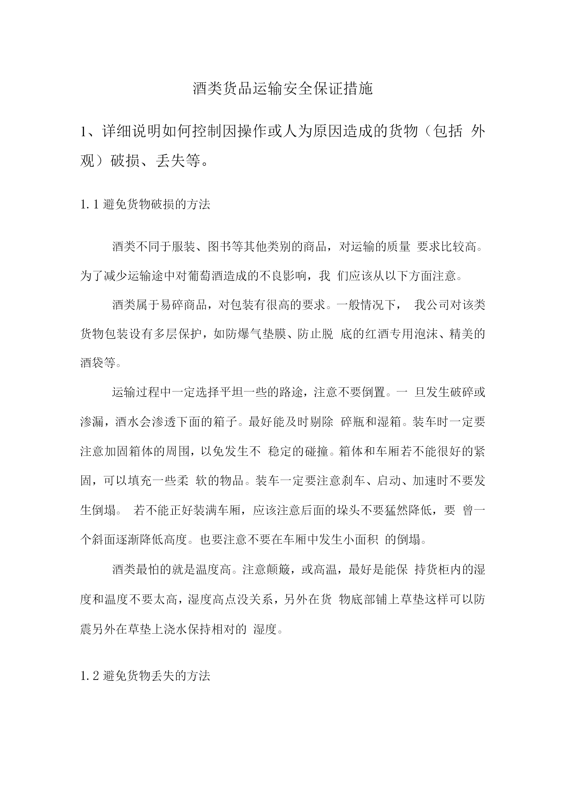 酒类货品运输安全保证措施1、详细说明如何控制因操作或人为原因造成的货物(包括外观)破损、丢失等。1.1避免货物破损的方法酒类不同于服装、图书等其他类别的商品,对运输的质量要求比较高。为了减少运输途中对葡萄酒造成的不良影响,我们应该从以下方面注意。酒类属于易碎商品,对包装有很高的要求。一般情况下,我公司对该类货物包装设有多层保护,如防爆气垫膜、防止脱底的红酒专用泡沫、精美的酒袋等。运输过程中一定选择平坦一些的路途,注意不要倒置。一旦发生破碎或渗漏,酒水会渗透下面的箱子。最好能及时剔除碎瓶和湿箱。装车时一定要注意加固箱体的周围,以免发生不稳定的碰撞。箱体和车厢若不能很好的紧固,可以填充一些柔软的物品。装车一定要注意刹车、启动、加速时不要发生倒塌。若不能正好装满车厢,应该注意后面的垛头不要猛然降低,要曾一个斜面逐渐降低高度。也要注意不要在车厢中发生小面积的倒塌。酒类最怕的就是温度高。注意颠簸,或高温,最好是能保持货柜内的湿度和温度不要太高,湿度高点没关系,另外在货物底部铺上草垫这样可以防震另外在草垫上浇水保持相对的湿度。1.2避免货物丢失的方法2.1货物配送环节一、接收货物货物从仓库出库后检查货物进行接收受理运单,出现的问题:出现货物的数量不对;串货;包装的质量问题;货单不符;货物丢失。解决办法:货物的数量不对解决办法是核对出库清单与实际货物数量是否一致;查找搬运过程中是否丢失;落实责任人,出现理赔需找责任人;多货将多余的货物放回原位,并在清单上注明。串货的解决办法:查找串货原因,查看货位,出入库时是否正确。盘点货物,查清货位并在清单上注明防止发错货。包装质量的解决办法:出现轻微破损通知出库人员并进行二次包装,并在单据上注明;对于破损严重的出现少货的查找原因将责任落实到相关人员。货单不符解决办法:仔细核对入库单据是否是商户所发出的货物。核对配货清单是否是录入出现失误,是的话作废单据并重新作单。检查出库时是否出现串货,如果是串货及时处理,落实责任人。货物丢失的解决办法:寻找货物,确认丢失后补货或者赔偿经济损失;查看监控系统,落实责任人,追究责任人的责任。一也化一、发贝配送订单下出准备发货时出现的问题:运单录入错误,货物数量、目的地、联系电话等录入不准确;装车不合理导致空车率、货物破损率过高;客户订单变更,货物数量增加或减少;配送车辆准备不足导致货物不能及时发出解决办法:单据录入错误的解决办法是(1)仔细录入单据,录完单据二次检查核对单据;(2)录入单据出差率考核,实行奖惩机制。装车不合理的解决办法:(1)合理装卸货物进行岗前培训(大不压小、重不压轻等);(2)严格按照配送单据装货,保证货单相符合;(3)就近装货,路途较近的货物装在车外边,较远的货物放在里边,方便卸货。配送车辆准备不足的解决办法是(1)合理安排车辆,配送车辆实行班车制度,做到统一安排、统一调度;(2)根据货量提前准备车辆,保证每辆车满载;(3)准备备用车辆。三、运输货物在运输途中出现的问题:运输路线不合理,不按照公司规定路线行驶;运输途中车辆损坏;超载运输;出现运输事故如丢货、货物破损等;延误运输时间解决办法:运输路线不合理解决办法:(1)严格执行公司运输路线,通过燃油费成本进行控制;(2)营运专员实地测量运输路线,以燃油费最低,运输路线安全可靠为标准制定最优运输路线。运输中车辆损坏的解决办法:(1)留有备用车辆;(2)定期进行车辆检查、保养、维修;(3)实行车辆责任制。超载运输:(1)在装车时尽量避免超载,合理装卸;(2.)运输途中避免与交警正面接触;(3)控制车速,平稳运行。丢货、货物破损的解决办法:(1)发车前关好货箱车门,送货途中尽量少停车;(2)控制车速,选择平稳路面行驶,减少车辆路途颠簸降低货物破损率;(3)选择人流稀少处停车送货。延误运输时限的解决办法:(1)严格执行公司的运输时效;(2)不定期抽查运输的线路和时效;(3)运输途中出现事故灵活处理,保证人和货物安全的前提下,以不耽误运输时效为主四、到货货物运输到达目的地出现的问题延迟到达;货物丢失破损;数量短缺;服务态度不好;货物无法正常签收解决办法延迟到达解决办法:(1)因运输途中出现事故导致延迟的要及时与公司汇报,及时通知客户延迟到达,并致歉解释原因希望谅解。(2)因不按照公司路线行驶延迟到达的,不定期进行运输时限的抽查,制定时效管理体系进行考核。货物丢失破损的解决办法:(1)查找货物丢失原因寻找货物,如运输环节出现丢失的落实相关责任人;如果人为丢失货物的相关责任人承担经济损失;(2)对于破损严重的回收并进行二次派送