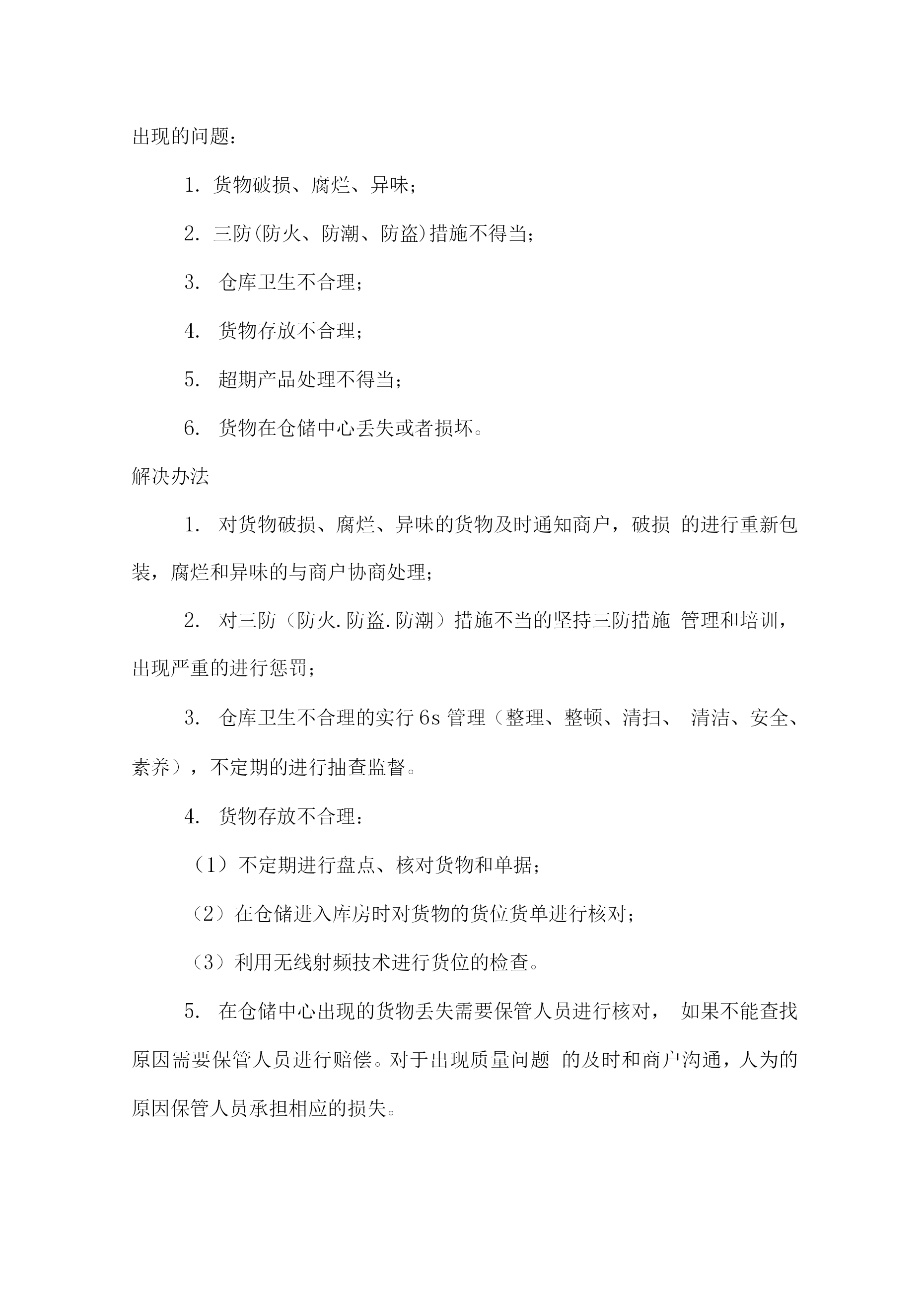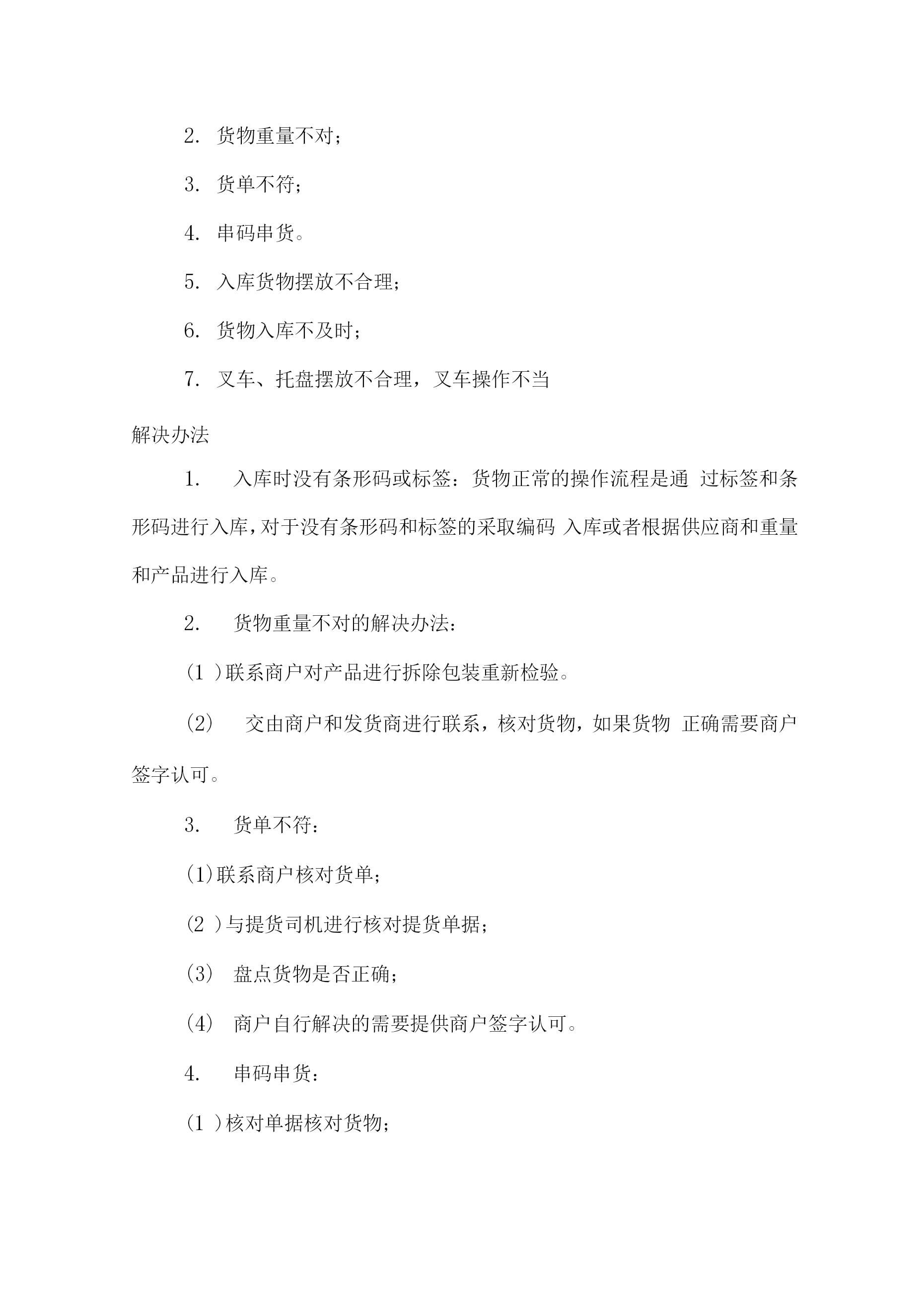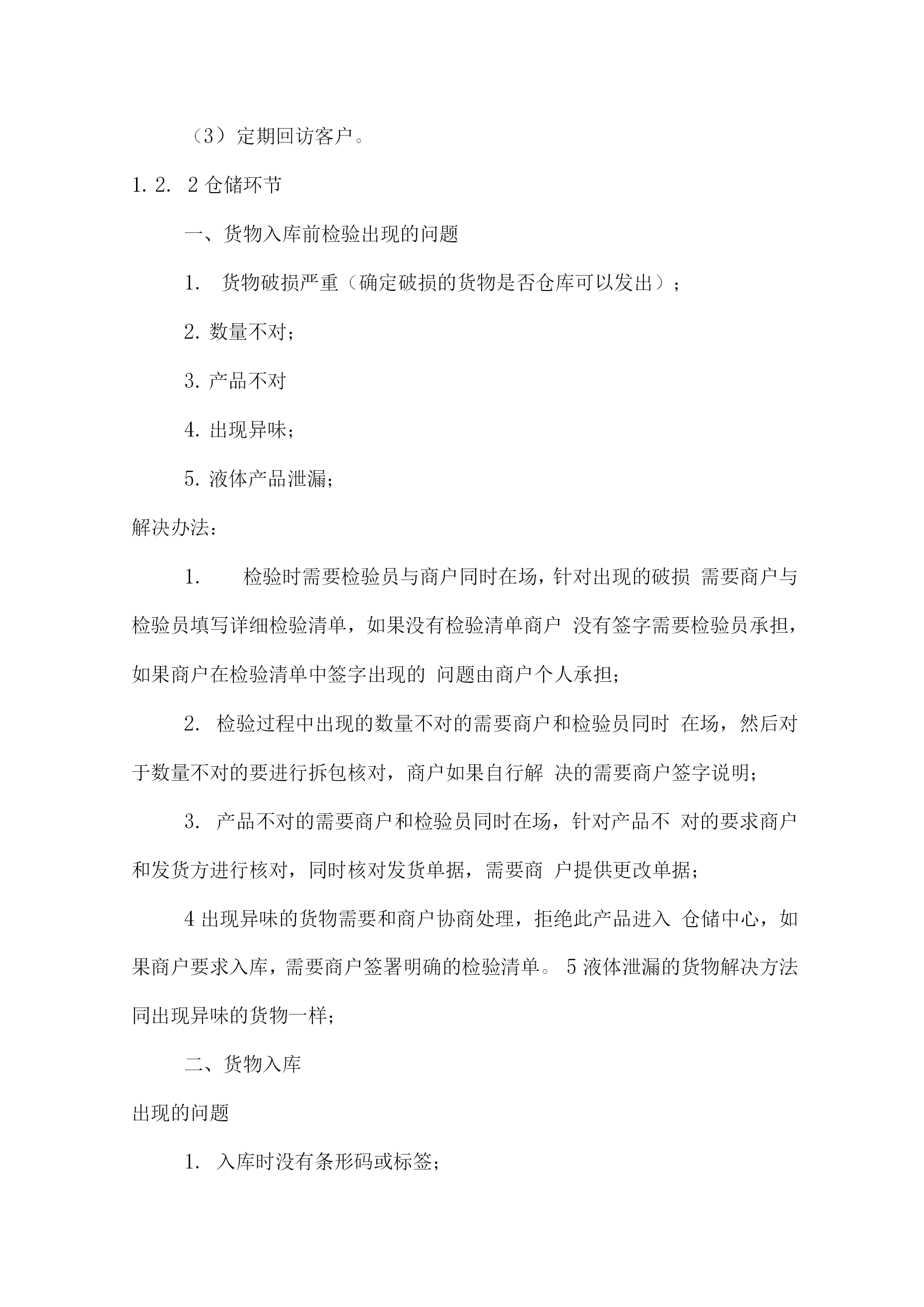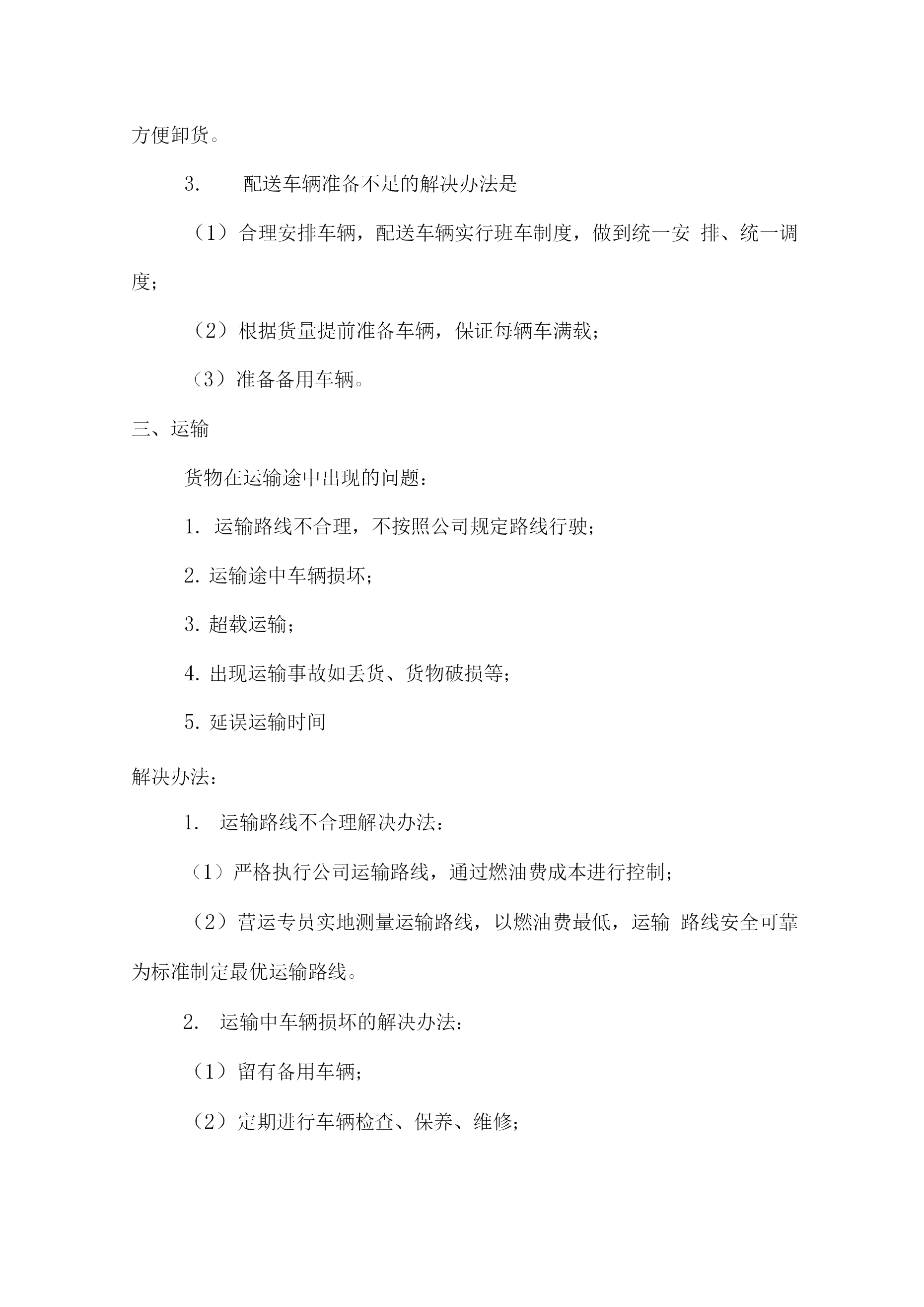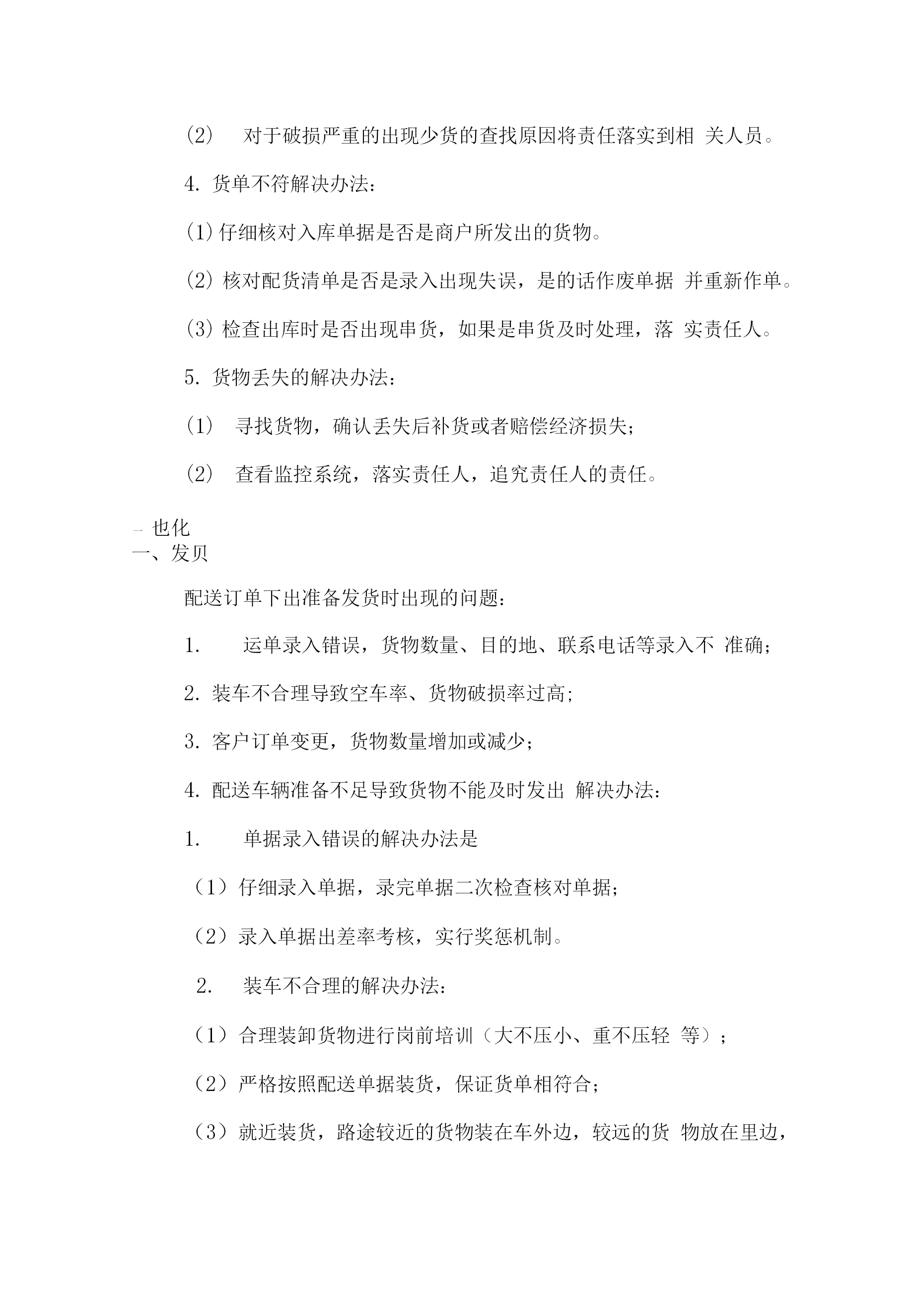 酒类货品运输安全保证措施1、详细说明如何控制因操作或人为原因造成的货物(包括外观)破损、丢失等。1.1避免货物破损的方法酒类不同于服装、图书等其他类别的商品,对运输的质量要求比较高。为了减少运输途中对葡萄酒造成的不良影响,我们应该从以下方面注意。酒类属于易碎商品,对包装有很高的要求。一般情况下,我公司对该类货物包装设有多层保护,如防爆气垫膜、防止脱底的红酒专用泡沫、精美的酒袋等。运输过程中一定选择平坦一些的路途,注意不要倒置。一旦发生破碎或渗漏,酒水会渗透下面的箱子。最好能及时剔除碎瓶和湿箱。装车时一定要注意加固箱体的周围,以免发生不稳定的碰撞。箱体和车厢若不能很好的紧固,可以填充一些柔软的物品。装车一定要注意刹车、启动、加速时不要发生倒塌。若不能正好装满车厢,应该注意后面的垛头不要猛然降低,要曾一个斜面逐渐降低高度。也要注意不要在车厢中发生小面积的倒塌。酒类最怕的就是温度高。注意颠簸,或高温,最好是能保持货柜内的湿度和温度不要太高,湿度高点没关系,另外在货物底部铺上草垫这样可以防震另外在草垫上浇水保持相对的湿度。1.2避免货物丢失的方法2.1货物配送环节一、接收货物货物从仓库出库后检查货物进行接收受理运单,出现的问题:出现货物的数量不对;串货;包装的质量问题;货单不符;货物丢失。解决办法:货物的数量不对解决办法是核对出库清单与实际货物数量是否一致;查找搬运过程中是否丢失;落实责任人,出现理赔需找责任人;多货将多余的货物放回原位,并在清单上注明。串货的解决办法:查找串货原因,查看货位,出入库时是否正确。盘点货物,查清货位并在清单上注明防止发错货。包装质量的解决办法:出现轻微破损通知出库人员并进行二次包装,并在单据上注明;对于破损严重的出现少货的查找原因将责任落实到相关人员。货单不符解决办法:仔细核对入库单据是否是商户所发出的货物。核对配货清单是否是录入出现失误,是的话作废单据并重新作单。检查出库时是否出现串货,如果是串货及时处理,落实责任人。货物丢失的解决办法:寻找货物,确认丢失后补货或者赔偿经济损失;查看监控系统,落实责任人,追究责任人的责任。一也化一、发贝配送订单下出准备发货时出现的问题:运单录入错误,货物数量、目的地、联系电话等录入不准确;装车不合理导致空车率、货物破损率过高;客户订单变更,货物数量增加或减少;配送车辆准备不足导致货物不能及时发出解决办法:单据录入错误的解决办法是(1)仔细录入单据,录完单据二次检查核对单据;(2)录入单据出差率考核,实行奖惩机制。装车不合理的解决办法:(1)合理装卸货物进行岗前培训(大不压小、重不压轻等);(2)严格按照配送单据装货,保证货单相符合;(3)就近装货,路途较近的货物装在车外边,较远的货物放在里边,方便卸货。配送车辆准备不足的解决办法是(1)合理安排车辆,配送车辆实行班车制度,做到统一安排、统一调度;(2)根据货量提前准备车辆,保证每辆车满载;(3)准备备用车辆。三、运输货物在运输途中出现的问题:运输路线不合理,不按照公司规定路线行驶;运输途中车辆损坏;超载运输;出现运输事故如丢货、货物破损等;延误运输时间解决办法:运输路线不合理解决办法:(1)严格执行公司运输路线,通过燃油费成本进行控制;(2)营运专员实地测量运输路线,以燃油费最低,运输路线安全可靠为标准制定最优运输路线。运输中车辆损坏的解决办法:(1)留有备用车辆;(2)定期进行车辆检查、保养、维修;(3)实行车辆责任制。超载运输:(1)在装车时尽量避免超载,合理装卸;(2.)运输途中避免与交警正面接触;(3)控制车速,平稳运行。丢货、货物破损的解决办法:(1)发车前关好货箱车门,送货途中尽量少停车;(2)控制车速,选择平稳路面行驶,减少车辆路途颠簸降低货物破损率;(3)选择人流稀少处停车送货。延误运输时限的解决办法:(1)严格执行公司的运输时效;(2)不定期抽查运输的线路和时效;(3)运输途中出现事故灵活处理,保证人和货物安全的前提下,以不耽误运输时效为主四、到货货物运输到达目的地出现的问题延迟到达;货物丢失破损;数量短缺;服务态度不好;货物无法正常签收解决办法延迟到达解决办法:(1)因运输途中出现事故导致延迟的要及时与公司汇报,及时通知客户延迟到达,并致歉解释原因希望谅解。(2)因不按照公司路线行驶延迟到达的,不定期进行运输时限的抽查,制定时效管理体系进行考核。货物丢失破损的解决办法:(1)查找货物丢失原因寻找货物,如运输环节出现丢失的落实相关责任人;如果人为丢失货物的相关责任人承担经济损失;(2)对于破损严重的回收并进行二次派送