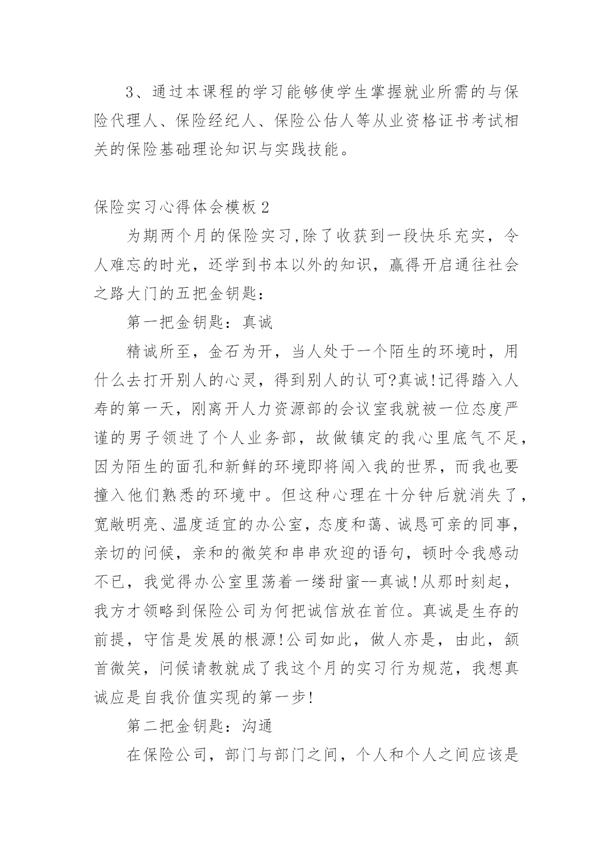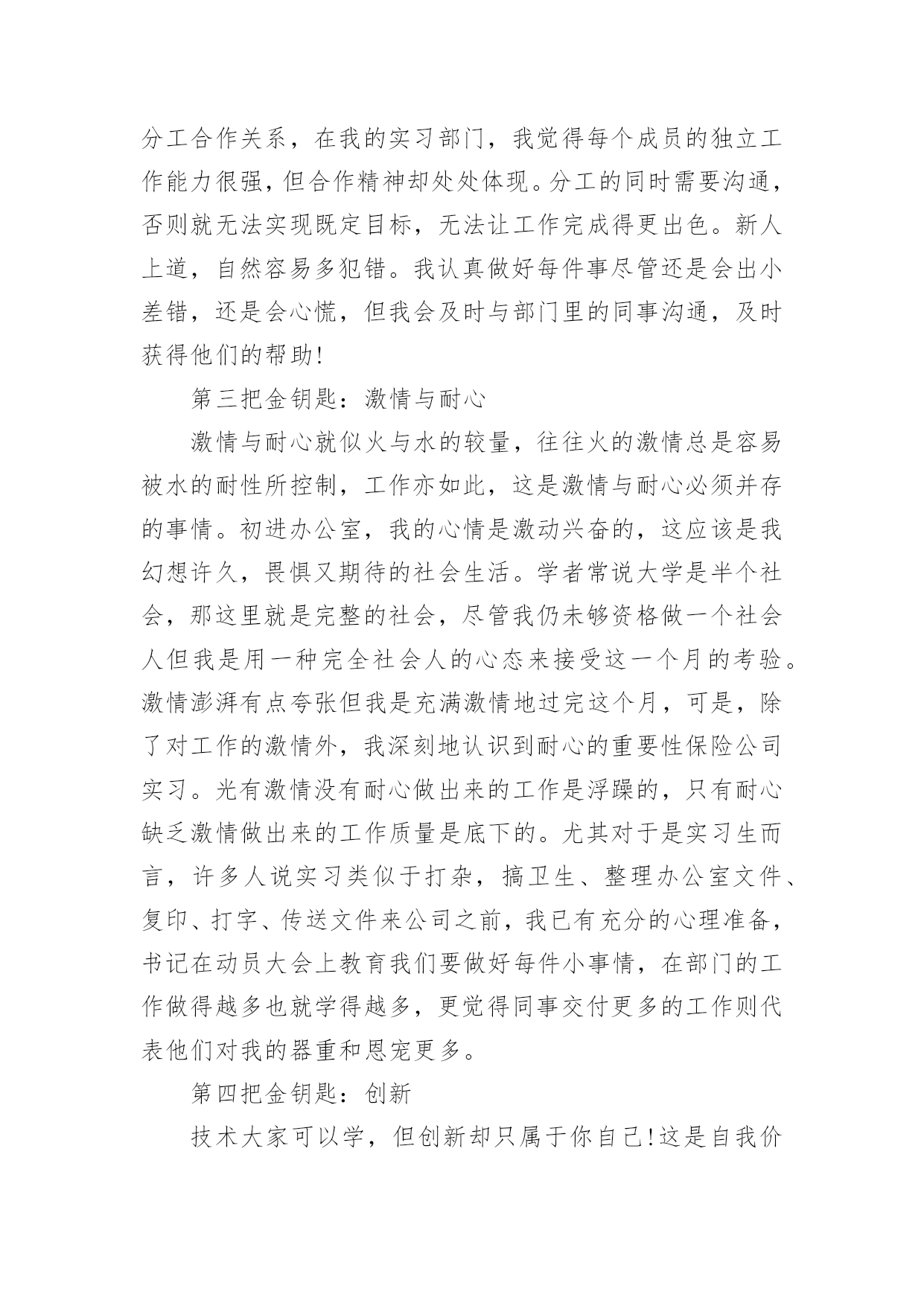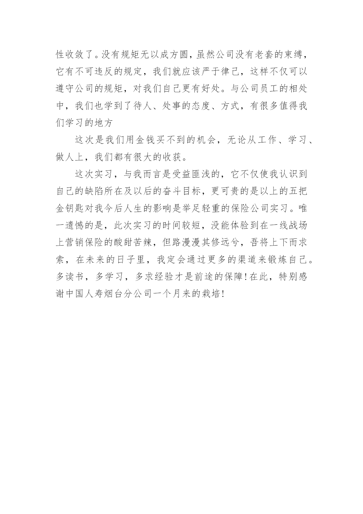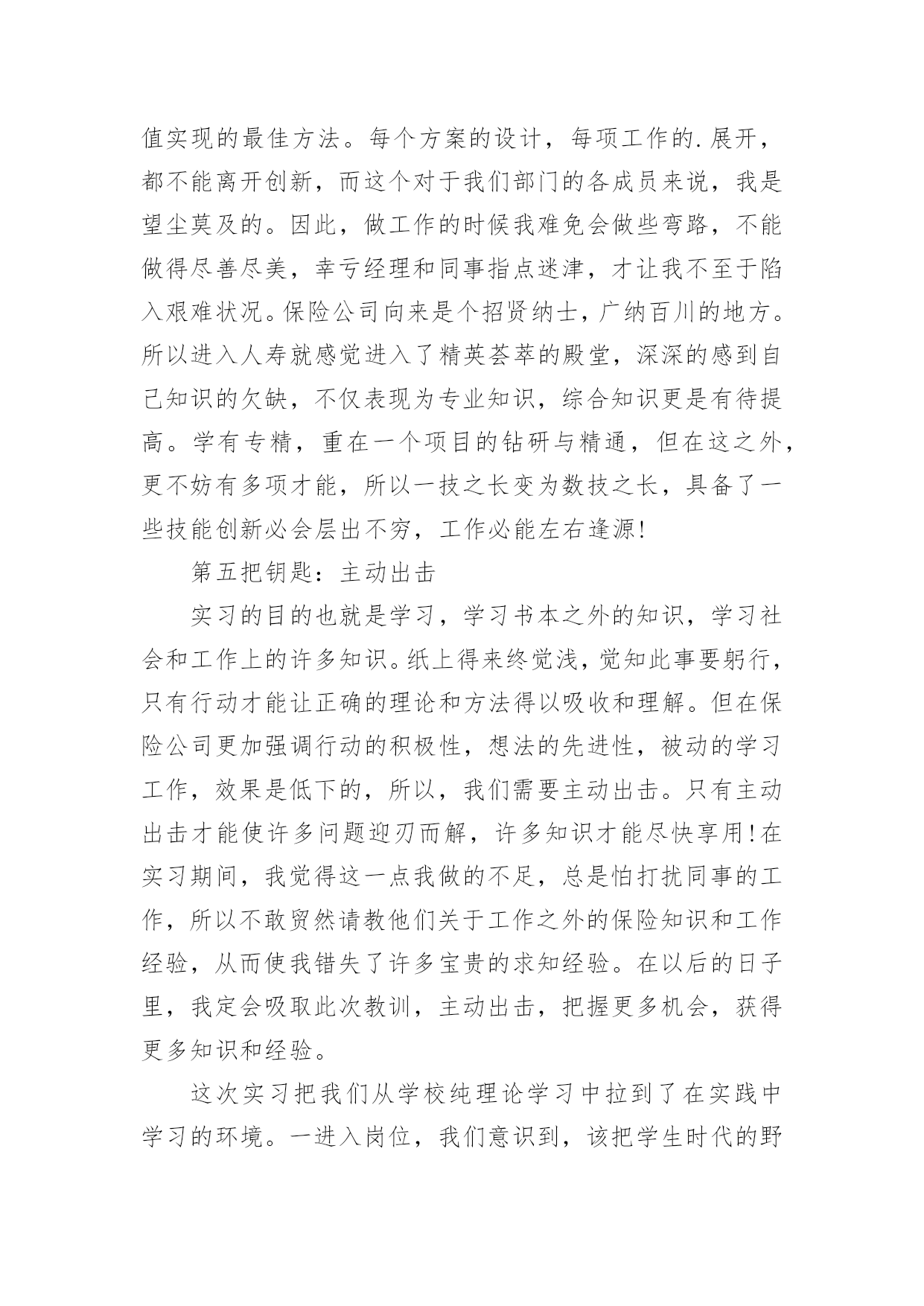 保险实习心得体会保险实习心得体会模板我们在一些事情上受到启发后,不妨将其写成一篇心得体会,让自己铭记于心,这样就可以通过不断总结,丰富我们的思想。很多人都十分头疼怎么写一篇精彩的心得体会,下面是小编为大家整理的保险实习心得体会模板,仅供参考,希望能够帮助到大家。保险实习心得体会模板1这学期,我们上了保险学课程,通过学习使我收获颇丰。1、xxx老师为学生提供了一个全新的学习方法,在与现实的对接中深化理解,了解所需所求,吸引学生,激发了学习热情。xxx老师的教学能将理论和实践结合起来,注重案例教学,贴近我们的日常生活。特别是针对一些重点难点讲的非常细致。2、通过学习使我们对保险公司的现状有了初步的认识,对保险学这门课有了一个比较具体、形象化的认识,调动了学习的积极性。3、在保险学案例分析中,xx教师通常不给出标准答案,先启发我们思考再总结归纳结论。保险案例涉及的知识面广,综合性强,学生发挥创造性的空间大,不拘泥于某一思维倾向,从而拓宽我们的思路,积极思维,想方设法地研究分析、解决问题。学生能够畅所欲言、各抒己见、交流辩论。在交流、合作的过程中学生学会了相互沟通、尊重他人、关心他人,同时也增强了他们说服别人以及聆听他人、综合他人智慧的能力。4、保险学学习使我们在校期间就能通过案例学习熟悉保险公司经营管理实务;切实理解保险概念、理论和原理。能够紧密结合当前国内外经济金融环境和保险改革发展实际,吸收保险研究的新成果,反映保险市场的新动向,使我们不仅掌握保险专业的基本原理,而且还能紧跟保险业发展的脚步,站在时代的前沿,拓宽专业知识视野。通过本课程的学习,使同学们对保险学科的基础理论、保险学的基础知识、保险基本业务以及保险市场基本运行方式有较全面的认识和了解;学习本课程后,同学们对保险业在市场经济、金融经济中的特殊作用有宏观上的认识,对各种具体的保险业务的具体业务程序、市场操作等也要有较为系统的了解和把握。1、通过本课程的学习,使学生能够比较准确地掌握保险学的基础理论和基础知识,了解各项保险业务的实际操作手段和方法,熟悉保险市场动作的基本规则,知悉保险学术研究的最新进展;2、使学生能够了解保险理论和实务的变化与发展历程,将保险专业基础知识融会贯通于保险理论研究与实务操作之中;3、通过本课程的学习能够使学生掌握就业所需的与保险代理人、保险经纪人、保险公估人等从业资格证书考试相关的保险基础理论知识与实践技能。保险实习心得体会模板2为期两个月的保险实习,除了收获到一段快乐充实,令人难忘的时光,还学到书本以外的知识,赢得开启通往社会之路大门的五把金钥匙:第一把金钥匙:真诚精诚所至,金石为开,当人处于一个陌生的环境时,用什么去打开别人的心灵,得到别人的认可?真诚!记得踏入人寿的第一天,刚离开人力资源部的会议室我就被一位态度严谨的男子领进了个人业务部,故做镇定的我心里底气不足,因为陌生的面孔和新鲜的环境即将闯入我的世界,而我也要撞入他们熟悉的环境中。但这种心理在十分钟后就消失了,宽敞明亮、温度适宜的办公室,态度和蔼、诚恳可亲的同事,亲切的问候,亲和的微笑和串串欢迎的语句,顿时令我感动不已,我觉得办公室里荡着一缕甜蜜--真诚!从那时刻起,我方才领略到保险公司为何把诚信放在首位。真诚是生存的前提,守信是发展的根源!公司如此,做人亦是,由此,颔首微笑,问候请教就成了我这个月的实习行为规范,我想真诚应是自我价值实现的第一步!第二把金钥匙:沟通在保险公司,部门与部门之间,个人和个人之间应该是分工合作关系,在我的实习部门,我觉得每个成员的独立工作能力很强,但合作精神却处处体现。分工的同时需要沟通,否则就无法实现既定目标,无法让工作完成得更出色。新人上道,自然容易多犯错。我认真做好每件事尽管还是会出小差错,还是会心慌,但我会及时与部门里的同事沟通,及时获得他们的帮助!第三把金钥匙:激情与耐心激情与耐心就似火与水的较量,往往火的激情总是容易被水的耐性所控制,工作亦如此,这是激情与耐心必须并存的事情。初进办公室,我的心情是激动兴奋的,这应该是我幻想许久,畏惧又期待的社会生活。学者常说大学是半个社会,那这里就是完整的社会,尽管我仍未够资格做一个社会人但我是用一种完全社会人的心态来接受这一个月的考验。激情澎湃有点夸张但我是充满激情地过完这个月,可是,除了对工作的激情外,我深刻地认识到耐心的重要性保险公司实习。光有激情没有耐心做出来的工作是浮躁的,只有耐心缺乏激情做出来的工作质量是底下的。尤其对于是实习生而言,许多人说实习类似于打杂,搞卫生、整理办公室文件、复印、打字、传送文件来公司之前,我已有充分的心理准备,书记在动员大会上教育我们要做好每件小事情,在部门的工作做得越多也就学得越多,更觉得同事交付更多的工作则代表他们对我的器重和恩宠更多。第四把金钥匙:创新技术大家可以学