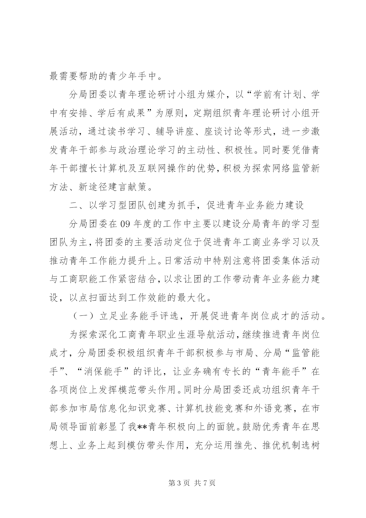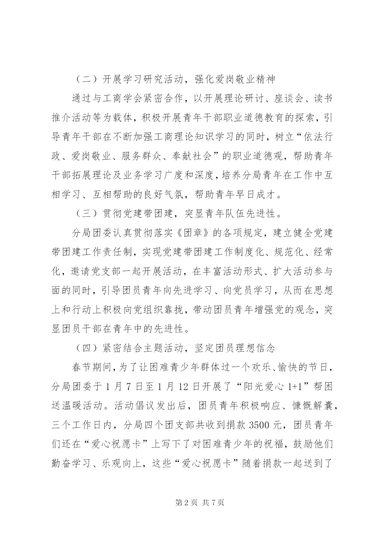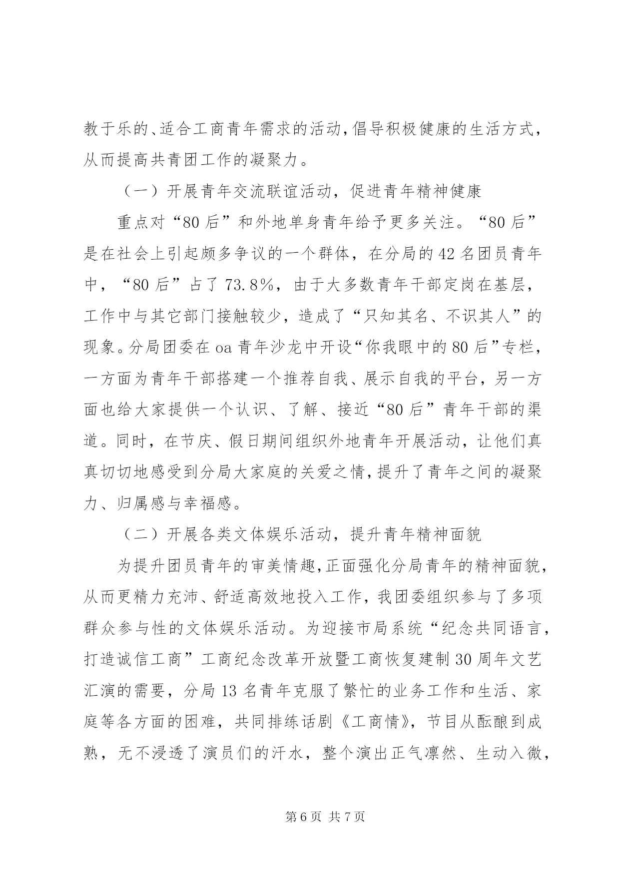 第PAGE\*Arabic\*MERGEFORMAT7页共NUMPAGES\*MERGEFORMAT7页工商局团委工作汇报2009年以来,工商**分局团委在分局党委的领导下,在团区委和市局团委的带领下,以邓小平理论和“科学发展观”重要思想为指导,深入贯彻落实科学发展观,紧紧围绕党政中心工作和青年实际需求,着力于在思想上引导和教育团员青年,业务上带动和提高团员青年,生活上关心和照顾团员青年,努力为团员青年成长成才营造良好环境。一、以主旋律集体活动为抓手,促进青年思想道德建设分局团委紧紧围绕“学习实践科学发展观”这一主线,以主旋律集体活动为抓手,加强对团员青年的思想政治教育,使之养成与社会主义市场经济发展、工商事业发展和工商文化发展相适应的道德观念和行为规范,促使分局青年不断地学习进取、不断地积聚力量、不断地提升自身素质,最终形成自身“行事正、自身清、过得硬”的新时代特征。(一)依托各类宣传载体,加强思想教育建设分局团委为拓展学习载体,充分运用局域网邮箱和oa系统“青年沙龙”板块等有效载体,切实发挥网络宣传和青年参与的互动作用,该板块及时公布团员青年的成绩与荣誉,发布时政评论、理论热点,发表人生感悟、工作体验,引导团员青年加强自我修养,提升认识水平,使团员青年学得生动、学有所获、学以致用。(二)开展学习研究活动,强化爱岗敬业精神通过与工商学会紧密合作,以开展理论研讨、座谈会、读书推介活动等为载体,积极开展青年干部职业道德教育的探索,引导青年干部在不断加强工商理论知识学习的同时,树立“依法行政、爱岗敬业、服务群众、奉献社会”的职业道德观,帮助青年干部拓展理论及业务学习广度和深度,培养分局青年在工作中互相学习、互相帮助的良好气氛,帮助青年早日成才。(三)贯彻党建带团建,突显青年队伍先进性。分局团委认真贯彻落实《团章》的各项规定,建立健全党建带团建工作责任制,实现党建带团建工作制度化、规范化、经常化,邀请党支部一起开展活动,在丰富活动形式、扩大活动参与面的同时,引导团员青年向先进学习、向党员学习,从而在思想上和行动上积极向党组织靠拢,带动团员青年增强党的观念,突显团员干部在青年中的先进性。(四)紧密结合主题活动,坚定团员理想信念春节期间,为了让困难青少年群体过一个欢乐、愉快的节日,分局团委于1月7日至1月12日开展了“阳光爱心1+1”帮困送温暖活动。活动倡议发出后,团员青年积极响应、慷慨解囊,三个工作日内,分局四个团支部共收到捐款3500元,团员青年们还在“爱心祝愿卡”上写下了对困难青少年的祝福,鼓励他们勤奋学习、乐观向上,这些“爱心祝愿卡”随着捐款一起送到了最需要帮助的青少年手中。分局团委以青年理论研讨小组为媒介,以“学前有计划、学中有安排、学后有成果”为原则,定期组织青年理论研讨小组开展活动,通过读书学习、辅导讲座、座谈讨论等形式,进一步激发青年干部参与政治理论学习的主动性、积极性。同时要凭借青年干部擅长计算机及互联网操作的优势,积极为探索网络监管新方法、新途径建言献策。二、以学习型团队创建为抓手,促进青年业务能力建设分局团委在09年度的工作中主要以建设分局青年的学习型团队为主,将团委的主要活动定位于促进青年工商业务学习以及推动青年工作能力提升上。日常活动中特别注意将团委集体活动与工商职能工作紧密结合,以求让团的工作带动青年业务能力建设,以点扫面达到工作效能的最大化。(一)立足业务能手评选,开展促进青年岗位成才的活动。为探索深化工商青年职业生涯导航活动,继续推进青年岗位成才,分局团委积极组织青年干部积极参与市局、分局“监管能手”、“消保能手”的评比,让业务确有专长的“青年能手”在各项岗位上发挥模范带头作用。同时分局团委还成功组织青年干部参加市局信息化知识竞赛、计算机技能竞赛和外语竞赛,在市局领导面前彰显了我**青年积极向上的面貌。鼓励优秀青年在思想上、业务上起到模仿带头作用,充分运用推先、推优机制选树典型、弘扬先进,使更多的青年人才脱颖而出,并进一步充实和完善青年人才库的信息,实现团组织育人机制的长效化。(二)立足工商服务,开展提升青年业务水平的公益活动。为让分局青年在红盾维权进社区、进校区等消费维权活动中,更好地发挥生力军作用,促使工商消费维权触角得到进一步延伸,将青年志愿者服务与履行工商职能更加紧密地结合在一起。我局团委组织党团员青年以青年志愿者的形式积极投身到“3.5学雷锋”、“3.15维权咨询”、“4.26知识产权维权保护咨询”等活动当中。此举在业余时间进一步提升了工作中解决实际问题的能力,极大的推动了青年干部们爱岗敬业的工作热情。(三)立足“迎世博”契机,展倡导文明风尚的志愿者活动。充分调动青年干部参与世博、服务世博、奉献世博的热情,带领青年干部积极参加“青春世博”志愿行动,进一步弘扬“奉献、友爱