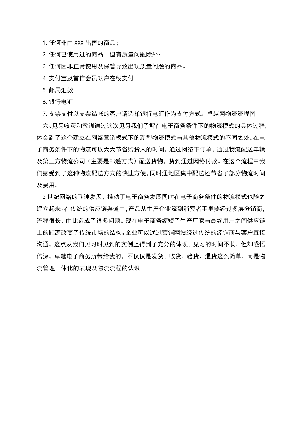 电大物流管理专业见习报告卓越网电子商务条件下物流模式的考察见习目的:详细了解卓越网商品网上购买到实际配送的流程二、见习时间:20__年5月日三、见习地点:广州市番禺区卓越南XX简介:卓越网,成立于20__年。作为全球最大网上商城XX公司的第七个主力站点,目前已经成为中国规模最大、品种最全、综合实力最强的网络购物商城之一。四、见习过程按照实践环节计划安排,我人来到北京XX公司,我们在公司市场运营部工作人员的带领下参观公司的相关部门,并听取工作人员的详细解说。讲解人员首先介绍了卓越公司的配送范围,在33个城市开通送货上门服务,这些城市不仅有各个省份的一线城市,连很多省份的县级市都包括在内,例如在河北省包括定州、河间等县级市。并且是先送货上门,货到再收取配送费用。同时,承诺送货时间内不能送达,公司会退还加急配送费用。首先,北京市房山区有客户从卓越网站选购了一本英汉大词典定价228元,网上生成订单后,购买者会根据提示给公司客服部门打电话确认,经过确认的订单转给公司市场运营部,运营部工作人员把当天确认的所有去往房山方向的订单汇总,然后把汇总后的订单转给负责商品配送的相关工作人员,配送人员把货物按照订单提出,由公司物流车辆送货(不在本市的采用雇用第三方物流公司配送),到达指定地点后和客户电话联系验收商品,并在订单上签字确认。客户可以选择卓越网多种支付方式;1.货到付款货到时使用移动POS机刷卡支付,客户请选择货到付款作为支付方式。移动POS机刷卡付款仅限北京、天津、上海、广州市XX,并且只有部分配送员带有移动POS机,但不是全部。商品总额大于20000元的订单需先行收款后才能发货,不支持货到付款方式支付。请您选择其它支付方式。2.国内银行卡或信用卡在线支付如果您选择银行卡支付并且用户名不是电子邮件形式,请先到我的帐户”将您的注册用户名修改为电子邮件形式后再选择银行卡支付。3.电子帐户在线支付退货总则卓越网承诺商品自客户收到商品之日起(以发票日期为准)5日内,如商品及包装保持XXX出售时原状且配件齐全,我们将提供全款退货的服务。以下情况不予办理退货:1.任何非由XXX出售的商品;2.任何已使用过的商品,但有质量问题除外;3.任何因非正常使用及保管导致出现质量问题的商品。4.支付宝及首信会员帐户在线支付5.邮局汇款6.银行电汇7.支票支付以支票结帐的客户请选择银行电汇作为支付方式。卓越网物流流程图六、见习收获和教训通过这次见习我们了解在电子商务条件下的物流模式的具体过程,体会到了这个建立在网络营销模式下的新型物流模式与其他物流模式的不同之处。在电子商务条件下的物流可以大大节省购货人的时间,通过网络下订单、通过物流配送车辆及第三方物流公司(主要是邮递方式)配送货物,货到通过网络付款。在这个流程中我们感受到了这种物流配送方式的快速方便,同时通地区集中配送还节省了部分物流时间及费用。2世纪网络的飞速发展,推动了电子商务发展同时在电子商务条件的物流模式也随之建立起来。在传统的供应链渠道中,产品从生产企业流到消费者手里要经过多层分销商,流程很长,由此造成了很多问题。现在电子商务缩短了生产厂家与最终用户之间供应链上的距离改变了传统市场的结构。企业可以通过营销网站绕过传统的经销商与客户直接沟通。这点从我们见习时见到的实例上得到了充分的体现。见习的时间不长,但却感悟倍深。卓越电子商务所带给我的,不仅仅是发货、收货、验货、退货这么简单,而是物流管理一体化的表现及物流流程的认识。