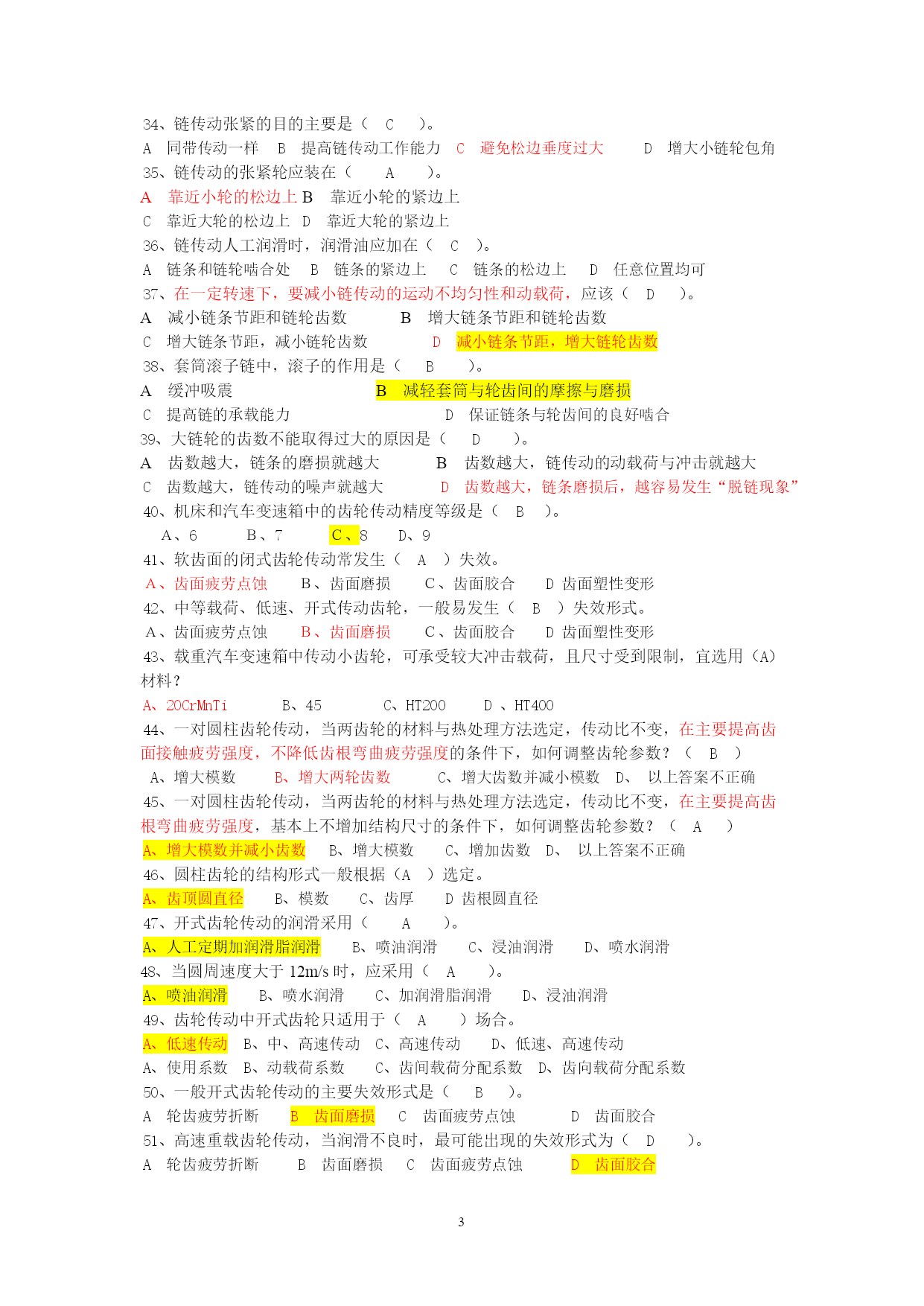 机械设计第六、七章复习一、选择题1、当正常工作时,轴与轮毂之间有较长距离的相对移动,这时可以采用(C)连接。A普通平键B导向平键C滑键D楔键2、对于楔键和切向键连接通常不宜用于(B)场合。A传递较大转矩B要求准确对中C要求轴向固定D轴的转速低3、V带比平带传动能力大的主要原因是(C)。A、V带的强度高B、没有接头C、产生的摩擦力大D、以上答案不正确4、带传动的打滑现象首先发生在(B)。A、大带轮B、小带轮C、大、小带轮同时出现D、以上答案不正确5、设计时,带速如果超出许用范围应该采取(C)措施。A、更换带型号B、降低对传动能力的要求C、重选带轮直径D、以上答案不正确6、带传动的中心距过大将会引起的不良后果是(A)。A、带会产生抖动B、带易磨损C、带易产生疲劳破坏D、以上答案不正确7、V带轮槽角应小于带楔角的目的是(C)。A、增加带的寿命B、便于安装C、可以使带与带轮间产生较大的摩擦力D以上答案不正确8、V带的工作面是(C)。A、上表面B、下表面C、两侧面D、横截面9、下列不属于带传动特点的是(C)。A、缓冲和吸振B、结构简单C、传动效率较高D、有过载保护10、V带楔角θ和轮槽楔角φ的关系是(B)。A、θ≤φB、θ>φC、θ=φD、不确定A、带节宽B、基准长度C、顶宽D、V带轮的节宽11、下列普通V带中,以(D)型带的截面尺寸最小。AABCCEDZ12、在初拉力相同的条件下,V带比平带能传递较大的功率,是因为V带(C)。A强度高B尺寸小C有楔形增压作用D没有接头13、带传动正常工作时不能保证准确的传动比,是因为(D)。A带的材料不符合虎克定律B带容易变形和磨损C带在带轮上打滑D带的弹性滑动14、带传动在工作时产生弹性滑动,是因为(B)。A带的初拉力不够B带的紧边和松边拉力不等C带绕过带轮时有离心力D带和带轮间摩擦力不够15、带传动中,v1为主动轮的圆周速度,v2为从动轮的圆周速度,v为带速,这些速度之间存在的关系是(B)。Av1=v2=vBv1>v>v2Cv1<v<v2Dv1=v>v216、在带传动的稳定运行过程中,带横截面上拉应力的循环特性是(D)。Ar=-1Br=0C0<r<-1D0<r<+117、一增速带传动,带的最大应力发生在带(A)处。A进入主动轮B进入从动轮C退出主动轮D退出从动轮18、V带传动设计中,限制小带轮的最小直径主要是为了(B)。A使结构紧凑B限制弯曲应力C限制小带轮上的包角D保证带和带轮接触面间有足够摩擦力19、V带传动设计中,选取小带轮基准直径的依据是(A)。A带的型号B带的速度C主动轮转速D传动比20、带传动采用张紧装置的目的是(D)。A减轻带的弹性滑动B提高带的寿命C改变带的运动方向D调节带的初拉力21、确定单根V带许用功率的前提条件是(C)。A保证带不打滑B保证带不打滑,不弹性滑动C保证带不打滑,不疲劳破坏D保证带不疲劳破坏22、带传动传动比不准确的原因是(C)。A大小带轮包角不等B摩擦系数不稳定C总是存在弹性滑动D总是存在打滑现象一定型号的V带中,离心拉应力的大小与带线速度(A)。A平方成正比B平方成反比C成正比D成反比23、一定型号V带内弯曲应力的大小,与(B)成反比关系。A带的线速度B带轮的直径C带轮上的包角D传动比24、V带传动是利用(C)原理,使之在相同张紧力作用下,产生比平带大的摩擦力。A斜面B杠杆C楔形增压D弹性滑动25、与V带传动相比较,同步带传动的突出优点是(B)。A传递功率大B传动比准确C传动效率高D带的制造成本低26、当摩擦系数与初拉力一定时,则带传动在打滑前所能传递的最大有效拉力随(B)的增大而增大。A带轮的宽度B小带轮上的包角C大带轮上的包角D带的线速度27、链传动中作用在轴上的压力要比带传动小,这主要是由于(C)。A、这种传动只用来传递小功率B、链的质量大,离心力也大C、啮合传动不需要很大的初拉力D、在传递相同功率时圆周力小28、与齿轮传动相比,链传动的优点是(D)。A传动效率高B工作平稳,无噪声C承载能力大D传动的中心距大,距离远29、链传动设计中,一般链轮的最多齿数限制为,是为了(C)。A减小链传动的不均匀性B限制传动比C防止过早脱链D保证链轮轮齿的强度30、链传动中,限制链轮最少齿数的目的是为了(A)。A减小传动的运动不均匀性和动载荷B防止链节磨损后脱链C使小链轮轮齿受力均匀D防止润滑不良时轮齿加速磨损31、设计链传动时,链长(节数)最好取