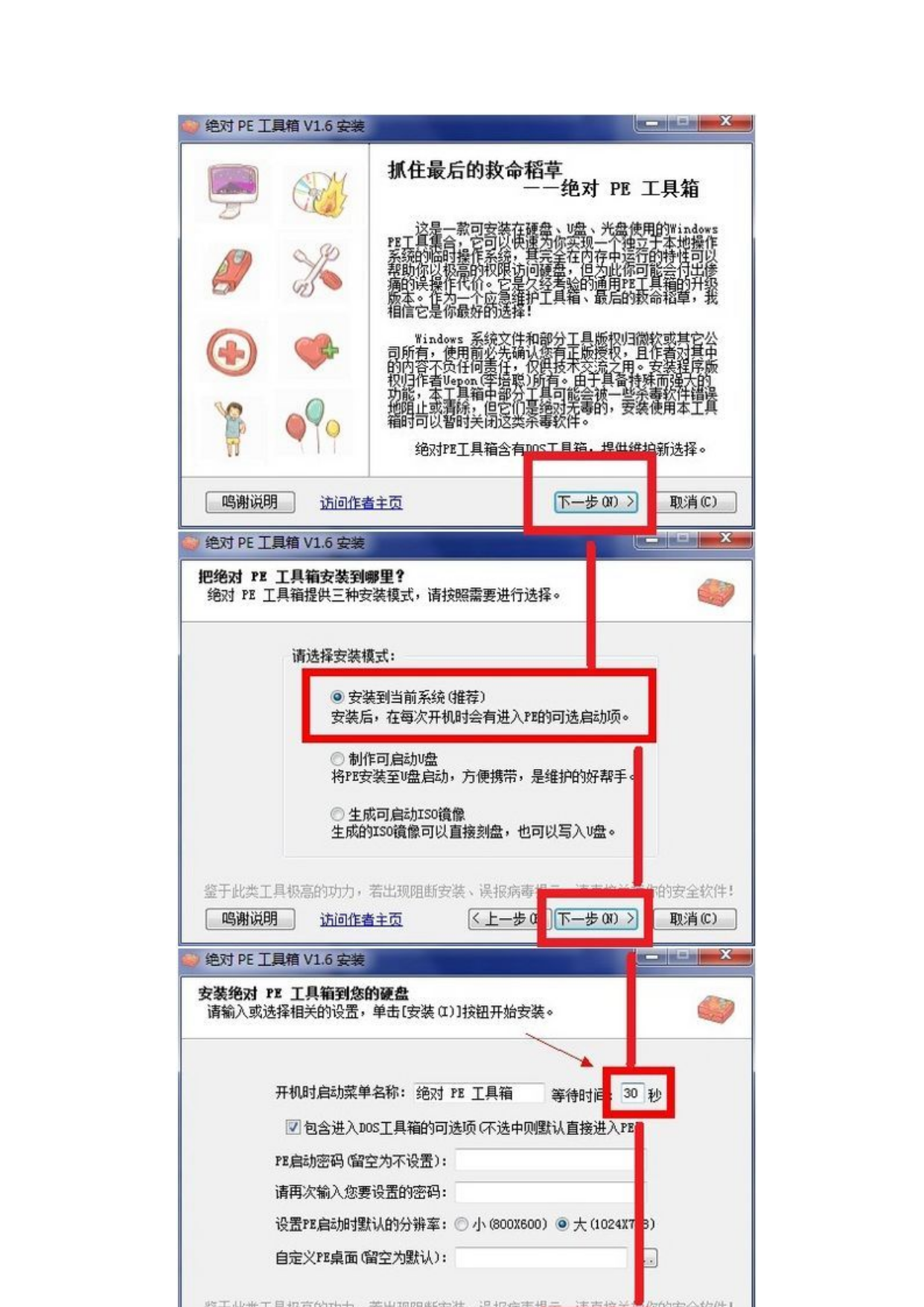 硬盘安装Win7教程!无光驱无U盘照样装Win71硬盘安装Win7(一)安装绝对PEHYPERLINK\l"article_brief"回顶部硬盘安装HYPERLINK"http://pcedu.pconline.com.cn/windows7/"Win7系统教程有很多,但大多都是用盗版HYPERLINK"http://dl.pconline.com.cn/html_2/1/59/id=10125&pn=0.html"Ghost硬盘安装器来装Win7,有极大风险。笔者的硬盘安装系统教程(Win7篇),教你在无光驱无U盘情况下照样顺利安装原版的Win7(非GhostWin7)。本硬盘安装系统方法成功率极高,只要按照跟着步骤一步一步做,硬盘安装HYPERLINK"http://pcedu.pconline.com.cn/windows7/"Win7系统成功率绝对是达到99.99999%。所谓硬盘安装Win7方法,就是指不借助任何光驱或者U盘等外部硬件工具,只依靠软件来完成Win7系统重装的方法。然而,硬盘安装Win7方法只能在已经安装了跟支持HYPERLINK"http://pcedu.pconline.com.cn/windows7/"Windows7同步启动的PE(微软的小型维护操作系统)时才有效,否则必须借助U盘或者光盘来启动安装HYPERLINK"http://pcedu.pconline.com.cn/windows7/"Windows7。也就是说,硬盘安装Win7方法不适合用于在没有Windows系统的新电脑上,也不适用于连Windows启动菜单都无法显示的情况下。温馨提醒:硬盘安装Win7方法只适用于Windows系统还能正常安装软件或者预先安装了PE工具的情况下。硬盘安装Win7教程分为四大步骤第一:安装绝对PE工具箱(Win7PE内核)第二:重启电脑进入绝对PE工具箱第三:用HYPERLINK"http://dl.pconline.com.cn/html_2/1/121/id=1051&pn=0.html"虚拟光驱加载Win7镜像第四:用Win$Man安装Win7如果真还有第五六七八九步,那就是等待系统安装完成、安装驱动,安装自己常用的软件,同步自己的数据等等琐碎事,那些大家都懂,笔者不再长篇大论,本文只详细如果硬盘安装Win7的方法!硬盘安装Win7系统教程第一步——安装绝对PE工具箱为什么笔者要推荐这款PE工具箱(跟通用PE工具箱是同兄弟),是因为这个绝对PE工具箱可以在HYPERLINK"http://pcedu.pconline.com.cn/windows7/"Windows7下直接安装到Win7系统里,支持跟Win7系统同步启动,就算Win7系统某日崩溃了完全进不去,还能通过这个绝对PE工具箱进入PE来拯救你还没来得及保存的数据和重装Win7系统。因此,如果想防范于未然,可以在系统还没崩溃的时候,预先安装好这个绝对PE工具箱,那不借助任何硬件工具来重装Win7也不是什么难事!软件名称:通用PE工具箱(绝对PE的最新升级版)软件版本:3.3官方正式版软件大小:93.65MB软件授权:免费适用平台:Win9XWin2000WinXPWin2003VistaWin7下载地址:HYPERLINK"http://dl.pconline.com.cn/download/54944.html"http://dl.pconline.com.cn/download/54944.html温馨提醒:据绝对PE工具箱的作者介绍,绝对PE已经被整合到通用PE工具箱。(绝对PE和通用PE的安装Win7方法几乎一样)一键安装绝对PE到硬盘上方法很简单,在Win7或HYPERLINK"http://pcedu.pconline.com.cn/soft/st/other/1103/2376470.html"XP系统里,双击打开绝对PE工具箱这个软件(图1),然后点击“下一步”还是“下一步”,设定一下开机启动时间为30秒,点击“安装”,等待1分钟左右就可以准备重启电脑进入下一步!图1安装PE到硬盘上(点击图片查看大图,下同)注一:图1中的时间默认是3秒,笔者设定为30秒,是为了方便大家更容易进入PE(至于为什么这样说,有些东西只能自己亲身体会才能明白)。注二:由于PE的权限极高,用户可以在PE里面为所欲为,如果不想其他人轻易进入你的PE,请加密!或者在想重装系统的时候才安装这个工具在Windows7里。绝对(通用)PE的版本可能会随着软件的更新而有所变化,但大概的安装方法几乎不变。只要自己理解了每一步是干什么的,万变不离其宗,一通百通。至