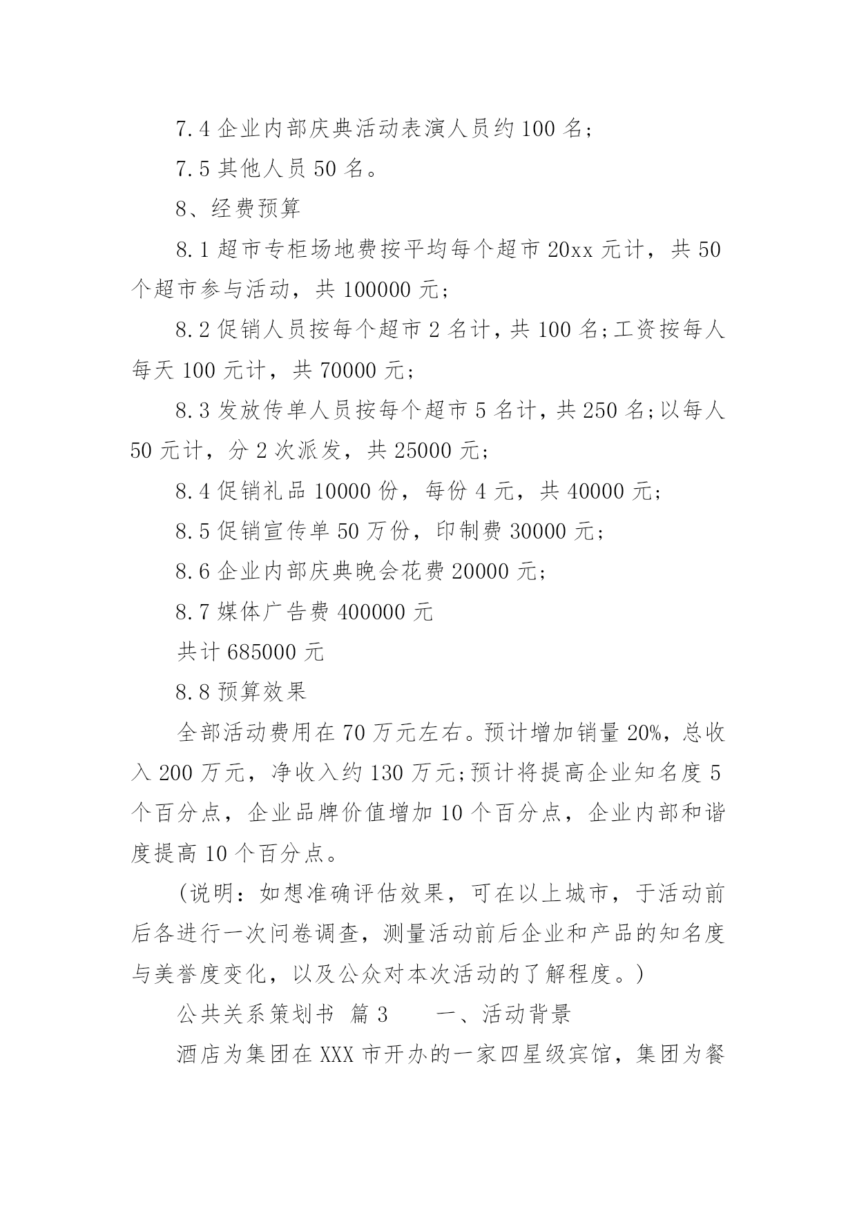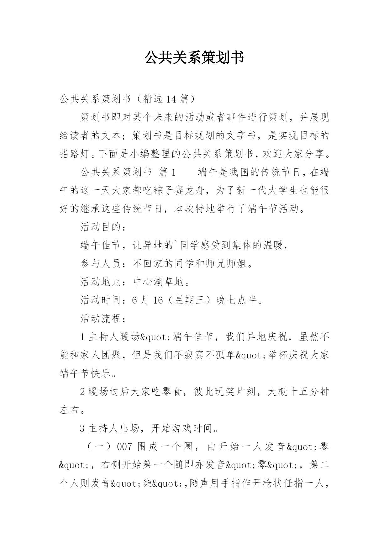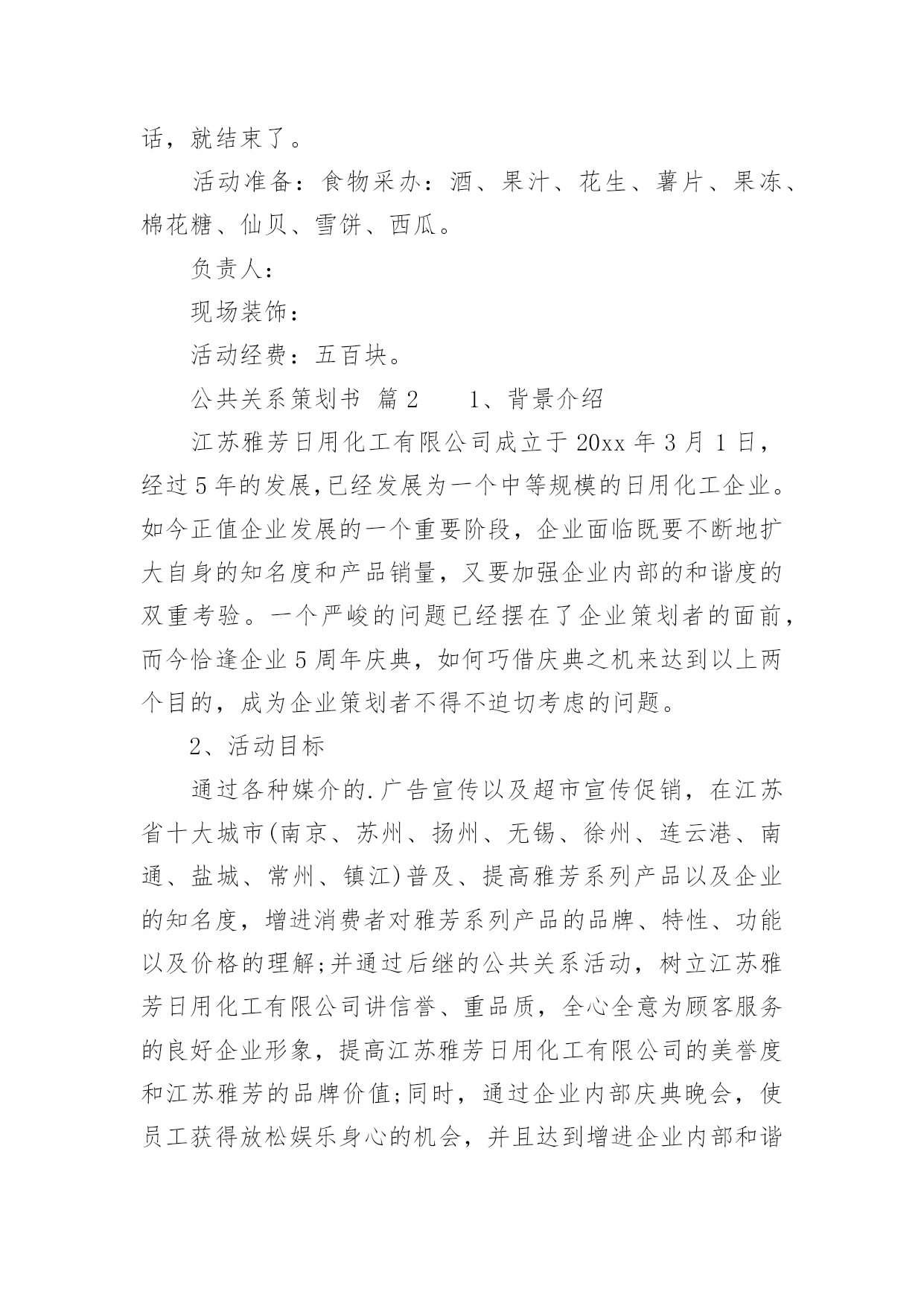 公共关系策划书公共关系策划书(精选14篇)策划书即对某个未来的活动或者事件进行策划,并展现给读者的文本;策划书是目标规划的文字书,是实现目标的指路灯。下面是小编整理的公共关系策划书,欢迎大家分享。公共关系策划书篇1端午是我国的传统节日,在端午的这一天大家都吃粽子赛龙舟,为了新一代大学生也能很好的继承这些传统节日,本次特地举行了端午节活动。活动目的:端午佳节,让异地的`同学感受到集体的温暖,参与人员:不回家的同学和师兄师姐。活动地点:中心湖草地。活动时间:6月16(星期三)晚七点半。活动流程:1主持人暖场"端午佳节,我们异地庆祝,虽然不能和家人团聚,但是我们不寂寞不孤单"举杯庆祝大家端午节快乐。2暖场过后大家吃零食,彼此玩笑片刻,大概十五分钟左右。3主持人出场,开始游戏时间。(一)007围成一个圈,由开始一人发音"零",右侧开始第一个随即亦发音"零",第二个人则发音"柒",随声用手指作开枪状任指一人,"中枪"者手作投降状,但"中枪"者旁边左右两人则要发"啊"的声音,而枪手不作任何动作。出错者玩真心话大冒险。(二)速配气球每个人发一张牌,相同花色牌号的为一组,一组俩个人,由主持人叫出四组,俩人合力用背部挤爆气球,气球内有字条,上面写有"唱首歌"或者"跳支舞"之类的字。最慢的那一组另有惩罚措施,让其在奶油夹心和牙膏夹心的饼干中挑选,后果自负。4粽子插曲:主持人故弄玄虚说有神秘嘉宾,随后精心准备的大粽子上场(可以点上蜡烛营造气氛)主持人可问下大家有无电话回家,大家一起举杯庆祝远方的家人端午节快乐。5游戏继续(三)速配踩报纸牌收上来,同上个游戏,不过只是牌号即可,相同分成三人一组,共俩组。每组中一个人出来猜拳,另俩个人踩报纸,输的一组就报纸对折,最后落在报纸外的为输家,输的围着系有气球的绳子,大家戳破后,让其带着破碎的气球跳草裙舞。(四)所有人站起来聚拢在一起,抓住任何一个除了左右俩边人的手,此时是一个相当混乱的一团,让然后一个一个的解开,解开后应是一个圆圈,若有解不开的现象则那一组应受罚,措施待定。6此时可能已十点多了,大家玩的尽兴后再吃吃喝喝聊一聊。最后主持人出来说一点大家好好生活天天向上之类的话,就结束了。活动准备:食物采办:酒、果汁、花生、薯片、果冻、棉花糖、仙贝、雪饼、西瓜。负责人:现场装饰:活动经费:五百块。公共关系策划书篇21、背景介绍江苏雅芳日用化工有限公司成立于20xx年3月1日,经过5年的发展,已经发展为一个中等规模的日用化工企业。如今正值企业发展的一个重要阶段,企业面临既要不断地扩大自身的知名度和产品销量,又要加强企业内部的和谐度的双重考验。一个严峻的问题已经摆在了企业策划者的面前,而今恰逢企业5周年庆典,如何巧借庆典之机来达到以上两个目的,成为企业策划者不得不迫切考虑的问题。2、活动目标通过各种媒介的.广告宣传以及超市宣传促销,在江苏省十大城市(南京、苏州、扬州、无锡、徐州、连云港、南通、盐城、常州、镇江)普及、提高雅芳系列产品以及企业的知名度,增进消费者对雅芳系列产品的品牌、特性、功能以及价格的理解;并通过后继的公共关系活动,树立江苏雅芳日用化工有限公司讲信誉、重品质,全心全意为顾客服务的良好企业形象,提高江苏雅芳日用化工有限公司的美誉度和江苏雅芳的品牌价值;同时,通过企业内部庆典晚会,使员工获得放松娱乐身心的机会,并且达到增进企业内部和谐度的目的。3、活动主题雅芳的成长离不开您的关注和支持!(说明:该主题无论对于顾客还是员工都是适用的,因此能作为整个活动的主题。本次活动将顾客和企业员工与企业命运联系起来,体现江苏雅芳日用化工有限公司充分认识并重视顾客和企业员工在企业成长中的作用,从侧面反映该企业将会珍惜每一个顾客和企业员工的关注和支持,体现企业以人为本的理念。)4、时空选择4.1企业内部庆典晚会将安排在20xx年2月27日晚上7点在公司员工活动中心进行(详细安排见附录1);4.2电视媒体广告将安排从20xx年2月22日至20xx年3月6日在江苏电视台黄金剧场中插播;4.3平面媒体将安排从20xx年2月22日至20xx年3月7日在扬子晚报上刊登;4.4超市促销将安排从20xx年3月1日20xx年3月7日在江苏十大城市的主要超市进行(详细安排见附录2)。5、传播沟通方案5.1在促销活动进行前一周,在《扬子晚报》上刊登四分之一版企业5年庆典活动和雅芳系列产品超市促销宣传广告;5.2预先与江苏电视台、南京电视台、《扬子晚报》、《江苏日报》等媒介联系,争取企业内部庆典活动进行后顺利发出消息;5.3由进行宣传的大学生散发江苏雅芳日用化工有限