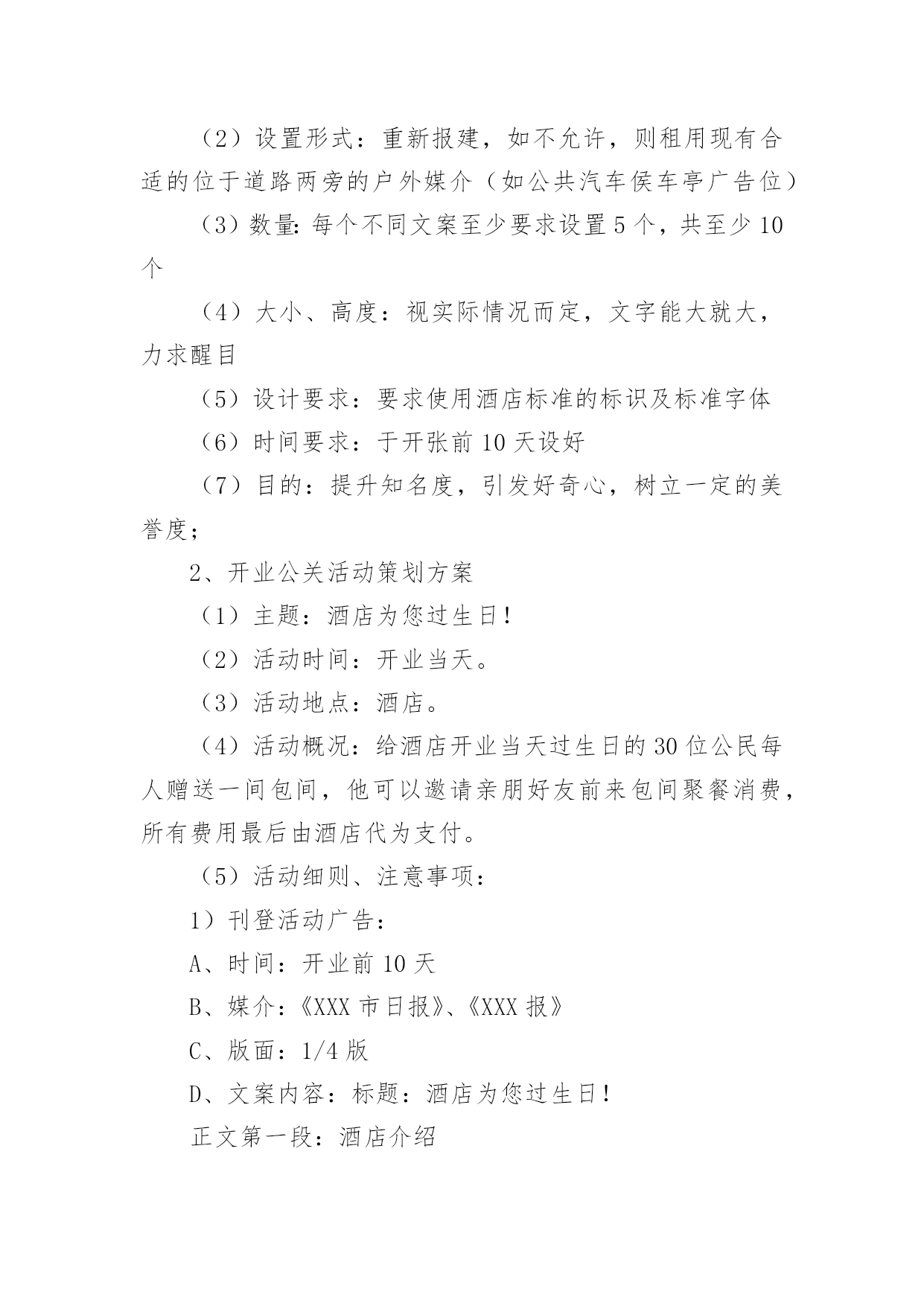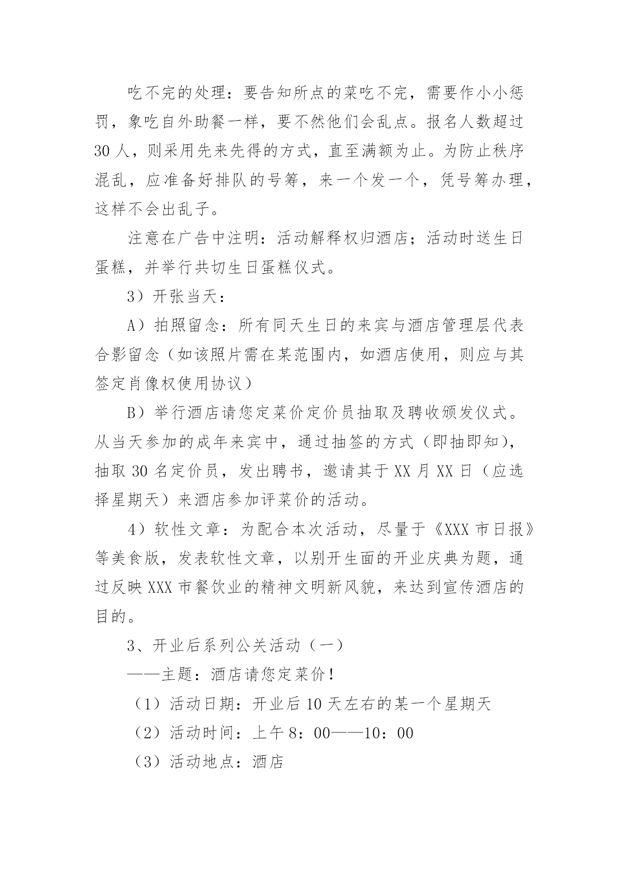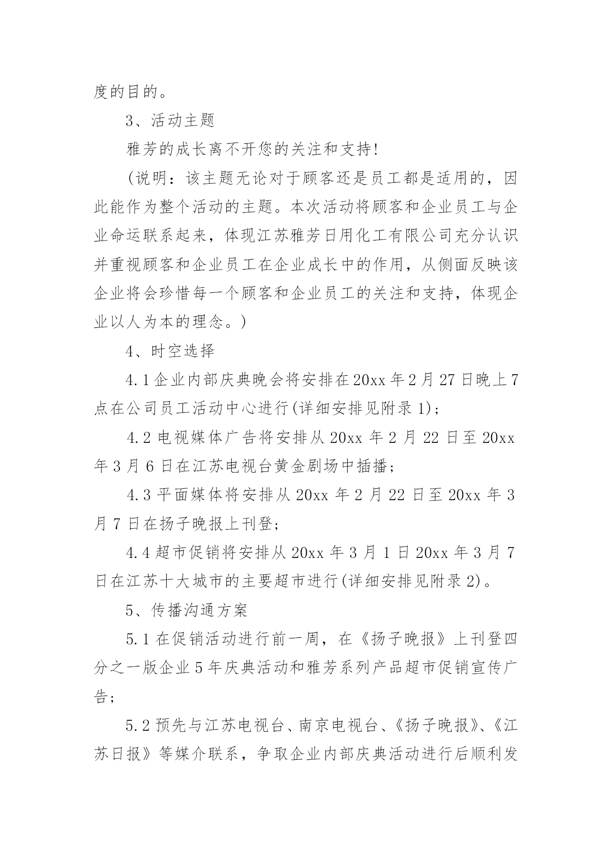 公共关系策划书公共关系策划书(精选14篇)策划书即对某个未来的活动或者事件进行策划,并展现给读者的文本;策划书是目标规划的文字书,是实现目标的指路灯。下面是小编整理的公共关系策划书,欢迎大家分享。公共关系策划书篇1端午是我国的传统节日,在端午的这一天大家都吃粽子赛龙舟,为了新一代大学生也能很好的继承这些传统节日,本次特地举行了端午节活动。活动目的:端午佳节,让异地的`同学感受到集体的温暖,参与人员:不回家的同学和师兄师姐。活动地点:中心湖草地。活动时间:6月16(星期三)晚七点半。活动流程:1主持人暖场"端午佳节,我们异地庆祝,虽然不能和家人团聚,但是我们不寂寞不孤单"举杯庆祝大家端午节快乐。2暖场过后大家吃零食,彼此玩笑片刻,大概十五分钟左右。3主持人出场,开始游戏时间。(一)007围成一个圈,由开始一人发音"零",右侧开始第一个随即亦发音"零",第二个人则发音"柒",随声用手指作开枪状任指一人,"中枪"者手作投降状,但"中枪"者旁边左右两人则要发"啊"的声音,而枪手不作任何动作。出错者玩真心话大冒险。(二)速配气球每个人发一张牌,相同花色牌号的为一组,一组俩个人,由主持人叫出四组,俩人合力用背部挤爆气球,气球内有字条,上面写有"唱首歌"或者"跳支舞"之类的字。最慢的那一组另有惩罚措施,让其在奶油夹心和牙膏夹心的饼干中挑选,后果自负。4粽子插曲:主持人故弄玄虚说有神秘嘉宾,随后精心准备的大粽子上场(可以点上蜡烛营造气氛)主持人可问下大家有无电话回家,大家一起举杯庆祝远方的家人端午节快乐。5游戏继续(三)速配踩报纸牌收上来,同上个游戏,不过只是牌号即可,相同分成三人一组,共俩组。每组中一个人出来猜拳,另俩个人踩报纸,输的一组就报纸对折,最后落在报纸外的为输家,输的围着系有气球的绳子,大家戳破后,让其带着破碎的气球跳草裙舞。(四)所有人站起来聚拢在一起,抓住任何一个除了左右俩边人的手,此时是一个相当混乱的一团,让然后一个一个的解开,解开后应是一个圆圈,若有解不开的现象则那一组应受罚,措施待定。6此时可能已十点多了,大家玩的尽兴后再吃吃喝喝聊一聊。最后主持人出来说一点大家好好生活天天向上之类的话,就结束了。活动准备:食物采办:酒、果汁、花生、薯片、果冻、棉花糖、仙贝、雪饼、西瓜。负责人:现场装饰:活动经费:五百块。公共关系策划书篇21、背景介绍江苏雅芳日用化工有限公司成立于20xx年3月1日,经过5年的发展,已经发展为一个中等规模的日用化工企业。如今正值企业发展的一个重要阶段,企业面临既要不断地扩大自身的知名度和产品销量,又要加强企业内部的和谐度的双重考验。一个严峻的问题已经摆在了企业策划者的面前,而今恰逢企业5周年庆典,如何巧借庆典之机来达到以上两个目的,成为企业策划者不得不迫切考虑的问题。2、活动目标通过各种媒介的.广告宣传以及超市宣传促销,在江苏省十大城市(南京、苏州、扬州、无锡、徐州、连云港、南通、盐城、常州、镇江)普及、提高雅芳系列产品以及企业的知名度,增进消费者对雅芳系列产品的品牌、特性、功能以及价格的理解;并通过后继的公共关系活动,树立江苏雅芳日用化工有限公司讲信誉、重品质,全心全意为顾客服务的良好企业形象,提高江苏雅芳日用化工有限公司的美誉度和江苏雅芳的品牌价值;同时,通过企业内部庆典晚会,使员工获得放松娱乐身心的机会,并且达到增进企业内部和谐度的目的。3、活动主题雅芳的成长离不开您的关注和支持!(说明:该主题无论对于顾客还是员工都是适用的,因此能作为整个活动的主题。本次活动将顾客和企业员工与企业命运联系起来,体现江苏雅芳日用化工有限公司充分认识并重视顾客和企业员工在企业成长中的作用,从侧面反映该企业将会珍惜每一个顾客和企业员工的关注和支持,体现企业以人为本的理念。)4、时空选择4.1企业内部庆典晚会将安排在20xx年2月27日晚上7点在公司员工活动中心进行(详细安排见附录1);4.2电视媒体广告将安排从20xx年2月22日至20xx年3月6日在江苏电视台黄金剧场中插播;4.3平面媒体将安排从20xx年2月22日至20xx年3月7日在扬子晚报上刊登;4.4超市促销将安排从20xx年3月1日20xx年3月7日在江苏十大城市的主要超市进行(详细安排见附录2)。5、传播沟通方案5.1在促销活动进行前一周,在《扬子晚报》上刊登四分之一版企业5年庆典活动和雅芳系列产品超市促销宣传广告;5.2预先与江苏电视台、南京电视台、《扬子晚报》、《江苏日报》等媒介联系,争取企业内部庆典活动进行后顺利发出消息;5.3由进行宣传的大学生散发江苏雅芳日用化工有限
