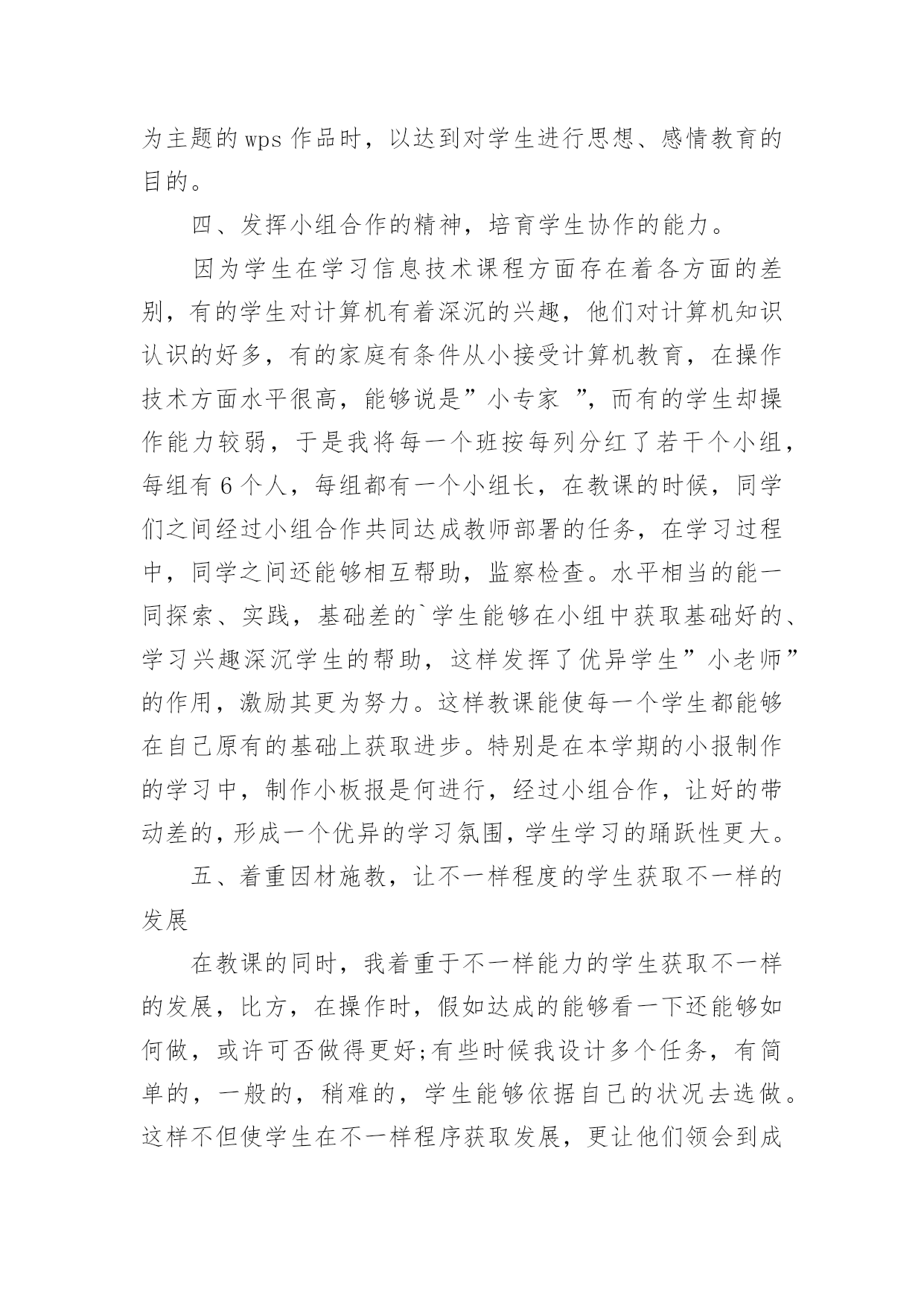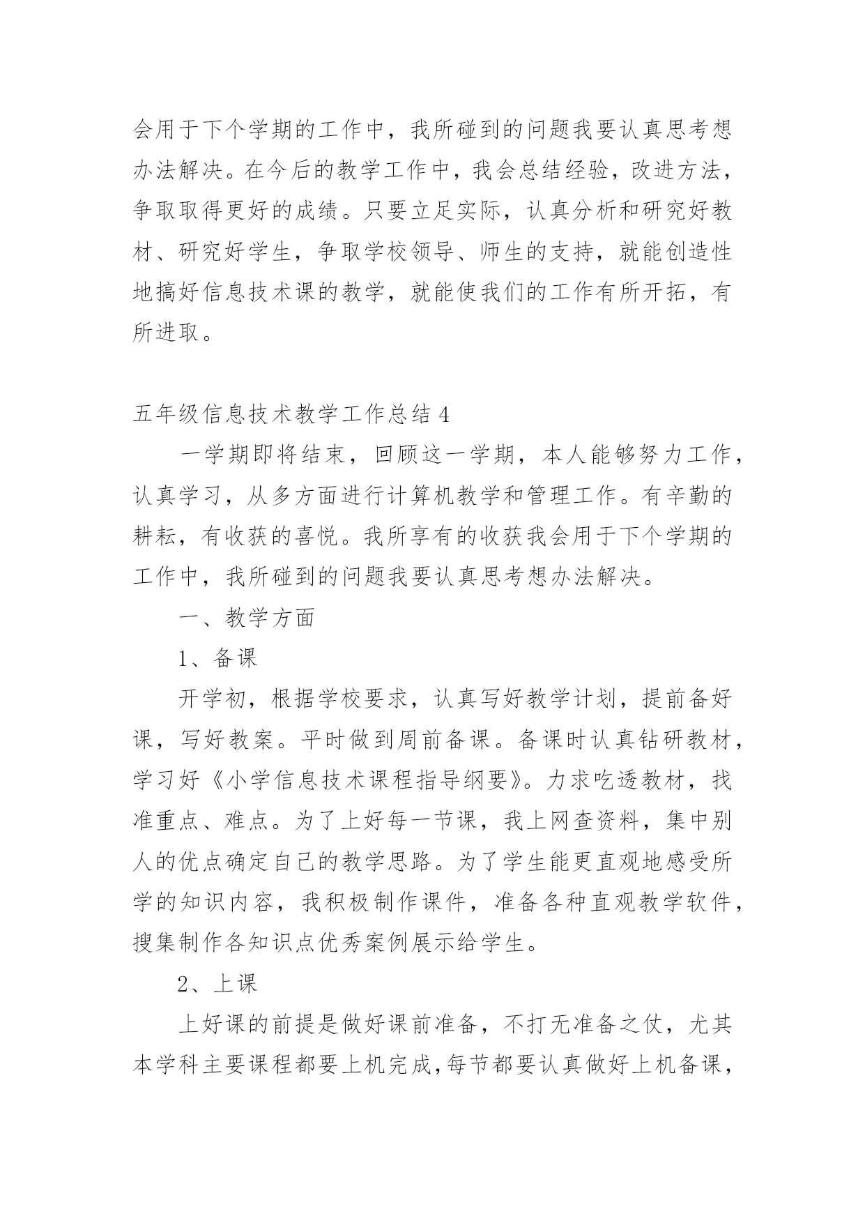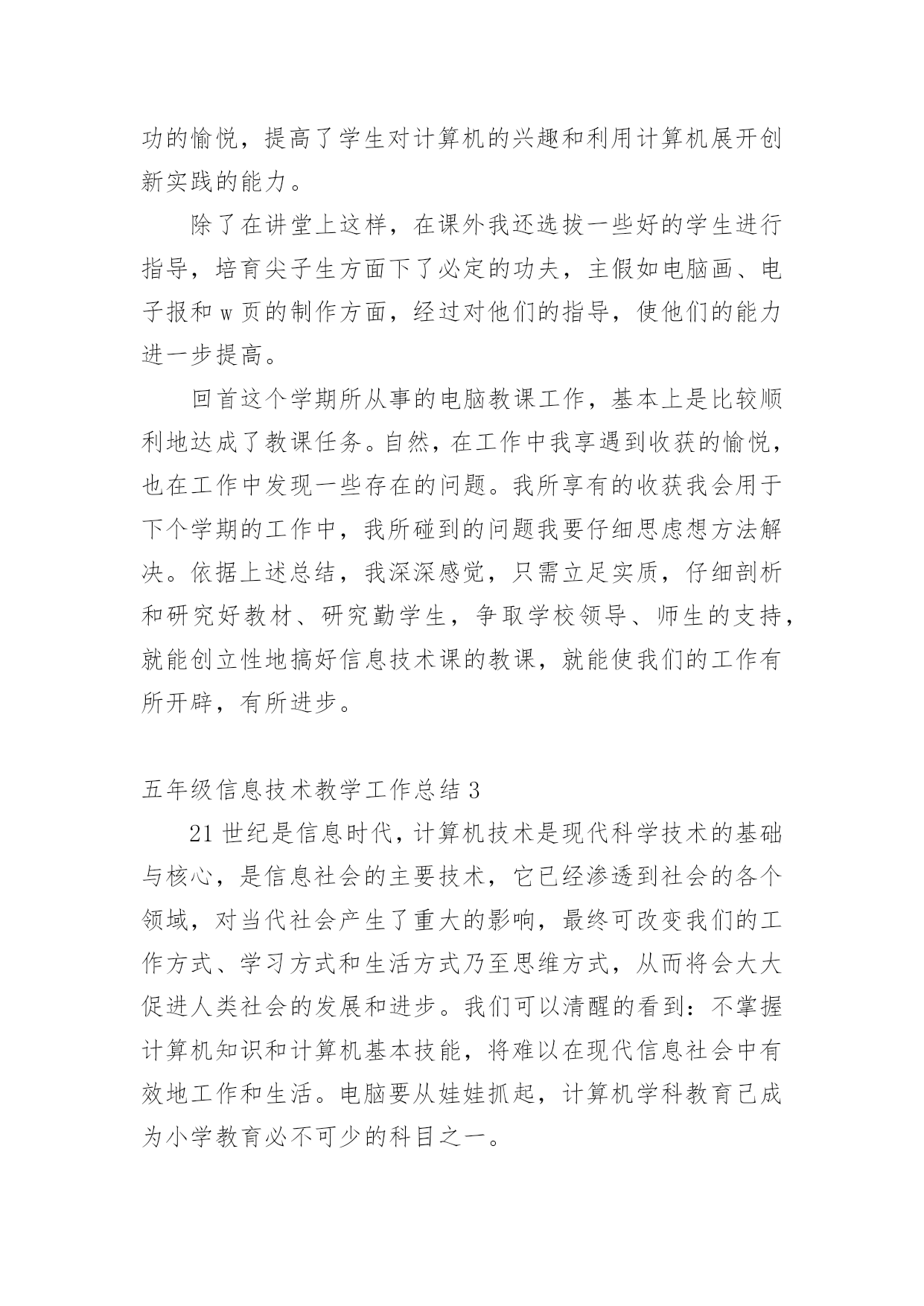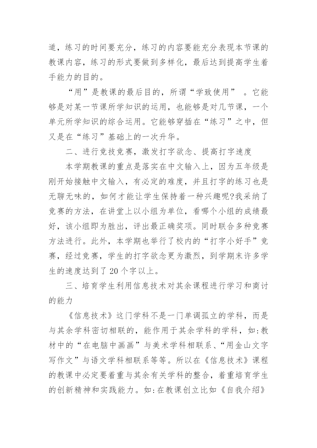 五年级信息技术教学工作总结总结是事后对某一阶段的学习、工作或其完成情况加以回顾和分析的一种书面材料,它可以提升我们发现问题的能力,不妨坐下来好好写写总结吧。总结怎么写才不会千篇一律呢?以下是小编为大家收集的五年级信息技术教学工作总结,欢迎大家分享。五年级信息技术教学工作总结1转眼又是一个学期的结束,回顾本学期的工作,有成功的喜悦,也有失败的教训,我所享有的收获我会用于今后的工作中,我所碰到的问题我要认真思考想办法解决。为使今后的工作做得更好,现总结如下。一、本学期信息技术学科教学目的要求1、增强学生的信息意识,了解信息技术的发展变化及其对工作和社会的影响。2、了解并掌握一些LOGO命令和相应的算法。二、提高教学质量的具体措施1.结合计算机教学实际,开展好常规教学。(1)开学初,便结合我校的计算机教学实际,制定出切实可行的教学计划,并严格按教学计划进行上课。在教学过程中,对具体的教学内容都进行了认真的教学分析,思考在现有计算机软教学的实际情况下如何实施教学,并写成教案上课。收到较好的效果。(2)在教学中,我经常研究学生的思想发展变化,为了提高学生学习信息技术的兴趣,在不影响教学的情况下,自己从光盘上或到其它学校去找了一些有利于学生智力发展的小游戏,把这些游戏在学生完成学习任务后给学生玩,让学生既巩固了所学知识,又提高了学习兴趣,并有助于学生智力发展。经本期实践,取得了很好的效果。学生不但掌握了规定的信息技术知识和达到了规定的操作技能水平,而且还从游戏中学到了许多其它的知识。信息技术课已经成了学生十分喜欢的`课程之一。2.加紧学习课程标准,贯彻课程标准,进一步转变观念,实施素质教育,开展对教材的研究,解决问题,深化教学改革。3.加紧对教师自身业务素质的提高,做到认真备课,因材施教,选择最佳的教学方法,传授知识和技能。4.加快教学方法研究,在教学中认真吸收别人先进的教学方法,大胆尝试,加以变通,并从理论的角度,加以深华。三、从教学上讲我主要做了这一些工作1.做到期初有计划,有教学进度,使教学工作能有条不紊地顺利进行下去。2.按照学校工作管理规定,认真备好课,写好教案,努力上好每一节课。信息教育的课程学校安排的课时比较少,这对于学生来讲是很重要的一节课;对老师来讲是比较难上的一节课。所以能上好每节课对老师对学生都是很关键的。除了备好课、写好教案外,我还要查阅各种资料,能上因特网时还上网寻找好的教学材料,教学课件,把它们和我所从事的工作结合起来,为我所用。3.在转差促优上,我也注意在教学中或教学之余以各种形式学生进行思想教育,转化差生,促进他们的发展。四、存在的问题和今后的努力方向1.信息技术学科是一门具有很多不同与其它学科特点的特殊学科,由于学科教学发展较缓慢,没有现成的教学模式,摸着石头过河,工作收效不是很大。2.我校信息技术教学,由于教学时间有限,不能按时结束课程,学生学习的效果并不理想。今后应注意每一堂课的教学内容,充分利用现有的时间,是学生能学到更多的知识。3.部分学生对学习信息技术的态度不认真,不善于动手操作,影响了今后的学习。五年级信息技术教学工作总结2本学期马上结束,回首这一学期,自己能够努力工作,仔细学习,从多方面进行计算机教课和管理工作。有勤劳耕作获取的收获愉悦,也有工作中发现的问题。我所享有的收获我会用于下个学期的工作中,我所碰到的问题我要仔细思虑想方法解决。一、持续培育学生学习电脑的兴趣、提高着手能力在授课中要擅长使用“启迪式”和“研究式”的教课方法,形式应灵巧多样,切忌“古板”、“无聊”。“练习”是一节课中学生掌握知识和稳固知识的主要渠道,练习的时间要充分,练习的内容要能充分表现本节课的教课内容,练习的形式要做到多样化,最后达到提高学生着手能力的目的。“用”是教课的最后目的,所谓“学致使用”。它能够是对某一节课所学知识的运用,也能够是对几节课,一个单元所学知识的综合运用。它能够穿插在“练习”之中,但又是在“练习”基础上的一次升华。二、进行竞技竞赛,激发打字欲念、提高打字速度本学期教课的重点是落实在中文输入上,因为五年级是刚开始接触中文输入,有必定的难度,并且打字的练习也是无聊无味的,如何才能让学生保持着一种兴趣呢?我采纳了竞赛的方法,在讲堂上以小组为单位,看哪个小组的成绩最好,该小组即为胜出,评出最正确奖项。同时联合多种竞赛方法进行。此外,本学期也举行了校内的“打字小好手”竞赛,经过竞赛,学生的打字欲念更为激烈,到学期末许多学生的速度达到了20个字以上。三、培育学生利用信息技术对其余课程进行学习和商讨的能力《信息技术》这门学科不是一门单调孤立的学科,而是与其余学科密切相联的,能作用于其余学科的学科,如:教材中的“在电脑中画画”与美术学科相联系、“用金山文字写作文”与语文学科相联系等等。所以在《信息技术》课程