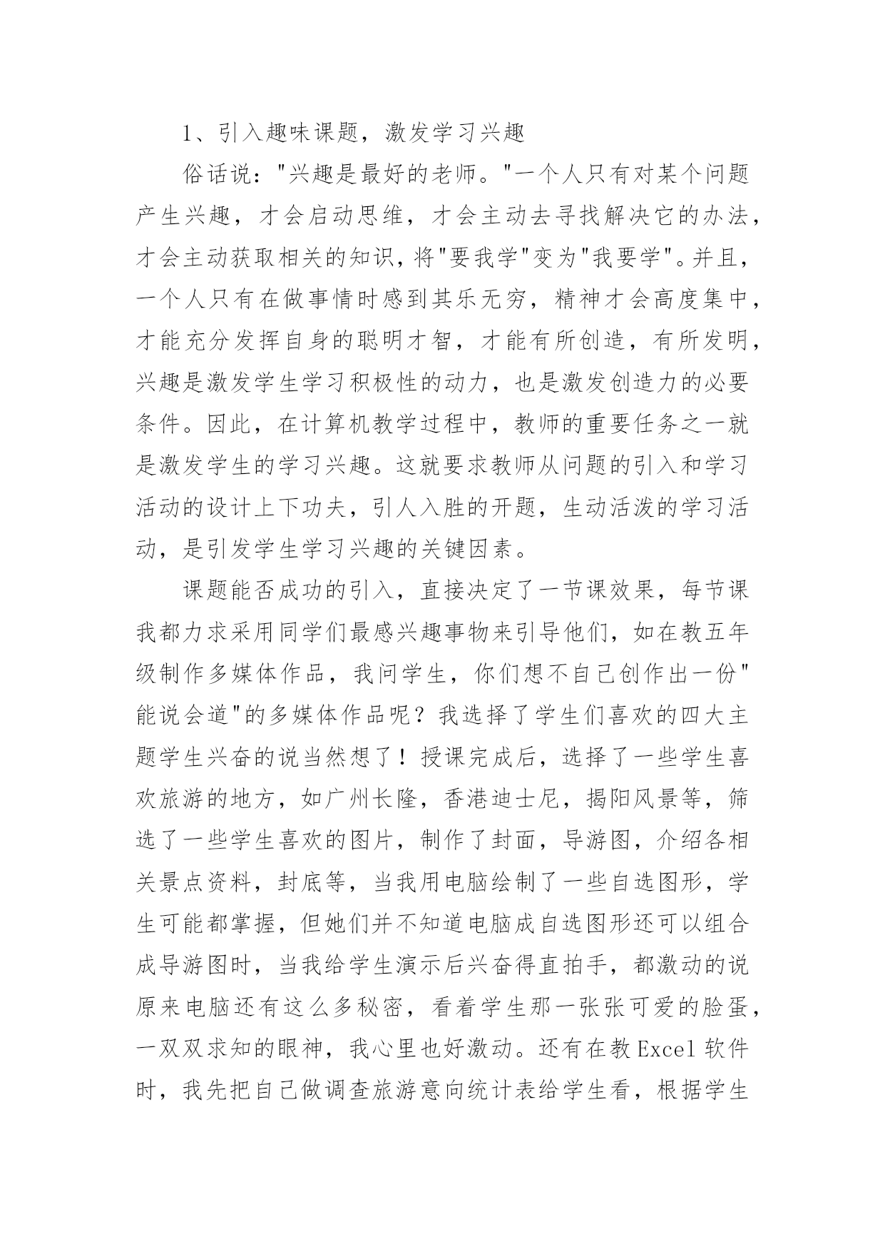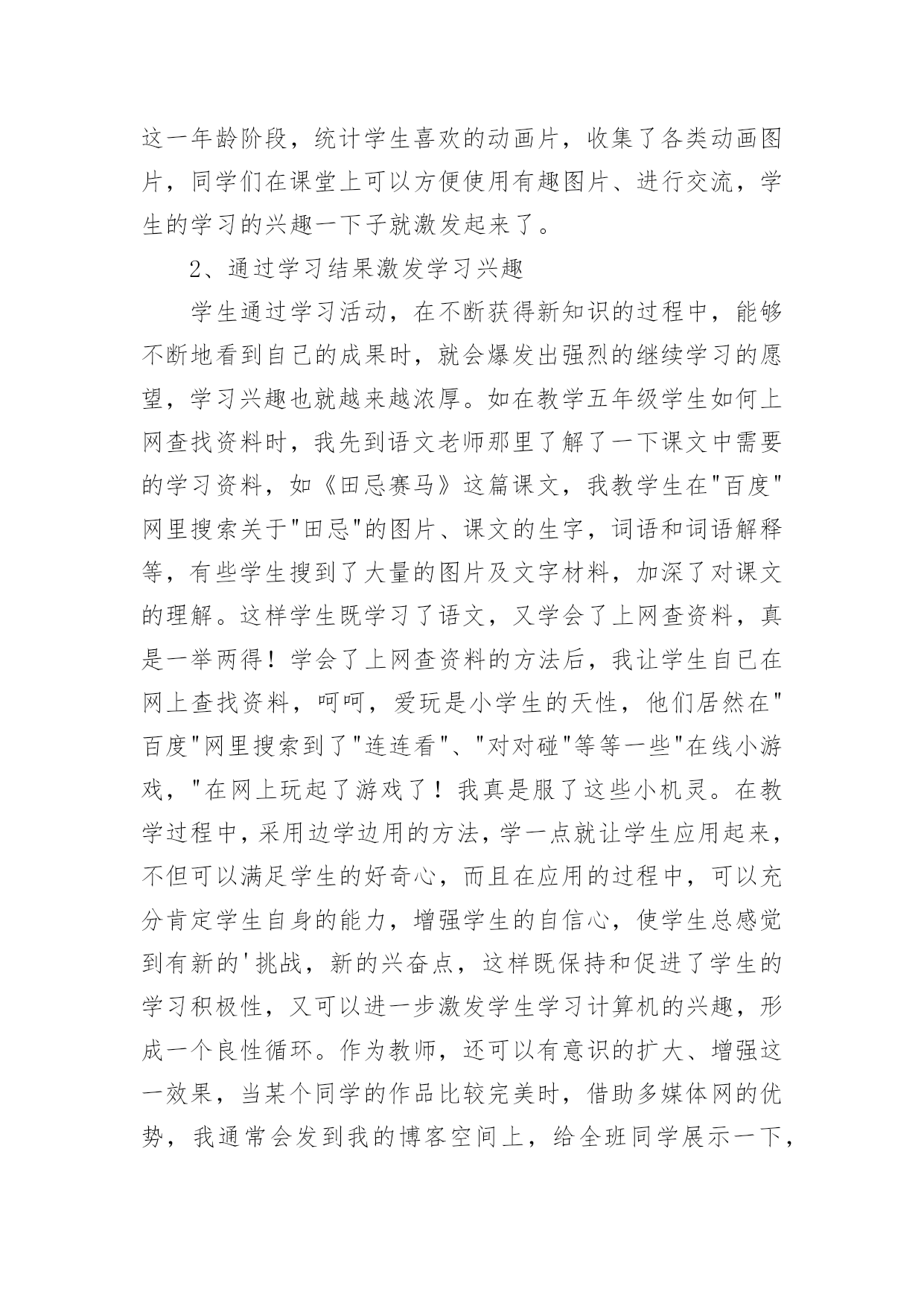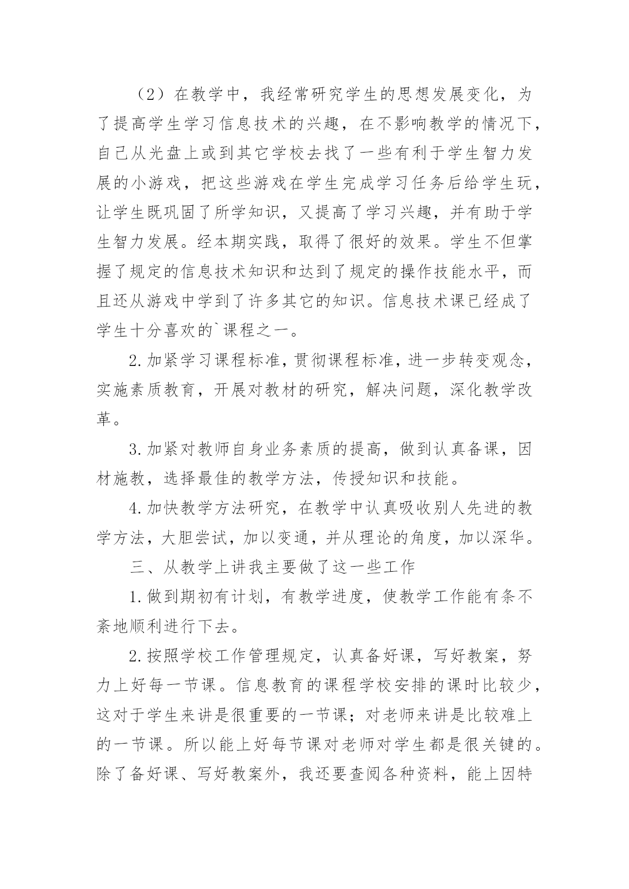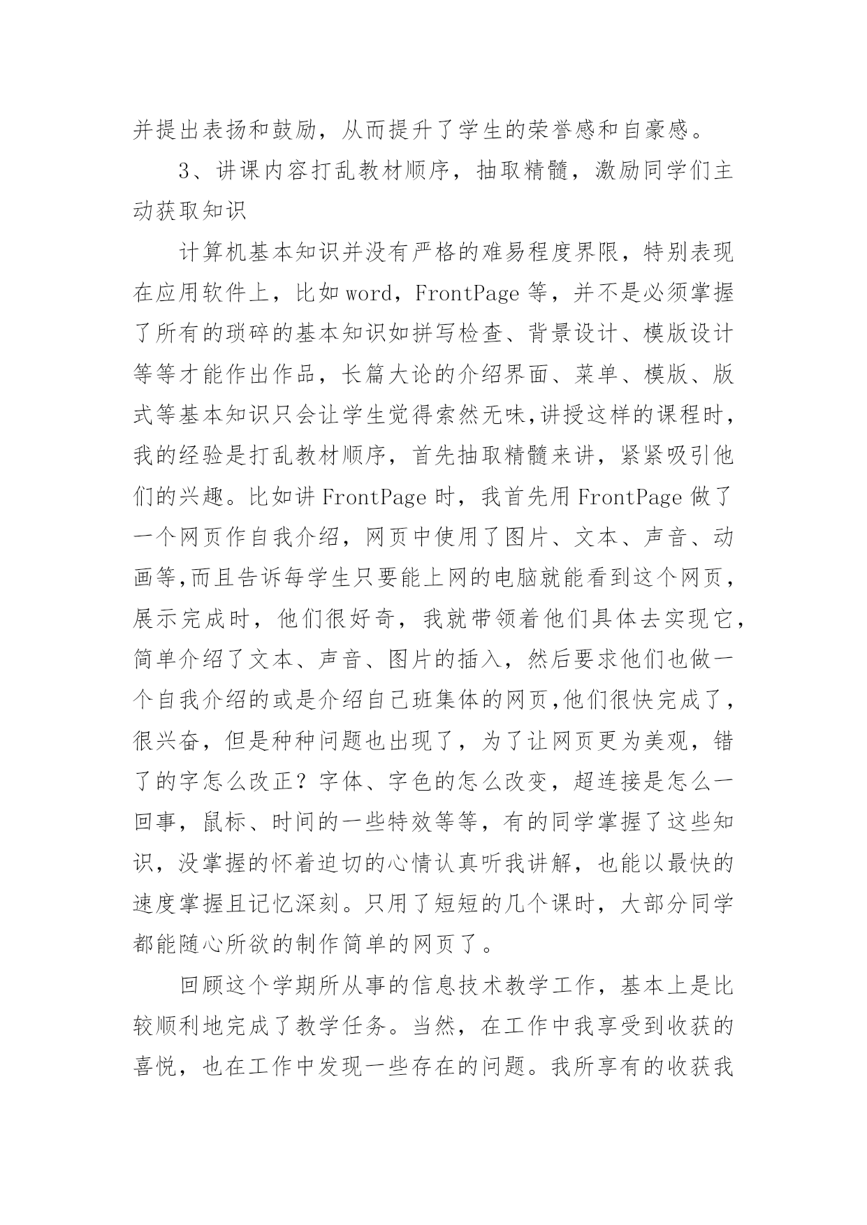 五年级信息技术教学工作总结总结是事后对某一阶段的学习、工作或其完成情况加以回顾和分析的一种书面材料,它可以提升我们发现问题的能力,不妨坐下来好好写写总结吧。总结怎么写才不会千篇一律呢?以下是小编为大家收集的五年级信息技术教学工作总结,欢迎大家分享。五年级信息技术教学工作总结1转眼又是一个学期的结束,回顾本学期的工作,有成功的喜悦,也有失败的教训,我所享有的收获我会用于今后的工作中,我所碰到的问题我要认真思考想办法解决。为使今后的工作做得更好,现总结如下。一、本学期信息技术学科教学目的要求1、增强学生的信息意识,了解信息技术的发展变化及其对工作和社会的影响。2、了解并掌握一些LOGO命令和相应的算法。二、提高教学质量的具体措施1.结合计算机教学实际,开展好常规教学。(1)开学初,便结合我校的计算机教学实际,制定出切实可行的教学计划,并严格按教学计划进行上课。在教学过程中,对具体的教学内容都进行了认真的教学分析,思考在现有计算机软教学的实际情况下如何实施教学,并写成教案上课。收到较好的效果。(2)在教学中,我经常研究学生的思想发展变化,为了提高学生学习信息技术的兴趣,在不影响教学的情况下,自己从光盘上或到其它学校去找了一些有利于学生智力发展的小游戏,把这些游戏在学生完成学习任务后给学生玩,让学生既巩固了所学知识,又提高了学习兴趣,并有助于学生智力发展。经本期实践,取得了很好的效果。学生不但掌握了规定的信息技术知识和达到了规定的操作技能水平,而且还从游戏中学到了许多其它的知识。信息技术课已经成了学生十分喜欢的`课程之一。2.加紧学习课程标准,贯彻课程标准,进一步转变观念,实施素质教育,开展对教材的研究,解决问题,深化教学改革。3.加紧对教师自身业务素质的提高,做到认真备课,因材施教,选择最佳的教学方法,传授知识和技能。4.加快教学方法研究,在教学中认真吸收别人先进的教学方法,大胆尝试,加以变通,并从理论的角度,加以深华。三、从教学上讲我主要做了这一些工作1.做到期初有计划,有教学进度,使教学工作能有条不紊地顺利进行下去。2.按照学校工作管理规定,认真备好课,写好教案,努力上好每一节课。信息教育的课程学校安排的课时比较少,这对于学生来讲是很重要的一节课;对老师来讲是比较难上的一节课。所以能上好每节课对老师对学生都是很关键的。除了备好课、写好教案外,我还要查阅各种资料,能上因特网时还上网寻找好的教学材料,教学课件,把它们和我所从事的工作结合起来,为我所用。3.在转差促优上,我也注意在教学中或教学之余以各种形式学生进行思想教育,转化差生,促进他们的发展。四、存在的问题和今后的努力方向1.信息技术学科是一门具有很多不同与其它学科特点的特殊学科,由于学科教学发展较缓慢,没有现成的教学模式,摸着石头过河,工作收效不是很大。2.我校信息技术教学,由于教学时间有限,不能按时结束课程,学生学习的效果并不理想。今后应注意每一堂课的教学内容,充分利用现有的时间,是学生能学到更多的知识。3.部分学生对学习信息技术的态度不认真,不善于动手操作,影响了今后的学习。五年级信息技术教学工作总结2本学期马上结束,回首这一学期,自己能够努力工作,仔细学习,从多方面进行计算机教课和管理工作。有勤劳耕作获取的收获愉悦,也有工作中发现的问题。我所享有的收获我会用于下个学期的工作中,我所碰到的问题我要仔细思虑想方法解决。一、持续培育学生学习电脑的兴趣、提高着手能力在授课中要擅长使用“启迪式”和“研究式”的教课方法,形式应灵巧多样,切忌“古板”、“无聊”。“练习”是一节课中学生掌握知识和稳固知识的主要渠道,练习的时间要充分,练习的内容要能充分表现本节课的教课内容,练习的形式要做到多样化,最后达到提高学生着手能力的目的。“用”是教课的最后目的,所谓“学致使用”。它能够是对某一节课所学知识的运用,也能够是对几节课,一个单元所学知识的综合运用。它能够穿插在“练习”之中,但又是在“练习”基础上的一次升华。二、进行竞技竞赛,激发打字欲念、提高打字速度本学期教课的重点是落实在中文输入上,因为五年级是刚开始接触中文输入,有必定的难度,并且打字的练习也是无聊无味的,如何才能让学生保持着一种兴趣呢?我采纳了竞赛的方法,在讲堂上以小组为单位,看哪个小组的成绩最好,该小组即为胜出,评出最正确奖项。同时联合多种竞赛方法进行。此外,本学期也举行了校内的“打字小好手”竞赛,经过竞赛,学生的打字欲念更为激烈,到学期末许多学生的速度达到了20个字以上。三、培育学生利用信息技术对其余课程进行学习和商讨的能力《信息技术》这门学科不是一门单调孤立的学科,而是与其余学科密切相联的,能作用于其余学科的学科,如:教材中的“在电脑中画画”与美术学科相联系、“用金山文字写作文”与语文学科相联系等等。所以在《信息技术》课程