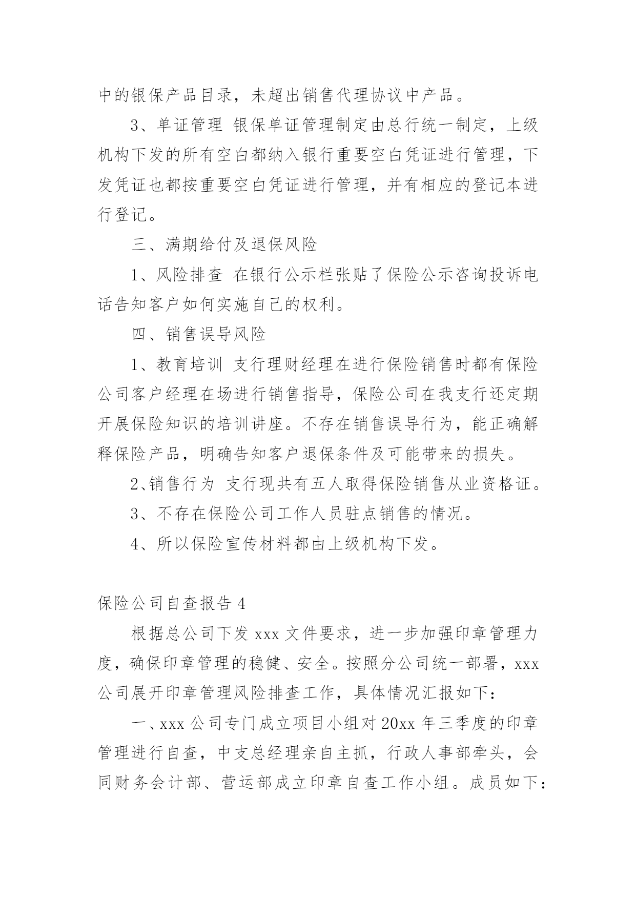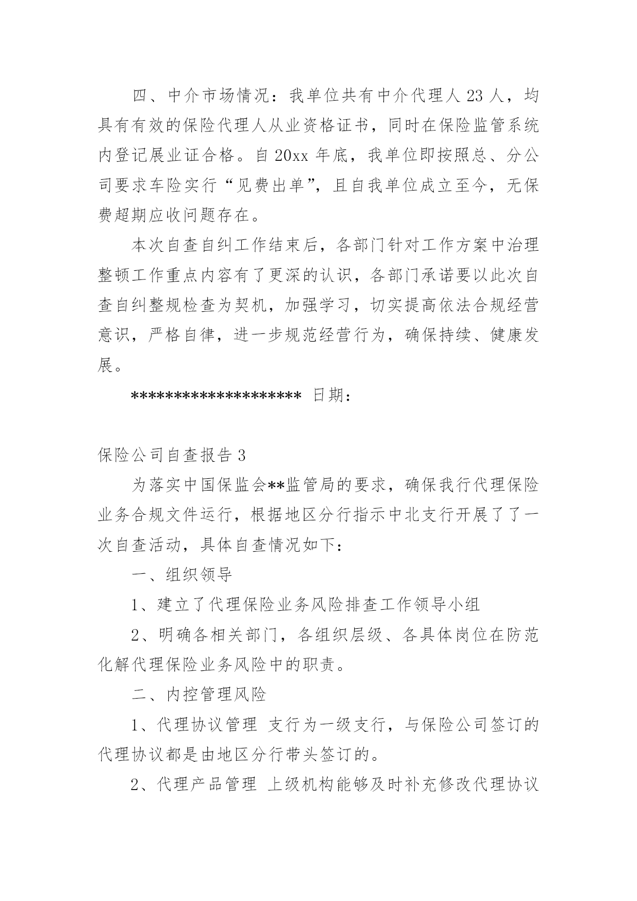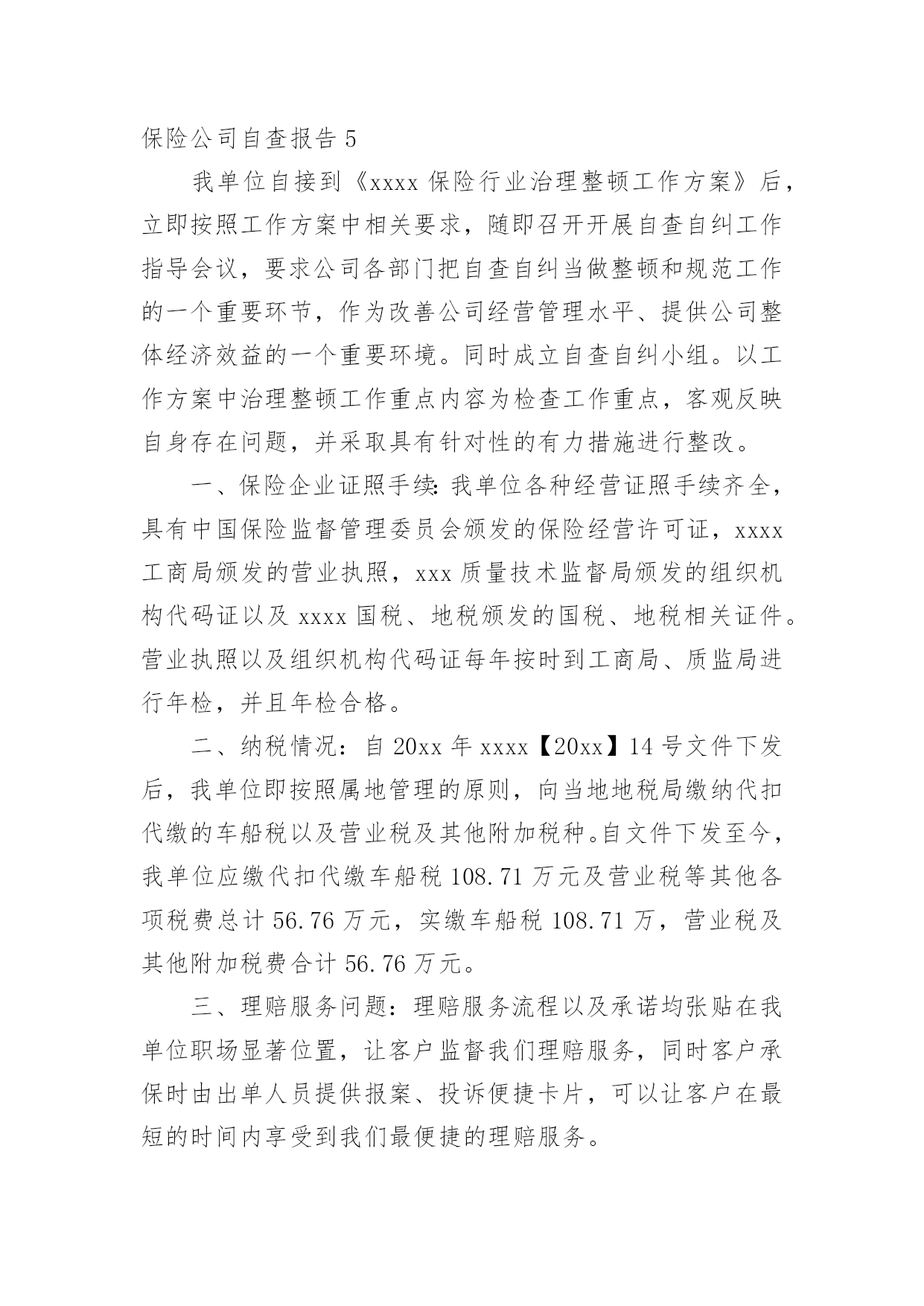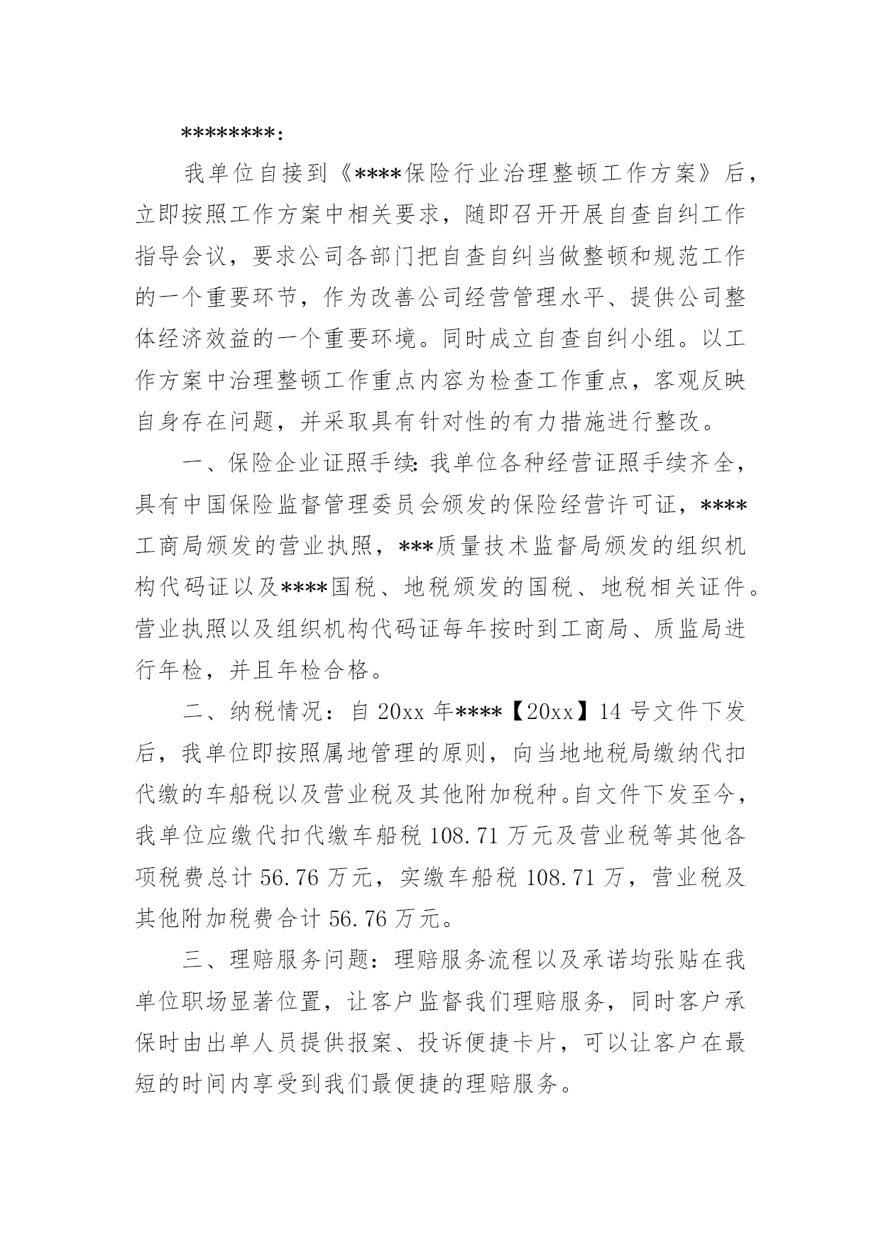 保险公司自查报告在当下社会,报告的适用范围越来越广泛,我们在写报告的时候要注意逻辑的合理性。那么你真正懂得怎么写好报告吗?下面是小编为大家收集的保险公司自查报告,仅供参考,欢迎大家阅读。保险公司自查报告1为了端正工作态度,改进纪律作风,促进做好工作,公司开展了纪律作风整顿活动,在这学习一阶段,始我在思想上、工作上、生活上、对自己要求和实际行动都有很大提高,现在对照工作实际谈谈我的心得体会。一、存在的主要问题:1、在电话服务过程中的技巧还有待进一步加强。2、业务知识不够专业。(其主要表现在:对待工作有时不够主动,不注重业务知识,认为只要按时完成工作就算了事了。缺乏一种刻苦专研的精神。)3、在组织纪律方面存在执行制度不严,有窜岗的现象。二、存在问题的主要原因上述这些问题的存在,虽然有一定的客观因素,但更重要的还是有主观原因所造成的。在这段时间,对于存在的主要问题和不足也进行多次反思。从主观上找原因,主要概况几个方面:1、电话技巧不够灵活,业务知识不够专业。没有深刻认识到业务水平的高低对工作方面存在的依赖性,认为领导会有指示,上面有安排在工作。2、工作作风还不够扎实,对工作缺乏系统化合提高自身要求。三、今后的整改措施1、加强业务知识和政治理论学习,不断提高自身的政治素质和业务知识。业务知识要进一步提高,以高度的责任心、事业心、扎扎实实的工作,完成党和领导给的各项指标任务,积极提高工作水平。要不断加强学习,努力提高业务知识。加强自己的工作能力和修养,想办法把工作提高到一个新的水平。2、尊守各项规章制度,明确自己的职责,告诉自己可以做什么,不可以做什么,严格的要求自己,努力加强自我进取,自我完善,努力提高自我综合素质。3、严格纪律,转变工作作风,提高工作效率如果没有严明的纪律,就没有坚强的队伍,因此,我们应该认识到当前整顿的重要性,要迅速的认识到把思想统一到上级的决策部署上,我们要严明工作纪律,要忠于职守,其次是要严格执法办事,热情服务。总之,通过这次学习整顿,深刻领会和准确把握领导的工作部署,坚持用学习整顿促进工作开展,以工作成效检验整顿效果。保险公司自查报告2********:我单位自接到《****保险行业治理整顿工作方案》后,立即按照工作方案中相关要求,随即召开开展自查自纠工作指导会议,要求公司各部门把自查自纠当做整顿和规范工作的一个重要环节,作为改善公司经营管理水平、提供公司整体经济效益的一个重要环境。同时成立自查自纠小组。以工作方案中治理整顿工作重点内容为检查工作重点,客观反映自身存在问题,并采取具有针对性的有力措施进行整改。一、保险企业证照手续:我单位各种经营证照手续齐全,具有中国保险监督管理委员会颁发的保险经营许可证,****工商局颁发的营业执照,***质量技术监督局颁发的组织机构代码证以及****国税、地税颁发的国税、地税相关证件。营业执照以及组织机构代码证每年按时到工商局、质监局进行年检,并且年检合格。二、纳税情况:自20xx年****【20xx】14号文件下发后,我单位即按照属地管理的原则,向当地地税局缴纳代扣代缴的车船税以及营业税及其他附加税种。自文件下发至今,我单位应缴代扣代缴车船税108.71万元及营业税等其他各项税费总计56.76万元,实缴车船税108.71万,营业税及其他附加税费合计56.76万元。三、理赔服务问题:理赔服务流程以及承诺均张贴在我单位职场显著位置,让客户监督我们理赔服务,同时客户承保时由出单人员提供报案、投诉便捷卡片,可以让客户在最短的时间内享受到我们最便捷的理赔服务。四、中介市场情况:我单位共有中介代理人23人,均具有有效的保险代理人从业资格证书,同时在保险监管系统内登记展业证合格。自20xx年底,我单位即按照总、分公司要求车险实行“见费出单”,且自我单位成立至今,无保费超期应收问题存在。本次自查自纠工作结束后,各部门针对工作方案中治理整顿工作重点内容有了更深的认识,各部门承诺要以此次自查自纠整规检查为契机,加强学习,切实提高依法合规经营意识,严格自律,进一步规范经营行为,确保持续、健康发展。********************日期:保险公司自查报告3为落实中国保监会**监管局的要求,确保我行代理保险业务合规文件运行,根据地区分行指示中北支行开展了了一次自查活动,具体自查情况如下:一、组织领导1、建立了代理保险业务风险排查工作领导小组2、明确各相关部门,各组织层级、各具体岗位在防范化解代理保险业务风险中的职责。二、内控管理风险1、代理协议管理支行为一级支行,与保险公司签订的代理协议都是由地区分行带头签订的。2、代理产品管理上级机构能够及时补充修改代理协议中的银保产品目录,未超出销售代理协议中产品。3、单证管理银保单证管理制定由总行统一制定,上级机构下发的所有空白都纳入银行重要空白凭