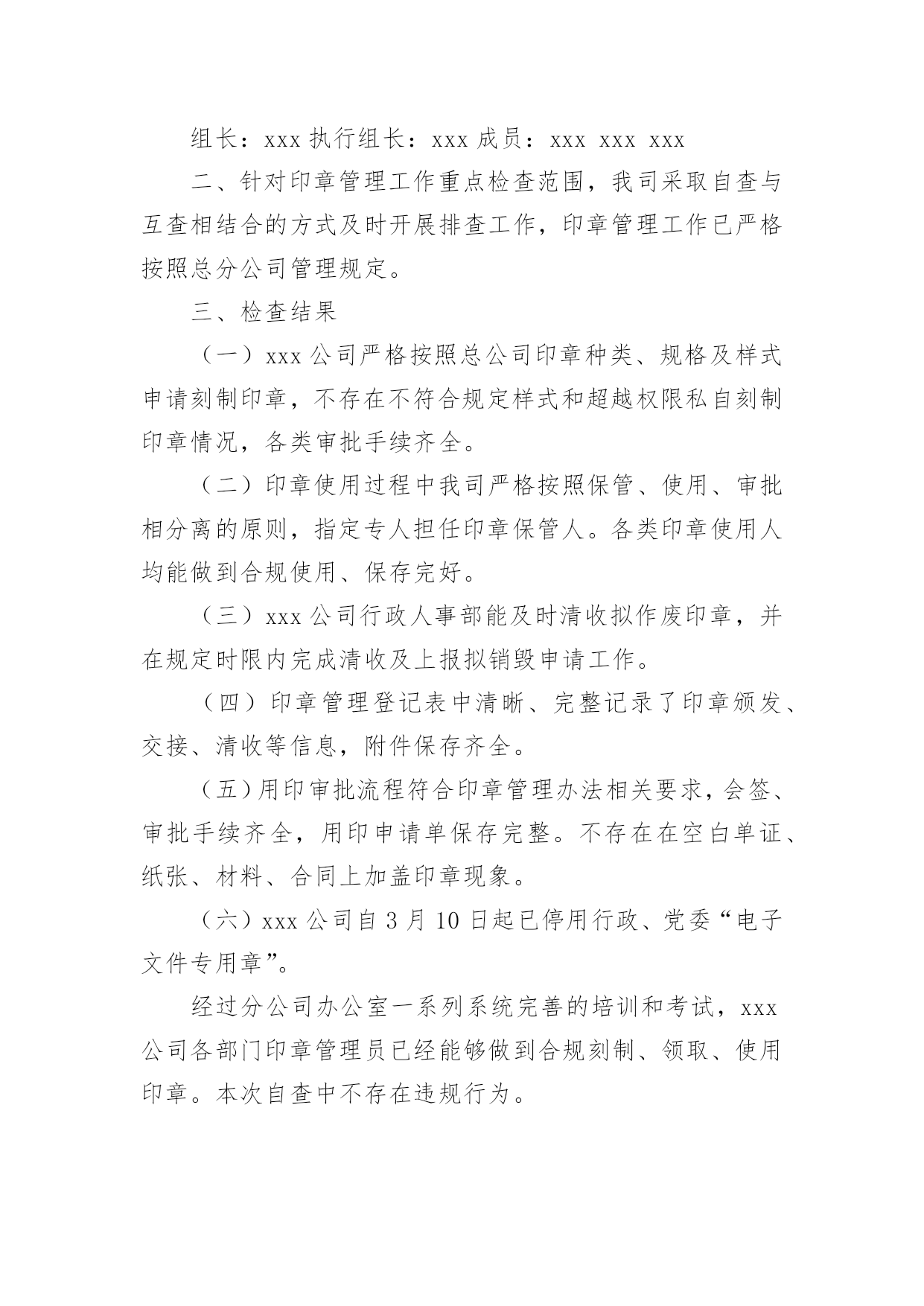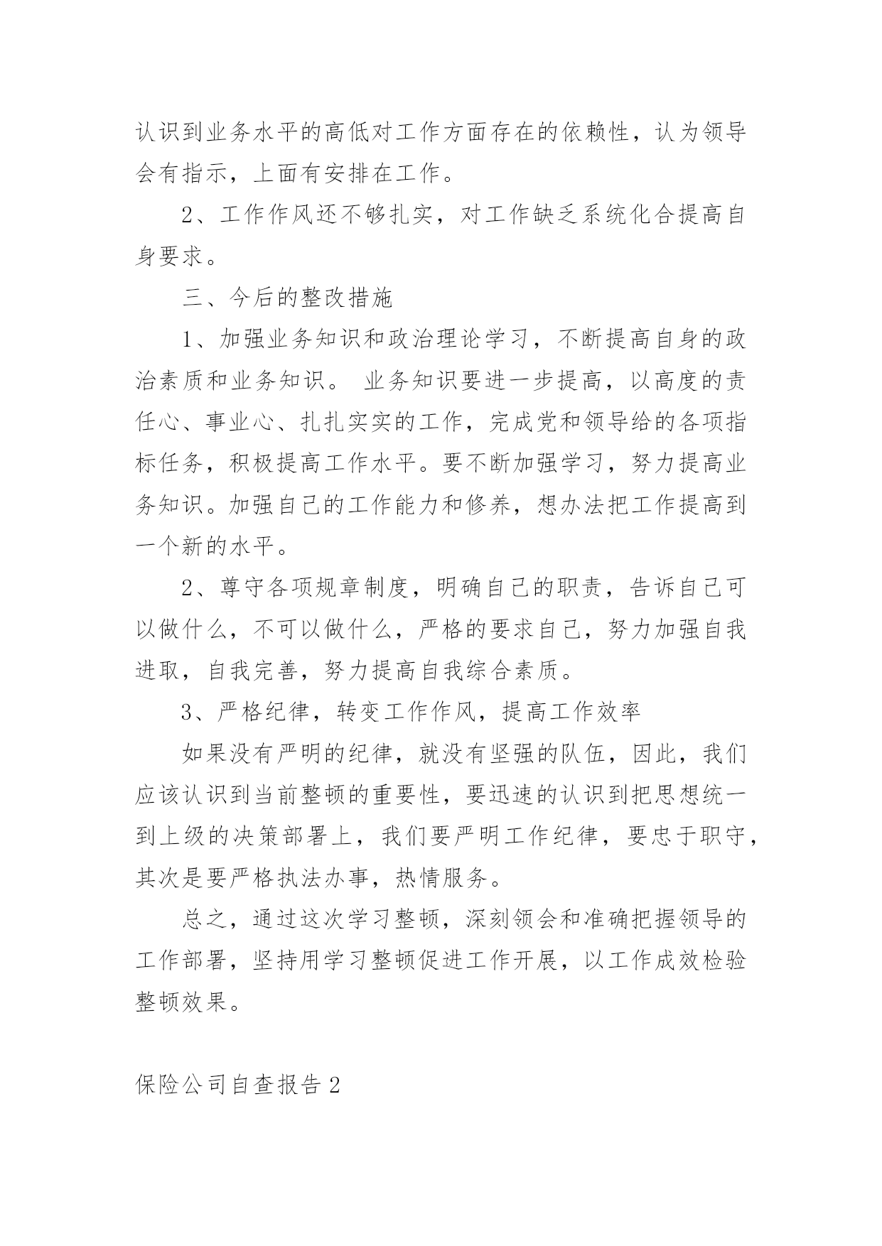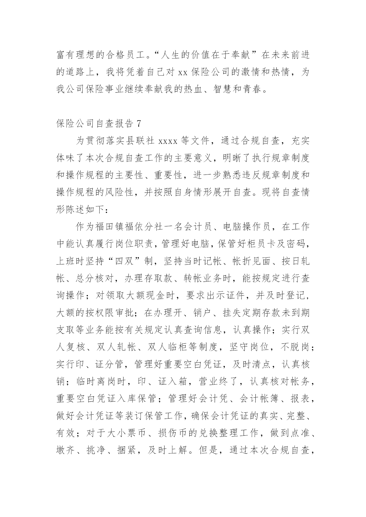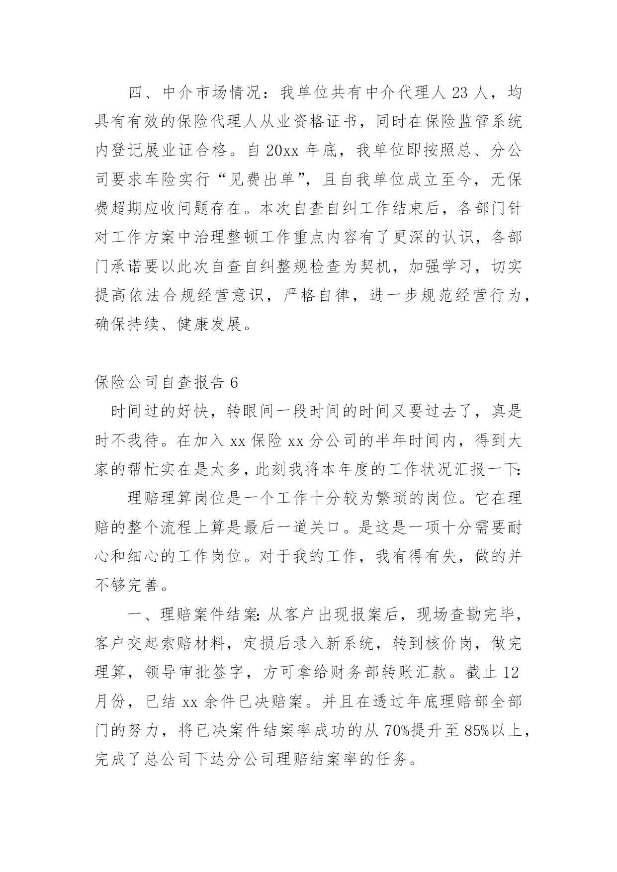保险公司自查报告在当下社会,报告的适用范围越来越广泛,我们在写报告的时候要注意逻辑的合理性。那么你真正懂得怎么写好报告吗?下面是小编为大家收集的保险公司自查报告,仅供参考,欢迎大家阅读。保险公司自查报告1为了端正工作态度,改进纪律作风,促进做好工作,公司开展了纪律作风整顿活动,在这学习一阶段,始我在思想上、工作上、生活上、对自己要求和实际行动都有很大提高,现在对照工作实际谈谈我的心得体会。一、存在的主要问题:1、在电话服务过程中的技巧还有待进一步加强。2、业务知识不够专业。(其主要表现在:对待工作有时不够主动,不注重业务知识,认为只要按时完成工作就算了事了。缺乏一种刻苦专研的精神。)3、在组织纪律方面存在执行制度不严,有窜岗的现象。二、存在问题的主要原因上述这些问题的存在,虽然有一定的客观因素,但更重要的还是有主观原因所造成的。在这段时间,对于存在的主要问题和不足也进行多次反思。从主观上找原因,主要概况几个方面:1、电话技巧不够灵活,业务知识不够专业。没有深刻认识到业务水平的高低对工作方面存在的依赖性,认为领导会有指示,上面有安排在工作。2、工作作风还不够扎实,对工作缺乏系统化合提高自身要求。三、今后的整改措施1、加强业务知识和政治理论学习,不断提高自身的政治素质和业务知识。业务知识要进一步提高,以高度的责任心、事业心、扎扎实实的工作,完成党和领导给的各项指标任务,积极提高工作水平。要不断加强学习,努力提高业务知识。加强自己的工作能力和修养,想办法把工作提高到一个新的水平。2、尊守各项规章制度,明确自己的职责,告诉自己可以做什么,不可以做什么,严格的要求自己,努力加强自我进取,自我完善,努力提高自我综合素质。3、严格纪律,转变工作作风,提高工作效率如果没有严明的纪律,就没有坚强的队伍,因此,我们应该认识到当前整顿的重要性,要迅速的认识到把思想统一到上级的决策部署上,我们要严明工作纪律,要忠于职守,其次是要严格执法办事,热情服务。总之,通过这次学习整顿,深刻领会和准确把握领导的工作部署,坚持用学习整顿促进工作开展,以工作成效检验整顿效果。保险公司自查报告2********:我单位自接到《****保险行业治理整顿工作方案》后,立即按照工作方案中相关要求,随即召开开展自查自纠工作指导会议,要求公司各部门把自查自纠当做整顿和规范工作的一个重要环节,作为改善公司经营管理水平、提供公司整体经济效益的一个重要环境。同时成立自查自纠小组。以工作方案中治理整顿工作重点内容为检查工作重点,客观反映自身存在问题,并采取具有针对性的有力措施进行整改。一、保险企业证照手续:我单位各种经营证照手续齐全,具有中国保险监督管理委员会颁发的保险经营许可证,****工商局颁发的营业执照,***质量技术监督局颁发的组织机构代码证以及****国税、地税颁发的国税、地税相关证件。营业执照以及组织机构代码证每年按时到工商局、质监局进行年检,并且年检合格。二、纳税情况:自20xx年****【20xx】14号文件下发后,我单位即按照属地管理的原则,向当地地税局缴纳代扣代缴的车船税以及营业税及其他附加税种。自文件下发至今,我单位应缴代扣代缴车船税108.71万元及营业税等其他各项税费总计56.76万元,实缴车船税108.71万,营业税及其他附加税费合计56.76万元。三、理赔服务问题:理赔服务流程以及承诺均张贴在我单位职场显著位置,让客户监督我们理赔服务,同时客户承保时由出单人员提供报案、投诉便捷卡片,可以让客户在最短的时间内享受到我们最便捷的理赔服务。四、中介市场情况:我单位共有中介代理人23人,均具有有效的保险代理人从业资格证书,同时在保险监管系统内登记展业证合格。自20xx年底,我单位即按照总、分公司要求车险实行“见费出单”,且自我单位成立至今,无保费超期应收问题存在。本次自查自纠工作结束后,各部门针对工作方案中治理整顿工作重点内容有了更深的认识,各部门承诺要以此次自查自纠整规检查为契机,加强学习,切实提高依法合规经营意识,严格自律,进一步规范经营行为,确保持续、健康发展。********************日期:保险公司自查报告3为落实中国保监会**监管局的要求,确保我行代理保险业务合规文件运行,根据地区分行指示中北支行开展了了一次自查活动,具体自查情况如下:一、组织领导1、建立了代理保险业务风险排查工作领导小组2、明确各相关部门,各组织层级、各具体岗位在防范化解代理保险业务风险中的职责。二、内控管理风险1、代理协议管理支行为一级支行,与保险公司签订的代理协议都是由地区分行带头签订的。2、代理产品管理上级机构能够及时补充修改代理协议中的银保产品目录,未超出销售代理协议中产品。3、单证管理银保单证管理制定由总行统一制定,上级机构下发的所有空白都纳入银行重要空白凭