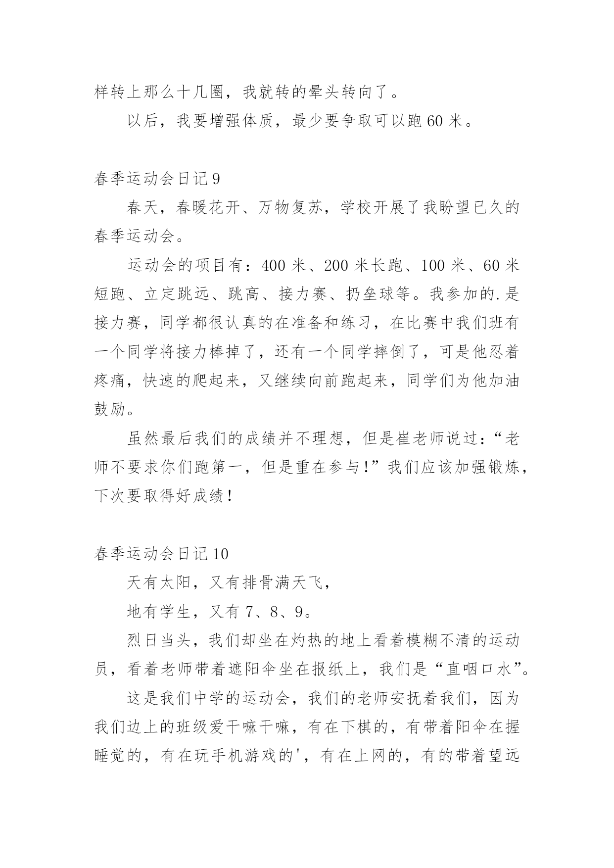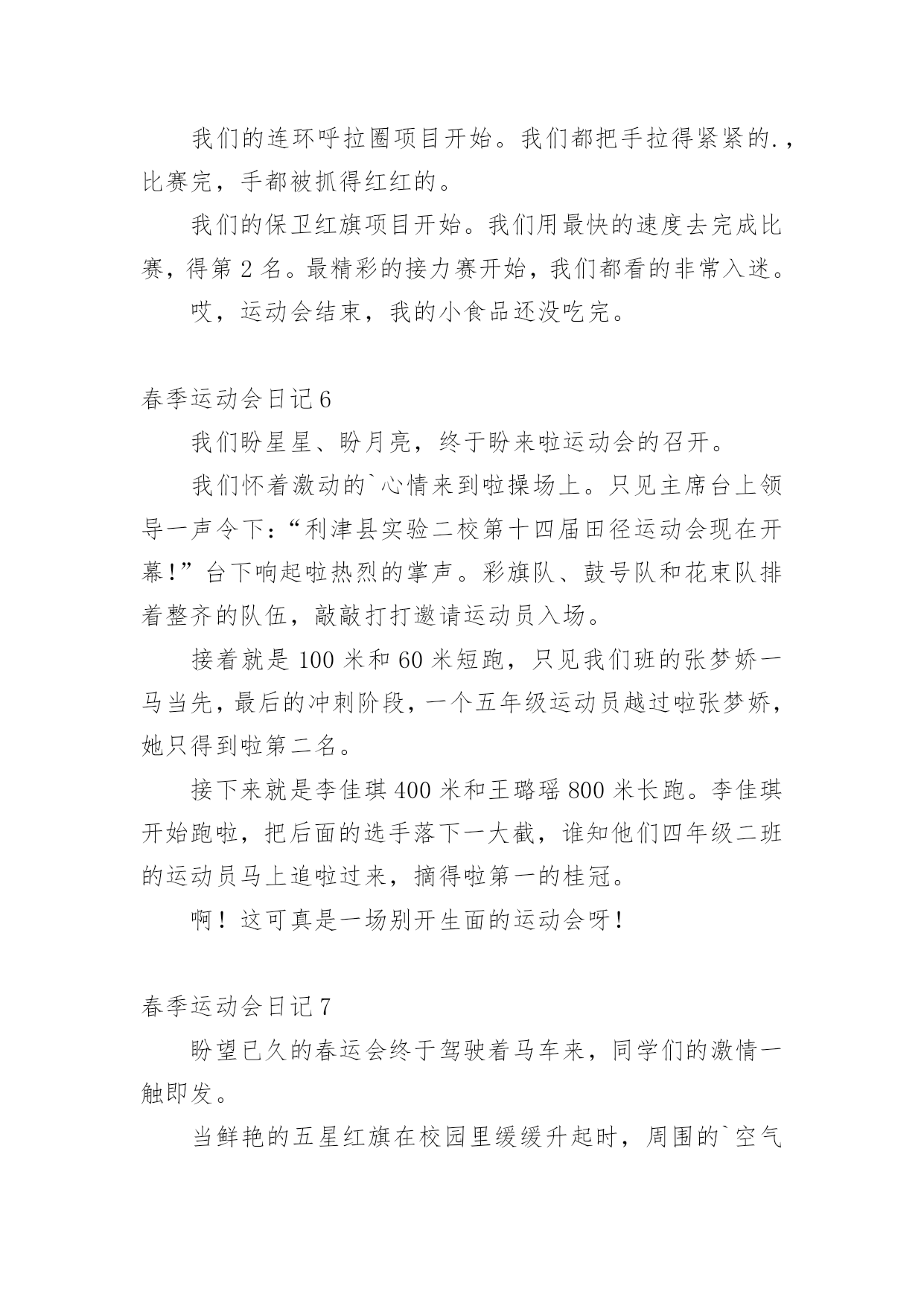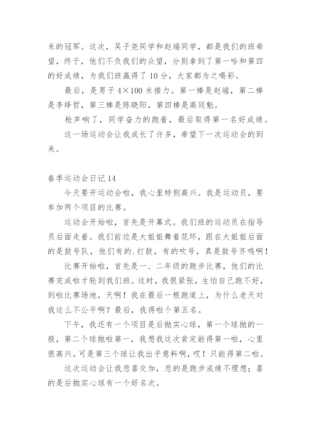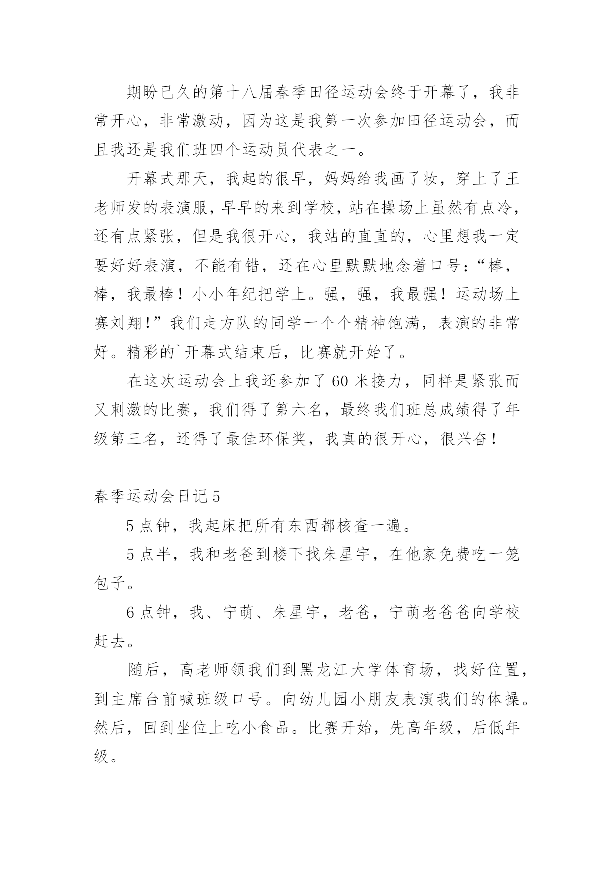 春季运动会日记忙碌而又充实的一天又过去了,想必大家都学习了不少新知识,此时此刻我们需要写一篇日记了。但是却发现不知道该写些什么,以下是小编帮大家整理的春季运动会日记,欢迎大家分享。春季运动会日记1我们期盼已久的运动会终于来了,我早早地起了床,准备好东西来到学校,今天我也特别兴奋,因为我也是一名运动员,我参加的.项目是跳远。运动会开始了,每个班级都有序地进场,同学们各个神采飞扬。首先各班举行了广播操、室内操比赛。我们班的同学都做得非常好,队伍很整齐,还得到表扬了呢!接着是个人项目比赛:五十米跑、扔垒球、跳远……轮到我跳远了,我想:我一定要跳出好成绩,最好能拿到金牌,给班级加分。于是,我站在起跳线上,使出全身的力气,好像小兔子一样蹦了出去,同学们也在一旁给我加油。最后我的成绩离获奖名单还有一段距离,我也有小小的失落感。在一旁的老师好好像看出了我的心事,不停地鼓励我。于是我打起精神,下决心:以后每天都要坚持锻炼,希望下次能取得好成绩。接下来是激烈的集体项目:赶小猪、接力赛……最后我们班得了第二名,同学们有信心明年一定要把第一名夺回来。春季运动会日记2在一个春暖花开的季节学校举行田径运动会。一大早同学们高高兴兴地来到学校。班主任曾老师我们领到运动场边。过啦一会儿只听见广播里说:“请三年级参加60米跑的'同学准备。”于是60米跑的同学都排好啦队。“拍”地一声枪响运动员们似箭一样向前冲刺谁都不服输。旁边的啦啦队不停地喊:“加油!加油!”这时一个运动员猛冲上去跑在前面紧随其后的另一个运动员不甘示弱加把劲超过啦跑在前面的运动员第一个到达终点为班里争啦光。春季运动会日记3在一个春暖花开的季节学校举行田径运动会。一大早同学们高高兴兴地来到学校。班主任曾老师我们领到运动场边。过了一会儿只听见广播里说:“请三年级参加60米跑的同学准备。”于是六十米跑的同学都排好了队。“拍”地一声枪响运动员们似箭一样向前冲刺谁都不服输。旁边的啦啦队不停地喊:“加油!加油!”这时一个运动员猛冲上去跑在前面紧随其后的.另一个运动员不甘示弱加把劲超过了跑在前面的运动员第一个到达终点为班里争了光。春季运动会日记4期盼已久的第十八届春季田径运动会终于开幕了,我非常开心,非常激动,因为这是我第一次参加田径运动会,而且我还是我们班四个运动员代表之一。开幕式那天,我起的很早,妈妈给我画了妆,穿上了王老师发的表演服,早早的来到学校,站在操场上虽然有点冷,还有点紧张,但是我很开心,我站的直直的,心里想我一定要好好表演,不能有错,还在心里默默地念着口号:“棒,棒,我最棒!小小年纪把学上。强,强,我最强!运动场上赛刘翔!”我们走方队的同学一个个精神饱满,表演的非常好。精彩的`开幕式结束后,比赛就开始了。在这次运动会上我还参加了60米接力,同样是紧张而又刺激的比赛,我们得了第六名,最终我们班总成绩得了年级第三名,还得了最佳环保奖,我真的很开心,很兴奋!春季运动会日记55点钟,我起床把所有东西都核查一遍。5点半,我和老爸到楼下找朱星宇,在他家免费吃一笼包子。6点钟,我、宁萌、朱星宇,老爸,宁萌老爸爸向学校赶去。随后,高老师领我们到黑龙江大学体育场,找好位置,到主席台前喊班级口号。向幼儿园小朋友表演我们的体操。然后,回到坐位上吃小食品。比赛开始,先高年级,后低年级。我们的连环呼拉圈项目开始。我们都把手拉得紧紧的.,比赛完,手都被抓得红红的。我们的保卫红旗项目开始。我们用最快的速度去完成比赛,得第2名。最精彩的接力赛开始,我们都看的非常入迷。哎,运动会结束,我的小食品还没吃完。春季运动会日记6我们盼星星、盼月亮,终于盼来啦运动会的召开。我们怀着激动的`心情来到啦操场上。只见主席台上领导一声令下:“利津县实验二校第十四届田径运动会现在开幕!”台下响起啦热烈的掌声。彩旗队、鼓号队和花束队排着整齐的队伍,敲敲打打邀请运动员入场。接着就是100米和60米短跑,只见我们班的张梦娇一马当先,最后的冲刺阶段,一个五年级运动员越过啦张梦娇,她只得到啦第二名。接下来就是李佳琪400米和王璐瑶800米长跑。李佳琪开始跑啦,把后面的选手落下一大截,谁知他们四年级二班的运动员马上追啦过来,摘得啦第一的桂冠。啊!这可真是一场别开生面的运动会呀!春季运动会日记7盼望已久的春运会终于驾驶着马车来,同学们的激情一触即发。当鲜艳的五星红旗在校园里缓缓升起时,周围的`空气凝固。当时的场面是那样的庄严肃穆!比赛开始,全场都是同学们的高声呐喊,我作为一名运动员,面对这动人的场面,我的心就像从身体中跳出来爆炸,我奔跑在四百米的跑道上,心中只想着“加快、加快,只要再快一步,胜利的希望就能实现,努力拼搏吧!终点就在眼前!”虽然我的嘴里干燥的冒烟儿,但正在自己要放弃的时候听到同学、老师的呐喊时,我情不自禁的加快速度,我虽然只得第三名,但我已经