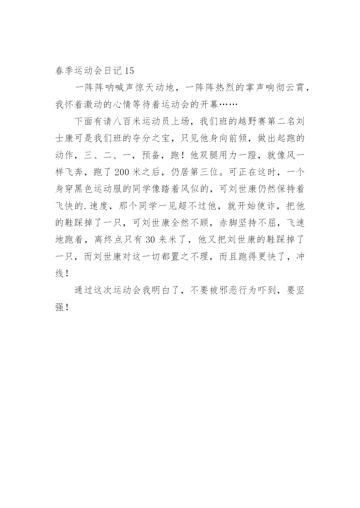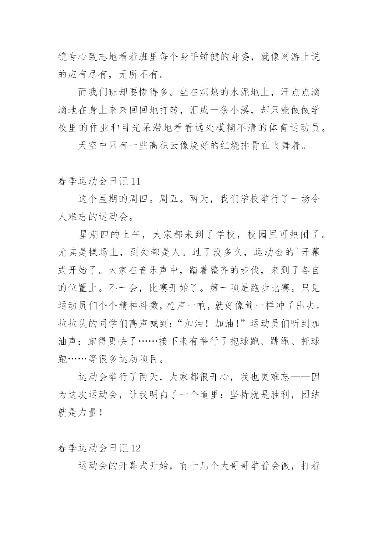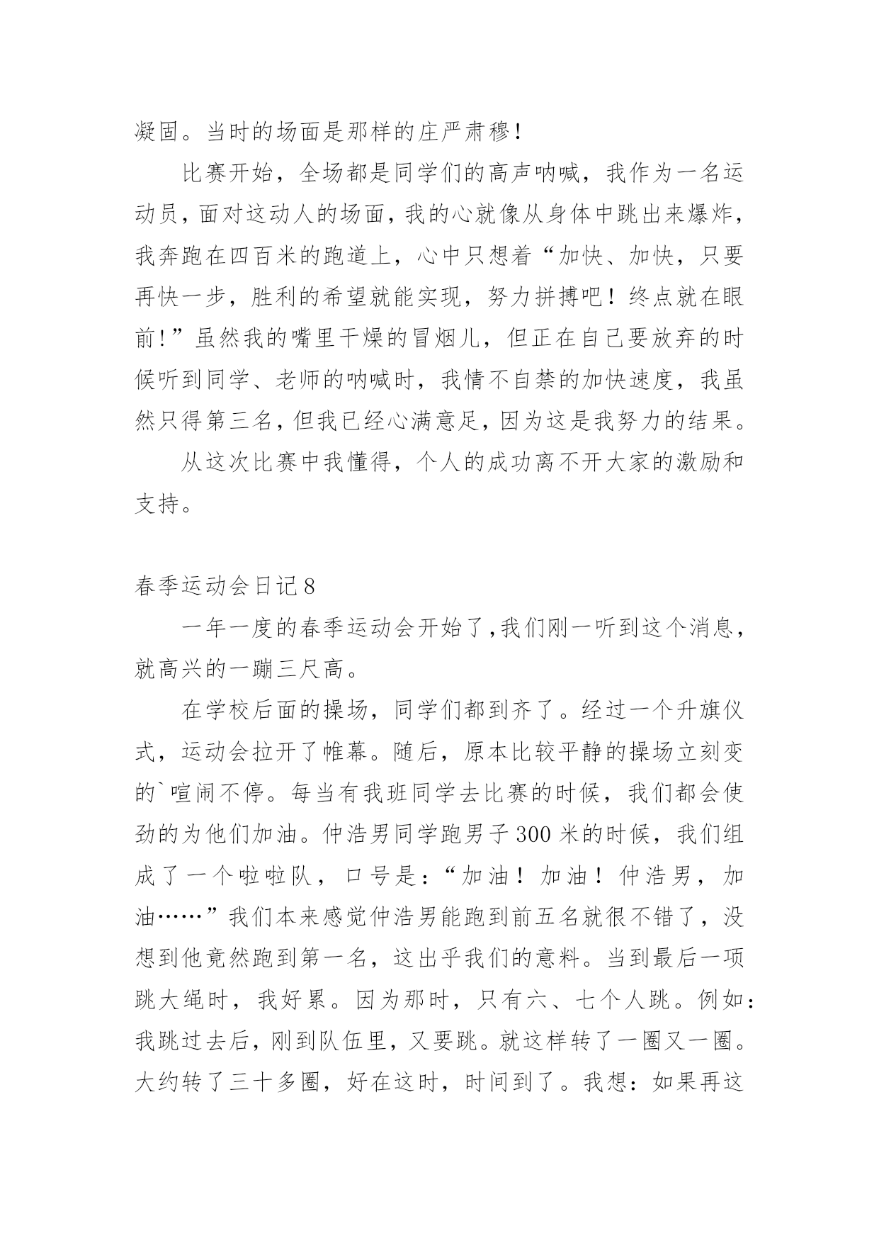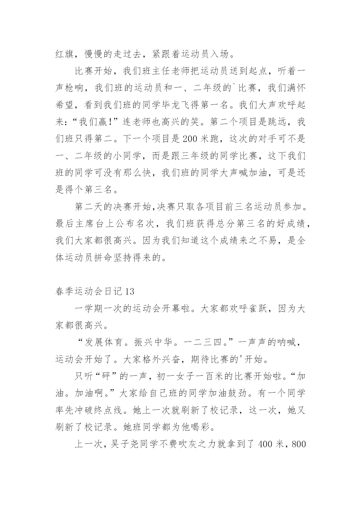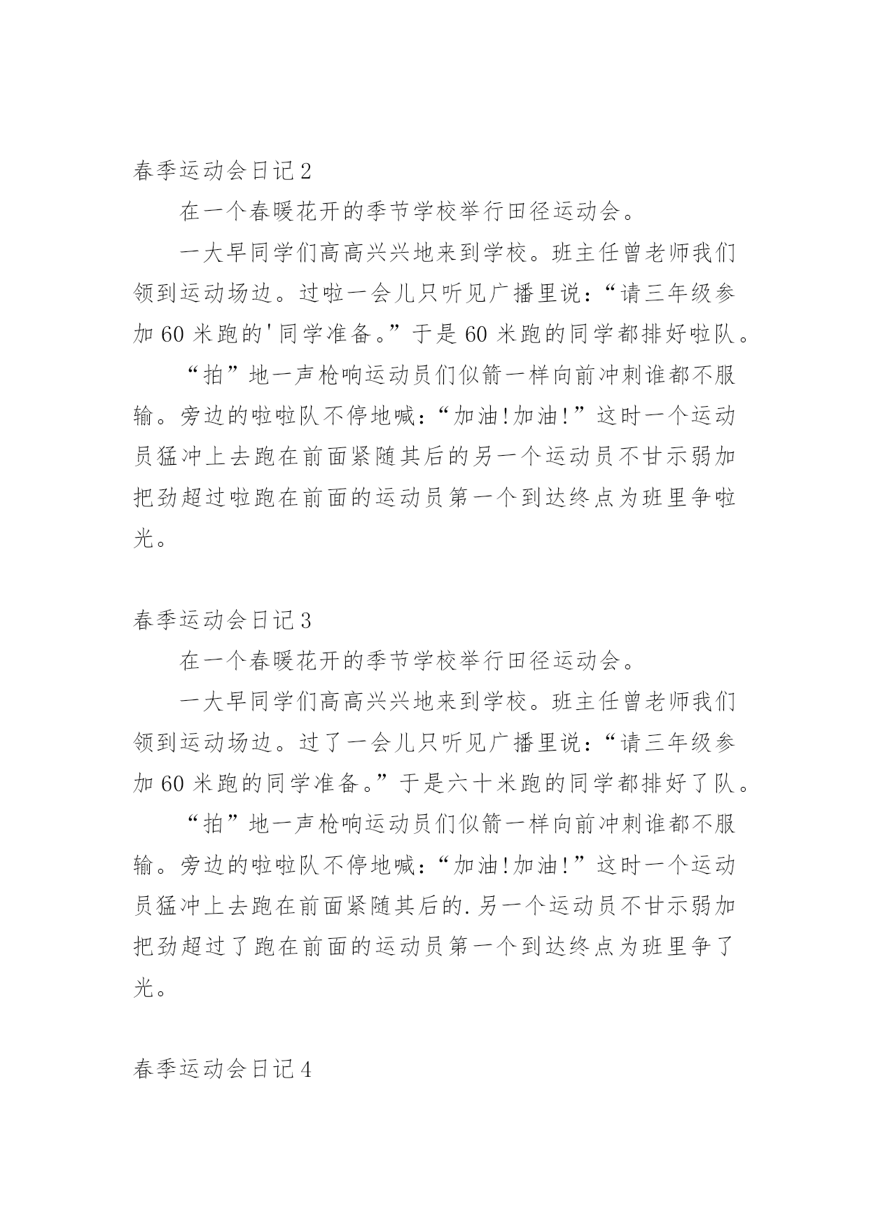 春季运动会日记忙碌而又充实的一天又过去了,想必大家都学习了不少新知识,此时此刻我们需要写一篇日记了。但是却发现不知道该写些什么,以下是小编帮大家整理的春季运动会日记,欢迎大家分享。春季运动会日记1我们期盼已久的运动会终于来了,我早早地起了床,准备好东西来到学校,今天我也特别兴奋,因为我也是一名运动员,我参加的.项目是跳远。运动会开始了,每个班级都有序地进场,同学们各个神采飞扬。首先各班举行了广播操、室内操比赛。我们班的同学都做得非常好,队伍很整齐,还得到表扬了呢!接着是个人项目比赛:五十米跑、扔垒球、跳远……轮到我跳远了,我想:我一定要跳出好成绩,最好能拿到金牌,给班级加分。于是,我站在起跳线上,使出全身的力气,好像小兔子一样蹦了出去,同学们也在一旁给我加油。最后我的成绩离获奖名单还有一段距离,我也有小小的失落感。在一旁的老师好好像看出了我的心事,不停地鼓励我。于是我打起精神,下决心:以后每天都要坚持锻炼,希望下次能取得好成绩。接下来是激烈的集体项目:赶小猪、接力赛……最后我们班得了第二名,同学们有信心明年一定要把第一名夺回来。春季运动会日记2在一个春暖花开的季节学校举行田径运动会。一大早同学们高高兴兴地来到学校。班主任曾老师我们领到运动场边。过啦一会儿只听见广播里说:“请三年级参加60米跑的'同学准备。”于是60米跑的同学都排好啦队。“拍”地一声枪响运动员们似箭一样向前冲刺谁都不服输。旁边的啦啦队不停地喊:“加油!加油!”这时一个运动员猛冲上去跑在前面紧随其后的另一个运动员不甘示弱加把劲超过啦跑在前面的运动员第一个到达终点为班里争啦光。春季运动会日记3在一个春暖花开的季节学校举行田径运动会。一大早同学们高高兴兴地来到学校。班主任曾老师我们领到运动场边。过了一会儿只听见广播里说:“请三年级参加60米跑的同学准备。”于是六十米跑的同学都排好了队。“拍”地一声枪响运动员们似箭一样向前冲刺谁都不服输。旁边的啦啦队不停地喊:“加油!加油!”这时一个运动员猛冲上去跑在前面紧随其后的.另一个运动员不甘示弱加把劲超过了跑在前面的运动员第一个到达终点为班里争了光。春季运动会日记4期盼已久的第十八届春季田径运动会终于开幕了,我非常开心,非常激动,因为这是我第一次参加田径运动会,而且我还是我们班四个运动员代表之一。开幕式那天,我起的很早,妈妈给我画了妆,穿上了王老师发的表演服,早早的来到学校,站在操场上虽然有点冷,还有点紧张,但是我很开心,我站的直直的,心里想我一定要好好表演,不能有错,还在心里默默地念着口号:“棒,棒,我最棒!小小年纪把学上。强,强,我最强!运动场上赛刘翔!”我们走方队的同学一个个精神饱满,表演的非常好。精彩的`开幕式结束后,比赛就开始了。在这次运动会上我还参加了60米接力,同样是紧张而又刺激的比赛,我们得了第六名,最终我们班总成绩得了年级第三名,还得了最佳环保奖,我真的很开心,很兴奋!春季运动会日记55点钟,我起床把所有东西都核查一遍。5点半,我和老爸到楼下找朱星宇,在他家免费吃一笼包子。6点钟,我、宁萌、朱星宇,老爸,宁萌老爸爸向学校赶去。随后,高老师领我们到黑龙江大学体育场,找好位置,到主席台前喊班级口号。向幼儿园小朋友表演我们的体操。然后,回到坐位上吃小食品。比赛开始,先高年级,后低年级。我们的连环呼拉圈项目开始。我们都把手拉得紧紧的.,比赛完,手都被抓得红红的。我们的保卫红旗项目开始。我们用最快的速度去完成比赛,得第2名。最精彩的接力赛开始,我们都看的非常入迷。哎,运动会结束,我的小食品还没吃完。春季运动会日记6我们盼星星、盼月亮,终于盼来啦运动会的召开。我们怀着激动的`心情来到啦操场上。只见主席台上领导一声令下:“利津县实验二校第十四届田径运动会现在开幕!”台下响起啦热烈的掌声。彩旗队、鼓号队和花束队排着整齐的队伍,敲敲打打邀请运动员入场。接着就是100米和60米短跑,只见我们班的张梦娇一马当先,最后的冲刺阶段,一个五年级运动员越过啦张梦娇,她只得到啦第二名。接下来就是李佳琪400米和王璐瑶800米长跑。李佳琪开始跑啦,把后面的选手落下一大截,谁知他们四年级二班的运动员马上追啦过来,摘得啦第一的桂冠。啊!这可真是一场别开生面的运动会呀!春季运动会日记7盼望已久的春运会终于驾驶着马车来,同学们的激情一触即发。当鲜艳的五星红旗在校园里缓缓升起时,周围的`空气凝固。当时的场面是那样的庄严肃穆!比赛开始,全场都是同学们的高声呐喊,我作为一名运动员,面对这动人的场面,我的心就像从身体中跳出来爆炸,我奔跑在四百米的跑道上,心中只想着“加快、加快,只要再快一步,胜利的希望就能实现,努力拼搏吧!终点就在眼前!”虽然我的嘴里干燥的冒烟儿,但正在自己要放弃的时候听到同学、老师的呐喊时,我情不自禁的加快速度,我虽然只得第三名,但我已经