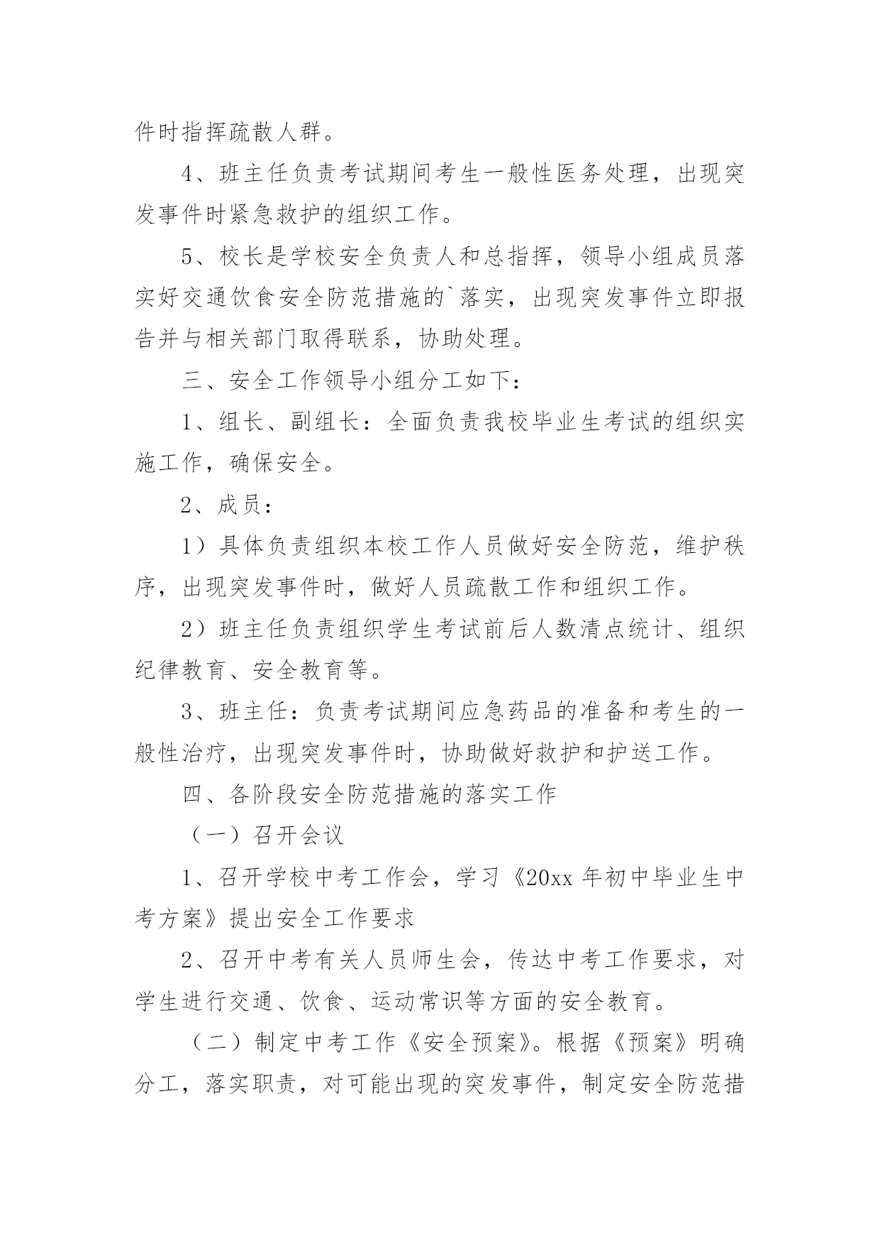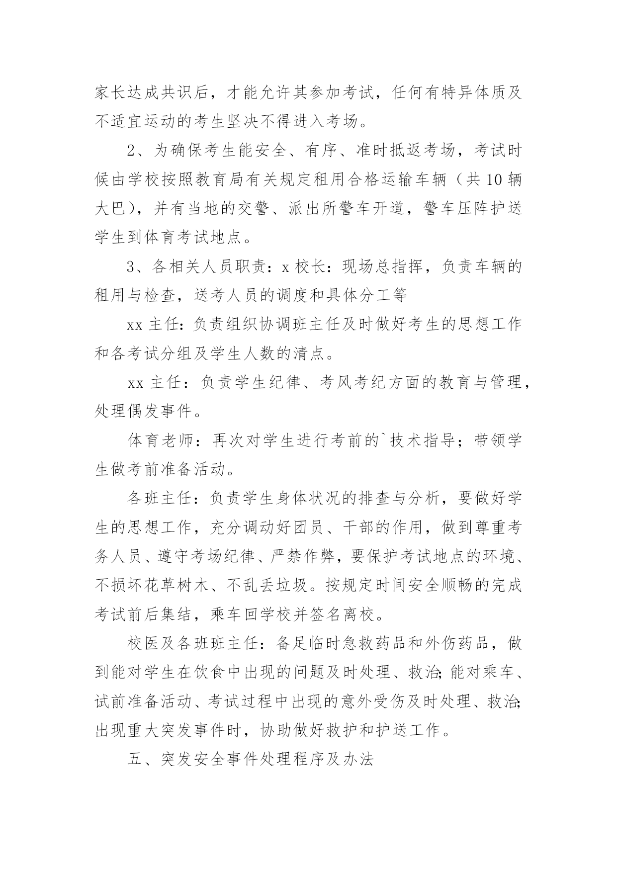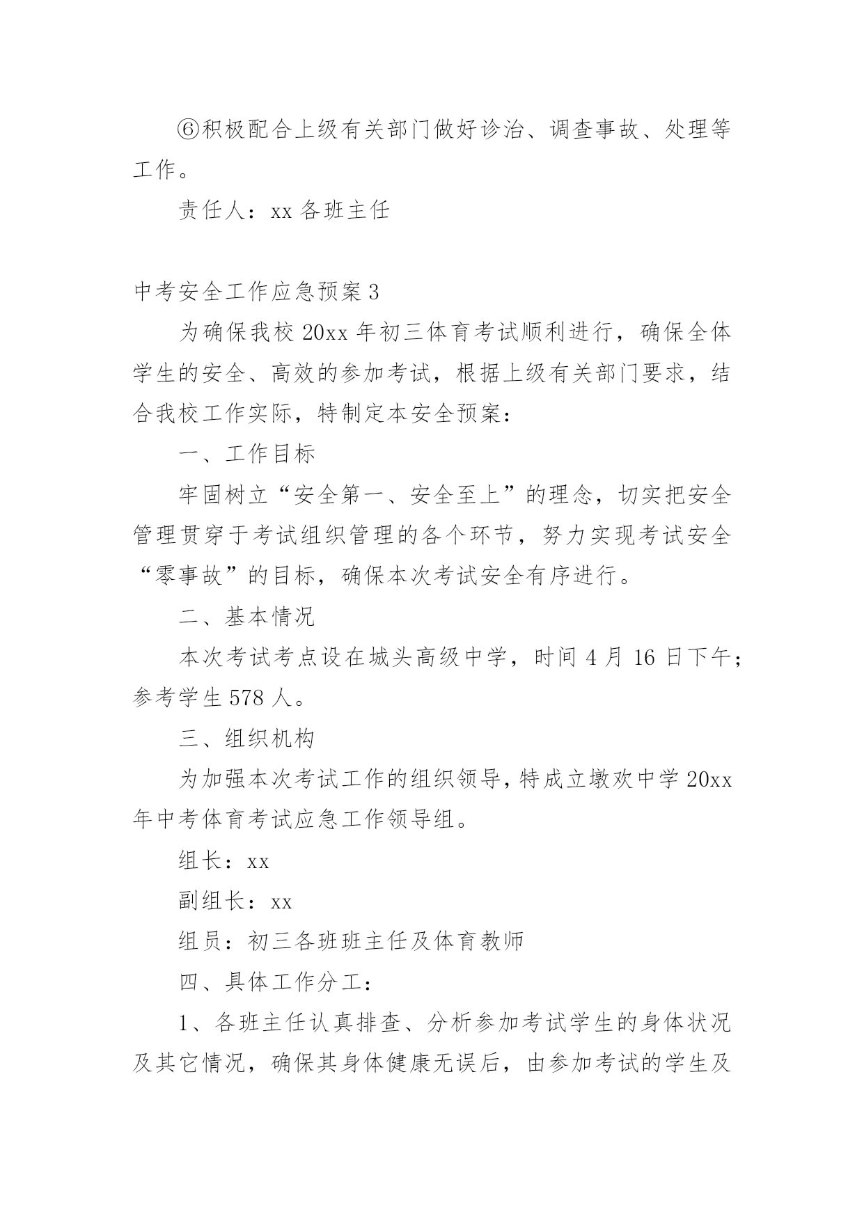 中考安全工作应急预案1中考安全工作应急预案在日常学习、工作抑或是生活中,保不齐会遇到一些意料之外的事件或事故,为了将危害降到最低,就不得不需要事先制定应急预案。我们应该怎么编制应急预案呢?下面是小编为大家整理的中考安全工作应急预案,欢迎阅读,希望大家能够喜欢。中考安全工作应急预案1为确保20xx年我校初中毕业生升学考试工作安全顺利进行,根据珙县教育和体育局中考会议中关于安全工作的要求,结合我校实际,特制定本预案。一、体育考试安全工作领导组长:xx副组长:xx成员:考试带队老师及初三年级各班班主任二、工作职责1、负责对考试安全工作进行部署检查,做好现场应急处理工作。2、负责对参考人员安全教育,出现突发事件时统一协调转移参考学生和考务人员,并安排好应急车辆。3、负责各项安全防范措施的检查与落实,出现突发事件时指挥疏散人群。4、班主任负责考试期间考生一般性医务处理,出现突发事件时紧急救护的组织工作。5、校长是学校安全负责人和总指挥,领导小组成员落实好交通饮食安全防范措施的`落实,出现突发事件立即报告并与相关部门取得联系,协助处理。三、安全工作领导小组分工如下:1、组长、副组长:全面负责我校毕业生考试的组织实施工作,确保安全。2、成员:1)具体负责组织本校工作人员做好安全防范,维护秩序,出现突发事件时,做好人员疏散工作和组织工作。2)班主任负责组织学生考试前后人数清点统计、组织纪律教育、安全教育等。3、班主任:负责考试期间应急药品的准备和考生的一般性治疗,出现突发事件时,协助做好救护和护送工作。四、各阶段安全防范措施的落实工作(一)召开会议1、召开学校中考工作会,学习《20xx年初中毕业生中考方案》提出安全工作要求2、召开中考有关人员师生会,传达中考工作要求,对学生进行交通、饮食、运动常识等方面的安全教育。(二)制定中考工作《安全预案》。根据《预案》明确分工,落实职责,对可能出现的突发事件,制定安全防范措施和应急处理办法。(三)考前做好考生健康的筛查工作,充分了解学生身心状况,坚决杜绝麻痹思想。凡不适合参加考试的考生(经班主任询问、查看体检记录、听取家长建议),做好其思想工作,坚决不能带病参加考试。其他安全防范事项五、预防和处理突发事件应急工作措施(一)考试期间一旦发生突发性事件,现场领导及时了解和分析事件的起因和发展态势,第一时间汇报主要领导,采取措施控制相关人员,降低事件的持续时间和影响范围,将损失降低到最小限度。(二)学生出现不同程度意外伤害处理流程1、考生出现挫伤、扭伤、肌肉拉伤等一般性损伤时,各考务组有关人员要立即请医务人员到现场医治。2、考生出现剧烈呕吐、眩晕、骨折、休克等较重症状时,采取以下措施:(1)应立即向考场安全工作领导小组报告,考场安全工作领导小组其它成员按分工立即进入应急工作状态。(2)医护人员到现场实施救护(3)现场领导负责用电话向主要领导汇报相关情况并及时与医院联系,做好抢救的准备工作,便于医院立即安排救护车辆和人员护送伤者到医院救治。(4)考生是否继续考试必须认真听取考生本人意见,再结合实际情况由相关领导作出处理。中考安全工作应急预案2为确保我校xx中考学生安全,有效处理中考中突发安全事故,使突发安全事故损失降低到最低限度,中考工作安全应急预案。根据市、区教育局的有关要求,结合本校实际情况,树立安全重于泰山的思想,为中考排除一切障碍,确保中考万无一失,使20xx年中考争取好的成绩,特制订《兴城四中20xx年中考安全工作及应急预案》。一、成立中考安全工作领导小组,统一指挥和组织我校在中考期间突发安全事故的应急处理工作。组长:xx副组长:xxx成员:各班主任二、可能突发安全事故种类预设:根据我校所处地理位置和与各考区间的路线,主要有交通事故、食物中毒、中考途中意外事故、交通工具意外故障事故等。三、中考安全工作预案目的:为了有效预防、及时控制、妥善处置中考突发安全事故,提高快速反应和应急处理能力,建立以“信息畅通、反应快捷、处置有方、责任明确”十六字的突发安全事故应急机制,保障师生生命财产安全,保证我校中考安全和顺利进行,特制订本预案。四、安全应急预案启动程序及处置:(一)交通安全1、在考试前必须对学生进行考前心理疏导、加强对学生途中、考点的人身安全和交通等安全教育。责任人:xx2、安全措施:在上述考试和考务期间,学校安全领导小组组长、副组长和成员必须全程负责。通讯工具必须随时保证畅通,以中考安全为第一,保障考务安全通讯的优先。沿途安全具体责任落实如下:(1)沿途有各班主任全程跟踪巡视,确保学生途中交通安全、交通工具安全和避免发生意外伤害事故的发生,工作总结《中考工作安全应急预案》。禁止学生骑双人车。xx负责全程流动安全的保障。责任人:xx(2)学校门前十字路口的交通安全。责任人:xx(3)医院十字路口的交