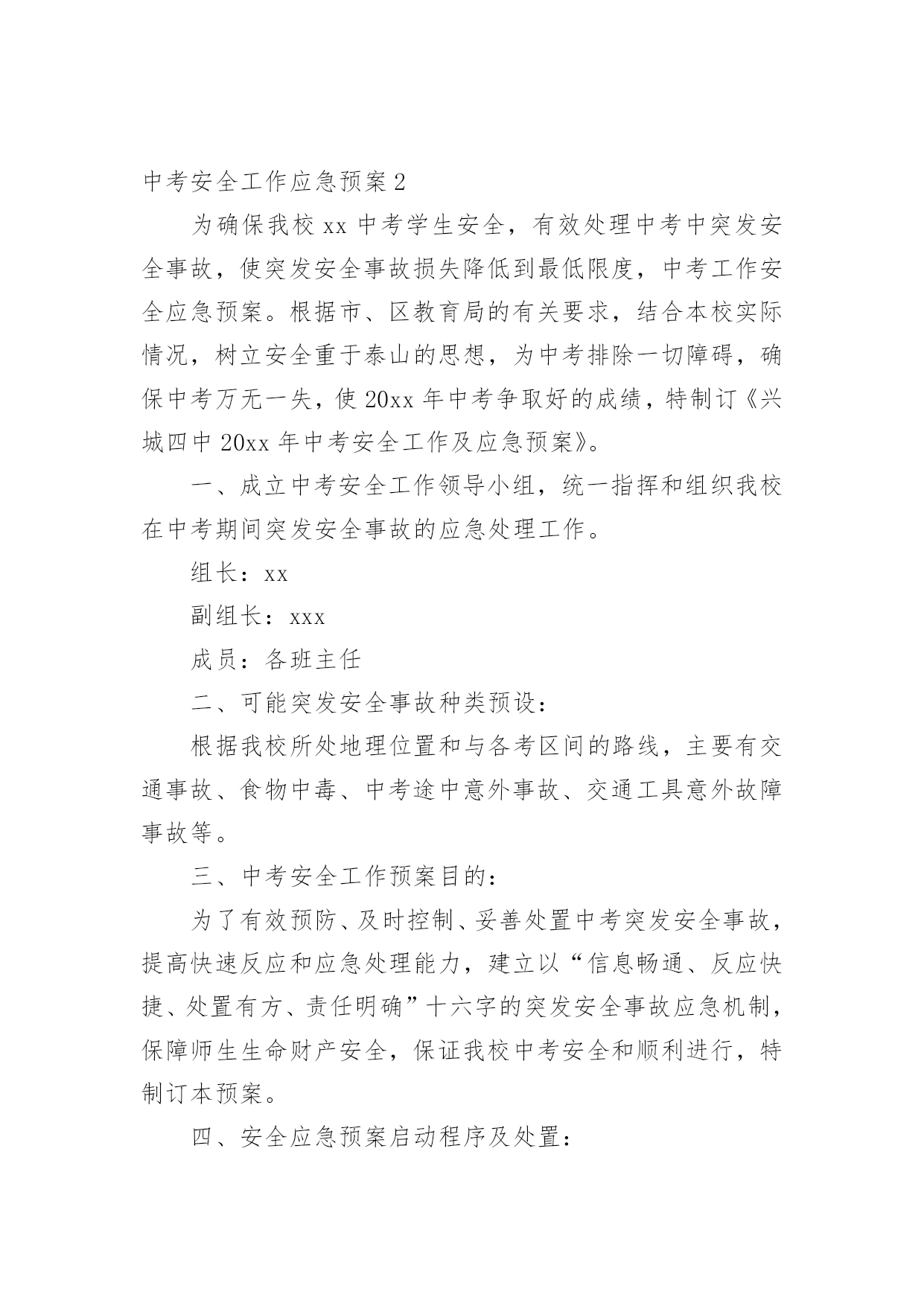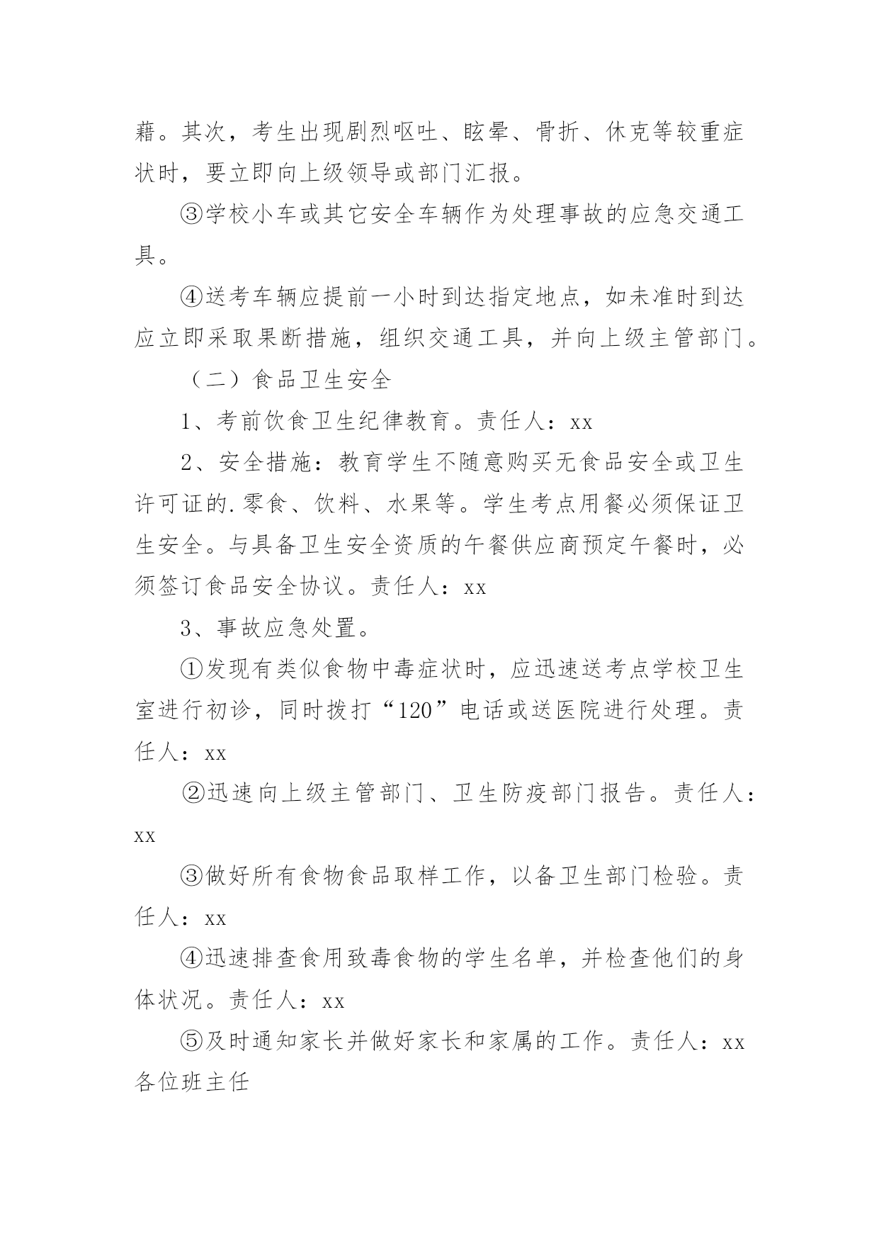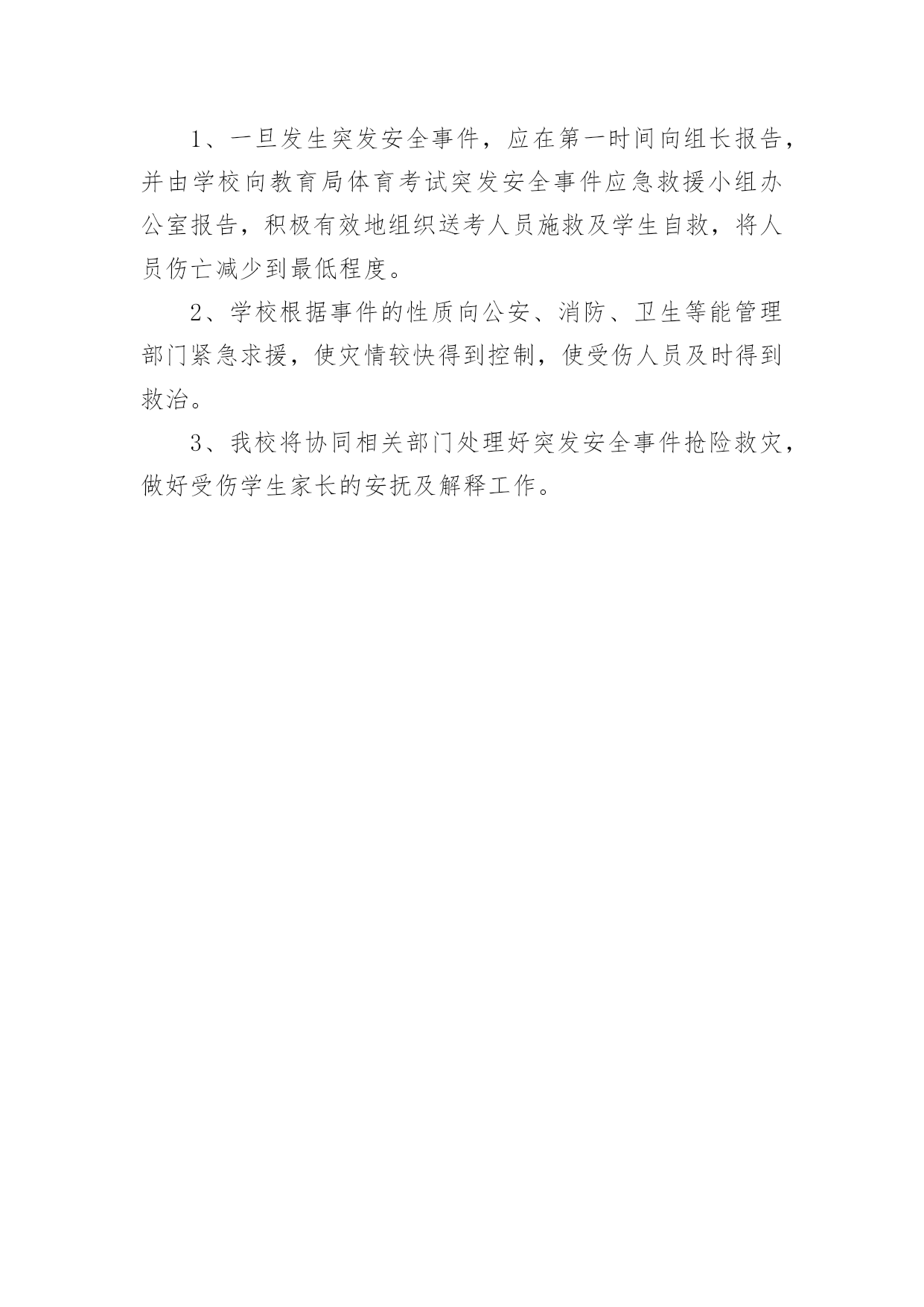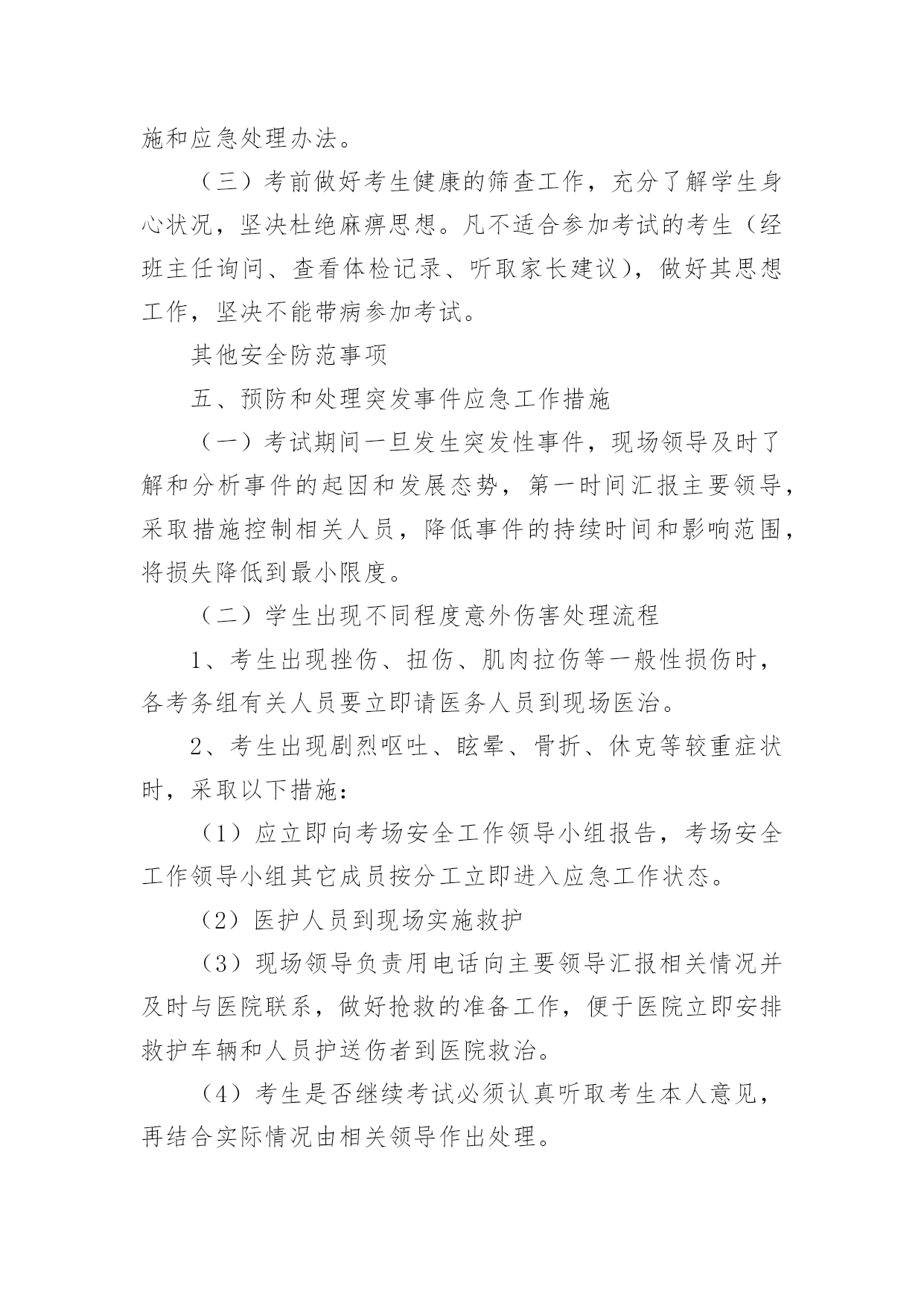 中考安全工作应急预案1中考安全工作应急预案在日常学习、工作抑或是生活中,保不齐会遇到一些意料之外的事件或事故,为了将危害降到最低,就不得不需要事先制定应急预案。我们应该怎么编制应急预案呢?下面是小编为大家整理的中考安全工作应急预案,欢迎阅读,希望大家能够喜欢。中考安全工作应急预案1为确保20xx年我校初中毕业生升学考试工作安全顺利进行,根据珙县教育和体育局中考会议中关于安全工作的要求,结合我校实际,特制定本预案。一、体育考试安全工作领导组长:xx副组长:xx成员:考试带队老师及初三年级各班班主任二、工作职责1、负责对考试安全工作进行部署检查,做好现场应急处理工作。2、负责对参考人员安全教育,出现突发事件时统一协调转移参考学生和考务人员,并安排好应急车辆。3、负责各项安全防范措施的检查与落实,出现突发事件时指挥疏散人群。4、班主任负责考试期间考生一般性医务处理,出现突发事件时紧急救护的组织工作。5、校长是学校安全负责人和总指挥,领导小组成员落实好交通饮食安全防范措施的`落实,出现突发事件立即报告并与相关部门取得联系,协助处理。三、安全工作领导小组分工如下:1、组长、副组长:全面负责我校毕业生考试的组织实施工作,确保安全。2、成员:1)具体负责组织本校工作人员做好安全防范,维护秩序,出现突发事件时,做好人员疏散工作和组织工作。2)班主任负责组织学生考试前后人数清点统计、组织纪律教育、安全教育等。3、班主任:负责考试期间应急药品的准备和考生的一般性治疗,出现突发事件时,协助做好救护和护送工作。四、各阶段安全防范措施的落实工作(一)召开会议1、召开学校中考工作会,学习《20xx年初中毕业生中考方案》提出安全工作要求2、召开中考有关人员师生会,传达中考工作要求,对学生进行交通、饮食、运动常识等方面的安全教育。(二)制定中考工作《安全预案》。根据《预案》明确分工,落实职责,对可能出现的突发事件,制定安全防范措施和应急处理办法。(三)考前做好考生健康的筛查工作,充分了解学生身心状况,坚决杜绝麻痹思想。凡不适合参加考试的考生(经班主任询问、查看体检记录、听取家长建议),做好其思想工作,坚决不能带病参加考试。其他安全防范事项五、预防和处理突发事件应急工作措施(一)考试期间一旦发生突发性事件,现场领导及时了解和分析事件的起因和发展态势,第一时间汇报主要领导,采取措施控制相关人员,降低事件的持续时间和影响范围,将损失降低到最小限度。(二)学生出现不同程度意外伤害处理流程1、考生出现挫伤、扭伤、肌肉拉伤等一般性损伤时,各考务组有关人员要立即请医务人员到现场医治。2、考生出现剧烈呕吐、眩晕、骨折、休克等较重症状时,采取以下措施:(1)应立即向考场安全工作领导小组报告,考场安全工作领导小组其它成员按分工立即进入应急工作状态。(2)医护人员到现场实施救护(3)现场领导负责用电话向主要领导汇报相关情况并及时与医院联系,做好抢救的准备工作,便于医院立即安排救护车辆和人员护送伤者到医院救治。(4)考生是否继续考试必须认真听取考生本人意见,再结合实际情况由相关领导作出处理。中考安全工作应急预案2为确保我校xx中考学生安全,有效处理中考中突发安全事故,使突发安全事故损失降低到最低限度,中考工作安全应急预案。根据市、区教育局的有关要求,结合本校实际情况,树立安全重于泰山的思想,为中考排除一切障碍,确保中考万无一失,使20xx年中考争取好的成绩,特制订《兴城四中20xx年中考安全工作及应急预案》。一、成立中考安全工作领导小组,统一指挥和组织我校在中考期间突发安全事故的应急处理工作。组长:xx副组长:xxx成员:各班主任二、可能突发安全事故种类预设:根据我校所处地理位置和与各考区间的路线,主要有交通事故、食物中毒、中考途中意外事故、交通工具意外故障事故等。三、中考安全工作预案目的:为了有效预防、及时控制、妥善处置中考突发安全事故,提高快速反应和应急处理能力,建立以“信息畅通、反应快捷、处置有方、责任明确”十六字的突发安全事故应急机制,保障师生生命财产安全,保证我校中考安全和顺利进行,特制订本预案。四、安全应急预案启动程序及处置:(一)交通安全1、在考试前必须对学生进行考前心理疏导、加强对学生途中、考点的人身安全和交通等安全教育。责任人:xx2、安全措施:在上述考试和考务期间,学校安全领导小组组长、副组长和成员必须全程负责。通讯工具必须随时保证畅通,以中考安全为第一,保障考务安全通讯的优先。沿途安全具体责任落实如下:(1)沿途有各班主任全程跟踪巡视,确保学生途中交通安全、交通工具安全和避免发生意外伤害事故的发生,工作总结《中考工作安全应急预案》。禁止学生骑双人车。xx负责全程流动安全的保障。责任人:xx(2)学校门前十字路口的交通安全。责任人:xx(3)医院十字路口的交
