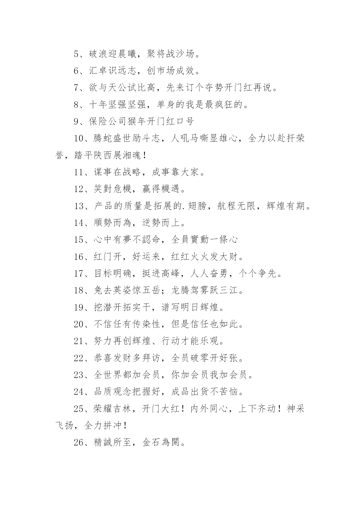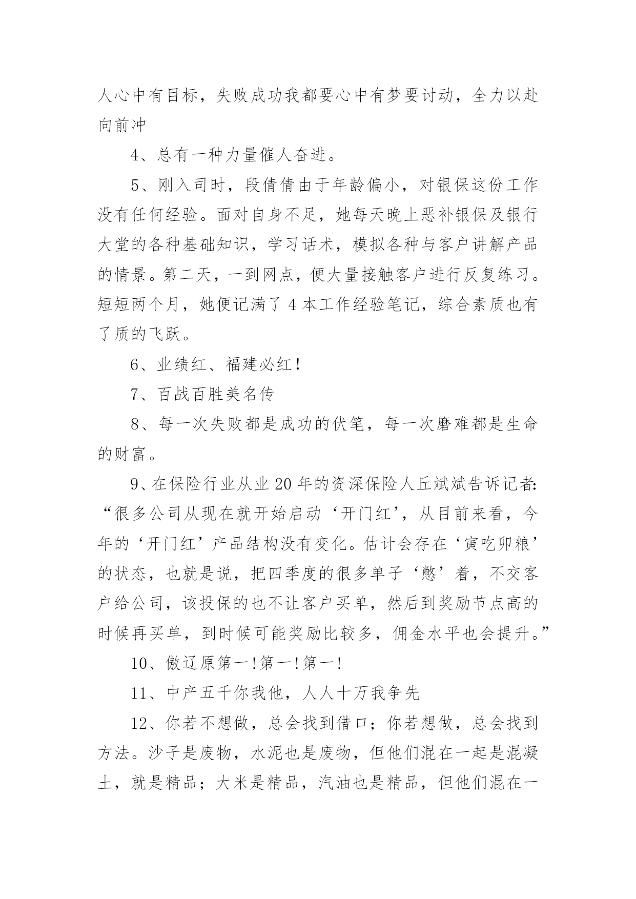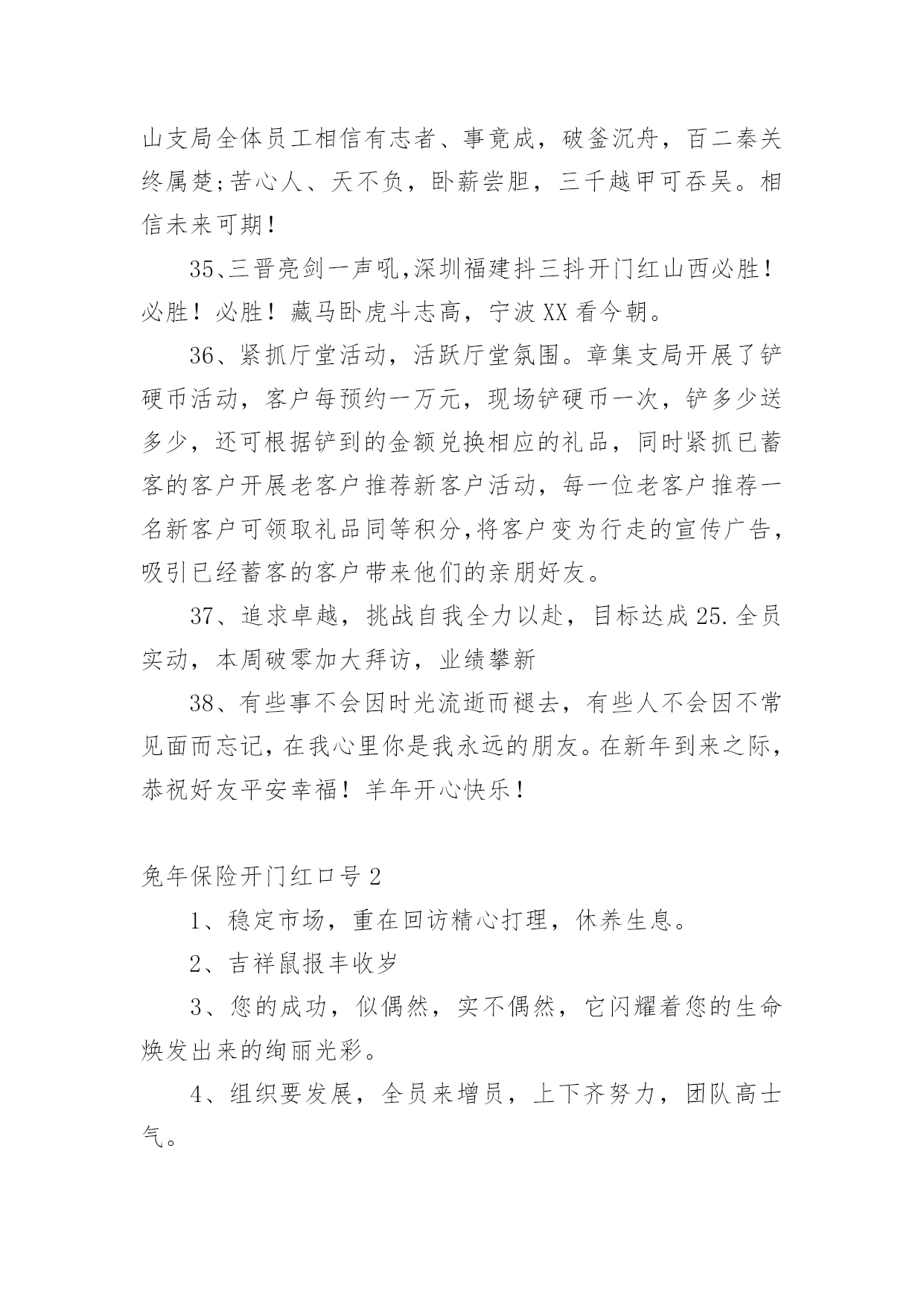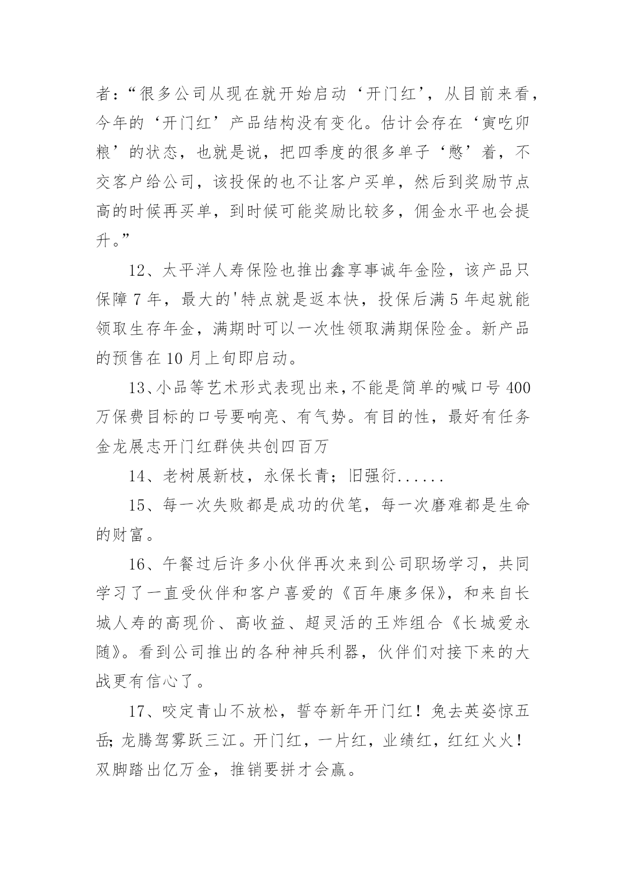 兔年保险开门红口号1兔年保险开门红口号15篇无论在学习、工作或是生活中,大家都看到过口号吧,口号作为意识的表现形式之一,是对当时社会政治、经济、文化的一种反映,不同性质的口号起着不同的作用。那么都有哪些类型的口号呢?以下是小编帮大家整理的兔年保险开门红口号,仅供参考,希望能够帮助到大家。兔年保险开门红口号11、借势渠道,专业经营超越梦想,北京必胜!马踏映骄阳,满堂开门红新疆将士越天山,力压北分战熬头2、人的一生其实很短,如白驹过隙,弹指一瞬间。3、焦作中支马村支公司经理李芳4、20xx年12月18日,泛华保险马鞍山分公司在鸿泰国际大酒店成功迎来了机构首个开门红启动会,并圆满举办。300余名泛华精英齐聚一堂,回顾20展望20作为一家全省最年轻新筹机构,20xx年华保费跻身到全省第二的位置。20xx年坚决贯彻执行泛华模式:“以销售组织建设为核心,大力发展寿险,坚定不移构建‘全面金融、科技领先’竞争优势,马鞍山全体泛华精英将以满腔热情迎接新一年的挑战,再创新的辉煌。5、你若不想做,总会找到借口;你若想做,总会找到方法。沙子是废物,水泥也是废物,但他们混在一起是混凝土,就是精品;大米是精品,汽油也是精品,但他们混在一起就是废......1、去过你想过的日子,别去想你过了的日子。6、12月18日,对于泛华巢湖平台而言,是一个神圣又充满纪念意义的日子!因为在今天,我们迎来了泛华保险服务集团巢湖分公司的开业盛典暨20xx年开门红启动大会,会议在巢湖汉爵酒店隆重召开。近200余名泛华精英齐聚一堂,回顾20展望20对20xx年取得突出成绩的精英进行了隆重荣誉表彰,会上并推出20xx年开门红最具核心竞争力的一款王炸组合产品——长城爱永随进行了详细的学习。7、同样,对于强者恒强的保险公司,今年的“开门红”也被认为是其守住市场份额的关键。记者注意到,20xx年举国“战役”时期,保险面对面营销亦受限,在去年“开门红”启动较早的中国人寿、新华人寿相对受影响不大,仍保持规模的增长。而在此前看淡“开门红”的寿险公司则受到一定冲击。8、鸿运当头照羊年好运到首战X百万9、一等二靠三落空,一想二干三成功,开门红、一片红、业绩红、福建必红!战福建,展甘肃豪迈。抗宁波,现陇原风采钢铁意志钢铁汉,虎狼之师在胶南雷霆万钧战乾坤,亮剑凯旋西海岸10、学习如一粒种子,只有努力播......11、在保险行业从业20年的资深保险人丘斌斌告诉记者:“很多公司从现在就开始启动‘开门红’,从目前来看,今年的‘开门红’产品结构没有变化。估计会存在‘寅吃卯粮’的状态,也就是说,把四季度的很多单子‘憋’着,不交客户给公司,该投保的也不让客户买单,然后到奖励节点高的时候再买单,到时候可能奖励比较多,佣金水平也会提升。”12、太平洋人寿保险也推出鑫享事诚年金险,该产品只保障7年,最大的'特点就是返本快,投保后满5年起就能领取生存年金,满期时可以一次性领取满期保险金。新产品的预售在10月上旬即启动。13、小品等艺术形式表现出来,不能是简单的喊口号400万保费目标的口号要响亮、有气势。有目的性,最好有任务金龙展志开门红群侠共创四百万14、老树展新枝,永保长青;旧强衍......15、每一次失败都是成功的伏笔,每一次磨难都是生命的财富。16、午餐过后许多小伙伴再次来到公司职场学习,共同学习了一直受伙伴和客户喜爱的《百年康多保》,和来自长城人寿的高现价、高收益、超灵活的王炸组合《长城爱永随》。看到公司推出的各种神兵利器,伙伴们对接下来的大战更有信心了。17、咬定青山不放松,誓夺新年开门红!兔去英姿惊五岳;龙腾驾雾跃三江。开门红,一片红,业绩红,红红火火!双脚踏出亿万金,推销要拼才会赢。18、上联:群星瞻北斗;下联:万马啸东风。19、心中有梦要行动,全力以赴向前冲。恭喜发财多拜访,全员破零开好张。服务回访辞旧岁,全力举绩贺新春。20、通过十字支局全体员工的共同努力,20xx年十字支局保险业务的发展取得了一定的成绩,但昔日的成绩已成为过去,我们只会用它去鞭策自己、激励自己,我们的目标还很远,我会带领十字支局全体员工,以沭阳邮政人特有的坚韧顽强的优秀品质,适应金融市场新常态,十字作为国家级转型网点,有能力、有信心、也有决心,奋力开拓保险业务更广阔的市场,同心逐梦,顽强拼搏,全身心投入到新一轮开门红战役中去!21、值得注意的是,“开门红”时期,也是营销误导、不实宣传、欺骗混淆、虚假承诺的高发时期。22、胜者之所以胜~士气定乾坤23、天是冷的,心是暖的,对您的祝福是永远的;人是远的,心是近的,......1、生气不如争气,求救不如自救。24、同样在积极准备拼抢“开门红”的还有一众中小险企。25、刚入司时,段倩倩由于年龄偏小,对银保这份工作没有任何经验。面对自身不足,她每天晚上恶补银保及银行大堂的各种基础知识,