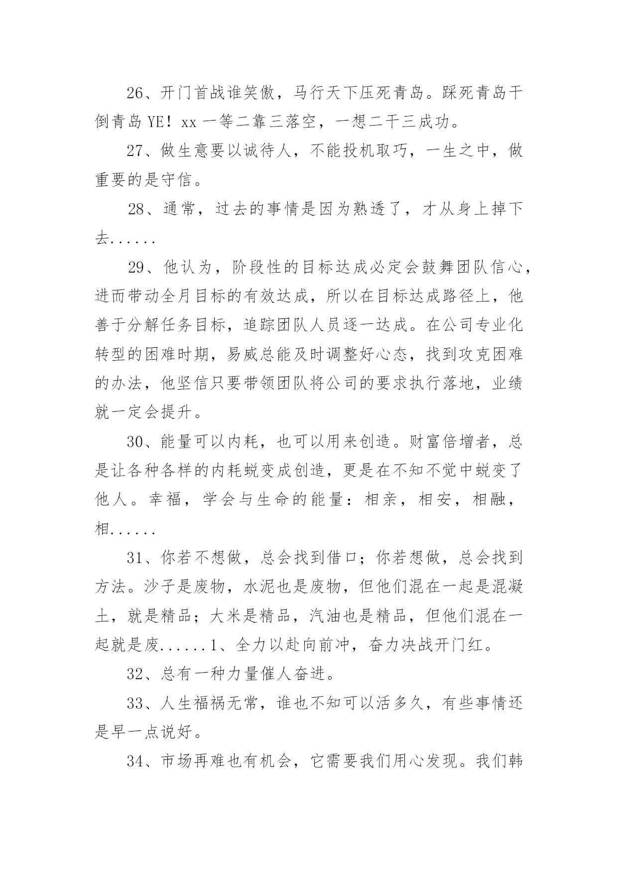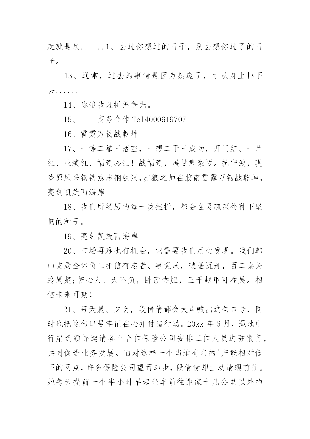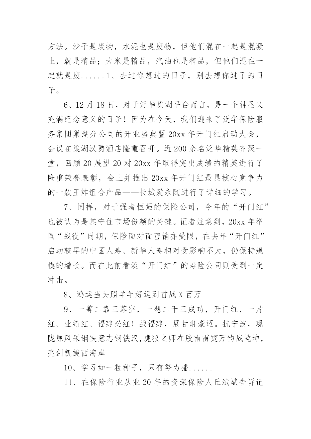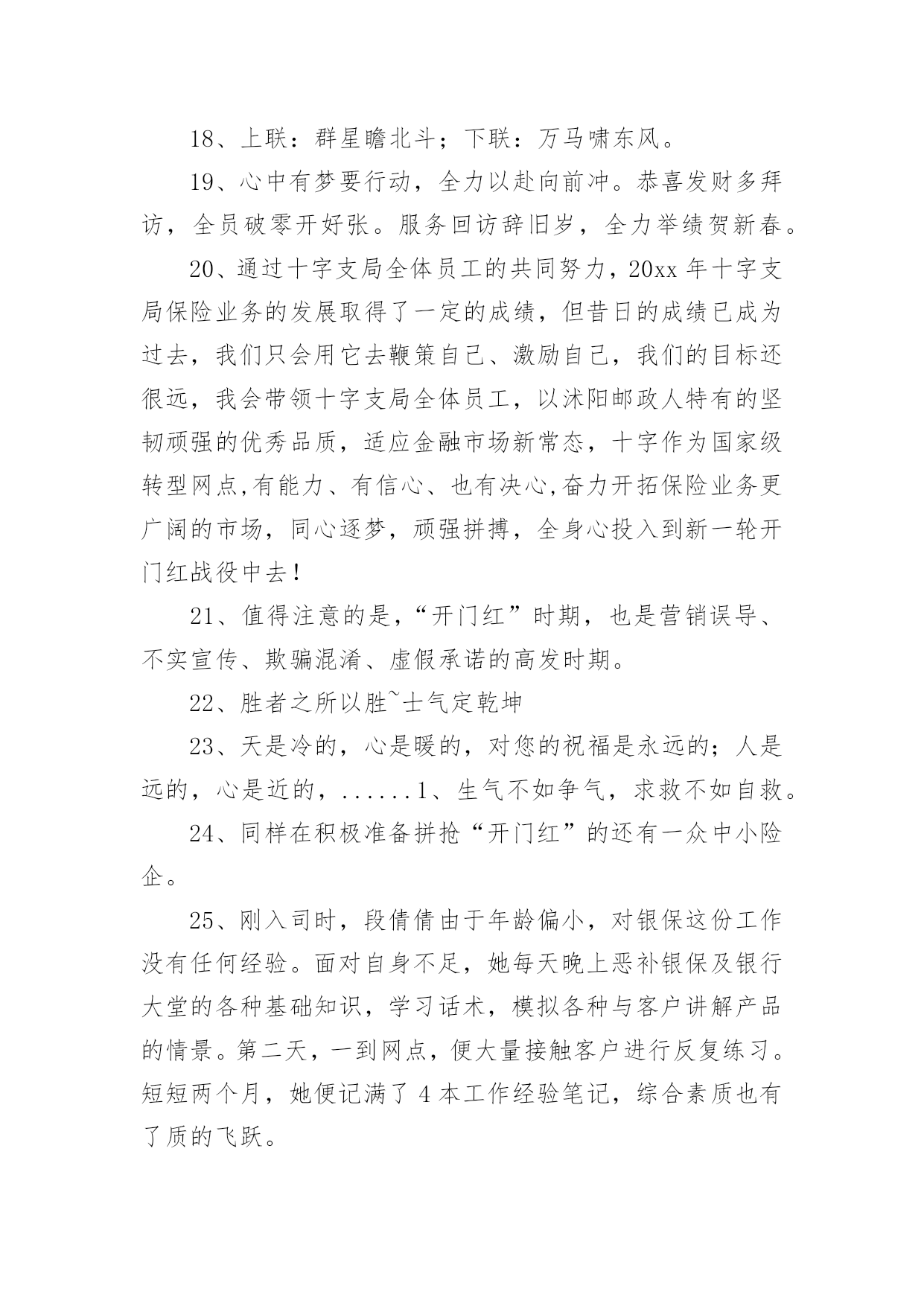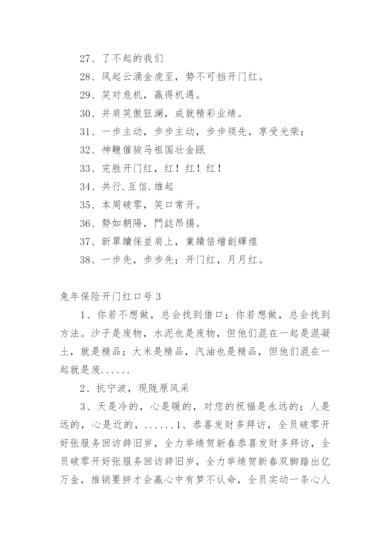 兔年保险开门红口号1兔年保险开门红口号15篇无论在学习、工作或是生活中,大家都看到过口号吧,口号作为意识的表现形式之一,是对当时社会政治、经济、文化的一种反映,不同性质的口号起着不同的作用。那么都有哪些类型的口号呢?以下是小编帮大家整理的兔年保险开门红口号,仅供参考,希望能够帮助到大家。兔年保险开门红口号11、借势渠道,专业经营超越梦想,北京必胜!马踏映骄阳,满堂开门红新疆将士越天山,力压北分战熬头2、人的一生其实很短,如白驹过隙,弹指一瞬间。3、焦作中支马村支公司经理李芳4、20xx年12月18日,泛华保险马鞍山分公司在鸿泰国际大酒店成功迎来了机构首个开门红启动会,并圆满举办。300余名泛华精英齐聚一堂,回顾20展望20作为一家全省最年轻新筹机构,20xx年华保费跻身到全省第二的位置。20xx年坚决贯彻执行泛华模式:“以销售组织建设为核心,大力发展寿险,坚定不移构建‘全面金融、科技领先’竞争优势,马鞍山全体泛华精英将以满腔热情迎接新一年的挑战,再创新的辉煌。5、你若不想做,总会找到借口;你若想做,总会找到方法。沙子是废物,水泥也是废物,但他们混在一起是混凝土,就是精品;大米是精品,汽油也是精品,但他们混在一起就是废......1、去过你想过的日子,别去想你过了的日子。6、12月18日,对于泛华巢湖平台而言,是一个神圣又充满纪念意义的日子!因为在今天,我们迎来了泛华保险服务集团巢湖分公司的开业盛典暨20xx年开门红启动大会,会议在巢湖汉爵酒店隆重召开。近200余名泛华精英齐聚一堂,回顾20展望20对20xx年取得突出成绩的精英进行了隆重荣誉表彰,会上并推出20xx年开门红最具核心竞争力的一款王炸组合产品——长城爱永随进行了详细的学习。7、同样,对于强者恒强的保险公司,今年的“开门红”也被认为是其守住市场份额的关键。记者注意到,20xx年举国“战役”时期,保险面对面营销亦受限,在去年“开门红”启动较早的中国人寿、新华人寿相对受影响不大,仍保持规模的增长。而在此前看淡“开门红”的寿险公司则受到一定冲击。8、鸿运当头照羊年好运到首战X百万9、一等二靠三落空,一想二干三成功,开门红、一片红、业绩红、福建必红!战福建,展甘肃豪迈。抗宁波,现陇原风采钢铁意志钢铁汉,虎狼之师在胶南雷霆万钧战乾坤,亮剑凯旋西海岸10、学习如一粒种子,只有努力播......11、在保险行业从业20年的资深保险人丘斌斌告诉记者:“很多公司从现在就开始启动‘开门红’,从目前来看,今年的‘开门红’产品结构没有变化。估计会存在‘寅吃卯粮’的状态,也就是说,把四季度的很多单子‘憋’着,不交客户给公司,该投保的也不让客户买单,然后到奖励节点高的时候再买单,到时候可能奖励比较多,佣金水平也会提升。”12、太平洋人寿保险也推出鑫享事诚年金险,该产品只保障7年,最大的'特点就是返本快,投保后满5年起就能领取生存年金,满期时可以一次性领取满期保险金。新产品的预售在10月上旬即启动。13、小品等艺术形式表现出来,不能是简单的喊口号400万保费目标的口号要响亮、有气势。有目的性,最好有任务金龙展志开门红群侠共创四百万14、老树展新枝,永保长青;旧强衍......15、每一次失败都是成功的伏笔,每一次磨难都是生命的财富。16、午餐过后许多小伙伴再次来到公司职场学习,共同学习了一直受伙伴和客户喜爱的《百年康多保》,和来自长城人寿的高现价、高收益、超灵活的王炸组合《长城爱永随》。看到公司推出的各种神兵利器,伙伴们对接下来的大战更有信心了。17、咬定青山不放松,誓夺新年开门红!兔去英姿惊五岳;龙腾驾雾跃三江。开门红,一片红,业绩红,红红火火!双脚踏出亿万金,推销要拼才会赢。18、上联:群星瞻北斗;下联:万马啸东风。19、心中有梦要行动,全力以赴向前冲。恭喜发财多拜访,全员破零开好张。服务回访辞旧岁,全力举绩贺新春。20、通过十字支局全体员工的共同努力,20xx年十字支局保险业务的发展取得了一定的成绩,但昔日的成绩已成为过去,我们只会用它去鞭策自己、激励自己,我们的目标还很远,我会带领十字支局全体员工,以沭阳邮政人特有的坚韧顽强的优秀品质,适应金融市场新常态,十字作为国家级转型网点,有能力、有信心、也有决心,奋力开拓保险业务更广阔的市场,同心逐梦,顽强拼搏,全身心投入到新一轮开门红战役中去!21、值得注意的是,“开门红”时期,也是营销误导、不实宣传、欺骗混淆、虚假承诺的高发时期。22、胜者之所以胜~士气定乾坤23、天是冷的,心是暖的,对您的祝福是永远的;人是远的,心是近的,......1、生气不如争气,求救不如自救。24、同样在积极准备拼抢“开门红”的还有一众中小险企。25、刚入司时,段倩倩由于年龄偏小,对银保这份工作没有任何经验。面对自身不足,她每天晚上恶补银保及银行大堂的各种基础知识,