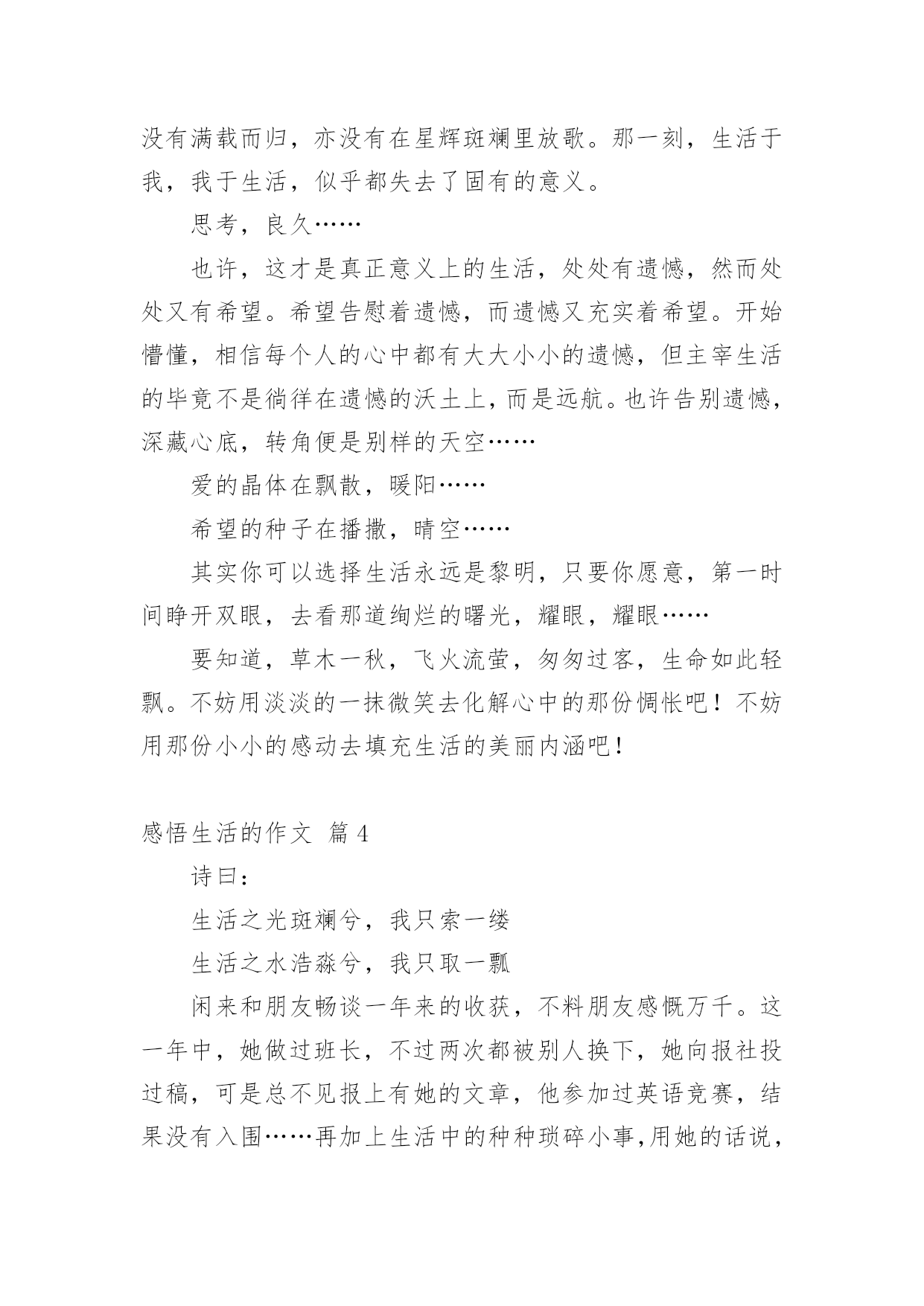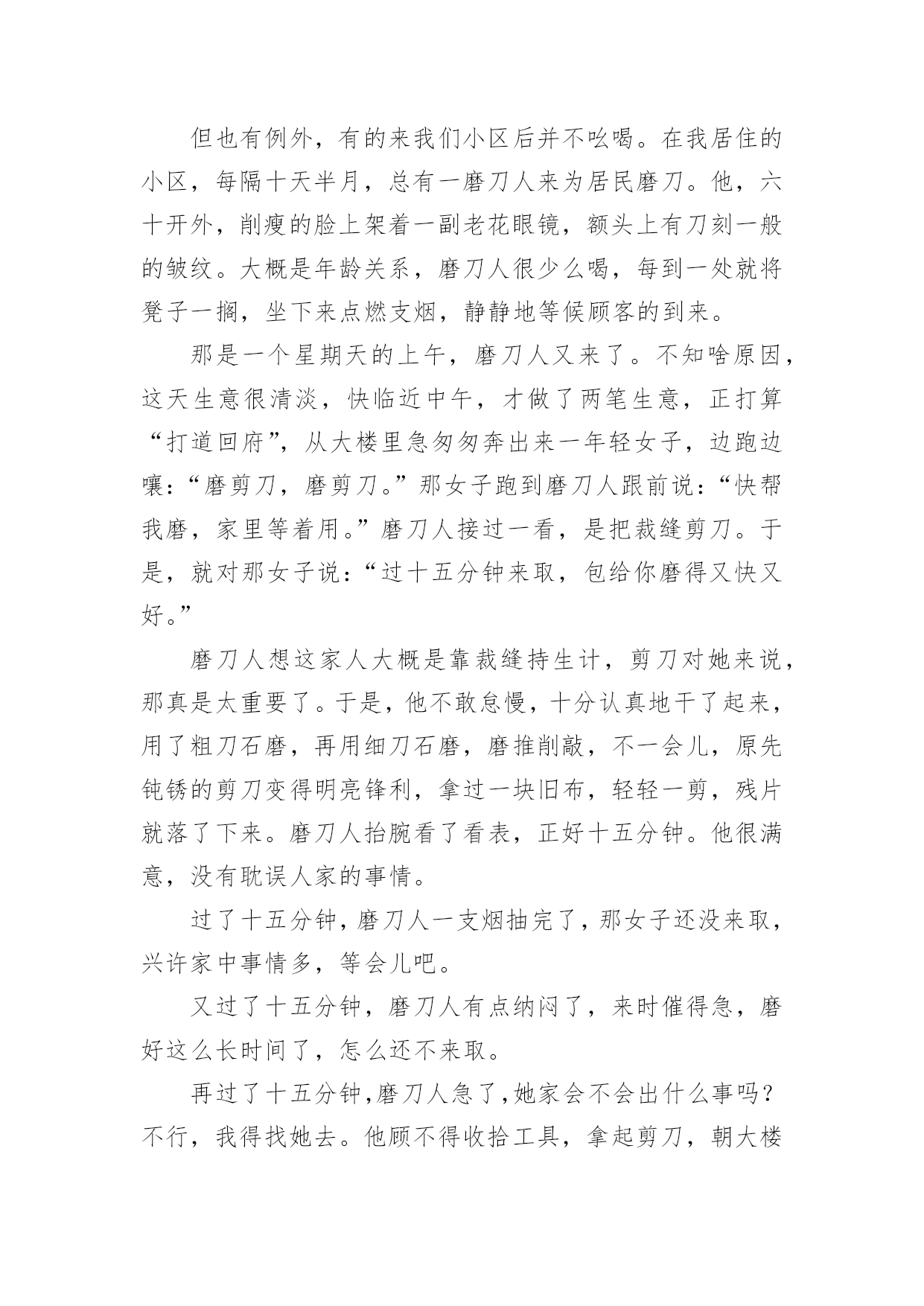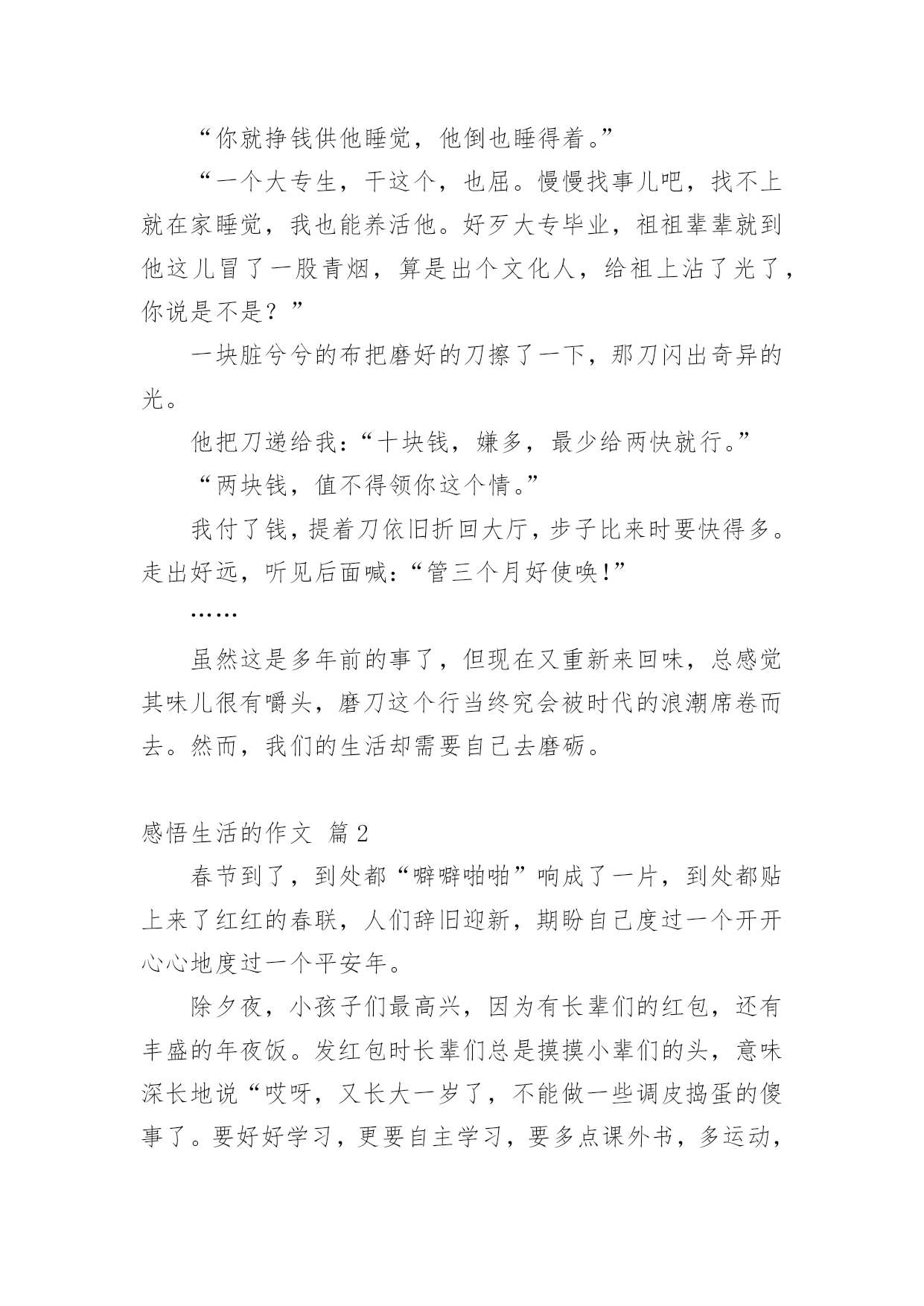感悟生活的作文【必备】感悟生活的作文四篇在学习、工作乃至生活中,大家都写过作文,肯定对各类作文都很熟悉吧,作文根据体裁的不同可以分为记叙文、说明文、应用文、议论文。那要怎么写好作文呢?以下是小编帮大家整理的感悟生活的作文4篇,欢迎阅读,希望大家能够喜欢。感悟生活的作文篇1“磨——剪——子——来——,戕——菜——刀——!”在我们居住的小区里吆喝声不绝于耳!不停的吆喝声穿透街道小巷,汇成一曲朴素的音乐,简短却抑扬的声调中传达出的是对生活的热爱抑或是无奈。这不过是前些年我举家刚迁移到宜昌这座城市时,所看到的一道别样的风景。一声声底气十足的吆喝,一把把锈钝的剪子和菜刀带着人间烟火的'气息等待他的打磨。卸下简单的工具连同心中的期待,他以固定姿势把自己定格在了一隅,布满裂纹的双手,握着锃亮的菜刀把柄,倾着身子,霍霍霍霍……几道小工序下来,最后以手试试刀锋,一把菜刀比先前更加好用。持刀人笑眯眯地继续着柴米油盐酱醋茶的生活。可是磨刀人的吆喝声却在社会的飞速发展中渐渐地转移了阵地、缩小了阵地。或许,到了最后就成了凝固的记忆,留在我们的回忆中,成了书中一帧发黄的相片滑落。但也有例外,有的来我们小区后并不吆喝。在我居住的小区,每隔十天半月,总有一磨刀人来为居民磨刀。他,六十开外,削瘦的脸上架着一副老花眼镜,额头上有刀刻一般的皱纹。大概是年龄关系,磨刀人很少么喝,每到一处就将凳子一搁,坐下来点燃支烟,静静地等候顾客的到来。那是一个星期天的上午,磨刀人又来了。不知啥原因,这天生意很清淡,快临近中午,才做了两笔生意,正打算“打道回府”,从大楼里急匆匆奔出来一年轻女子,边跑边嚷:“磨剪刀,磨剪刀。”那女子跑到磨刀人跟前说:“快帮我磨,家里等着用。”磨刀人接过一看,是把裁缝剪刀。于是,就对那女子说:“过十五分钟来取,包给你磨得又快又好。”磨刀人想这家人大概是靠裁缝持生计,剪刀对她来说,那真是太重要了。于是,他不敢怠慢,十分认真地干了起来,用了粗刀石磨,再用细刀石磨,磨推削敲,不一会儿,原先钝锈的剪刀变得明亮锋利,拿过一块旧布,轻轻一剪,残片就落了下来。磨刀人抬腕看了看表,正好十五分钟。他很满意,没有耽误人家的事情。过了十五分钟,磨刀人一支烟抽完了,那女子还没来取,兴许家中事情多,等会儿吧。又过了十五分钟,磨刀人有点纳闷了,来时催得急,磨好这么长时间了,怎么还不来取。再过了十五分钟,磨刀人急了,她家会不会出什么事吗?不行,我得找她去。他顾不得收拾工具,拿起剪刀,朝大楼走去。磨刀人不知那女子住那户,只能一层层爬着扶梯,挨家挨户敲门:“有谁磨剪刀了没有?”在一扇镶着虎头的豪华防盗门前,摁响门铃,好长时间才听到有人来开门。门一打开,正是那女子。磨刀人递过剪刀,那女子“啊哟”一声:“打麻将把这事给忘了。”说着,从口袋里掏出十元钱,磨刀人看了看,说:“太多了,2元就够子。”“多下来给你买包烟抽。”那女子说。“我只抽自己买的烟。”磨刀人说完从口袋里掏出一大把零钱,凑了8元给那女子,就下楼了。看着他的背影,我被他的认真负责的行为所折服。于是,我乘电梯上楼来到家里,把那把多年没用的菜刀操在手里,然后再乘电梯下楼奔出大厅,追赶上那位老人,对他说“请您帮我磨把菜刀。”“咋不好使?”“一个刀,还有多少不好使,不快了,磨磨。”“那可不一定。趁不趁手,压不压刀,利不利货,有讲究。刀快不利,切下的东西都沾在刀上也不行。”“磨刀还能磨出花样儿来。”“那当然,什么都有门道。”我歪着脑袋想了一会儿,给磨刀人递了一根烟,说:“这刀以前没磨过。”“二五眼用刀,不摸门道,能切就行。明白人就明白。”“我只要一个快。天天切土豆白菜,讲究顶啥用。”“那也得好家什。你这刀是张家庄老张家的。”“要不是呢?”“不是你砍了我。我管给你把刀磨快,砍起来利索。张家庄两家做刀的,东头老秦家,西头老张家。秦家刀压手,利货。张家的钢火好,不利货。”“你干多少年了?”“从记事儿就跟我爹跑,磨石用了半座山。”“家传手艺。”“哪不是吹,经我手的刀,天下没二。还有一绝,不伤人,伤不动,不信你问,凡我磨过的刀千百辈儿没伤过人。刀切到指头上,崩了刃,指头没事。”他把瓶子里的水往磨石上倒了一点,神秘地说:“秘密全在这里头。”我把那个水瓶子拿过来仔细看,这是个有容量刻度的塑料瓶子,瓶口用塑料绳儿做了一个提手,瓶盖儿当然也是塑料的。他拧开盖儿,往里看看,又闻闻,水无色,也无味。“这手艺,也该传传。”“没人学,嫌丢人。我儿子都这么想,别人也一样,到我这儿,绝了。”“你儿子干啥?”“高中毕业,上了个大专,也毕业了,找不着事儿,天天在家里睡觉。”“那还不跟着你出来,好歹能挣点钱。”“不出来,嫌累。”“你就挣钱供他睡觉,他倒也睡得着。”“一个大专生,干这个,也屈。慢慢找事儿吧,找不上就在家睡觉,我也能养活他。好歹大专毕业,祖祖辈辈就到他这儿冒了
