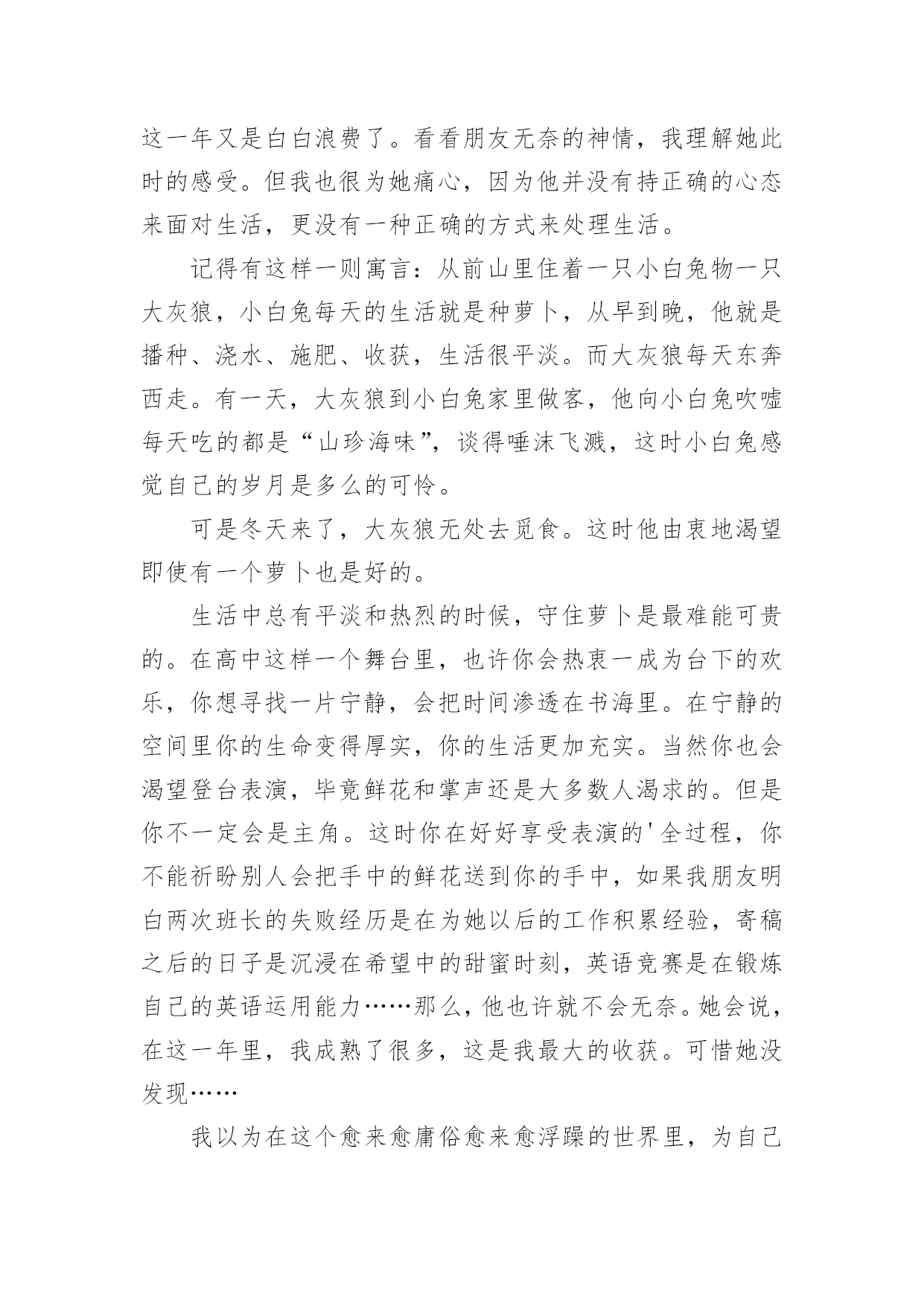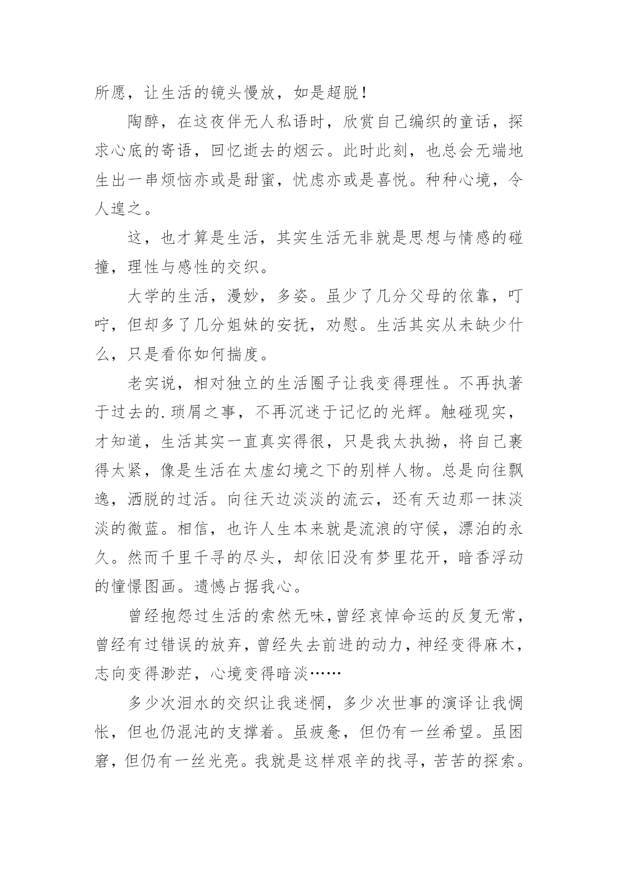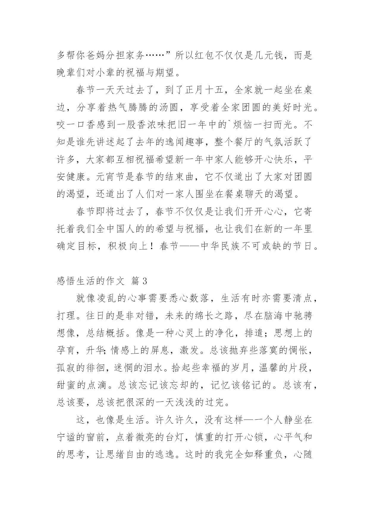 感悟生活的作文【必备】感悟生活的作文四篇在学习、工作乃至生活中,大家都写过作文,肯定对各类作文都很熟悉吧,作文根据体裁的不同可以分为记叙文、说明文、应用文、议论文。那要怎么写好作文呢?以下是小编帮大家整理的感悟生活的作文4篇,欢迎阅读,希望大家能够喜欢。感悟生活的作文篇1“磨——剪——子——来——,戕——菜——刀——!”在我们居住的小区里吆喝声不绝于耳!不停的吆喝声穿透街道小巷,汇成一曲朴素的音乐,简短却抑扬的声调中传达出的是对生活的热爱抑或是无奈。这不过是前些年我举家刚迁移到宜昌这座城市时,所看到的一道别样的风景。一声声底气十足的吆喝,一把把锈钝的剪子和菜刀带着人间烟火的'气息等待他的打磨。卸下简单的工具连同心中的期待,他以固定姿势把自己定格在了一隅,布满裂纹的双手,握着锃亮的菜刀把柄,倾着身子,霍霍霍霍……几道小工序下来,最后以手试试刀锋,一把菜刀比先前更加好用。持刀人笑眯眯地继续着柴米油盐酱醋茶的生活。可是磨刀人的吆喝声却在社会的飞速发展中渐渐地转移了阵地、缩小了阵地。或许,到了最后就成了凝固的记忆,留在我们的回忆中,成了书中一帧发黄的相片滑落。但也有例外,有的来我们小区后并不吆喝。在我居住的小区,每隔十天半月,总有一磨刀人来为居民磨刀。他,六十开外,削瘦的脸上架着一副老花眼镜,额头上有刀刻一般的皱纹。大概是年龄关系,磨刀人很少么喝,每到一处就将凳子一搁,坐下来点燃支烟,静静地等候顾客的到来。那是一个星期天的上午,磨刀人又来了。不知啥原因,这天生意很清淡,快临近中午,才做了两笔生意,正打算“打道回府”,从大楼里急匆匆奔出来一年轻女子,边跑边嚷:“磨剪刀,磨剪刀。”那女子跑到磨刀人跟前说:“快帮我磨,家里等着用。”磨刀人接过一看,是把裁缝剪刀。于是,就对那女子说:“过十五分钟来取,包给你磨得又快又好。”磨刀人想这家人大概是靠裁缝持生计,剪刀对她来说,那真是太重要了。于是,他不敢怠慢,十分认真地干了起来,用了粗刀石磨,再用细刀石磨,磨推削敲,不一会儿,原先钝锈的剪刀变得明亮锋利,拿过一块旧布,轻轻一剪,残片就落了下来。磨刀人抬腕看了看表,正好十五分钟。他很满意,没有耽误人家的事情。过了十五分钟,磨刀人一支烟抽完了,那女子还没来取,兴许家中事情多,等会儿吧。又过了十五分钟,磨刀人有点纳闷了,来时催得急,磨好这么长时间了,怎么还不来取。再过了十五分钟,磨刀人急了,她家会不会出什么事吗?不行,我得找她去。他顾不得收拾工具,拿起剪刀,朝大楼走去。磨刀人不知那女子住那户,只能一层层爬着扶梯,挨家挨户敲门:“有谁磨剪刀了没有?”在一扇镶着虎头的豪华防盗门前,摁响门铃,好长时间才听到有人来开门。门一打开,正是那女子。磨刀人递过剪刀,那女子“啊哟”一声:“打麻将把这事给忘了。”说着,从口袋里掏出十元钱,磨刀人看了看,说:“太多了,2元就够子。”“多下来给你买包烟抽。”那女子说。“我只抽自己买的烟。”磨刀人说完从口袋里掏出一大把零钱,凑了8元给那女子,就下楼了。看着他的背影,我被他的认真负责的行为所折服。于是,我乘电梯上楼来到家里,把那把多年没用的菜刀操在手里,然后再乘电梯下楼奔出大厅,追赶上那位老人,对他说“请您帮我磨把菜刀。”“咋不好使?”“一个刀,还有多少不好使,不快了,磨磨。”“那可不一定。趁不趁手,压不压刀,利不利货,有讲究。刀快不利,切下的东西都沾在刀上也不行。”“磨刀还能磨出花样儿来。”“那当然,什么都有门道。”我歪着脑袋想了一会儿,给磨刀人递了一根烟,说:“这刀以前没磨过。”“二五眼用刀,不摸门道,能切就行。明白人就明白。”“我只要一个快。天天切土豆白菜,讲究顶啥用。”“那也得好家什。你这刀是张家庄老张家的。”“要不是呢?”“不是你砍了我。我管给你把刀磨快,砍起来利索。张家庄两家做刀的,东头老秦家,西头老张家。秦家刀压手,利货。张家的钢火好,不利货。”“你干多少年了?”“从记事儿就跟我爹跑,磨石用了半座山。”“家传手艺。”“哪不是吹,经我手的刀,天下没二。还有一绝,不伤人,伤不动,不信你问,凡我磨过的刀千百辈儿没伤过人。刀切到指头上,崩了刃,指头没事。”他把瓶子里的水往磨石上倒了一点,神秘地说:“秘密全在这里头。”我把那个水瓶子拿过来仔细看,这是个有容量刻度的塑料瓶子,瓶口用塑料绳儿做了一个提手,瓶盖儿当然也是塑料的。他拧开盖儿,往里看看,又闻闻,水无色,也无味。“这手艺,也该传传。”“没人学,嫌丢人。我儿子都这么想,别人也一样,到我这儿,绝了。”“你儿子干啥?”“高中毕业,上了个大专,也毕业了,找不着事儿,天天在家里睡觉。”“那还不跟着你出来,好歹能挣点钱。”“不出来,嫌累。”“你就挣钱供他睡觉,他倒也睡得着。”“一个大专生,干这个,也屈。慢慢找事儿吧,找不上就在家睡觉,我也能养活他。好歹大专毕业,祖祖辈辈就到他这儿冒了