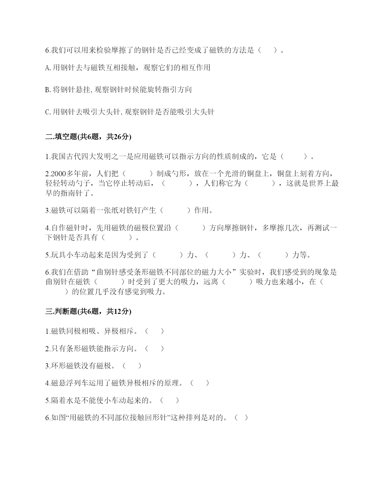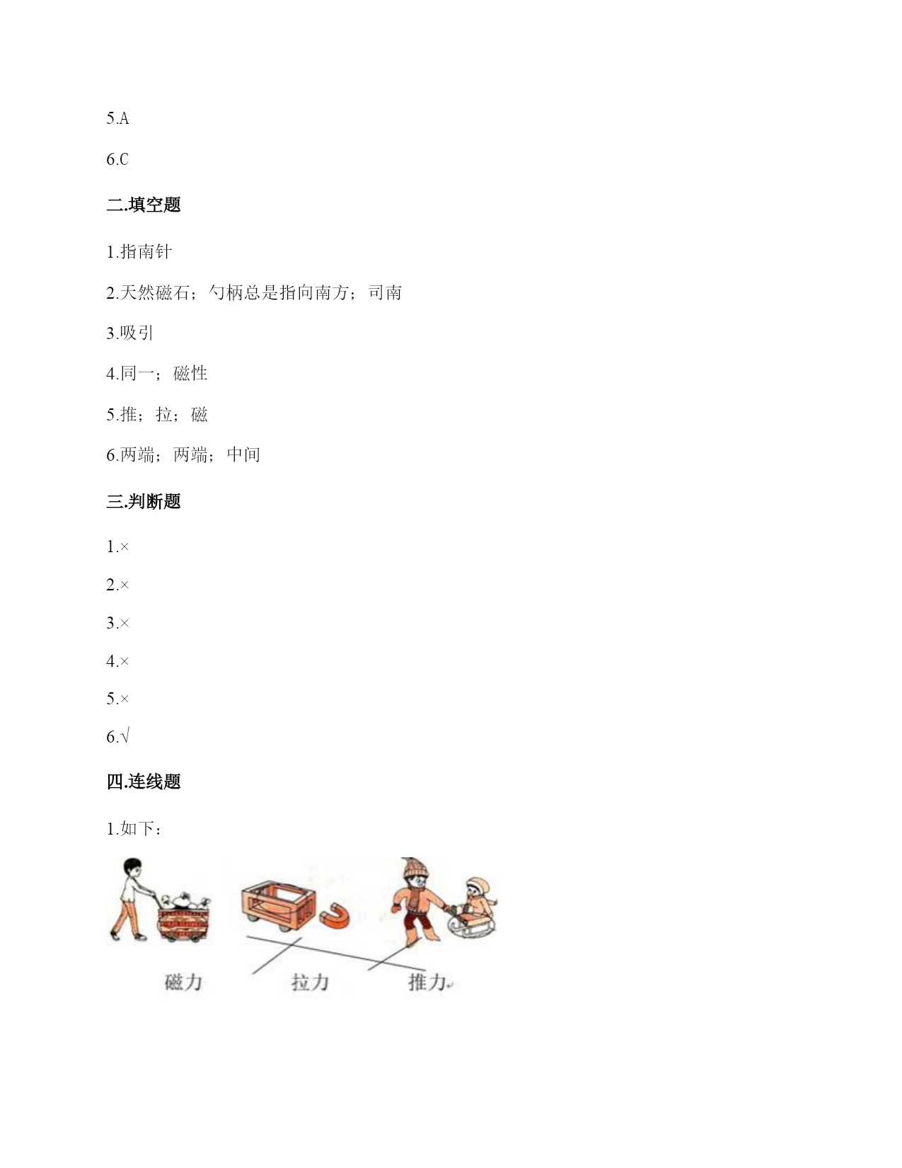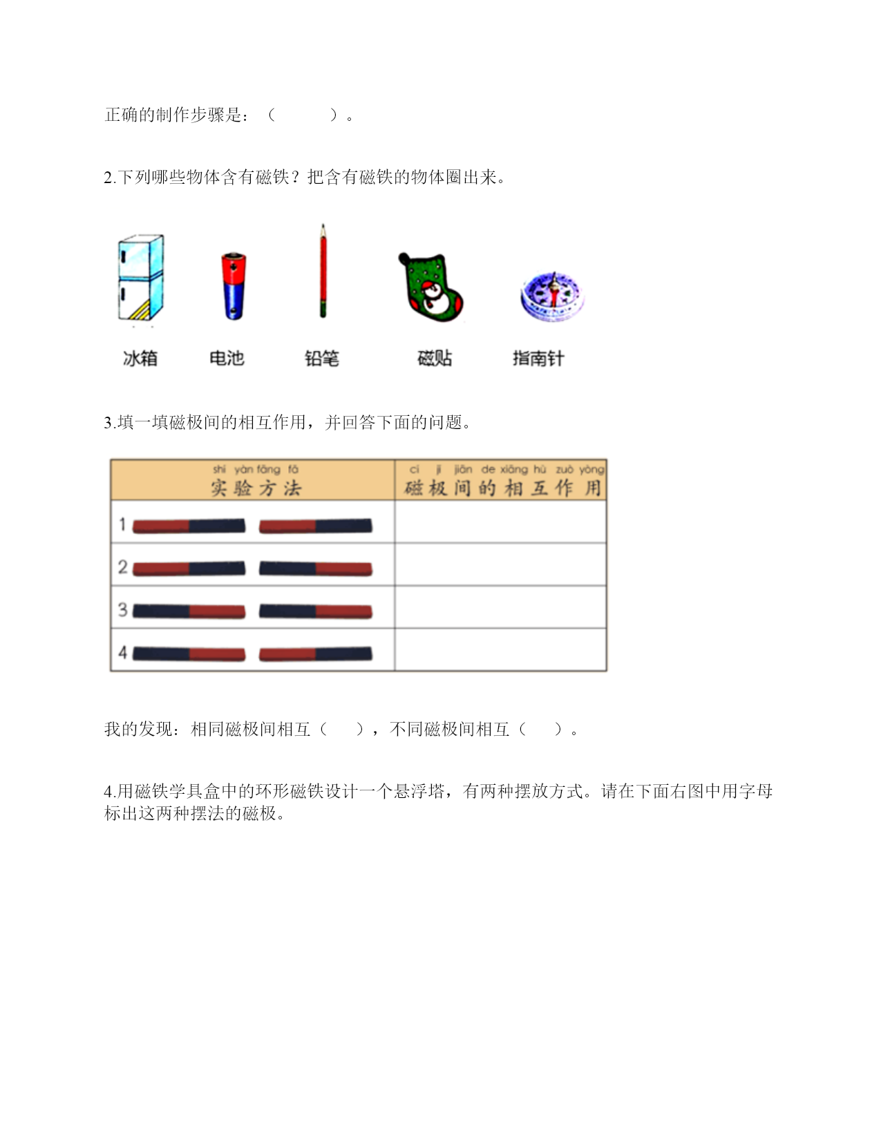 小学科学《磁铁》练习题一.选择题(共6题,共12分)1.如下图所示,用一块磁铁的磁极靠近小车上磁铁的磁极,小车会()。A.被吸引B.被推开C.不动2.如图所示,一个指南针的外壳材质不可能是()。A.铜B.铁C.塑料3.下列物品中,能被磁铁吸引的是()A.铁钉B.橡皮筋C.砖块4.下列物体中不能够被磁铁吸引的是()。A.铁钉B.白纸C.磁铁5.冰箱门里安装磁铁,起的作用是()。A.既可以吸住又方便开关B.牢牢吸住C.防止食物变质6.我们可以用来检验摩擦了的钢针是否已经变成了磁铁的方法是()。A.用钢针去与磁铁互相接触,观察它们的相互作用B.将钢针悬挂,观察钢针时候能旋转指引方向C.用钢针去吸引大头针,观察钢针是否能吸引大头针二.填空题(共6题,共26分)1.我国古代四大发明之一是应用磁铁可以指示方向的性质制成的,它是()。2.2000多年前,人们把()制成勺形,放在一个光滑的铜盘上,铜盘上刻着方向,轻轻转动勺子,当它停止转动后,(),人们称它为(),这就是世界上最早的指南针了。3.磁铁可以隔着一张纸对铁钉产生()作用。4.自作磁针时,先用磁铁的磁极位置沿()方向摩擦钢针,多摩擦几次,再测试一下钢针是否具有()。5.玩具小车动起来是因为受到了()力、()力、()力等。6.我们在借助“曲别针感受条形磁铁不同部位的磁力大小”实验时,我们感受到的现象是曲别针在磁铁()时受到了更大的吸力,远离()吸力也来越小,在()的位置几乎没有感觉到吸力。三.判断题(共6题,共12分)1.磁铁同极相吸、异极相斥。()2.只有条形磁铁能指示方向。()3.环形磁铁没有磁极。()4.磁悬浮列车运用了磁铁异极相斥的原理。()5.隔着水是不能使小车动起来的。()6.如图“用磁铁的不同部位接触回形针”这种排列是对的。()四.连线题(共1题,共3分)1.下列圈起来的物体分别受到了什么力?连一连。磁力拉力推力五.简答题(共5题,共25分)1.如何尽快地拾起木屑中的回形针(如下图)?2.奶奶缝衣服时,不小心把针掉到地上了,你打算用什么办法帮奶奶找针?3.磁悬浮列车运用的是高科技手段,跟磁铁没什么关系。4.在制作水浮式指南针时,为什么要用磁铁摩擦钢针?5.用什么方法可以找到磁铁的磁极?六.综合题(共5题,共30分)1.按照制作指南针的方法,给下列步骤排序。正确的制作步骤是:()。2.下列哪些物体含有磁铁?把含有磁铁的物体圈出来。3.填一填磁极间的相互作用,并回答下面的问题。我的发现:相同磁极间相互(),不同磁极间相互()。4.用磁铁学具盒中的环形磁铁设计一个悬浮塔,有两种摆放方式。请在下面右图中用字母标出这两种摆法的磁极。5.指南针是我国的四大发明之一,它是利用磁铁能够指示南北方向的特点而制成的。请根据图中指南针所指示的方向,标出四个场所所在的方向。游泳馆()学校()邮局()书店()参考答案一.选择题1.B2.B3.A4.B5.A6.C二.填空题1.指南针2.天然磁石;勺柄总是指向南方;司南3.吸引4.同一;磁性5.推;拉;磁6.两端;两端;中间三.判断题1.×2.×3.×4.×5.×6.√四.连线题1.如下:五.简答题1.利用磁铁的磁性很快地能拾起木屑里的回形针。2.可以利用磁铁找针。3.错,磁悬浮列车运用了磁极之间可以相互作用的原理。4.为了让本来没有磁性的钢针变得有磁性。5.用磁铁去吸引铁粉,哪个位置吸引的多,那个位置就是磁极。六.综合题1.⑤④①②⑥③2.如下:3.吸引,排斥,吸引,排斥;吸引;排斥4.如下:5.东;南;北;西