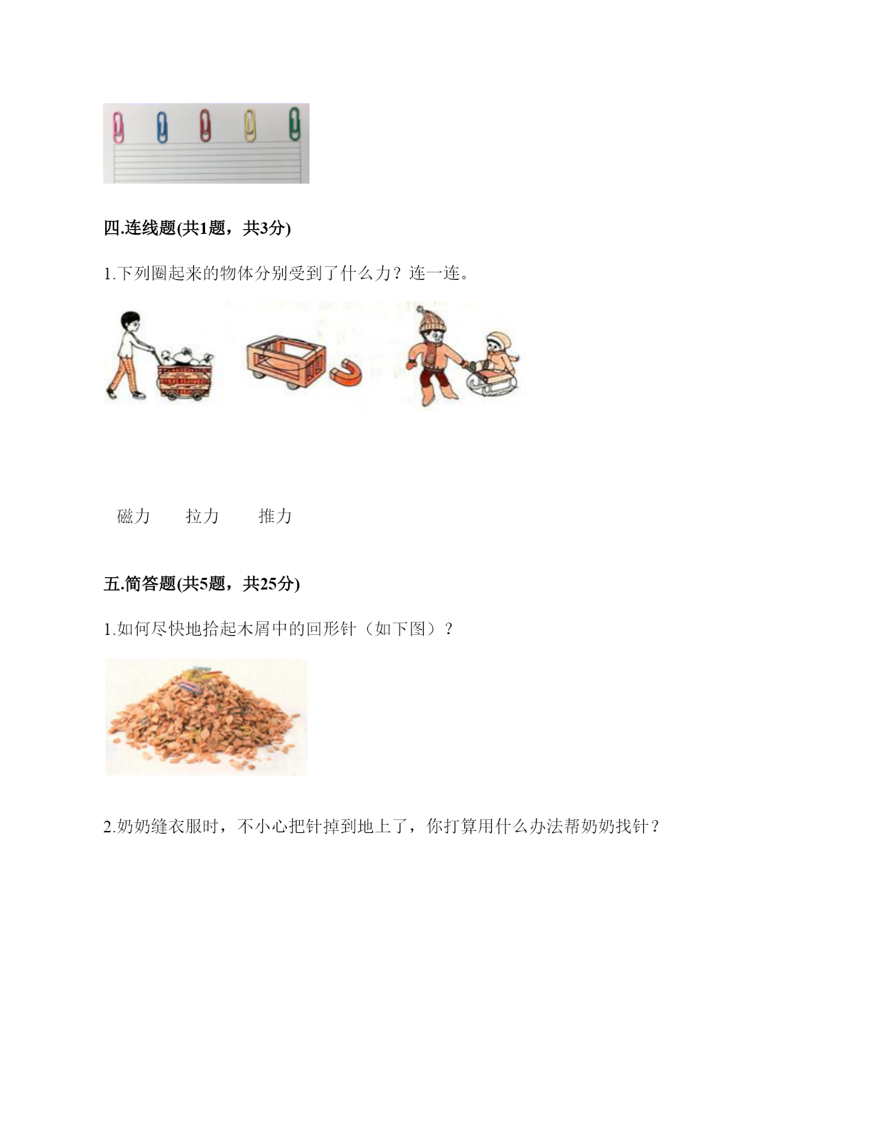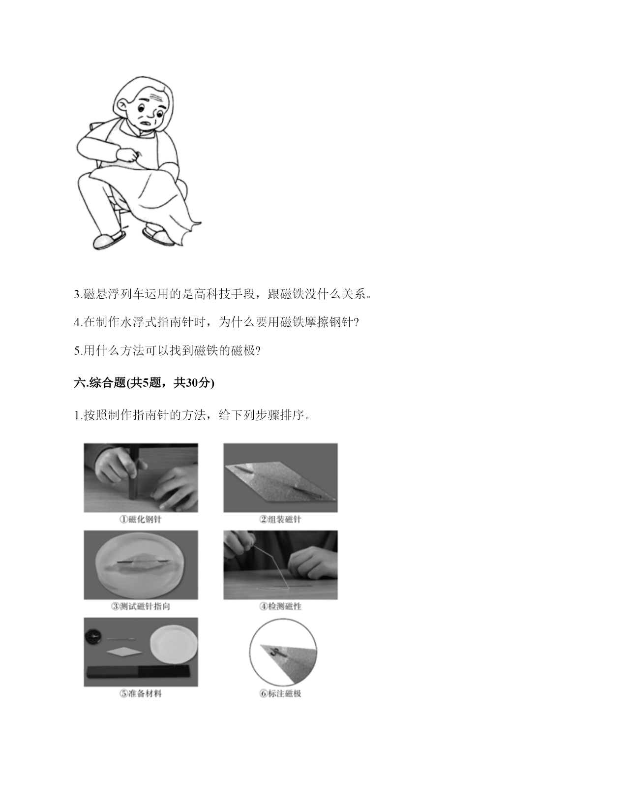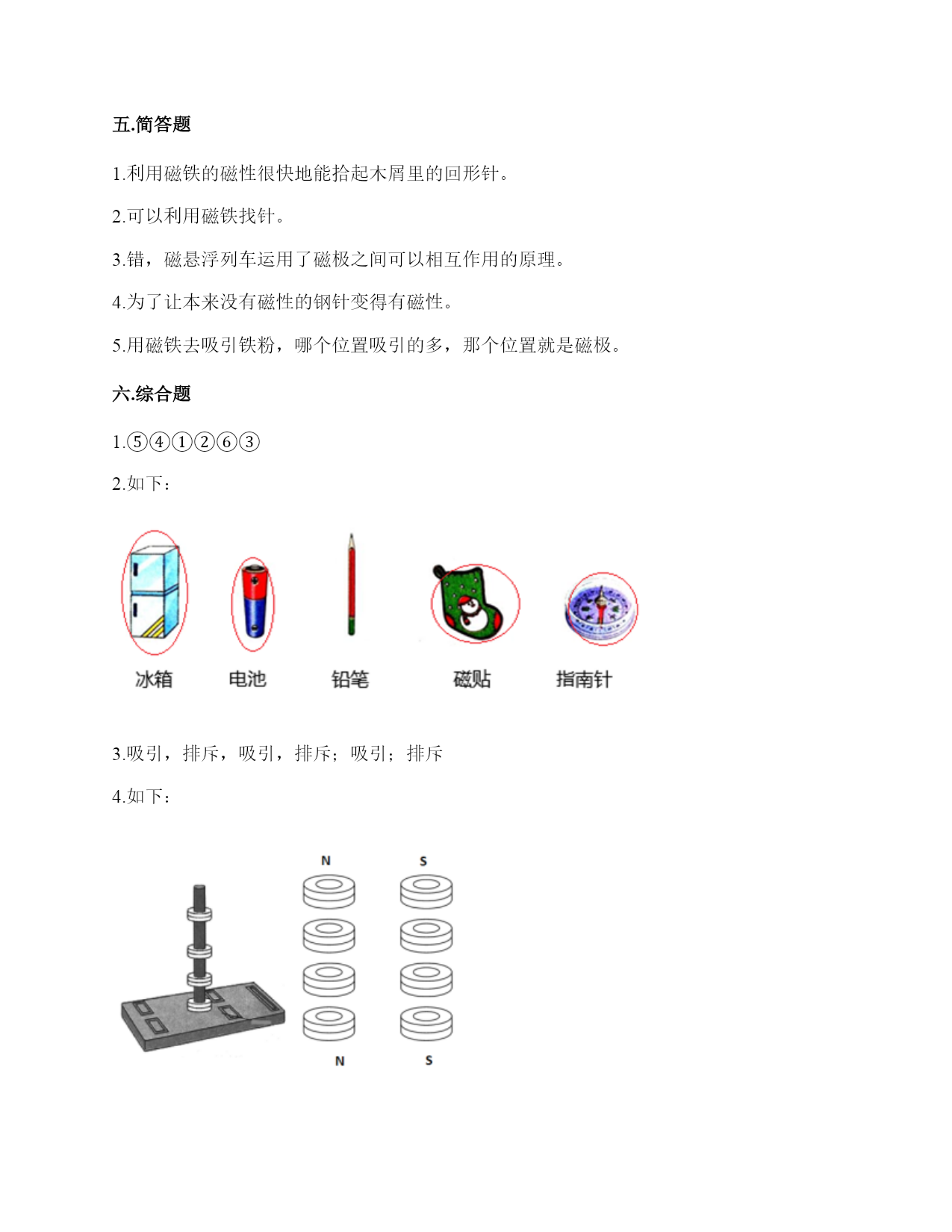 小学科学《磁铁》练习题一.选择题(共6题,共12分)1.如下图所示,用一块磁铁的磁极靠近小车上磁铁的磁极,小车会()。A.被吸引B.被推开C.不动2.如图所示,一个指南针的外壳材质不可能是()。A.铜B.铁C.塑料3.下列物品中,能被磁铁吸引的是()A.铁钉B.橡皮筋C.砖块4.下列物体中不能够被磁铁吸引的是()。A.铁钉B.白纸C.磁铁5.冰箱门里安装磁铁,起的作用是()。A.既可以吸住又方便开关B.牢牢吸住C.防止食物变质6.我们可以用来检验摩擦了的钢针是否已经变成了磁铁的方法是()。A.用钢针去与磁铁互相接触,观察它们的相互作用B.将钢针悬挂,观察钢针时候能旋转指引方向C.用钢针去吸引大头针,观察钢针是否能吸引大头针二.填空题(共6题,共26分)1.我国古代四大发明之一是应用磁铁可以指示方向的性质制成的,它是()。2.2000多年前,人们把()制成勺形,放在一个光滑的铜盘上,铜盘上刻着方向,轻轻转动勺子,当它停止转动后,(),人们称它为(),这就是世界上最早的指南针了。3.磁铁可以隔着一张纸对铁钉产生()作用。4.自作磁针时,先用磁铁的磁极位置沿()方向摩擦钢针,多摩擦几次,再测试一下钢针是否具有()。5.玩具小车动起来是因为受到了()力、()力、()力等。6.我们在借助“曲别针感受条形磁铁不同部位的磁力大小”实验时,我们感受到的现象是曲别针在磁铁()时受到了更大的吸力,远离()吸力也来越小,在()的位置几乎没有感觉到吸力。三.判断题(共6题,共12分)1.磁铁同极相吸、异极相斥。()2.只有条形磁铁能指示方向。()3.环形磁铁没有磁极。()4.磁悬浮列车运用了磁铁异极相斥的原理。()5.隔着水是不能使小车动起来的。()6.如图“用磁铁的不同部位接触回形针”这种排列是对的。()四.连线题(共1题,共3分)1.下列圈起来的物体分别受到了什么力?连一连。磁力拉力推力五.简答题(共5题,共25分)1.如何尽快地拾起木屑中的回形针(如下图)?2.奶奶缝衣服时,不小心把针掉到地上了,你打算用什么办法帮奶奶找针?3.磁悬浮列车运用的是高科技手段,跟磁铁没什么关系。4.在制作水浮式指南针时,为什么要用磁铁摩擦钢针?5.用什么方法可以找到磁铁的磁极?六.综合题(共5题,共30分)1.按照制作指南针的方法,给下列步骤排序。正确的制作步骤是:()。2.下列哪些物体含有磁铁?把含有磁铁的物体圈出来。3.填一填磁极间的相互作用,并回答下面的问题。我的发现:相同磁极间相互(),不同磁极间相互()。4.用磁铁学具盒中的环形磁铁设计一个悬浮塔,有两种摆放方式。请在下面右图中用字母标出这两种摆法的磁极。5.指南针是我国的四大发明之一,它是利用磁铁能够指示南北方向的特点而制成的。请根据图中指南针所指示的方向,标出四个场所所在的方向。游泳馆()学校()邮局()书店()参考答案一.选择题1.B2.B3.A4.B5.A6.C二.填空题1.指南针2.天然磁石;勺柄总是指向南方;司南3.吸引4.同一;磁性5.推;拉;磁6.两端;两端;中间三.判断题1.×2.×3.×4.×5.×6.√四.连线题1.如下:五.简答题1.利用磁铁的磁性很快地能拾起木屑里的回形针。2.可以利用磁铁找针。3.错,磁悬浮列车运用了磁极之间可以相互作用的原理。4.为了让本来没有磁性的钢针变得有磁性。5.用磁铁去吸引铁粉,哪个位置吸引的多,那个位置就是磁极。六.综合题1.⑤④①②⑥③2.如下:3.吸引,排斥,吸引,排斥;吸引;排斥4.如下:5.东;南;北;西