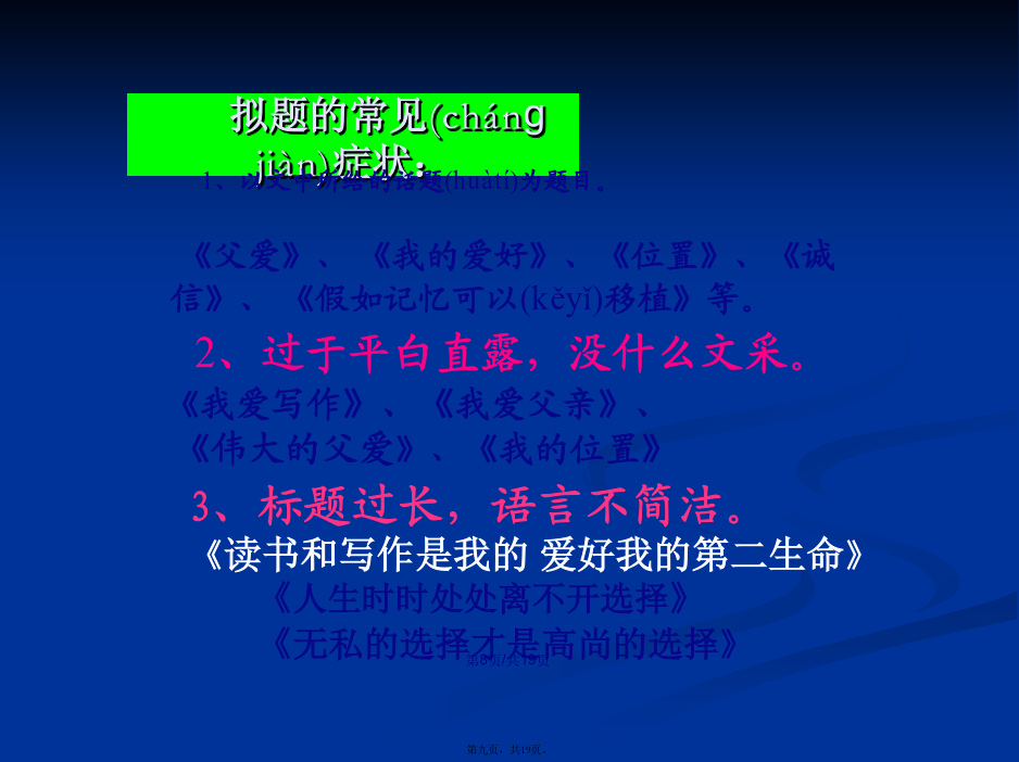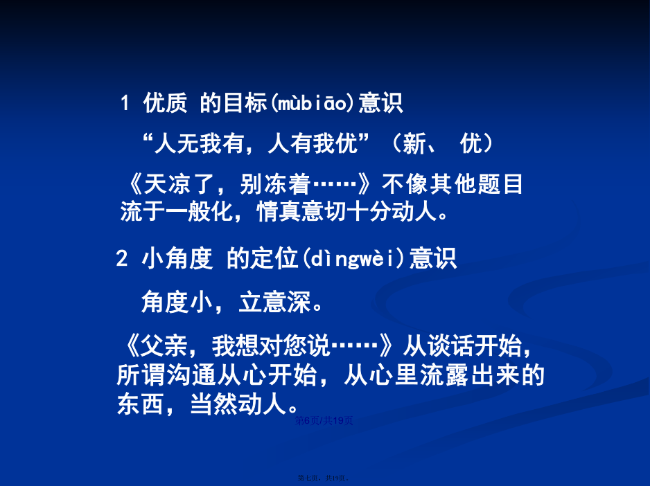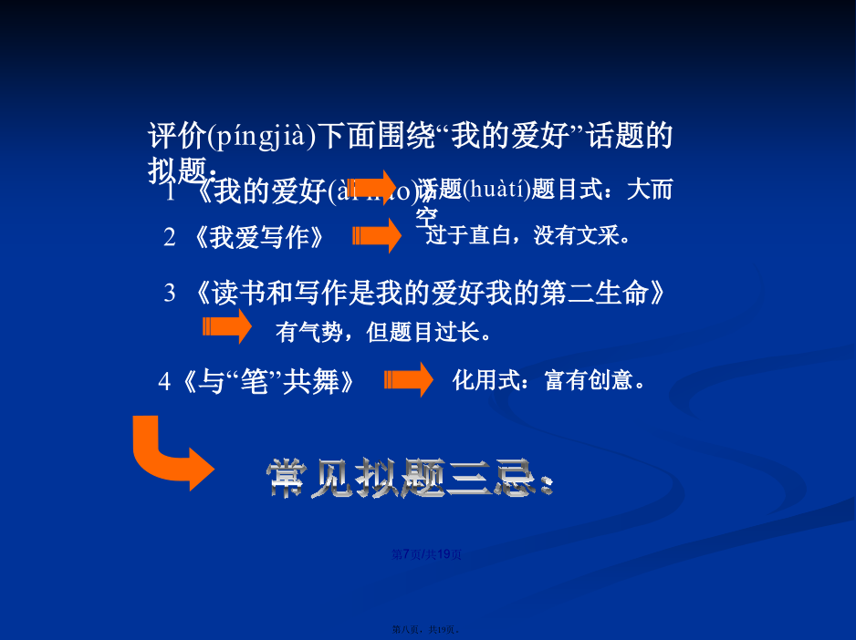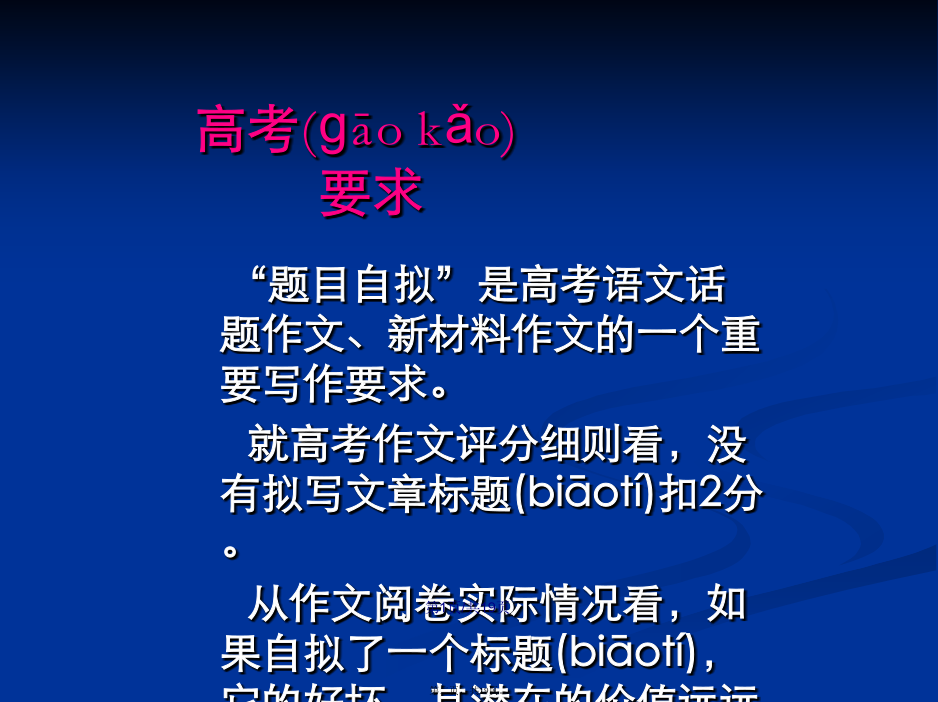 会计学高考(ɡāokǎo)要求文题价值(jiàzhí)评判标题优劣(yōuliè)的标准题文相符(xiāngfú)文字简练提示中心新颖别致就下面以“父爱”为话题而拟的几个题目,比较(bǐjiào)其优劣:1优质的目标(mùbiāo)意识“人无我有,人有我优”(新、优)《天凉了,别冻着……》不像其他题目流于一般化,情真意切十分动人。评价(píngjià)下面围绕“我的爱好”话题的拟题:拟题的常见(chánɡjiàn)症状:妙修辞(xiūcí),匠心独运以“心”为话题(huàtí):以“答案是丰富多彩(fēngfùduōcǎi)的”为话题:以“诚信(chénɡxìn)”为话题:以“诚信(chénɡxìn)”为话题:以“世界(shìjiè)”为话题:以“自由(zìyóu)”为话题:社会的喧嚣,应试的压力,功利的追求,心态的浮躁,现今的中学生很难进入到大师们所营造的氛围,取而代之的是快餐式或短平快式的浏览。很难想像,这样的浏览能品出屈原的孤独、陶渊明的淡泊、李白的豪放、杜甫的沉郁、苏轼的旷达、辛弃疾的悲壮(bēizhuàng)、曹雪芹的伤感。虽说现代社会信息高速化,资源多样化,人们要了解外面的世界,并不局限于阅读,但毫无疑问,在这精神家园逐渐沙漠化的时代,我们的中学生更需要荡涤灵魂污垢的黄钟大吕,用来为我们的终身发展铺上绚丽的底子。请以“阅读”(读书)为话题,拟一则标题,要求运用一定的修辞手法(或化用法),避免一般化,拟出新意来。《万紫千红(wànzǐqiānhóng)总是》《寒门(hánmén)书香》