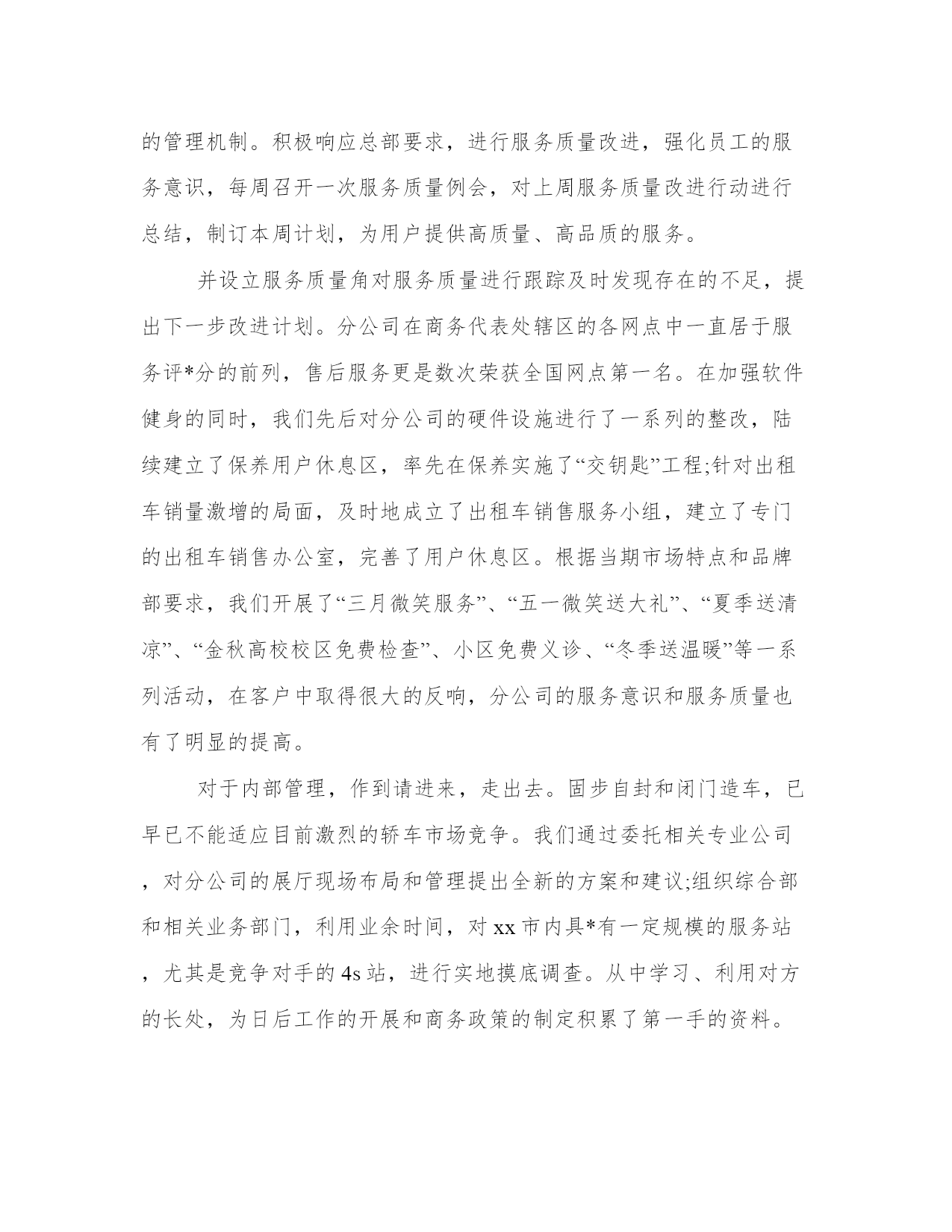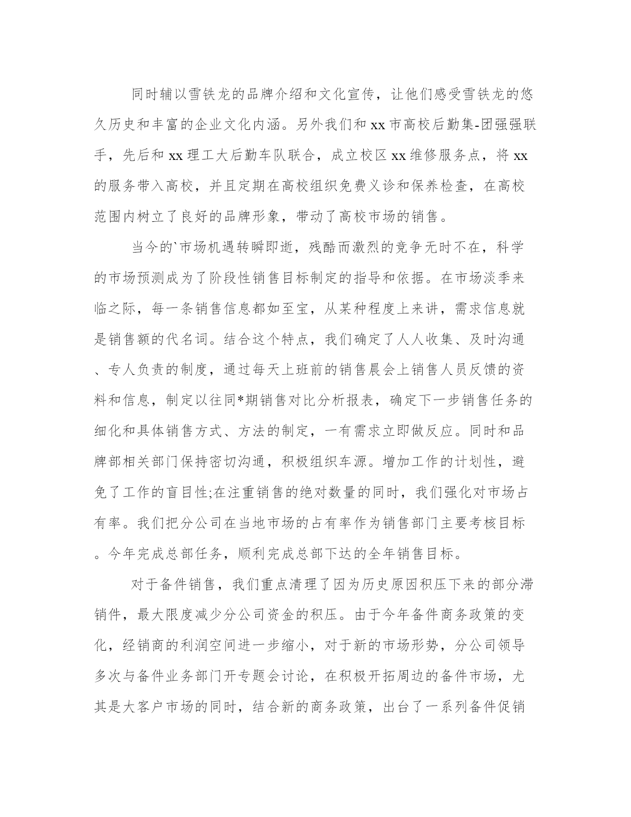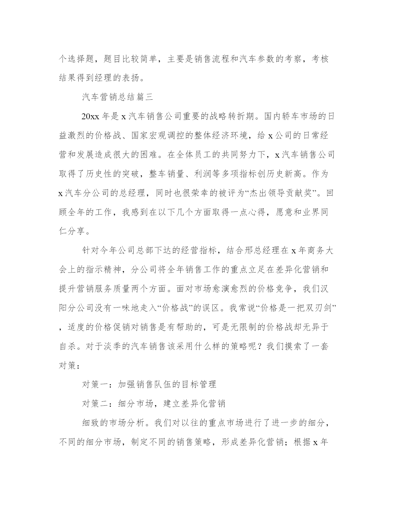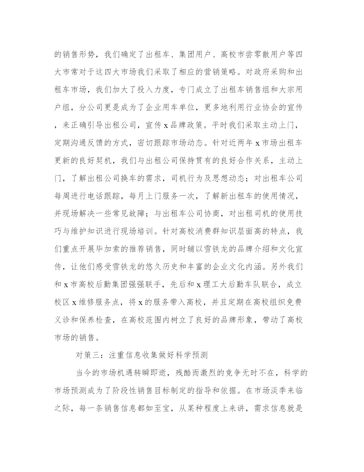 最新汽车营销总结(优秀12篇)总结是把一定阶段内的有关情况分析分析,做出有指导性的经验方法以及结论的书面材料,它可以使我们更有效率,不妨坐下来好好写写总结吧。那么我们该如何写一篇较为完美的总结呢?以下是小编收集整理的工作总结书范文,仅供参考,希望能够帮助到大家。汽车营销总结篇一今年是xxxx海马汽车销售公司重要的战略转折期。国内轿车市场的日益激烈的价格战、国家宏观调控的整体经济环境,给xx公司的日常经营和发展造成很大的困难。在全体员工的共同努力下,xxxx海马汽车销售公司取得了历史性的突破,整车销量、利润等多项指标创历史新高。作为海马汽车分公司的总经理,同时也很荣幸的被评为“杰出领导贡献奖”。回顾全年的工作,我感到在以下几个方面取得一点心得,愿意和业界同仁分享。针对今年公司总部下达的经营指标,结合邢总经理在20xx年商务大会上的指示精神,分公司将全年销售工作的重点立足在差异化营销和提升营销服务质量两个方面。面对市场愈演愈烈的价格竞争,我们汉阳分公司没有一味地*走入“价格战”的误区。我常说“价格是一把双刃剑”,适度的价格促销对销售是有帮助的,可是无限制的价格战却无异于自杀。对于淡季的汽车销售该采用什么样的策略呢?我们摸索了一套对策:同时辅以雪铁龙的品牌介绍和文化宣传,让他们感受雪铁龙的悠久历史和丰富的企业文化内涵。另外我们和xx市高校后勤集-团强强联手,先后和xx理工大后勤车队联合,成立校区xx维修服务点,将xx的服务带入高校,并且定期在高校组织免费义诊和保养检查,在高校范围内树立了良好的品牌形象,带动了高校市场的销售。当今的`市场机遇转瞬即逝,残酷而激烈的竞争无时不在,科学的市场预测成为了阶段性销售目标制定的指导和依据。在市场淡季来临之际,每一条销售信息都如至宝,从某种程度上来讲,需求信息就是销售额的代名词。结合这个特点,我们确定了人人收集、及时沟通、专人负责的制度,通过每天上班前的销售晨会上销售人员反馈的资料和信息,制定以往同*期销售对比分析报表,确定下一步销售任务的细化和具体销售方式、方法的制定,一有需求立即做反应。同时和品牌部相关部门保持密切沟通,积极组织车源。增加工作的计划性,避免了工作的盲目性;在注重销售的绝对数量的同时,我们强化对市场占有率。我们把分公司在当地市场的占有率作为销售部门主要考核目标。今年完成总部任务,顺利完成总部下达的全年销售目标。对于备件销售,我们重点清理了因为历史原因积压下来的部分滞销件,最大限度减少分公司资金的积压。由于今年备件商务政策的变化,经销商的利润空间进一步缩小,对于新的市场形势,分公司领导多次与备件业务部门开专题会讨论,在积极开拓周边的备件市场,尤其是大客户市场的同时,结合新的商务政策,出台了一系列备件促销活动,取得了较好的效果。备件销售营业额xx万元,在门市销售受到市场低价倾销冲击影响较大的情况下,利用售后服务带动车间备件销售,不仅扭转了不利局面,也带动了车间的工时销售。售后服务是窗口,是我们整车销售的后盾和保障,今年分公司又迎来了自2000年成立以来的售后维修高峰。为此,我们对售后服务部门,提出了更高的要求,在售后全员中,展开了广泛的服务意识宣传活动,以及各班组之间的自查互查工作;建立了每周五由各部门经理参加的的车间现场巡检制度,对于售后维修现场发现的问题,现场提出整改意见和时间进度表;用户进站专人接待,接车、试车、交车等重要环节强调语言行为规范。20xx年是汽车市场竞争白热化的一年,面对严峻的形势,在年初我们确定了全年为“服务管理年”,提出“以服务带动销售靠管理创造效益”的经营方针。我们挑选了从事多年服务工作的员工成立了客户服务部,建立了分公司自身的客户回访制度和用户投诉受理制度。每周各业务部门召开服务例会,每季度结合商务代表处的服务要求和服务评分的反馈,召开部门经理级的服务例会,在管理层强化服务意识,将服务工作视为重中之重。同时在内部管理上建立和完善了一线业务部门服务于客户,管理部门服务一线的管理服务体系;在业务部门中重点强调树立服务于客户,客户就是上帝的原则;在管理部门中,重点强调服务销售售后一线的意识。形成二线为一线服务,一线为客户服务这样层层服务的管理机制。积极响应总部要求,进行服务质量改进,强化员工的服务意识,每周召开一次服务质量例会,对上周服务质量改进行动进行总结,制订本周计划,为用户提供高质量、高品质的服务。并设立服务质量角对服务质量进行跟踪及时发现存在的不足,提出下一步改进计划。分公司在商务代表处辖区的各网点中一直居于服务评*分的前列,售后服务更是数次荣获全国网点第一名。在加强软件健身的同时,我们先后对分公司的硬件设施进行了一系列的整改,陆续建立了保养用户休息区,率先在保养实施了“交钥匙”工程;针对出租车销量激增的局面,及时地成立了出租车销