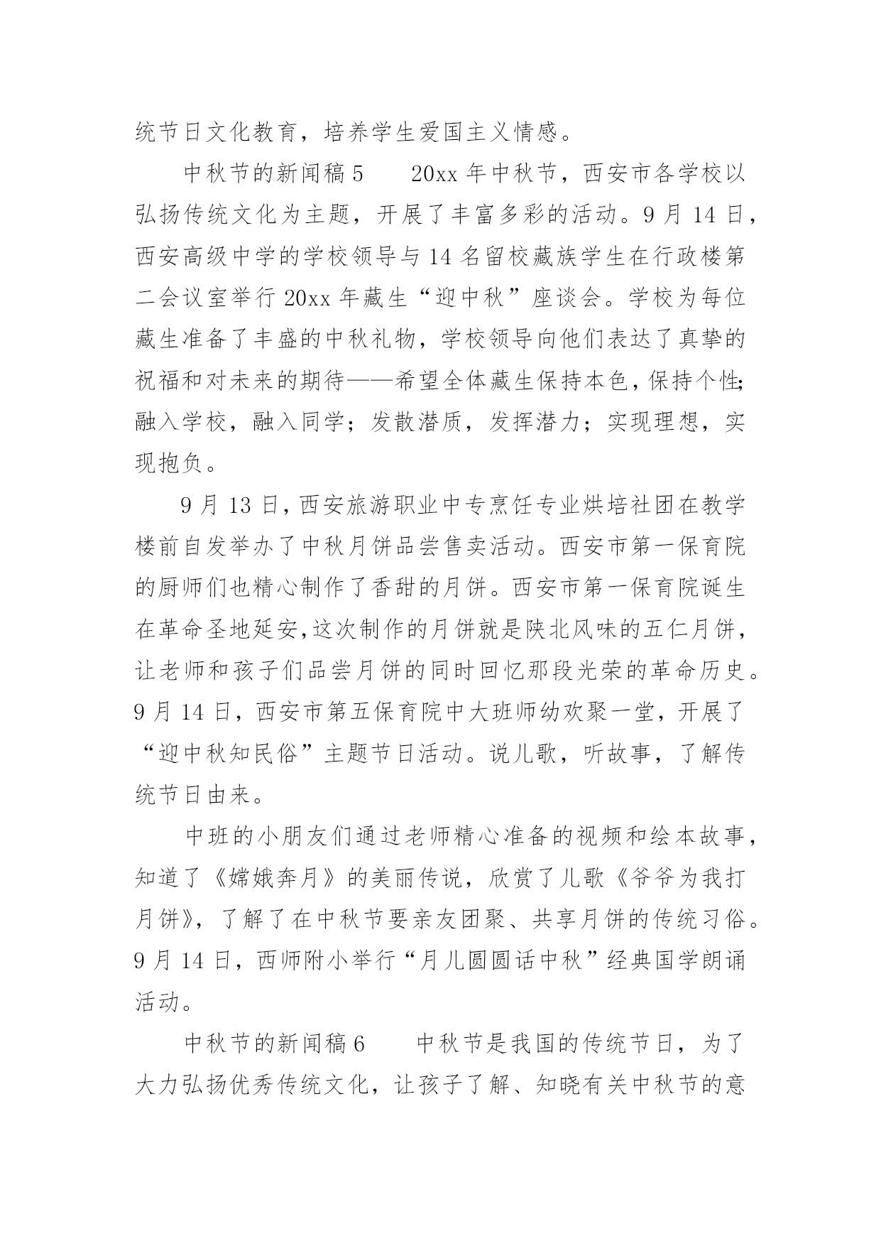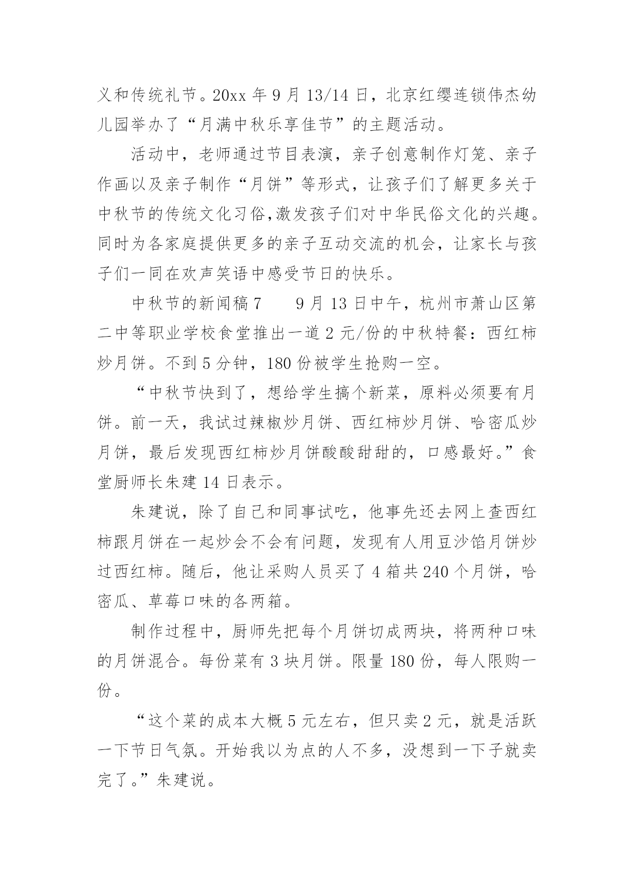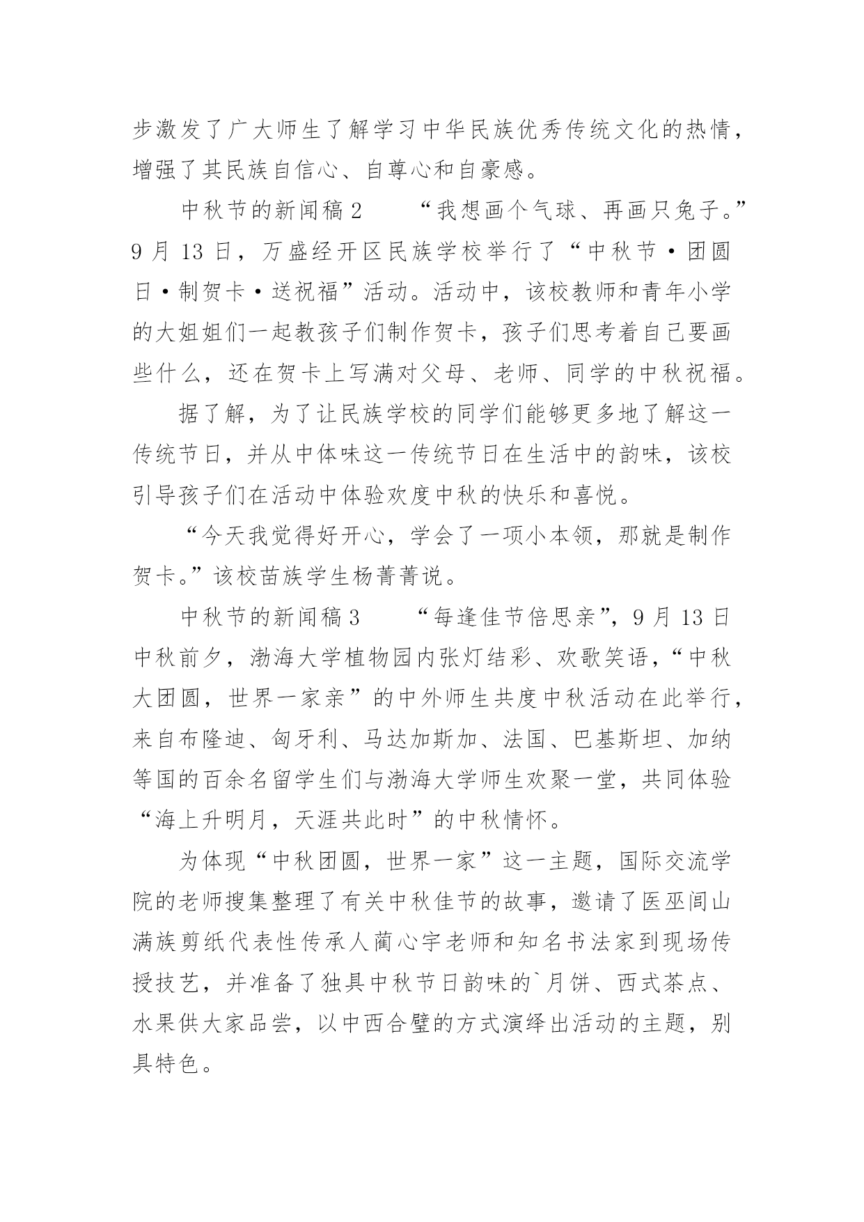 中秋节的新闻稿中秋节的新闻稿(精选8篇)在一步步向前发展的社会中,新闻稿与我们的生活息息相关,是企业永久、公开的记录的一部分,是品牌内容的重要资产。那么你有了解过新闻稿吗?下面是小编为大家整理的中秋节的新闻稿(精选8篇),欢迎阅读,希望大家能够喜欢。中秋节的新闻稿1为使广大师生更多地了解中华民族传统节日的文化内涵,广泛挖掘与诠释中华传统节日的精髓,使学生在活动中感受到中华民族的优良传统。大正小学于9月14日开展了以“我们的节日中秋”为主题的丰富多彩的活动。活动中,学校结合自身实际情况,利用校园广播站、宣传栏、主题班会、手抄报等形式,精心设计内容,广泛宣传传统节日,营造出了浓厚的民族节日氛围,以此弘扬民族精神和传统文化。各年级开展了“我们的节日中秋”主题班会。低年级的“中秋故事会”,“习俗知多少”,中年级的“经典诗文诵读”,高年级的“诗词鉴赏”,各具特色。与此同时,各班还开展了“我们的节日中秋”手抄报评比活动。活动中学生们精心设计,用自己独到的见解画出了自己心目中的中秋节。通过弘扬优秀传统文化,开展“我们的节日--中秋”为主题的活动,丰富了中华民族传统节日的内涵,同时也进一步激发了广大师生了解学习中华民族优秀传统文化的热情,增强了其民族自信心、自尊心和自豪感。中秋节的新闻稿2“我想画个气球、再画只兔子。”9月13日,万盛经开区民族学校举行了“中秋节·团圆日·制贺卡·送祝福”活动。活动中,该校教师和青年小学的大姐姐们一起教孩子们制作贺卡,孩子们思考着自己要画些什么,还在贺卡上写满对父母、老师、同学的中秋祝福。据了解,为了让民族学校的同学们能够更多地了解这一传统节日,并从中体味这一传统节日在生活中的韵味,该校引导孩子们在活动中体验欢度中秋的快乐和喜悦。“今天我觉得好开心,学会了一项小本领,那就是制作贺卡。”该校苗族学生杨菁菁说。中秋节的新闻稿3“每逢佳节倍思亲”,9月13日中秋前夕,渤海大学植物园内张灯结彩、欢歌笑语,“中秋大团圆,世界一家亲”的中外师生共度中秋活动在此举行,来自布隆迪、匈牙利、马达加斯加、法国、巴基斯坦、加纳等国的百余名留学生们与渤海大学师生欢聚一堂,共同体验“海上升明月,天涯共此时”的中秋情怀。为体现“中秋团圆,世界一家”这一主题,国际交流学院的老师搜集整理了有关中秋佳节的故事,邀请了医巫闾山满族剪纸代表性传承人蔺心宇老师和知名书法家到现场传授技艺,并准备了独具中秋节日韵味的`月饼、西式茶点、水果供大家品尝,以中西合璧的方式演绎出活动的主题,别具特色。当天活动气氛热烈,外国留学生被中秋文化深深地吸引,讲述起各自家乡的风俗,孔子学院的奖学金获得者表演了富有非洲风情的民族舞蹈和中国功夫,布隆迪留学生带来了好听的传统说唱,韩国留学生表演了热情洋溢的劲歌热舞,有几位留学生“现学现卖”,和中国学生一起伴着古筝曲,唱起了刚学会的《水调歌头明月几时有》。此次活动不仅传播了中国传统文化,展示了中国大学生的热情好客,让留学生感受了中秋节的热闹气氛和文化,也拉近了中外大学生的距离,增进了彼此的友谊。中秋节的新闻稿4中秋节来临之际,为让同学们了解中国传统节日习俗,度过一个快乐而又有意义的中秋节,汉阴县各中小学校开展了丰富多彩的中秋节庆祝活动。汉阴县漩涡初级中学在午餐时间为每位学生送上了中秋礼物——月饼、苹果,使所有学生在大团圆的校园里感受到了温暖与幸福。同时,各班均召开了“弘扬中国传统文化、情暖留守学生”的主题班会,让学生了解中国传统文化,教导学生在中秋节日里为亲人送上问候与祝福。汉阴县城关镇中心幼儿园开展了讲故事、画月亮、做月饼、唱儿歌、分享月饼等系列中秋主题教育活动。午点时幼儿园为每位幼儿准备了各种口味的月饼供幼儿分享品尝,中班孩子认真学唱”爷爷教我打月饼”传统老歌,大班幼儿动手画月饼,孩子们还在老师在老师的指导下,用各种五彩的胶泥制作月制作出了一个个造型优美的月饼。活动中,孩子们不仅体验到了制作月饼的快乐,而且充分的锻炼了幼儿小手的灵活性。汉阴县汉阳镇中心小学开展了系列中秋节传统文化主题教育活动。学校利用国旗下讲话、校园广播、宣传栏等宣传阵地进行广泛宣传,营造浓厚的节日氛围。各班开展了“喜迎中秋”的主题班会、贺卡制作和绘画比赛。让学生了解家乡过中秋的风俗习惯,感受中秋团圆的氛围。为了关爱留守儿童,学校还为留守儿童送上学习用品,并组织留守儿童与远在异地打工的父母通电话,充分让留守孩子感受到来自学校的温暖和快乐。班会课上,各班开展了丰富多彩的中秋主题班队活动。活动的开展,让学生在不同角度以不同的方式接受传统文化的教育,增强对传统文化、传统节日的认同和喜爱,弘扬了民族文化。汉阴县漩涡镇中心小学举行了“庆中秋,迎国庆”诗歌朗诵会。60余名教职工以诗歌朗诵的方式喜迎中秋、国庆佳节,在感悟中华传统文化的同时,激发广大教职工的爱国热情。随