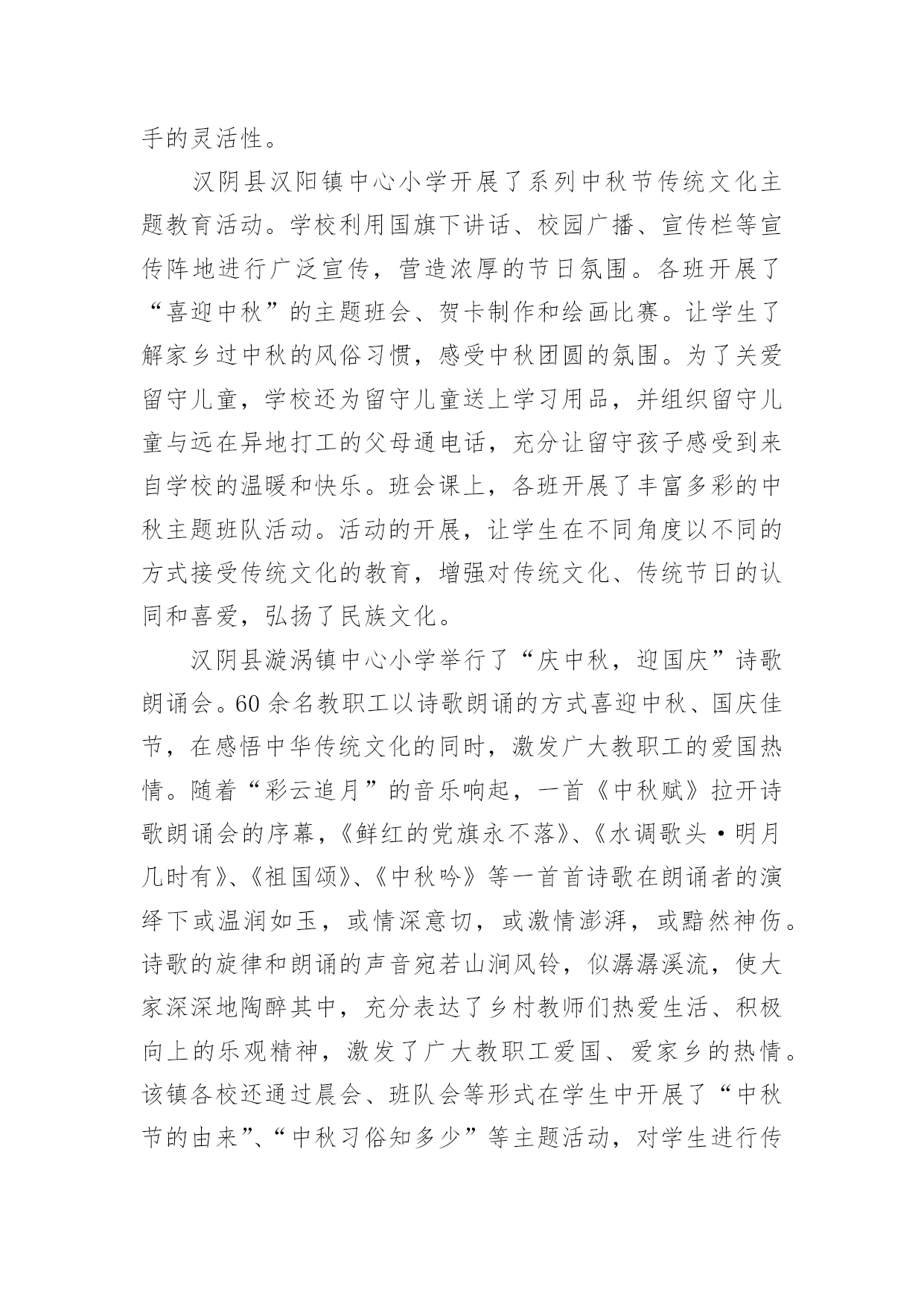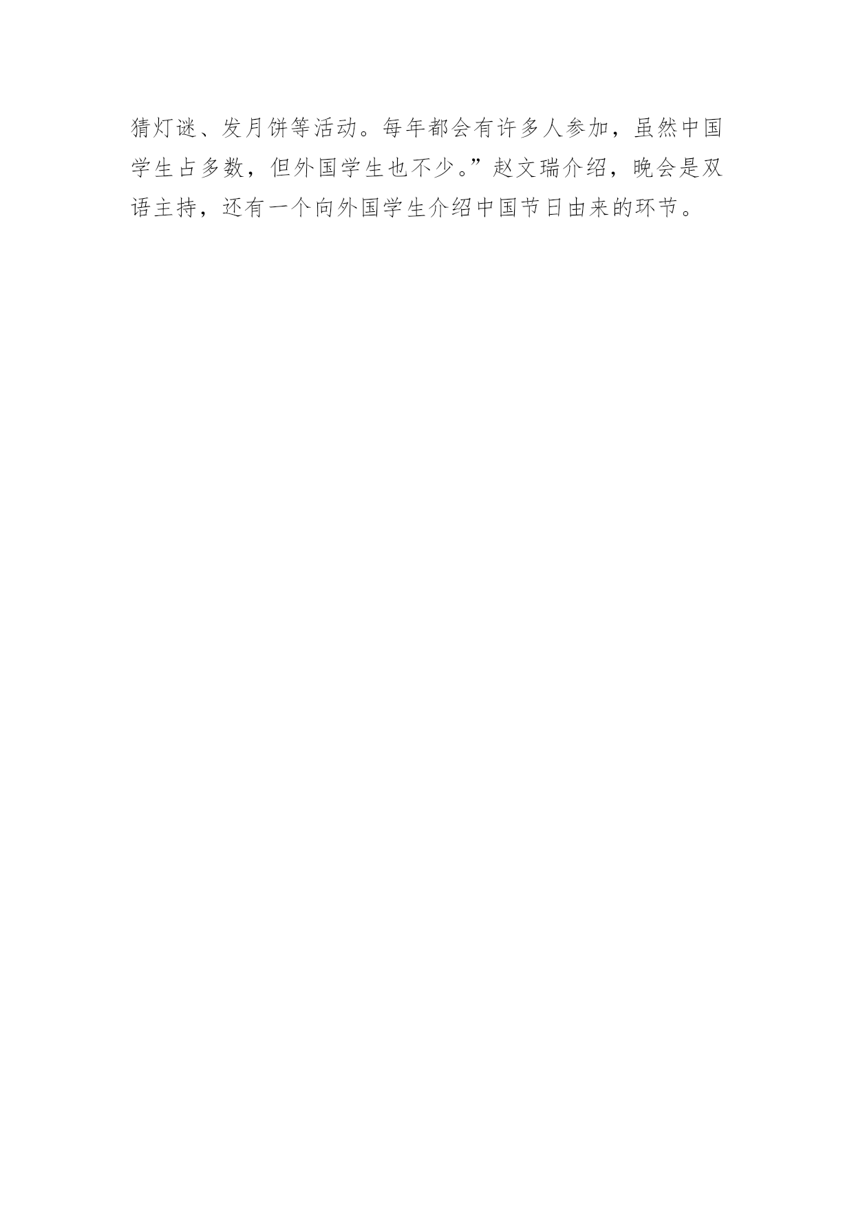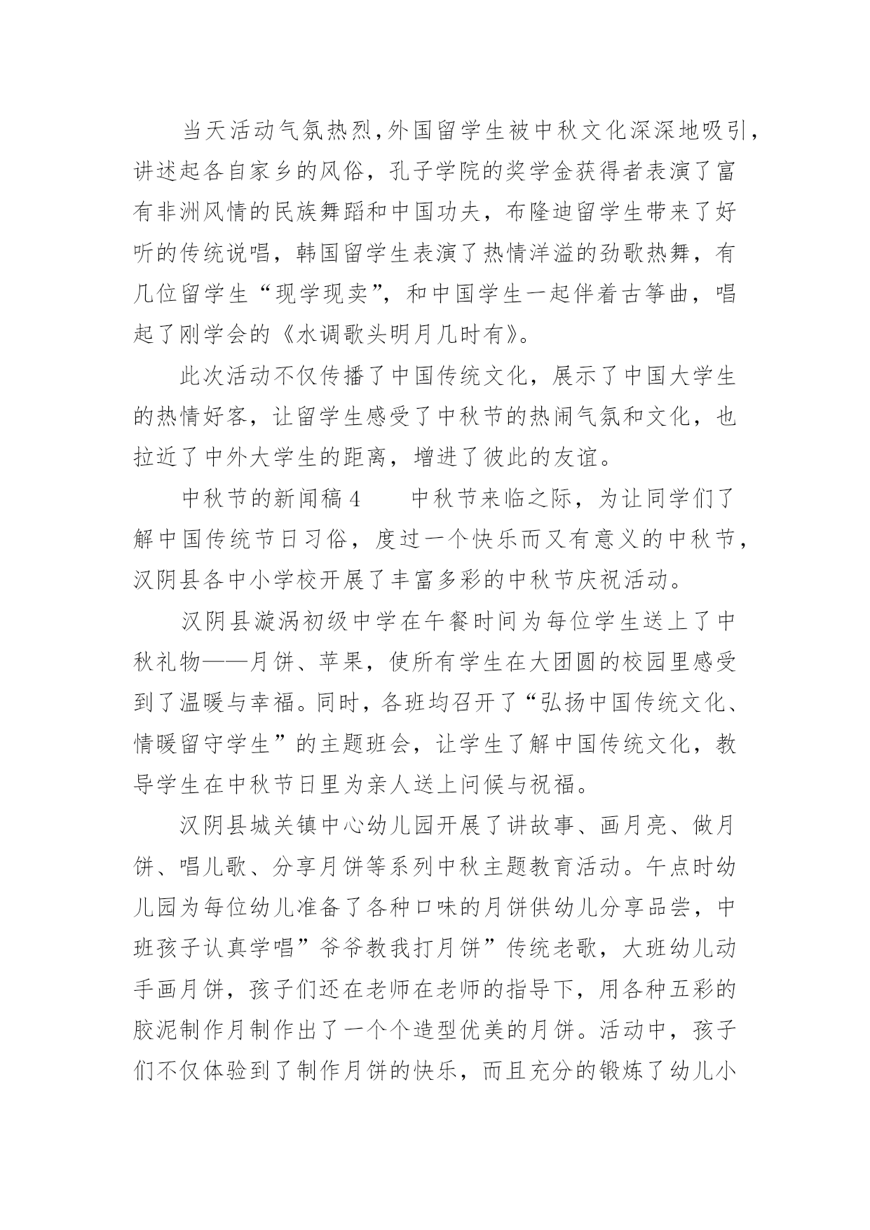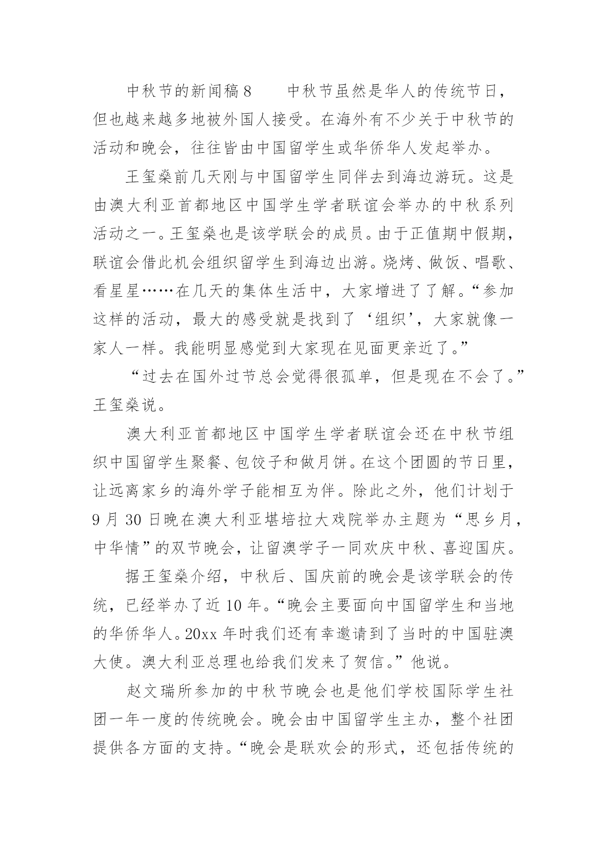 中秋节的新闻稿中秋节的新闻稿(精选8篇)在一步步向前发展的社会中,新闻稿与我们的生活息息相关,是企业永久、公开的记录的一部分,是品牌内容的重要资产。那么你有了解过新闻稿吗?下面是小编为大家整理的中秋节的新闻稿(精选8篇),欢迎阅读,希望大家能够喜欢。中秋节的新闻稿1为使广大师生更多地了解中华民族传统节日的文化内涵,广泛挖掘与诠释中华传统节日的精髓,使学生在活动中感受到中华民族的优良传统。大正小学于9月14日开展了以“我们的节日中秋”为主题的丰富多彩的活动。活动中,学校结合自身实际情况,利用校园广播站、宣传栏、主题班会、手抄报等形式,精心设计内容,广泛宣传传统节日,营造出了浓厚的民族节日氛围,以此弘扬民族精神和传统文化。各年级开展了“我们的节日中秋”主题班会。低年级的“中秋故事会”,“习俗知多少”,中年级的“经典诗文诵读”,高年级的“诗词鉴赏”,各具特色。与此同时,各班还开展了“我们的节日中秋”手抄报评比活动。活动中学生们精心设计,用自己独到的见解画出了自己心目中的中秋节。通过弘扬优秀传统文化,开展“我们的节日--中秋”为主题的活动,丰富了中华民族传统节日的内涵,同时也进一步激发了广大师生了解学习中华民族优秀传统文化的热情,增强了其民族自信心、自尊心和自豪感。中秋节的新闻稿2“我想画个气球、再画只兔子。”9月13日,万盛经开区民族学校举行了“中秋节·团圆日·制贺卡·送祝福”活动。活动中,该校教师和青年小学的大姐姐们一起教孩子们制作贺卡,孩子们思考着自己要画些什么,还在贺卡上写满对父母、老师、同学的中秋祝福。据了解,为了让民族学校的同学们能够更多地了解这一传统节日,并从中体味这一传统节日在生活中的韵味,该校引导孩子们在活动中体验欢度中秋的快乐和喜悦。“今天我觉得好开心,学会了一项小本领,那就是制作贺卡。”该校苗族学生杨菁菁说。中秋节的新闻稿3“每逢佳节倍思亲”,9月13日中秋前夕,渤海大学植物园内张灯结彩、欢歌笑语,“中秋大团圆,世界一家亲”的中外师生共度中秋活动在此举行,来自布隆迪、匈牙利、马达加斯加、法国、巴基斯坦、加纳等国的百余名留学生们与渤海大学师生欢聚一堂,共同体验“海上升明月,天涯共此时”的中秋情怀。为体现“中秋团圆,世界一家”这一主题,国际交流学院的老师搜集整理了有关中秋佳节的故事,邀请了医巫闾山满族剪纸代表性传承人蔺心宇老师和知名书法家到现场传授技艺,并准备了独具中秋节日韵味的`月饼、西式茶点、水果供大家品尝,以中西合璧的方式演绎出活动的主题,别具特色。当天活动气氛热烈,外国留学生被中秋文化深深地吸引,讲述起各自家乡的风俗,孔子学院的奖学金获得者表演了富有非洲风情的民族舞蹈和中国功夫,布隆迪留学生带来了好听的传统说唱,韩国留学生表演了热情洋溢的劲歌热舞,有几位留学生“现学现卖”,和中国学生一起伴着古筝曲,唱起了刚学会的《水调歌头明月几时有》。此次活动不仅传播了中国传统文化,展示了中国大学生的热情好客,让留学生感受了中秋节的热闹气氛和文化,也拉近了中外大学生的距离,增进了彼此的友谊。中秋节的新闻稿4中秋节来临之际,为让同学们了解中国传统节日习俗,度过一个快乐而又有意义的中秋节,汉阴县各中小学校开展了丰富多彩的中秋节庆祝活动。汉阴县漩涡初级中学在午餐时间为每位学生送上了中秋礼物——月饼、苹果,使所有学生在大团圆的校园里感受到了温暖与幸福。同时,各班均召开了“弘扬中国传统文化、情暖留守学生”的主题班会,让学生了解中国传统文化,教导学生在中秋节日里为亲人送上问候与祝福。汉阴县城关镇中心幼儿园开展了讲故事、画月亮、做月饼、唱儿歌、分享月饼等系列中秋主题教育活动。午点时幼儿园为每位幼儿准备了各种口味的月饼供幼儿分享品尝,中班孩子认真学唱”爷爷教我打月饼”传统老歌,大班幼儿动手画月饼,孩子们还在老师在老师的指导下,用各种五彩的胶泥制作月制作出了一个个造型优美的月饼。活动中,孩子们不仅体验到了制作月饼的快乐,而且充分的锻炼了幼儿小手的灵活性。汉阴县汉阳镇中心小学开展了系列中秋节传统文化主题教育活动。学校利用国旗下讲话、校园广播、宣传栏等宣传阵地进行广泛宣传,营造浓厚的节日氛围。各班开展了“喜迎中秋”的主题班会、贺卡制作和绘画比赛。让学生了解家乡过中秋的风俗习惯,感受中秋团圆的氛围。为了关爱留守儿童,学校还为留守儿童送上学习用品,并组织留守儿童与远在异地打工的父母通电话,充分让留守孩子感受到来自学校的温暖和快乐。班会课上,各班开展了丰富多彩的中秋主题班队活动。活动的开展,让学生在不同角度以不同的方式接受传统文化的教育,增强对传统文化、传统节日的认同和喜爱,弘扬了民族文化。汉阴县漩涡镇中心小学举行了“庆中秋,迎国庆”诗歌朗诵会。60余名教职工以诗歌朗诵的方式喜迎中秋、国庆佳节,在感悟中华传统文化的同时,激发广大教职工的爱国热情。随