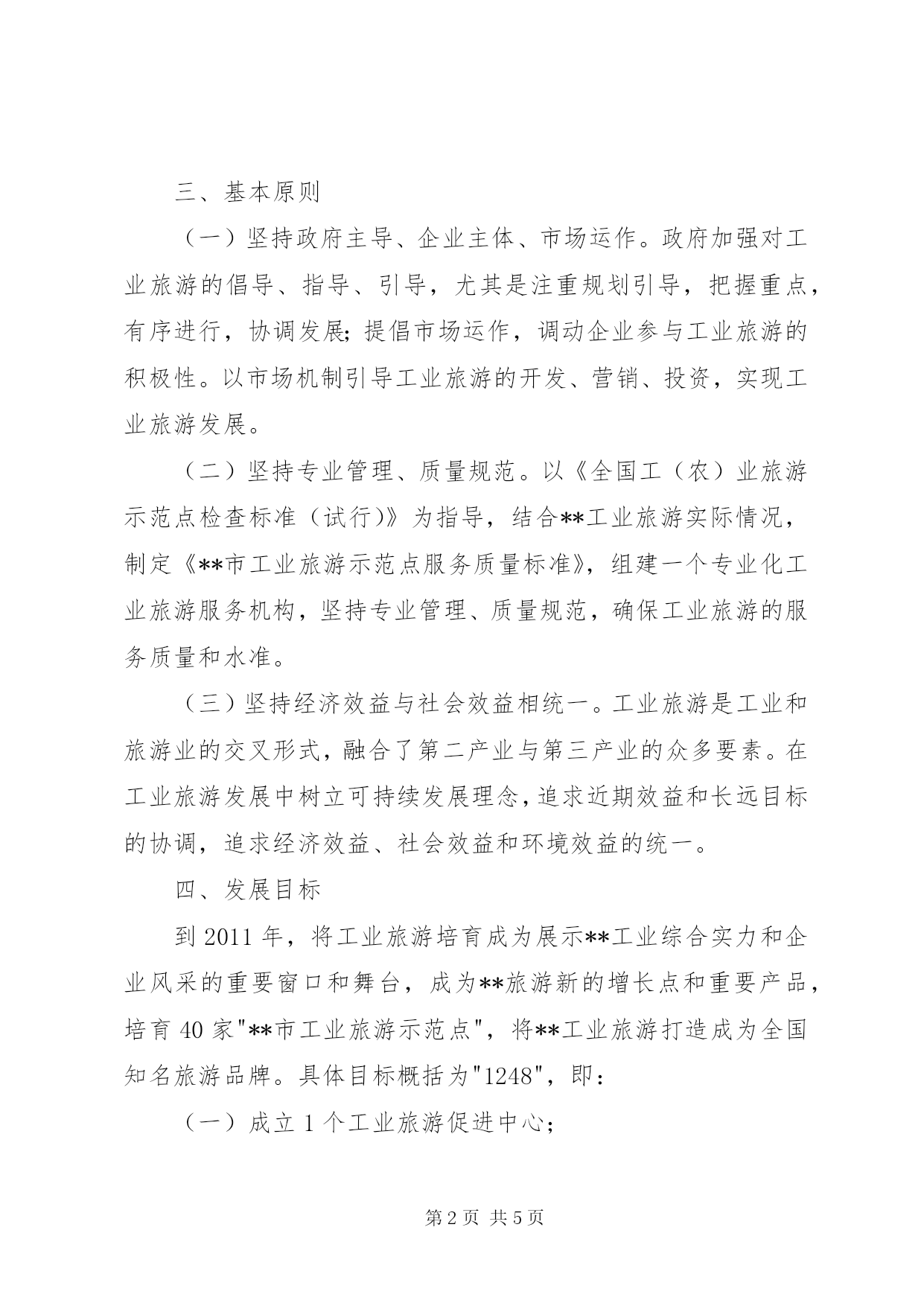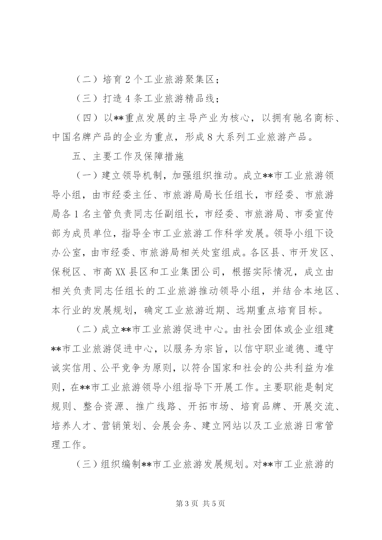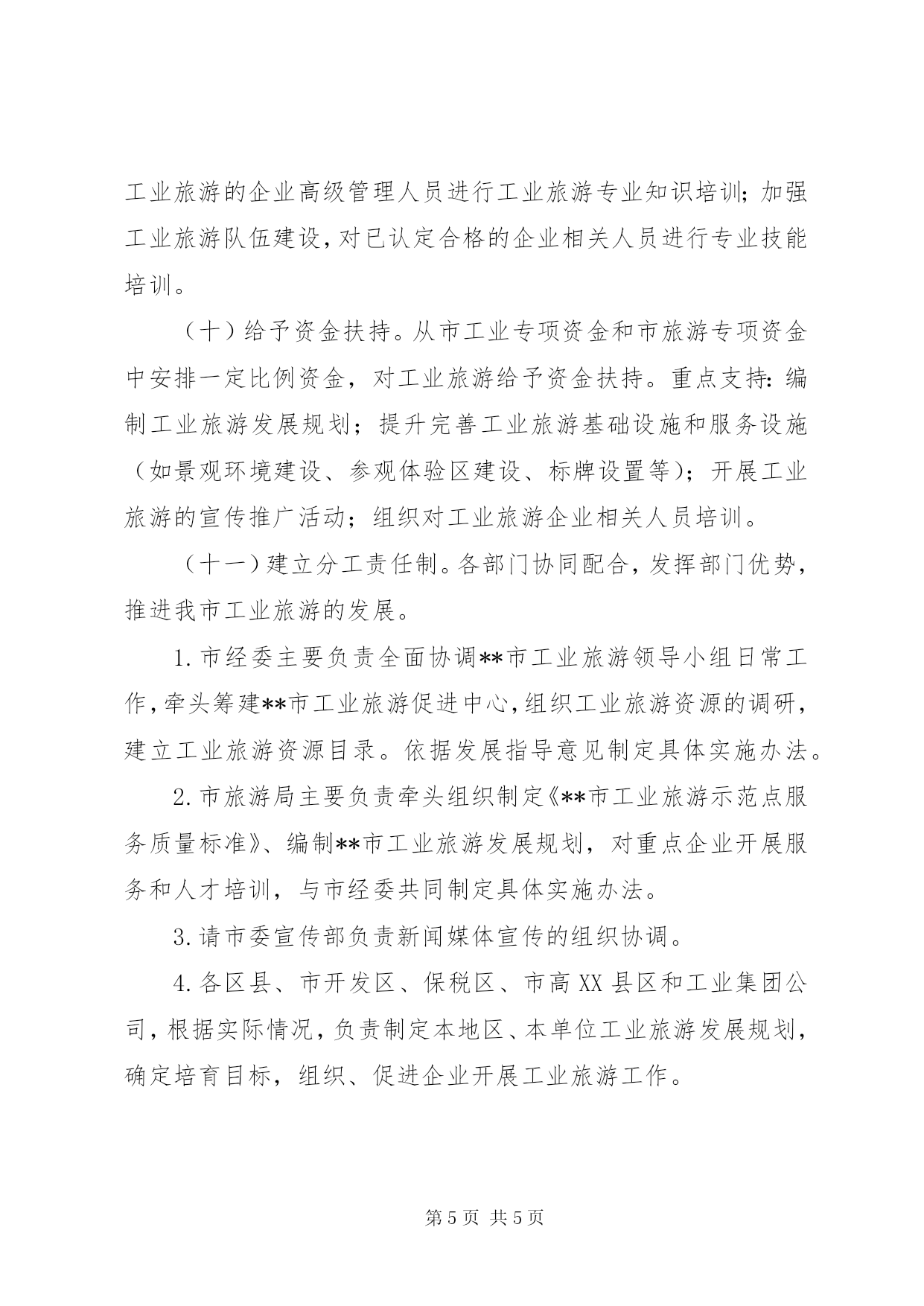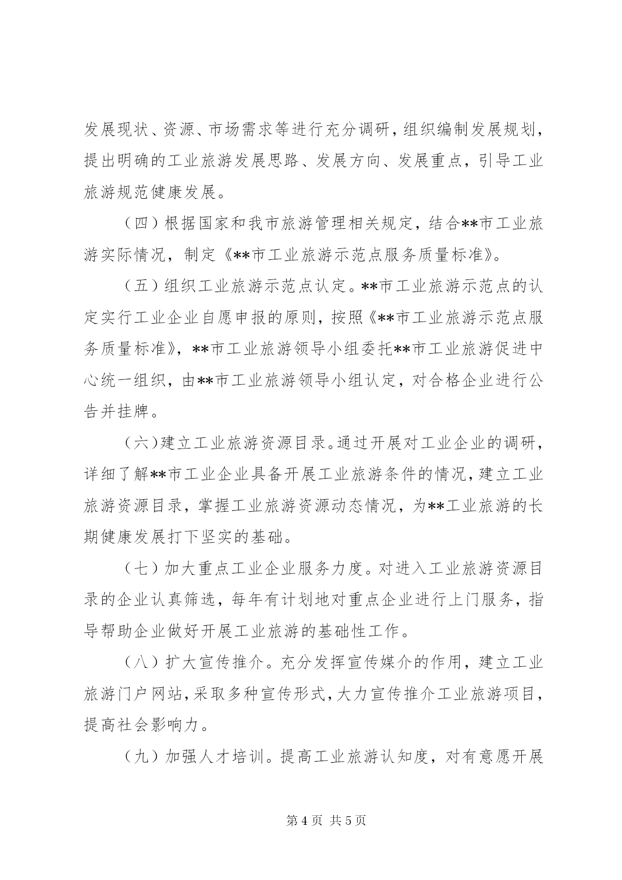 第PAGE\*Arabic\*MERGEFORMAT5页共NUMPAGES\*MERGEFORMAT5页旅游工业发展意见按照市委、市政府关于大力整合各种旅游资源、深度开发系列旅游产品的部署要求,围绕我市现代先进制造业基地、国家战略产业基地、高水平的研发转化基地、工业循环经济示范基地的建设,为充分发挥我市传统工业和现代制造业的优势,整合开发系列工业旅游产品,宣传工业品牌,推动我市旅游业快速、规范和健康发展,提出如下指导意见:一、目的和意义利用工业厂区景观、工业生产流程、工业企业文化等相关工业因素,开展工业旅游体验活动,以此满足旅游需求,提高企业综合效益,展示**市工业经济发展成就。发展工业旅游有利于促进工业企业转变发展理念、创新发展模式、提升发展质量;有利于传播工业文明,展示企业风采,宣传企业品牌,扩大品牌认知度;有利于深度开发旅游资源,丰富旅游产品,提升区域旅游业竞争力。二、指导思想以邓小平理论和"**"重要思想为指导,全面深入贯彻落实科学发展观,紧紧抓住滨海XX县区开发开放和大力发展服务业的机遇,以促进构建高端化、高质化、高新化产业结构和推动工业品牌建设为中心,以优势产业为重点,突出工业特色,展示工业风貌,实现工业旅游又好又快发展。三、基本原则(一)坚持政府主导、企业主体、市场运作。政府加强对工业旅游的倡导、指导、引导,尤其是注重规划引导,把握重点,有序进行,协调发展;提倡市场运作,调动企业参与工业旅游的积极性。以市场机制引导工业旅游的开发、营销、投资,实现工业旅游发展。(二)坚持专业管理、质量规范。以《全国工(农)业旅游示范点检查标准(试行)》为指导,结合**工业旅游实际情况,制定《**市工业旅游示范点服务质量标准》,组建一个专业化工业旅游服务机构,坚持专业管理、质量规范,确保工业旅游的服务质量和水准。(三)坚持经济效益与社会效益相统一。工业旅游是工业和旅游业的交叉形式,融合了第二产业与第三产业的众多要素。在工业旅游发展中树立可持续发展理念,追求近期效益和长远目标的协调,追求经济效益、社会效益和环境效益的统一。四、发展目标到2011年,将工业旅游培育成为展示**工业综合实力和企业风采的重要窗口和舞台,成为**旅游新的增长点和重要产品,培育40家"**市工业旅游示范点",将**工业旅游打造成为全国知名旅游品牌。具体目标概括为"1248",即:(一)成立1个工业旅游促进中心;(二)培育2个工业旅游聚集区;(三)打造4条工业旅游精品线;(四)以**重点发展的主导产业为核心,以拥有驰名商标、中国名牌产品的企业为重点,形成8大系列工业旅游产品。五、主要工作及保障措施(一)建立领导机制,加强组织推动。成立**市工业旅游领导小组,由市经委主任、市旅游局局长任组长,市经委、市旅游局各1名主管负责同志任副组长,市经委、市旅游局、市委宣传部为成员单位,指导全市工业旅游工作科学发展。领导小组下设办公室,由市经委、市旅游局相关处室组成。各区县、市开发区、保税区、市高XX县区和工业集团公司,根据实际情况,成立由相关负责同志任组长的工业旅游推动领导小组,并结合本地区、本行业的发展规划,确定工业旅游近期、远期重点培育目标。(二)成立**市工业旅游促进中心。由社会团体或企业组建**市工业旅游促进中心,以服务为宗旨,以信守职业道德、遵守诚实信用、公平竞争为原则,以符合国家和社会的公共利益为准则,在**市工业旅游领导小组指导下开展工作。主要职能是制定规则、整合资源、推广线路、开拓市场、培育品牌、开展交流、培养人才、营销策划、会展会务、建立网站以及工业旅游日常管理工作。(三)组织编制**市工业旅游发展规划。对**市工业旅游的发展现状、资源、市场需求等进行充分调研,组织编制发展规划,提出明确的工业旅游发展思路、发展方向、发展重点,引导工业旅游规范健康发展。(四)根据国家和我市旅游管理相关规定,结合**市工业旅游实际情况,制定《**市工业旅游示范点服务质量标准》。(五)组织工业旅游示范点认定。**市工业旅游示范点的认定实行工业企业自愿申报的原则,按照《**市工业旅游示范点服务质量标准》,**市工业旅游领导小组委托**市工业旅游促进中心统一组织,由**市工业旅游领导小组认定,对合格企业进行公告并挂牌。(六)建立工业旅游资源目录。通过开展对工业企业的调研,详细了解**市工业企业具备开展工业旅游条件的情况,建立工业旅游资源目录,掌握工业旅游资源动态情况,为**工业旅游的长期健康发展打下坚实的基础。(七)加大重点工业企业服务力度。对进入工业旅游资源目录的企业认真筛选,每年有计划地对重点企业进行上门服务,指导帮助企业做好开展工业旅游的基础性工作。(八)扩大宣传推介。充分发挥宣传媒介的作用,建立工业旅游门户网站,采取多种宣传形式,大力宣传推介工业旅游