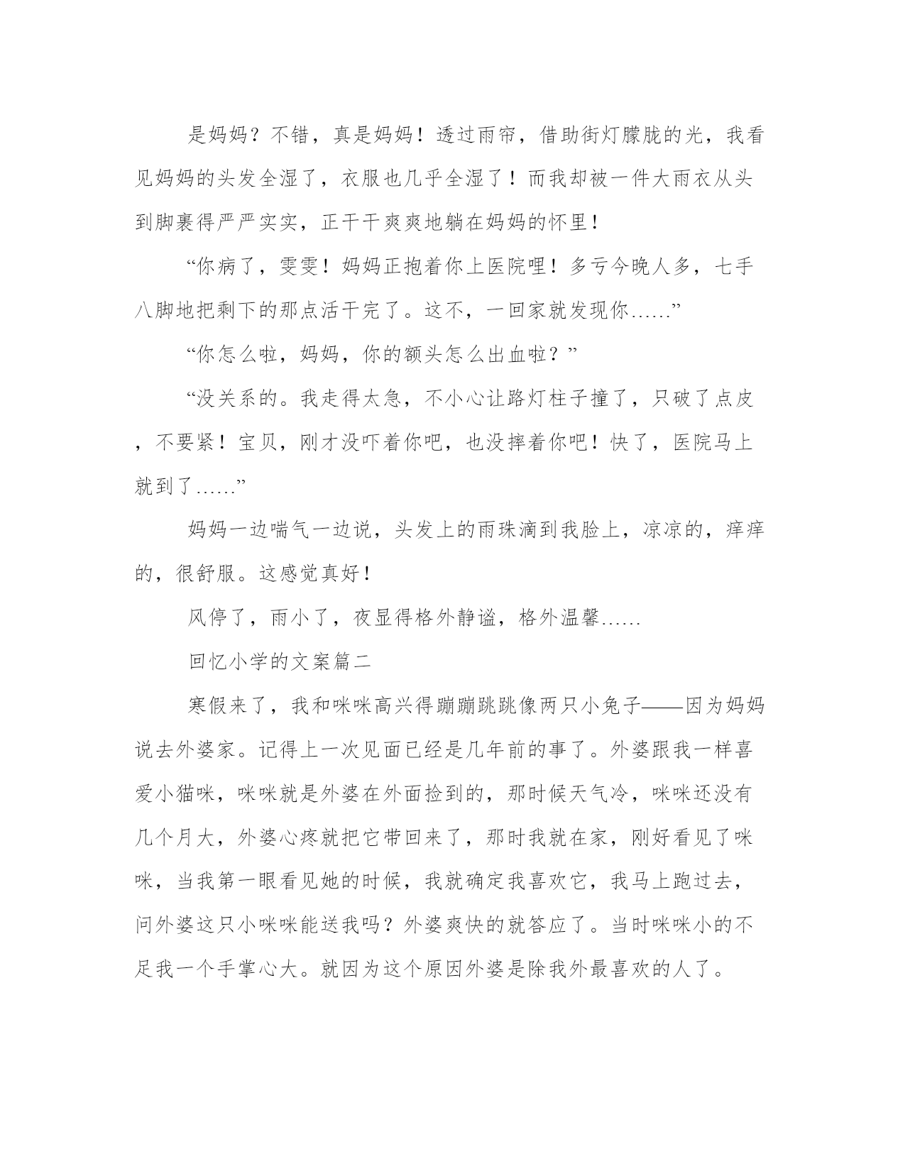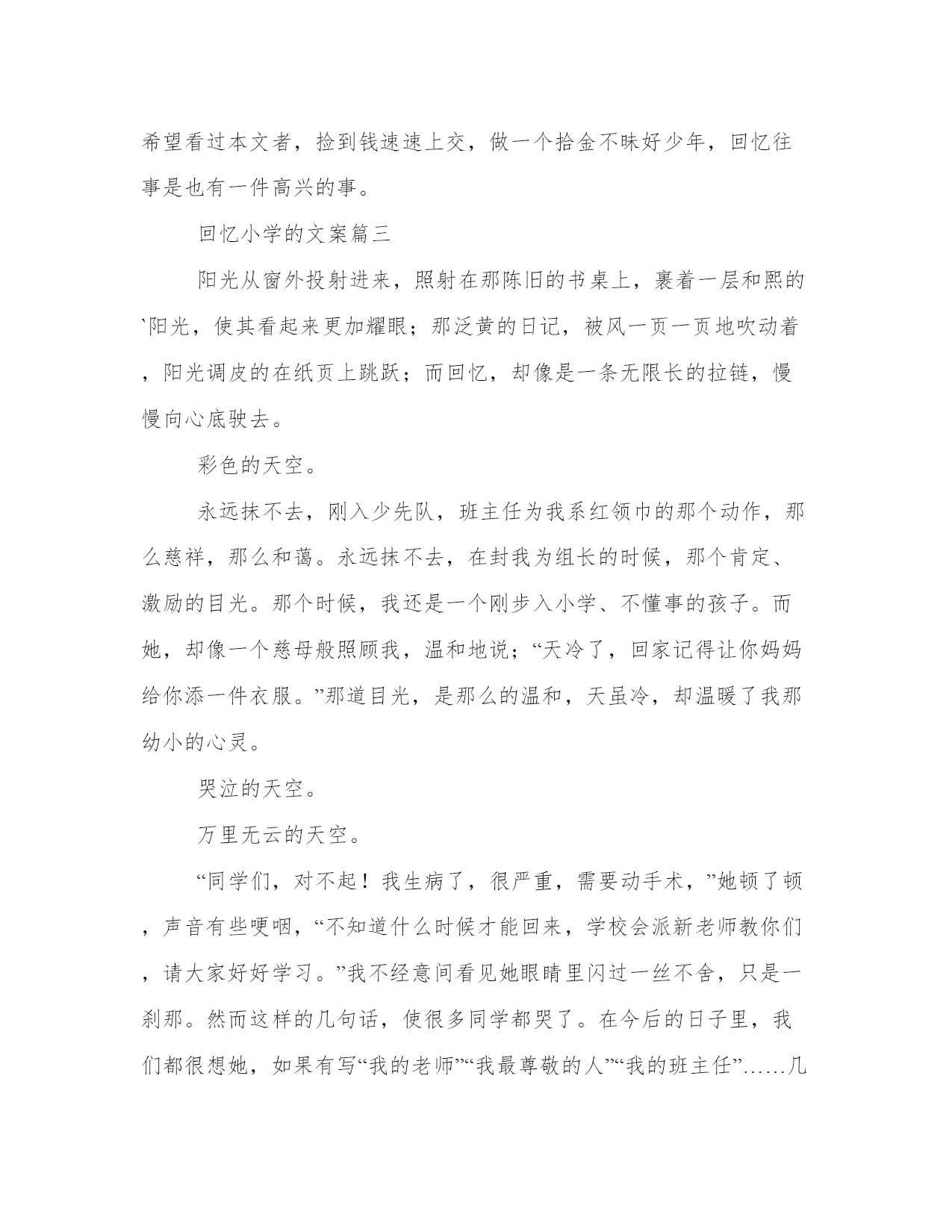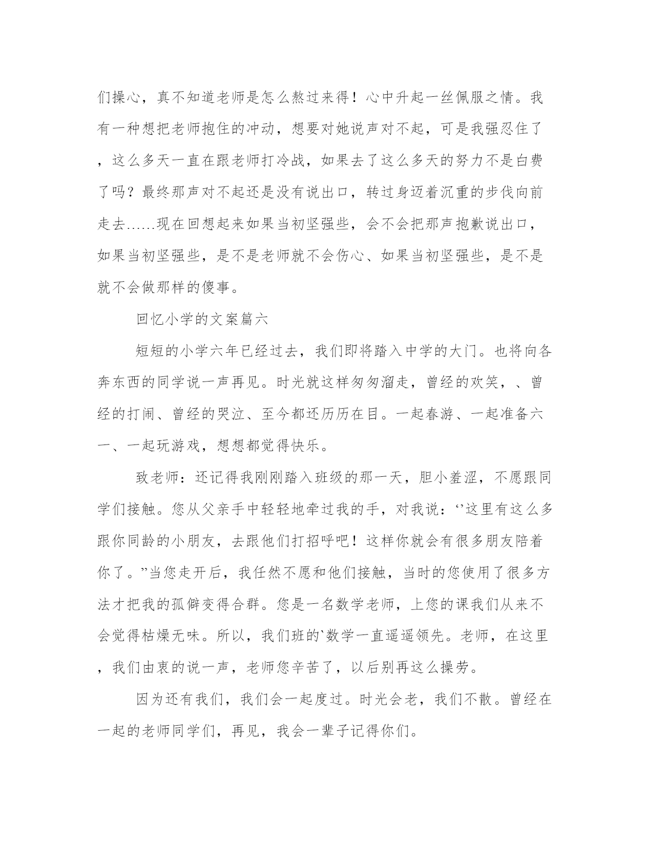 最新回忆小学的文案(优质10篇)在日常的学习、工作、生活中,肯定对各类范文都很熟悉吧。相信许多人会觉得范文很难写?下面是小编帮大家整理的优质范文,仅供参考,大家一起来看看吧。回忆小学的文案篇一窗外,一片漆黑,只听到大雨哗啦,雷声轰隆。屋内,只有我一个人,坐在桌前,以书为伴。墙上的挂钟“当当”敲响了十下,我放下手中的书本,长长地伸了一下懒腰,准备睡觉了。突然,我觉得一阵恶心,头也开始隐隐作痛,我伸手摸摸额头——烫人!我感冒了!两颗泪珠顺着脸颊滴落下来。偏偏在这样的非常时刻,对我疼爱有加的爸爸出差在外!要么,打个电话给妈妈?她就在离家不远的车间上晚班。我迟疑着,最终还是没按下通往妈妈车间的电话号码。咦,怎么啦?一阵凉风拂面而过,我居然飞了起来。尽管飞得不高也不快,但感觉特好!“嗯,嗯,嗯……”我奋力地扇动“双翅”,想飞得更高更快。“咚”地一声,我倒在了地上。我的确是摔倒了,就摔在大街的雨地里,还没等我明白怎么回事,就被一双强有力的手抱起,耳边传来熟悉的声音:“孩子,摔疼了吗?别怕,别怕,我是妈妈……”是妈妈?不错,真是妈妈!透过雨帘,借助街灯朦胧的光,我看见妈妈的头发全湿了,衣服也几乎全湿了!而我却被一件大雨衣从头到脚裹得严严实实,正干干爽爽地躺在妈妈的怀里!“你病了,雯雯!妈妈正抱着你上医院哩!多亏今晚人多,七手八脚地把剩下的那点活干完了。这不,一回家就发现你……”“你怎么啦,妈妈,你的额头怎么出血啦?”“没关系的。我走得太急,不小心让路灯柱子撞了,只破了点皮,不要紧!宝贝,刚才没吓着你吧,也没摔着你吧!快了,医院马上就到了……”妈妈一边喘气一边说,头发上的雨珠滴到我脸上,凉凉的,痒痒的,很舒服。这感觉真好!风停了,雨小了,夜显得格外静谧,格外温馨……回忆小学的文案篇二寒假来了,我和咪咪高兴得蹦蹦跳跳像两只小兔子——因为妈妈说去外婆家。记得上一次见面已经是几年前的事了。外婆跟我一样喜爱小猫咪,咪咪就是外婆在外面捡到的,那时候天气冷,咪咪还没有几个月大,外婆心疼就把它带回来了,那时我就在家,刚好看见了咪咪,当我第一眼看见她的时候,我就确定我喜欢它,我马上跑过去,问外婆这只小咪咪能送我吗?外婆爽快的就答应了。当时咪咪小的不足我一个手掌心大。就因为这个原因外婆是除我外最喜欢的人了。这是哪儿?这是20xx年吗?对着就是20xx年。那我就要去look一下。今天是周一早上,阳光明媚,我的心情很不错,不过要发生什么事。过不真然,级部主任把我救了过去,对我说到:你烫头了。天哪!这是清空一劈!冤枉啊!幸好地理老师过来说:那是天生的,不是烫的。级部主任这才放我一马。我的冤情终于被洗刷了,呜。但我的心情却被级部主任破坏掉了。他叫我回班把。咦,刚一出办公室,一张绿色的东西向我招手——50元,我兴奋得像是中了百万大奖,难道是我时来运转,嘿嘿,这下发了。对,先给妈妈买些好东西,剩下的钱我自己去消费的吧,哈哈哈但不知道为什么,心里有种不在的感觉,,心想:哎哟!到底要不要啊!我的心里别拧的很,怎么办才好那,到底要不要呀?可憋死我了,我望了望周围,没有人,要不我就捡起来就当没发生,不行!要是掉钱的人找不到该多难过啊!我也有这种感觉,实在是不好受。不行!我不能做这种违背良心的事,还是交给老师吧!可我对着这钱是爱不释手,然后我又想起了幼儿园是妈妈给我讲的故事,还是交上去吧!于是我把钱交给了级部主任,走出办公室的门,我激动的心情这平静下来了。级部主任还表扬了我,在国旗下说我的伟宏壮记,夸我拾金不昧好少年。那是比拿着50元高兴的了。回到现在,我的心里美滋滋,原来给别人快乐比自己快乐更快乐。回忆往事,我还做了一件这么有意义的事,我为我自己感到高兴,希望看过本文者,捡到钱速速上交,做一个拾金不昧好少年,回忆往事是也有一件高兴的事。回忆小学的文案篇三阳光从窗外投射进来,照射在那陈旧的书桌上,裹着一层和熙的`阳光,使其看起来更加耀眼;那泛黄的日记,被风一页一页地吹动着,阳光调皮的在纸页上跳跃;而回忆,却像是一条无限长的拉链,慢慢向心底驶去。彩色的天空。永远抹不去,刚入少先队,班主任为我系红领巾的那个动作,那么慈祥,那么和蔼。永远抹不去,在封我为组长的时候,那个肯定、激励的目光。那个时候,我还是一个刚步入小学、不懂事的孩子。而她,却像一个慈母般照顾我,温和地说;“天冷了,回家记得让你妈妈给你添一件衣服。”那道目光,是那么的温和,天虽冷,却温暖了我那幼小的心灵。哭泣的天空。万里无云的天空。“同学们,对不起!我生病了,很严重,需要动手术,”她顿了顿,声音有些哽咽,“不知道什么时候才能回来,学校会派新老师教你们,请大家好好学习。”我不经意间看见她眼睛里闪过一丝不舍,只是一刹那。然而这样的几句话,使很多同学都哭了。在今后的日子里,我们