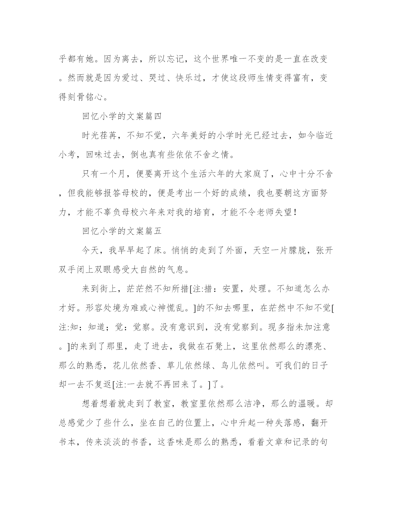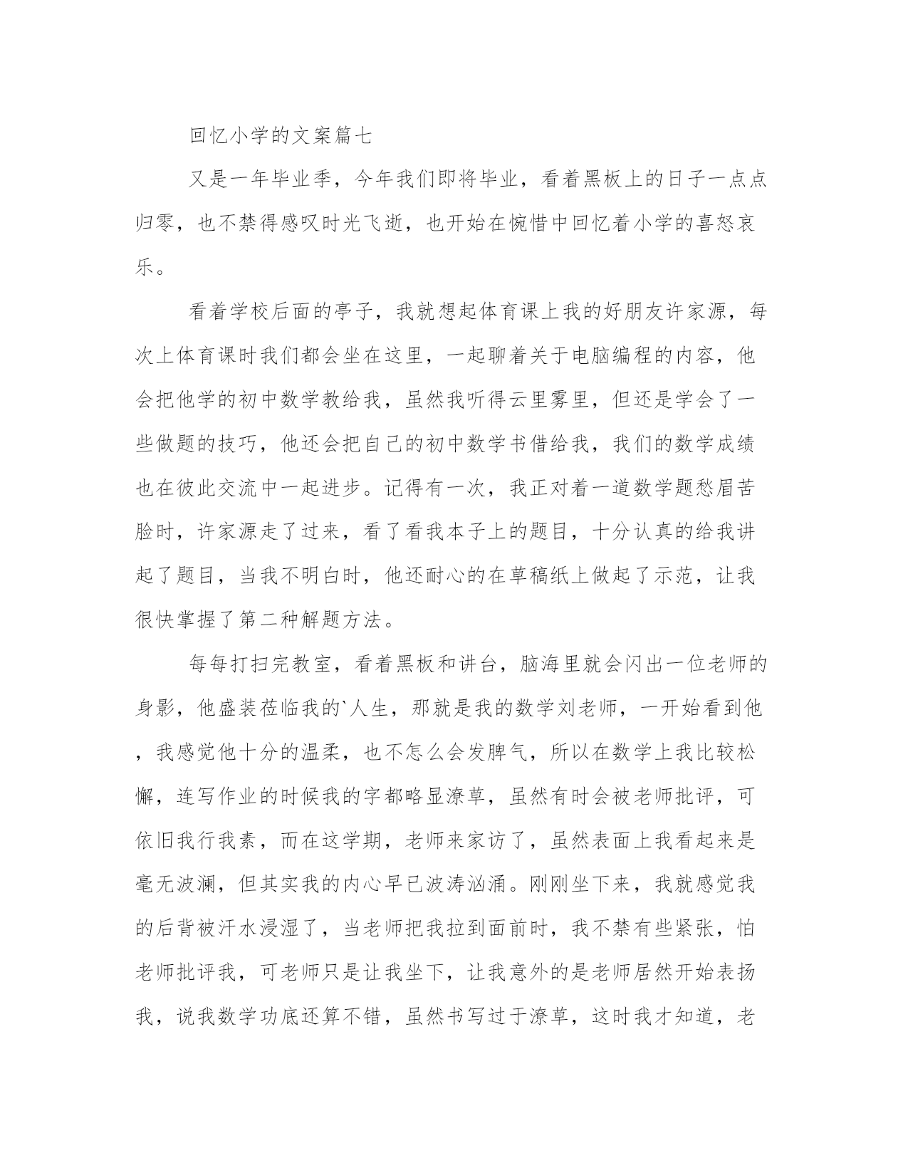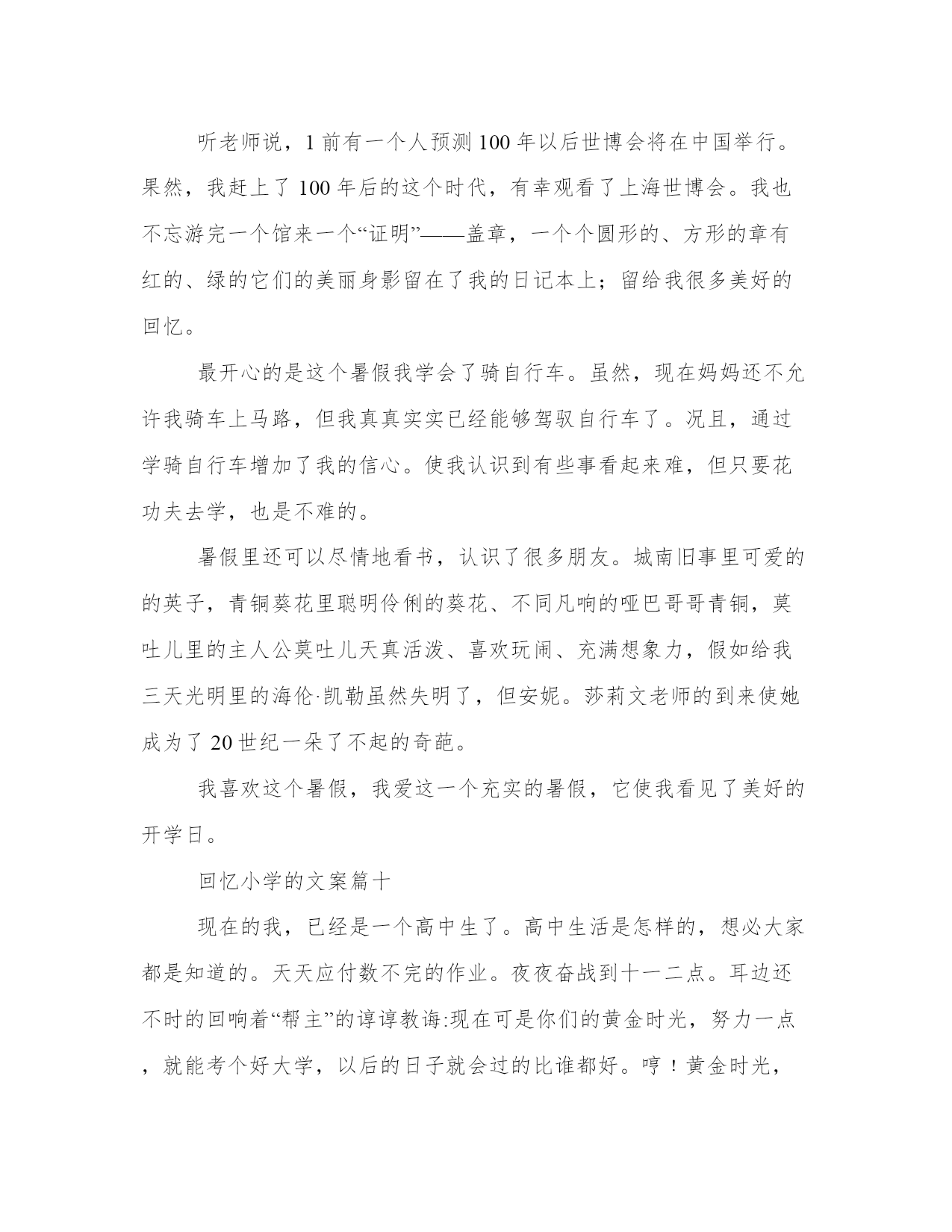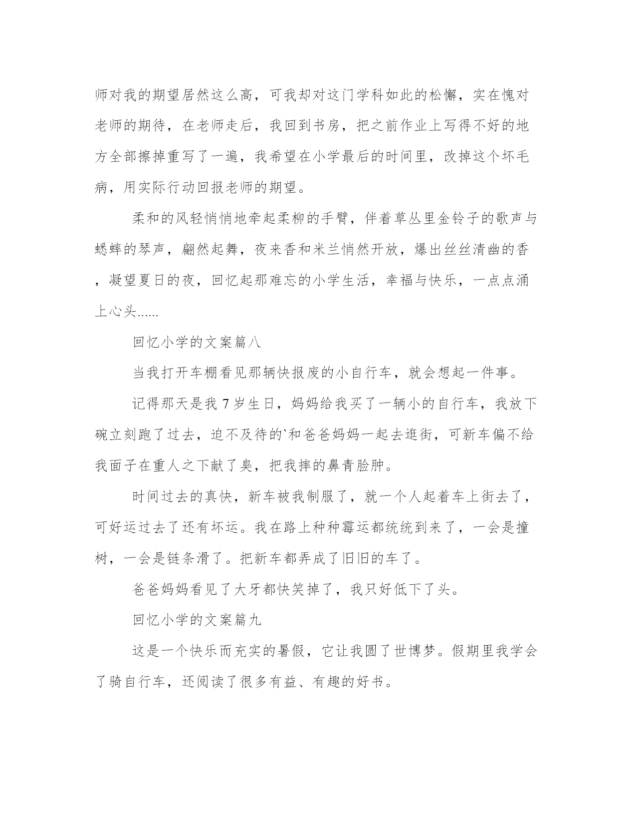 最新回忆小学的文案(优质10篇)在日常的学习、工作、生活中,肯定对各类范文都很熟悉吧。相信许多人会觉得范文很难写?下面是小编帮大家整理的优质范文,仅供参考,大家一起来看看吧。回忆小学的文案篇一窗外,一片漆黑,只听到大雨哗啦,雷声轰隆。屋内,只有我一个人,坐在桌前,以书为伴。墙上的挂钟“当当”敲响了十下,我放下手中的书本,长长地伸了一下懒腰,准备睡觉了。突然,我觉得一阵恶心,头也开始隐隐作痛,我伸手摸摸额头——烫人!我感冒了!两颗泪珠顺着脸颊滴落下来。偏偏在这样的非常时刻,对我疼爱有加的爸爸出差在外!要么,打个电话给妈妈?她就在离家不远的车间上晚班。我迟疑着,最终还是没按下通往妈妈车间的电话号码。咦,怎么啦?一阵凉风拂面而过,我居然飞了起来。尽管飞得不高也不快,但感觉特好!“嗯,嗯,嗯……”我奋力地扇动“双翅”,想飞得更高更快。“咚”地一声,我倒在了地上。我的确是摔倒了,就摔在大街的雨地里,还没等我明白怎么回事,就被一双强有力的手抱起,耳边传来熟悉的声音:“孩子,摔疼了吗?别怕,别怕,我是妈妈……”是妈妈?不错,真是妈妈!透过雨帘,借助街灯朦胧的光,我看见妈妈的头发全湿了,衣服也几乎全湿了!而我却被一件大雨衣从头到脚裹得严严实实,正干干爽爽地躺在妈妈的怀里!“你病了,雯雯!妈妈正抱着你上医院哩!多亏今晚人多,七手八脚地把剩下的那点活干完了。这不,一回家就发现你……”“你怎么啦,妈妈,你的额头怎么出血啦?”“没关系的。我走得太急,不小心让路灯柱子撞了,只破了点皮,不要紧!宝贝,刚才没吓着你吧,也没摔着你吧!快了,医院马上就到了……”妈妈一边喘气一边说,头发上的雨珠滴到我脸上,凉凉的,痒痒的,很舒服。这感觉真好!风停了,雨小了,夜显得格外静谧,格外温馨……回忆小学的文案篇二寒假来了,我和咪咪高兴得蹦蹦跳跳像两只小兔子——因为妈妈说去外婆家。记得上一次见面已经是几年前的事了。外婆跟我一样喜爱小猫咪,咪咪就是外婆在外面捡到的,那时候天气冷,咪咪还没有几个月大,外婆心疼就把它带回来了,那时我就在家,刚好看见了咪咪,当我第一眼看见她的时候,我就确定我喜欢它,我马上跑过去,问外婆这只小咪咪能送我吗?外婆爽快的就答应了。当时咪咪小的不足我一个手掌心大。就因为这个原因外婆是除我外最喜欢的人了。这是哪儿?这是20xx年吗?对着就是20xx年。那我就要去look一下。今天是周一早上,阳光明媚,我的心情很不错,不过要发生什么事。过不真然,级部主任把我救了过去,对我说到:你烫头了。天哪!这是清空一劈!冤枉啊!幸好地理老师过来说:那是天生的,不是烫的。级部主任这才放我一马。我的冤情终于被洗刷了,呜。但我的心情却被级部主任破坏掉了。他叫我回班把。咦,刚一出办公室,一张绿色的东西向我招手——50元,我兴奋得像是中了百万大奖,难道是我时来运转,嘿嘿,这下发了。对,先给妈妈买些好东西,剩下的钱我自己去消费的吧,哈哈哈但不知道为什么,心里有种不在的感觉,,心想:哎哟!到底要不要啊!我的心里别拧的很,怎么办才好那,到底要不要呀?可憋死我了,我望了望周围,没有人,要不我就捡起来就当没发生,不行!要是掉钱的人找不到该多难过啊!我也有这种感觉,实在是不好受。不行!我不能做这种违背良心的事,还是交给老师吧!可我对着这钱是爱不释手,然后我又想起了幼儿园是妈妈给我讲的故事,还是交上去吧!于是我把钱交给了级部主任,走出办公室的门,我激动的心情这平静下来了。级部主任还表扬了我,在国旗下说我的伟宏壮记,夸我拾金不昧好少年。那是比拿着50元高兴的了。回到现在,我的心里美滋滋,原来给别人快乐比自己快乐更快乐。回忆往事,我还做了一件这么有意义的事,我为我自己感到高兴,希望看过本文者,捡到钱速速上交,做一个拾金不昧好少年,回忆往事是也有一件高兴的事。回忆小学的文案篇三阳光从窗外投射进来,照射在那陈旧的书桌上,裹着一层和熙的`阳光,使其看起来更加耀眼;那泛黄的日记,被风一页一页地吹动着,阳光调皮的在纸页上跳跃;而回忆,却像是一条无限长的拉链,慢慢向心底驶去。彩色的天空。永远抹不去,刚入少先队,班主任为我系红领巾的那个动作,那么慈祥,那么和蔼。永远抹不去,在封我为组长的时候,那个肯定、激励的目光。那个时候,我还是一个刚步入小学、不懂事的孩子。而她,却像一个慈母般照顾我,温和地说;“天冷了,回家记得让你妈妈给你添一件衣服。”那道目光,是那么的温和,天虽冷,却温暖了我那幼小的心灵。哭泣的天空。万里无云的天空。“同学们,对不起!我生病了,很严重,需要动手术,”她顿了顿,声音有些哽咽,“不知道什么时候才能回来,学校会派新老师教你们,请大家好好学习。”我不经意间看见她眼睛里闪过一丝不舍,只是一刹那。然而这样的几句话,使很多同学都哭了。在今后的日子里,我们