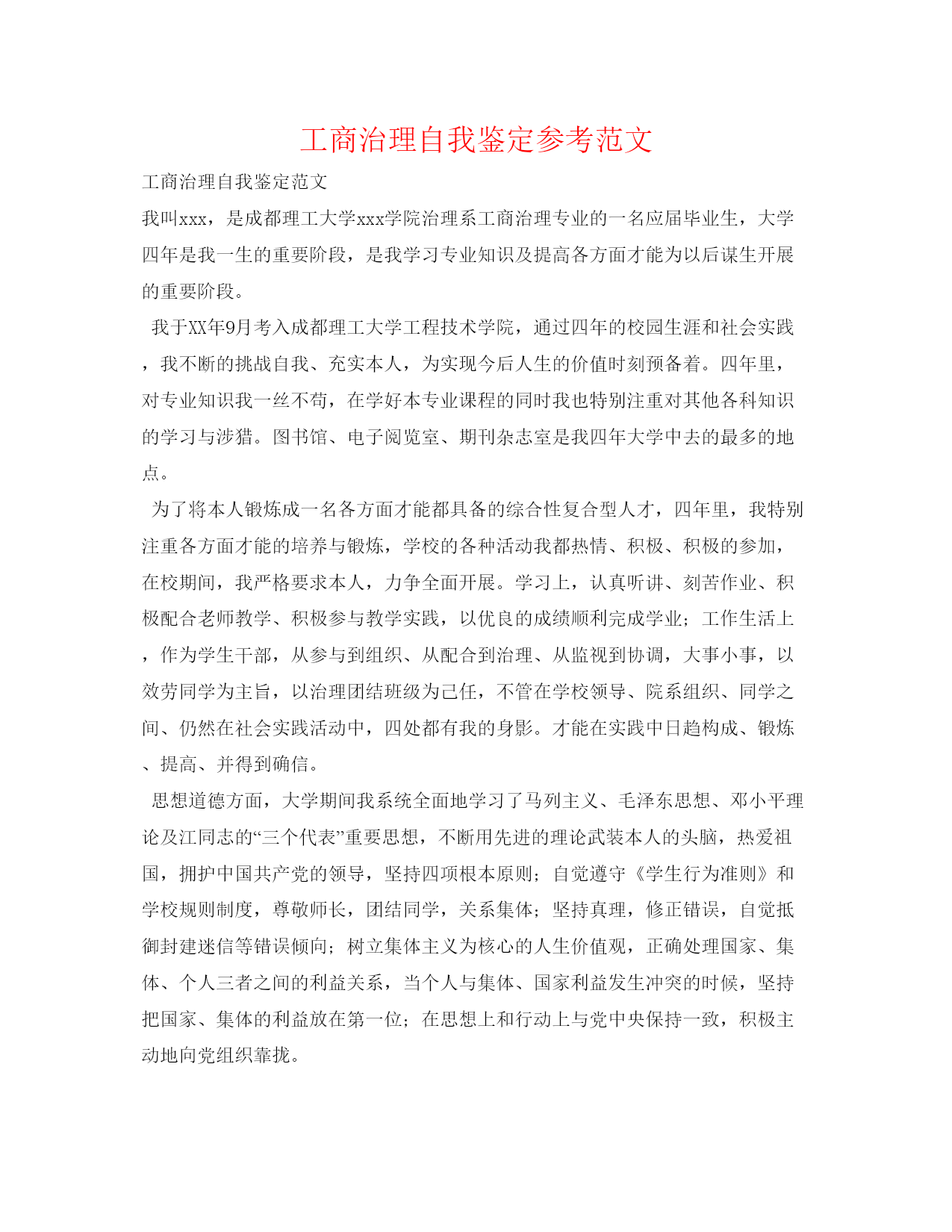 工商治理自我鉴定参考范文工商治理自我鉴定范文我叫xxx,是成都理工大学xxx学院治理系工商治理专业的一名应届毕业生,大学四年是我一生的重要阶段,是我学习专业知识及提高各方面才能为以后谋生开展的重要阶段。我于XX年9月考入成都理工大学工程技术学院,通过四年的校园生涯和社会实践,我不断的挑战自我、充实本人,为实现今后人生的价值时刻预备着。四年里,对专业知识我一丝不苟,在学好本专业课程的同时我也特别注重对其他各科知识的学习与涉猎。图书馆、电子阅览室、期刊杂志室是我四年大学中去的最多的地点。为了将本人锻炼成一名各方面才能都具备的综合性复合型人才,四年里,我特别注重各方面才能的培养与锻炼,学校的各种活动我都热情、积极、积极的参加,在校期间,我严格要求本人,力争全面开展。学习上,认真听讲、刻苦作业、积极配合老师教学、积极参与教学实践,以优良的成绩顺利完成学业;工作生活上,作为学生干部,从参与到组织、从配合到治理、从监视到协调,大事小事,以效劳同学为主旨,以治理团结班级为己任,不管在学校领导、院系组织、同学之间、仍然在社会实践活动中,四处都有我的身影。才能在实践中日趋构成、锻炼、提高、并得到确信。思想道德方面,大学期间我系统全面地学习了马列主义、毛泽东思想、邓小平理论及江同志的“三个代表”重要思想,不断用先进的理论武装本人的头脑,热爱祖国,拥护中国共产党的领导,坚持四项根本原则;自觉遵守《学生行为准则》和学校规则制度,尊敬师长,团结同学,关系集体;坚持真理,修正错误,自觉抵御封建迷信等错误倾向;树立集体主义为核心的人生价值观,正确处理国家、集体、个人三者之间的利益关系,当个人与集体、国家利益发生冲突的时候,坚持把国家、集体的利益放在第一位;在思想上和行动上与党中央保持一致,积极主动地向党组织靠拢。科学文化知识方面,我认真端正学习目的、学习态度,系统全面地学习了本专业的理论根底知识,同时把所学的理论知识应用于实践活动中,把所学知识转化为动手才能、应用才能和制造才能,力求理论和实践的统一。在学习和掌握本专业理论知识和应用技能的同时,还努力拓宽本人的知识面,培养本人其他方面的才能。在英语和技能方面,我努力学习参加并通过国家英语四级和计算机二级考试。身体和心理方面。大学四年里,我掌握了科学锻炼身体的根本技能,养成了良好的卫生适应,积极参加院系和班级组织的各项体育活动,如乒乓球、篮球、排球、越野竞赛等,身体检查健康,体育合格达标。心理方面,我锻炼坚强的意志质量,塑造健康人格,克服各种心理障碍,以适应社会开展要求。身为学生的我在修好学业的同时也注重于对社会的实践。本着学以致用,理论与实践相结合的原则,在校期间我参加了一系列的社会实践。XX年7月--8月暑假我在凉山州妇女儿童开展中心参加社会实践,尽管特别苦特别累,但是通过一个暑假的锻炼,我加强了与人接触、交往、沟通的才能。XX年年暑假我在攀枝花市市公安局辑毒支队做兼职,将近两个多月的辑毒生活给我上了一节生动鲜明的教育课,使我深深地明白了挣钱的困难与生活的不易,更加明白得大学生应有的荣耀与责任。通过各种社会实践,使我较早得融入了社会中去,尽管还没有走出学校大门,但是我已经有了对社会的初步理解与尝试,这些都是我在四年大学生活中知识以外沉甸甸的收获。自信来自实力。大学四年,我将本人塑造成了一个健康、充满自信的我,但同时我也认识到,当今社会变革迅速,对人才的要求也越来越高,社会是在不断变化、开展的,这一前提要求我们每个人必须用开展的目光看征询题。因此,我本身还有特别多的缺点和缺乏,在今后的学习、生活、工作中,我会不断提高本人的思想认识,不断改正缺点,不断完善本人,以便适应社会的开展要求。