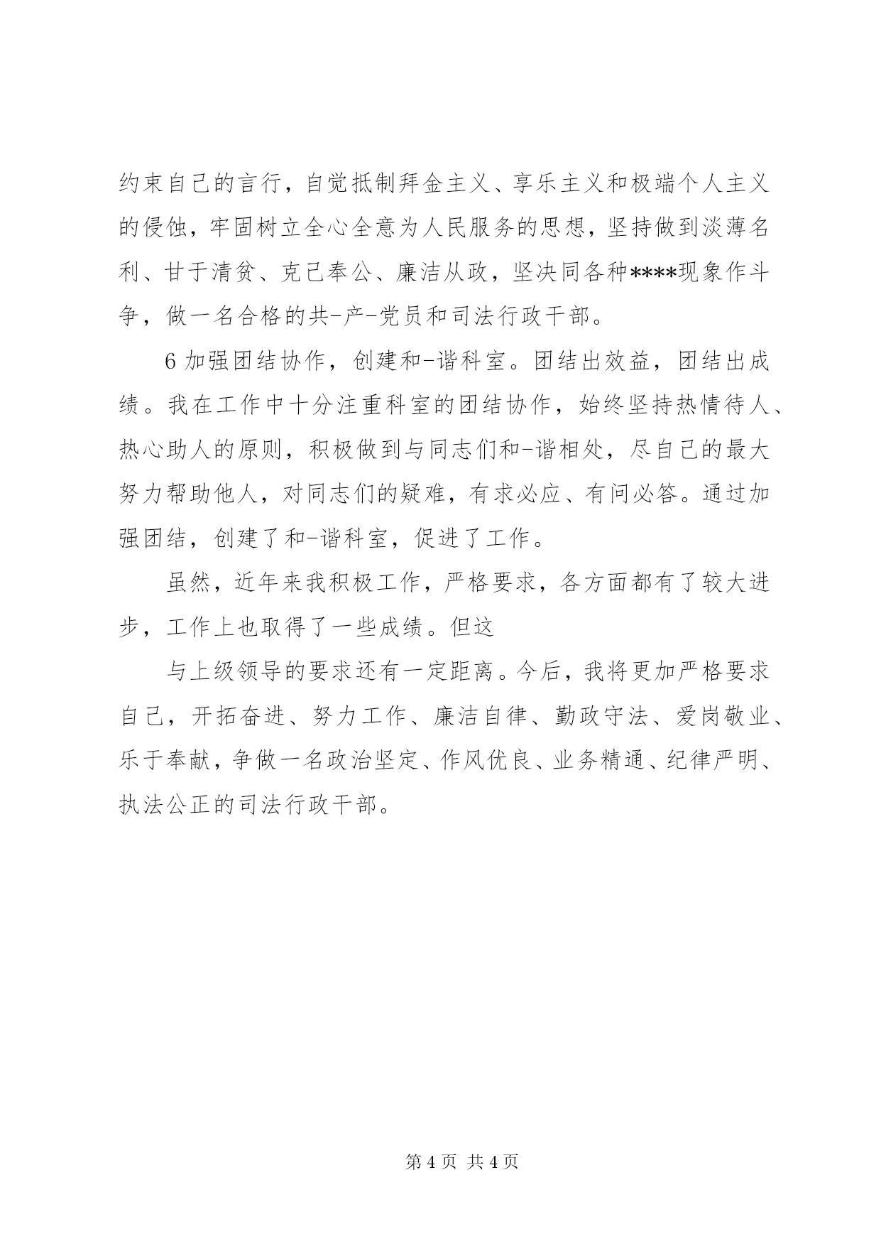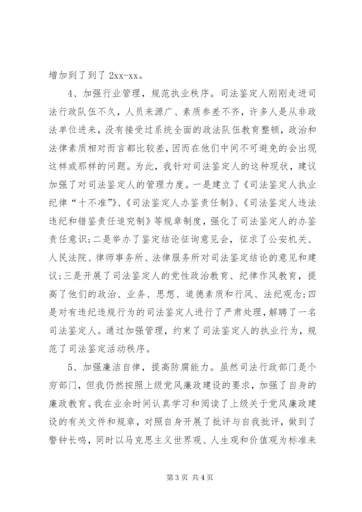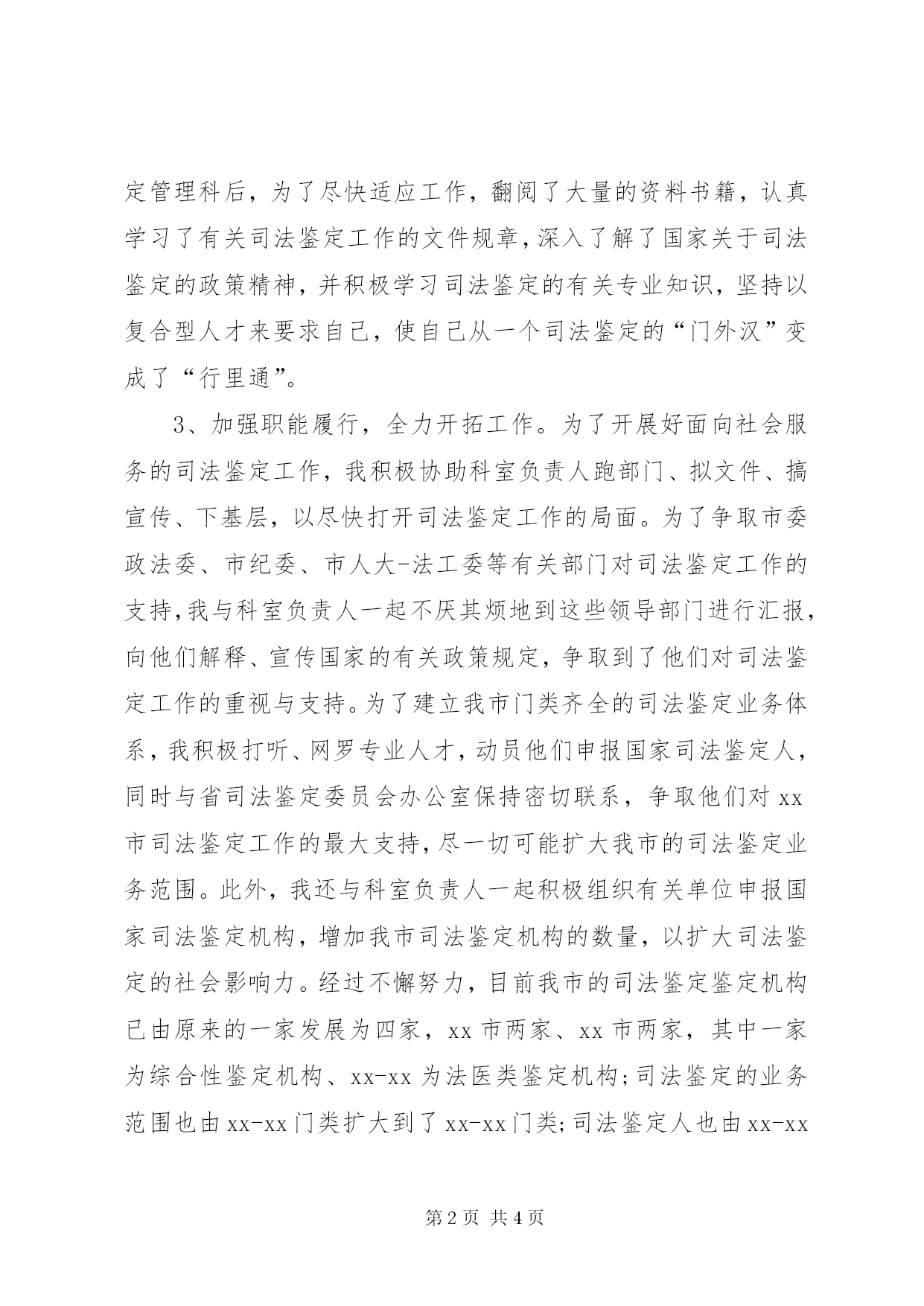 第PAGE\*Arabic\*MERGEFORMAT4页共NUMPAGES\*MERGEFORMAT4页司法鉴定个人总结近年来,我在各级领导的关心和指导下,坚持以马列主义、毛泽东思想、邓-小-平理论和“三个代表”重要思想为指导,深入贯彻落实党的路线、方针、政策,以全面建设小康社会、建设社会主义和-谐社会和维护社会主义法制为己任,树立科学的发展观、健康的人生观、正确的价值观,力求做到与时俱进、求实创新、开拓奋进,为司法行政工作作出自己应有的职责。具体来说,主要做到了以下几个方面:1、加强理论学习,提高政治素养。近年来,我按照上级的安排部署,积极参加了“三个代表”重要思想学习教育、党员先进性教育、社会主义荣辱观教育、社会主义法治理念教育等学习教育活动。在学习中,我认真阅读理论著作,细心做好学习笔记,深入体会上级精神要求。一年多来,共记学习笔记xx-xx余字,撰写学习心得和体会4篇,同时还参加了全市政法系统举行的社会主义法治理念知识竞赛并获得了三等奖。通过理论学习,进一步提高了自身的政治素质,增强了大局观念和政治责任感、政治敏锐感,坚定了正确的政治方向和政治立场,树立了公平正义、服务大局、执法为民的社会主义法治理念。2、加强业务学习,提升业务水平。2004年10月,我调到司法鉴定管理科工作。管理面向社会服务的司法鉴定工作是司法局一项新的管理职能,没有现成的经验可以借鉴。我来到司法鉴定管理科后,为了尽快适应工作,翻阅了大量的资料书籍,认真学习了有关司法鉴定工作的文件规章,深入了解了国家关于司法鉴定的政策精神,并积极学习司法鉴定的有关专业知识,坚持以复合型人才来要求自己,使自己从一个司法鉴定的“门外汉”变成了“行里通”。3、加强职能履行,全力开拓工作。为了开展好面向社会服务的司法鉴定工作,我积极协助科室负责人跑部门、拟文件、搞宣传、下基层,以尽快打开司法鉴定工作的局面。为了争取市委政法委、市纪委、市人大-法工委等有关部门对司法鉴定工作的支持,我与科室负责人一起不厌其烦地到这些领导部门进行汇报,向他们解释、宣传国家的有关政策规定,争取到了他们对司法鉴定工作的重视与支持。为了建立我市门类齐全的司法鉴定业务体系,我积极打听、网罗专业人才,动员他们申报国家司法鉴定人,同时与省司法鉴定委员会办公室保持密切联系,争取他们对xx市司法鉴定工作的最大支持,尽一切可能扩大我市的司法鉴定业务范围。此外,我还与科室负责人一起积极组织有关单位申报国家司法鉴定机构,增加我市司法鉴定机构的数量,以扩大司法鉴定的社会影响力。经过不懈努力,目前我市的司法鉴定鉴定机构已由原来的一家发展为四家,xx市两家、xx市两家,其中一家为综合性鉴定机构、xx-xx为法医类鉴定机构;司法鉴定的业务范围也由xx-xx门类扩大到了xx-xx门类;司法鉴定人也由xx-xx增加到了到了2xx-xx。4、加强行业管理,规范执业秩序。司法鉴定人刚刚走进司法行政队伍不久,人员来源广、素质参差不齐,许多人是从非政法单位进来,没有接受过系统全面的政法队伍教育整顿,政治和法律素质相对而言都比较差,因而在他们中间不可避免的会出现这样或那样的问题。为此,我针对司法鉴定人的这种现状,建议加强了对司法鉴定人的管理力度。一是建立了《司法鉴定人执业纪律“十不准”》、《司法鉴定人办鉴责任制》、《司法鉴定人违法违纪和错鉴责任追究制》等规章制度,强化了司法鉴定人的办鉴责任意识;二是举办了鉴定结论征询意见会,征求了公安机关、人民法院、律师事务所、法律服务所对司法鉴定结论的意见和建议;三是开展了司法鉴定人的党性政治教育、纪律作风教育,提高了他们的政治、业务、思想、道德素质和行风、法纪观念;四是对有违纪违规行为的司法鉴定人进行了严肃处理,解聘了一名司法鉴定人。通过加强管理,约束了司法鉴定人的执业行为,规范了司法鉴定活动秩序。5、加强廉洁自律,提高防腐能力。虽然司法行政部门是个穷部门,但我仍然按照上级党风廉政建设的要求,加强了自身的廉政教育。我在业余时间认真学习和阅读了上级关于党风廉政建设的有关文件和规章,对照自身开展了批评与自我批评,做到了警钟长鸣,同时以马克思主义世界观、人生观和价值观为标准来约束自己的言行,自觉抵制拜金主义、享乐主义和极端个人主义的侵蚀,牢固树立全心全意为人民服务的思想,坚持做到淡薄名利、甘于清贫、克己奉公、廉洁从政,坚决同各种****现象作斗争,做一名合格的共-产-党员和司法行政干部。6加强团结协作,创建和-谐科室。团结出效益,团结出成绩。我在工作中十分注重科室的团结协作,始终坚持热情待人、热心助人的原则,积极做到与同志们和-谐相处,尽自己的最大努力帮助他人,对同志们的疑难,有求必应、有问必答。通过加强团结,创建了和-谐科室,促进了工作。虽然,近年来我积极工作,严格要求,各方面都