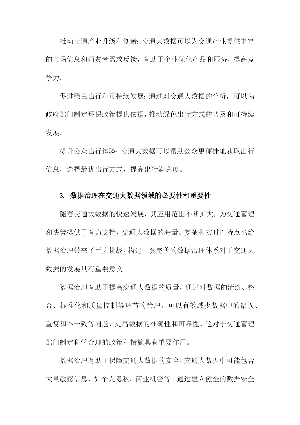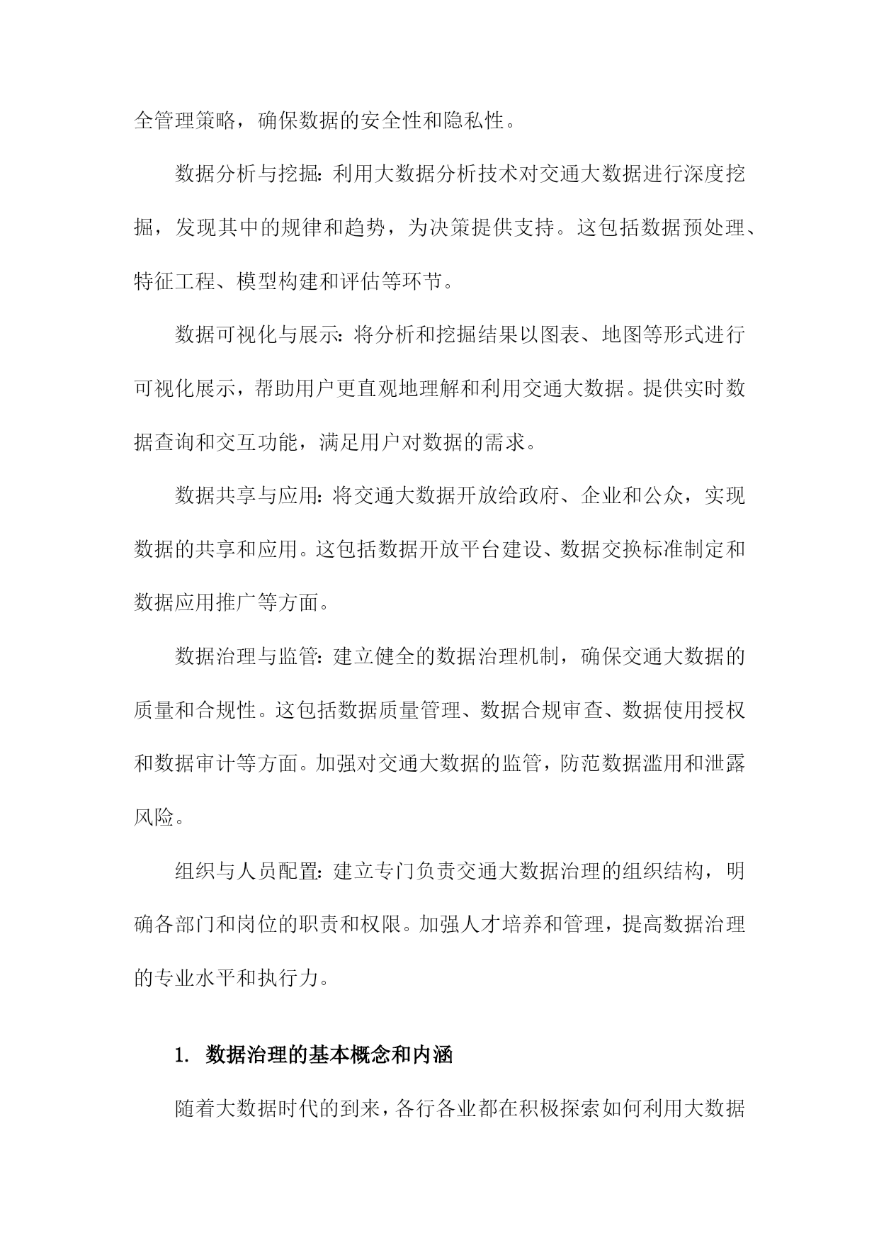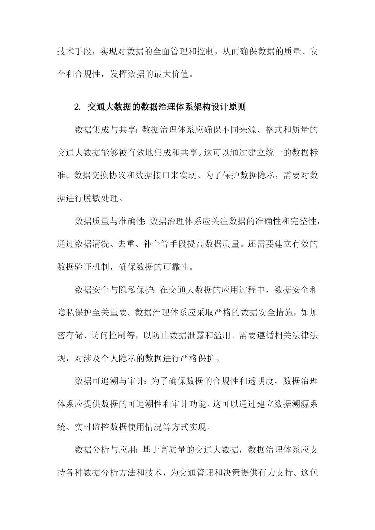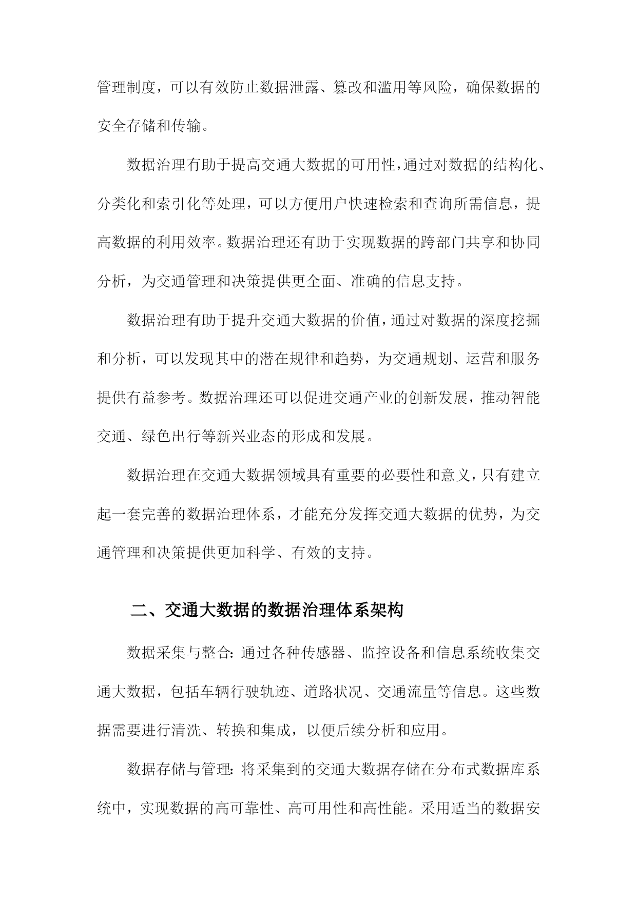 基于交通大数据的数据治理体系研究一、研究背景随着信息技术的飞速发展,大数据已经成为了当今社会的一个热门话题。在交通领域,大数据的应用也日益广泛,为交通管理、运输优化、安全保障等方面提供了有力支持。如何对这些海量的交通数据进行有效的管理和利用,成为了亟待解决的问题。交通大数据包括了车辆行驶记录、道路信息、交通信号灯状态、交通事故记录等多种数据类型,这些数据的采集、存储和处理都需要一个统一的数据治理体系来进行支撑。数据治理体系是指通过制定合理的数据管理策略和技术手段,对交通大数据进行有效监控、分析和应用,以提高交通管理的效率和质量。国内外关于交通大数据的研究已经取得了一定的成果,但仍然存在一些问题和挑战。交通大数据的采集和传输面临着技术难题,如数据安全、隐私保护等。交通大数据的存储和处理需要大量的计算资源,如何实现高性能、低成本的数据处理成为了一个关键问题。交通大数据的应用场景繁多,如何将这些数据有效地整合和挖掘,为交通管理提供有价值的信息和服务也是一个重要课题。1.交通大数据的定义和特点数据量大:随着交通运输系统的不断发展和完善,所产生的数据量呈现出爆炸式增长的趋势。这些数据涵盖了道路交通、公共交通、航空、铁路等多种交通运输方式,包括车辆行驶轨迹、客运流量、货运量、航班准点率等多个方面。数据类型多样:交通大数据包括结构化数据、半结构化数据和非结构化数据。结构化数据主要包括数据库中的表格数据;半结构化数据主要包括XML、JSON等格式的数据;非结构化数据主要包括文本、图片、音频和视频等多种形式的数据。数据来源广泛:交通大数据来源于多个层面,包括政府监管部门、交通运输企业、互联网企业和个人用户等。这些数据既包括公开发布的信息,也包括私密性较强的内部数据。数据价值高:交通大数据具有很高的实用价值和商业价值。通过对交通大数据的分析,可以为政府决策提供科学依据,为企业优化运营管理提供支持,为公众提供便捷的出行服务。数据质量参差不齐:由于交通大数据的来源多样,数据质量存在很大的差异。在实际应用中,需要对数据进行清洗、整合和标准化处理,以提高数据的准确性和可用性。2.交通大数据的应用现状和发展趋势智能交通系统(ITS):通过对交通数据的实时采集、分析和处理,实现对交通流量、道路状况、车辆位置等信息的精确预测和实时调度,从而提高道路通行能力,缓解交通拥堵。公共交通优化:通过对公共交通客流数据、线路数据等进行分析,为公共交通企业提供运营决策支持,优化线路规划、班次安排、运力配置等,提高公共交通服务质量和效率。交通安全管理:通过对交通事故数据、驾驶行为数据等进行分析,为交通安全管理部门提供预警信息,制定针对性的交通安全政策和措施,降低交通事故发生率。停车管理与服务:通过对停车数据、用户行为数据等进行分析,为停车管理者提供精准的停车需求预测和管理建议,提高停车位利用率,降低停车成本。出行服务:通过对用户出行数据进行分析,为用户提供个性化的出行建议和服务,如最佳出行路线规划、共享出行模式推荐等。尽管交通大数据的应用已经取得了一定的成果,但仍然面临着一些挑战,如数据质量不高、数据安全问题突出、数据整合难度大等。随着技术的不断进步和应用场景的拓展,交通大数据将在以下几个方面发挥更大的作用:实现交通管理的精细化和智能化:通过深度挖掘交通大数据,实现对交通运行状态的实时监控和预测,为交通管理决策提供科学依据。推动交通产业升级和创新:交通大数据可以为交通产业提供丰富的市场信息和消费者需求反馈,有助于企业优化产品和服务,提高竞争力。促进绿色出行和可持续发展:通过对交通大数据的分析,可以为政府部门制定环保政策提供依据,推动绿色出行方式的普及和可持续发展。提升公众出行体验:交通大数据可以帮助公众更便捷地获取出行信息,选择最优出行方式,提高出行满意度。3.数据治理在交通大数据领域的必要性和重要性随着交通大数据的快速发展,其应用范围不断扩大,为交通管理和决策提供了有力支持。交通大数据的海量、复杂和实时性特点也给数据治理带来了巨大挑战。构建一套完善的数据治理体系对于交通大数据的发展具有重要意义。数据治理有助于提高交通大数据的质量,通过对数据的清洗、整合、标准化和质量控制等环节的管理,可以有效减少数据中的错误、重复和不一致等问题,提高数据的准确性和可靠性。这对于交通管理部门制定科学合理的政策和措施具有重要作用。数据治理有助于保障交通大数据的安全,交通大数据中可能包含大量敏感信息,如个人隐私、商业机密等。通过建立健全的数据安全管理制度,可以有效防止数据泄露、篡改和滥用等风险,确保数据的安全存储和传输。数据治理有助于提高交通大数据的可用性,通过对数据的结构化、分类化和索引化等处理,可以方便用户快速检索和查询所需信息,提高数据的利