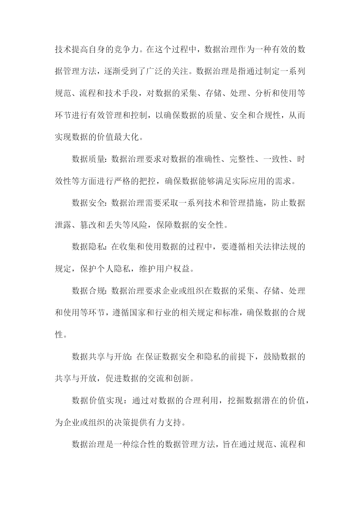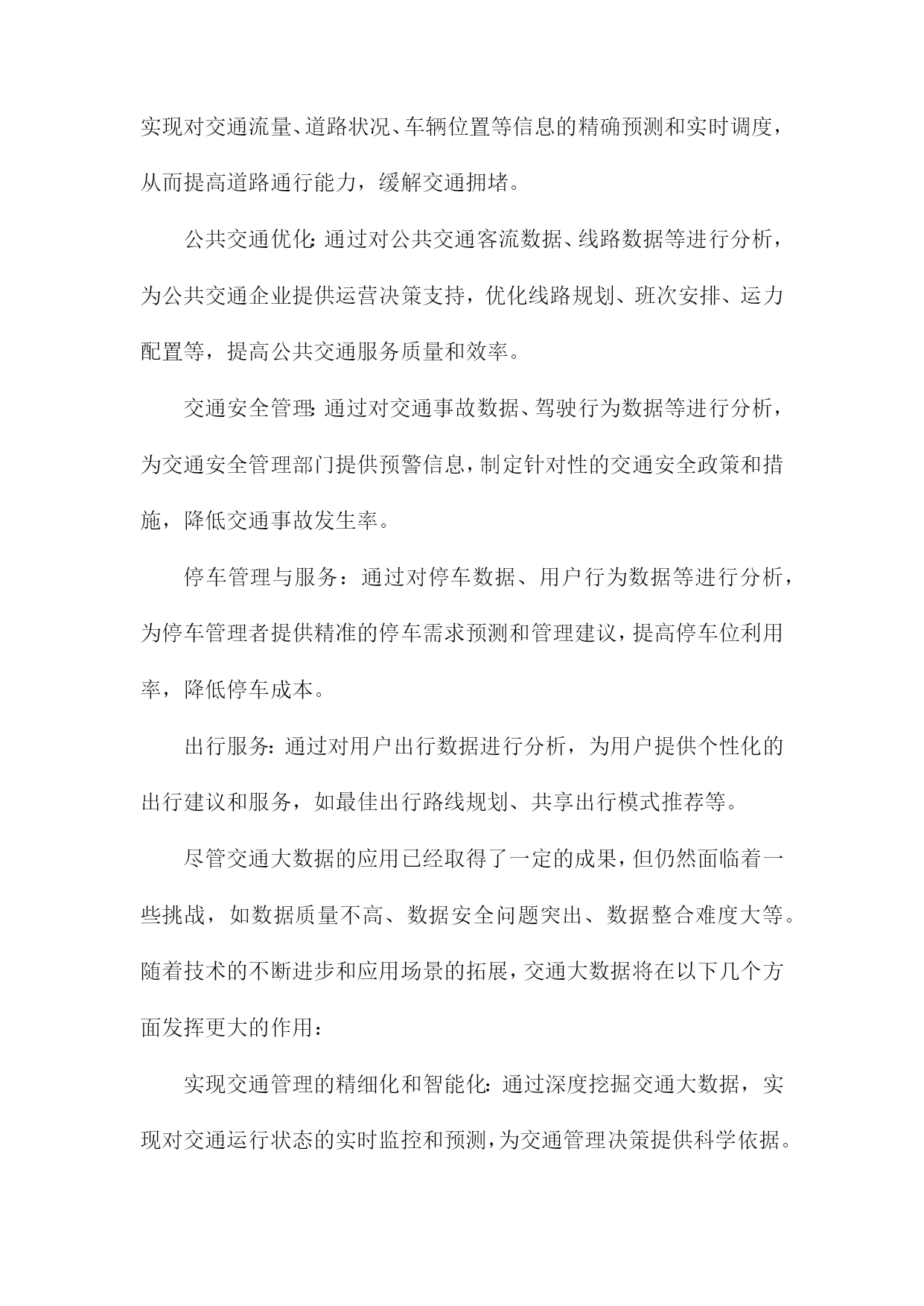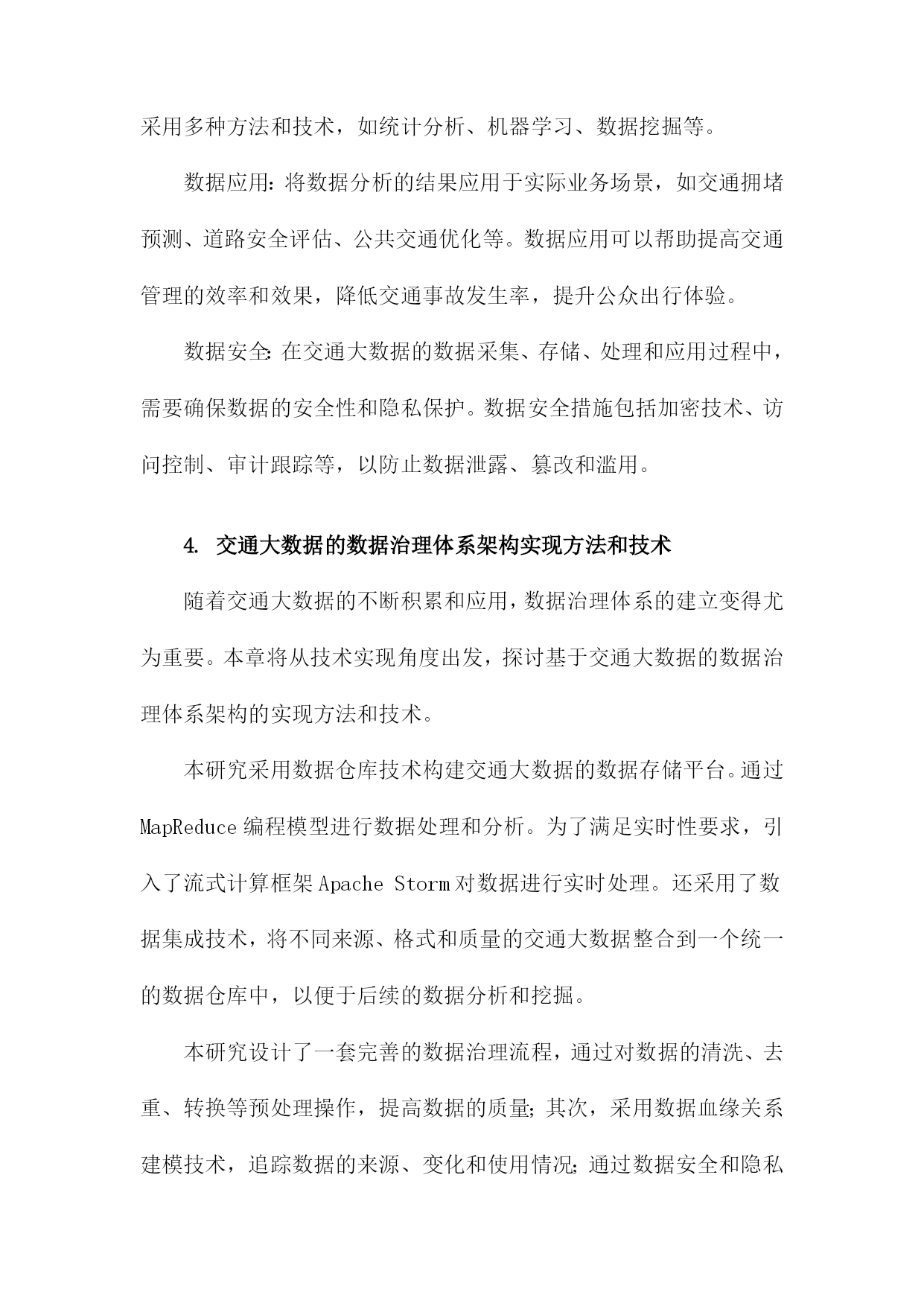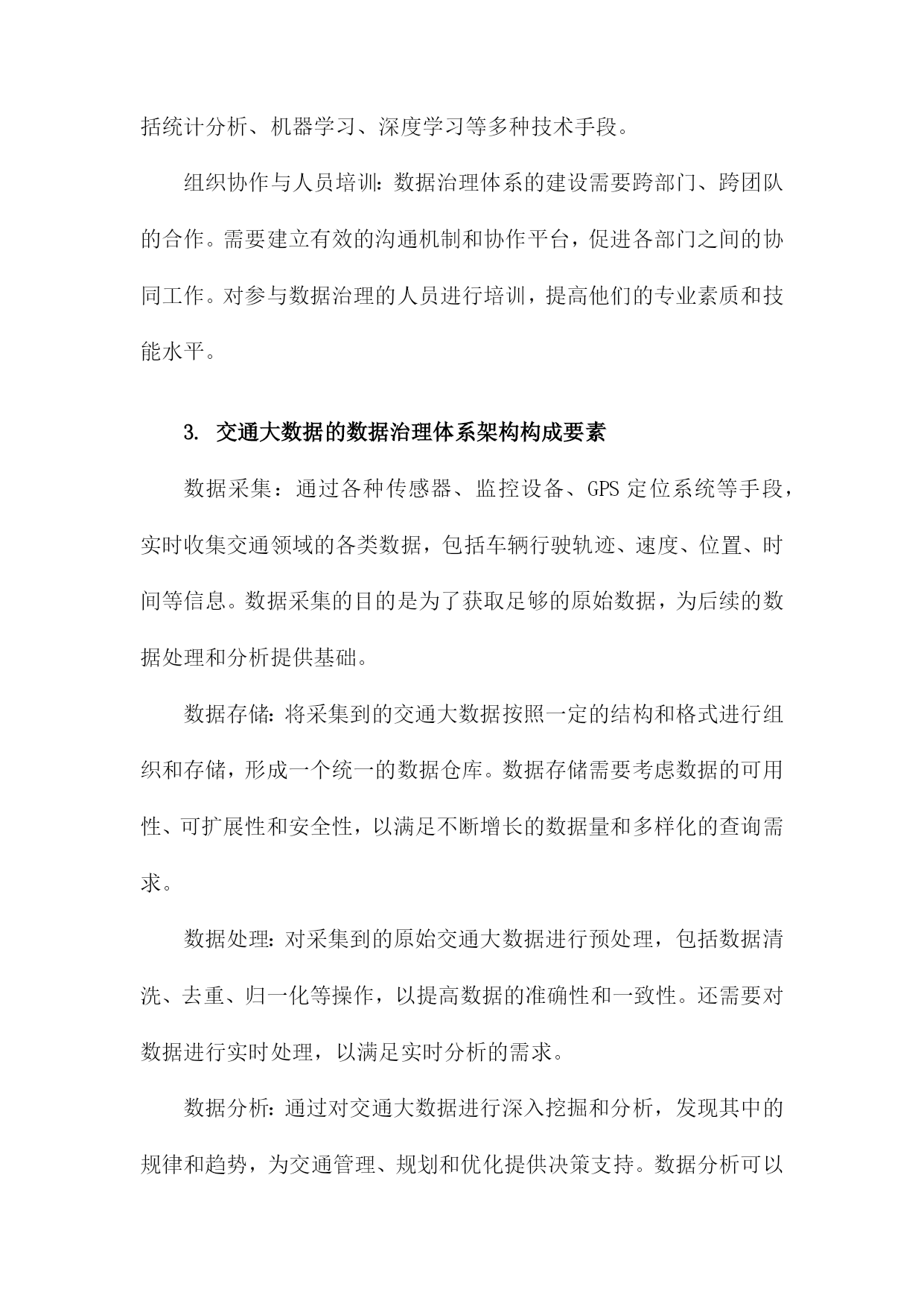 基于交通大数据的数据治理体系研究一、研究背景随着信息技术的飞速发展,大数据已经成为了当今社会的一个热门话题。在交通领域,大数据的应用也日益广泛,为交通管理、运输优化、安全保障等方面提供了有力支持。如何对这些海量的交通数据进行有效的管理和利用,成为了亟待解决的问题。交通大数据包括了车辆行驶记录、道路信息、交通信号灯状态、交通事故记录等多种数据类型,这些数据的采集、存储和处理都需要一个统一的数据治理体系来进行支撑。数据治理体系是指通过制定合理的数据管理策略和技术手段,对交通大数据进行有效监控、分析和应用,以提高交通管理的效率和质量。国内外关于交通大数据的研究已经取得了一定的成果,但仍然存在一些问题和挑战。交通大数据的采集和传输面临着技术难题,如数据安全、隐私保护等。交通大数据的存储和处理需要大量的计算资源,如何实现高性能、低成本的数据处理成为了一个关键问题。交通大数据的应用场景繁多,如何将这些数据有效地整合和挖掘,为交通管理提供有价值的信息和服务也是一个重要课题。1.交通大数据的定义和特点数据量大:随着交通运输系统的不断发展和完善,所产生的数据量呈现出爆炸式增长的趋势。这些数据涵盖了道路交通、公共交通、航空、铁路等多种交通运输方式,包括车辆行驶轨迹、客运流量、货运量、航班准点率等多个方面。数据类型多样:交通大数据包括结构化数据、半结构化数据和非结构化数据。结构化数据主要包括数据库中的表格数据;半结构化数据主要包括XML、JSON等格式的数据;非结构化数据主要包括文本、图片、音频和视频等多种形式的数据。数据来源广泛:交通大数据来源于多个层面,包括政府监管部门、交通运输企业、互联网企业和个人用户等。这些数据既包括公开发布的信息,也包括私密性较强的内部数据。数据价值高:交通大数据具有很高的实用价值和商业价值。通过对交通大数据的分析,可以为政府决策提供科学依据,为企业优化运营管理提供支持,为公众提供便捷的出行服务。数据质量参差不齐:由于交通大数据的来源多样,数据质量存在很大的差异。在实际应用中,需要对数据进行清洗、整合和标准化处理,以提高数据的准确性和可用性。2.交通大数据的应用现状和发展趋势智能交通系统(ITS):通过对交通数据的实时采集、分析和处理,实现对交通流量、道路状况、车辆位置等信息的精确预测和实时调度,从而提高道路通行能力,缓解交通拥堵。公共交通优化:通过对公共交通客流数据、线路数据等进行分析,为公共交通企业提供运营决策支持,优化线路规划、班次安排、运力配置等,提高公共交通服务质量和效率。交通安全管理:通过对交通事故数据、驾驶行为数据等进行分析,为交通安全管理部门提供预警信息,制定针对性的交通安全政策和措施,降低交通事故发生率。停车管理与服务:通过对停车数据、用户行为数据等进行分析,为停车管理者提供精准的停车需求预测和管理建议,提高停车位利用率,降低停车成本。出行服务:通过对用户出行数据进行分析,为用户提供个性化的出行建议和服务,如最佳出行路线规划、共享出行模式推荐等。尽管交通大数据的应用已经取得了一定的成果,但仍然面临着一些挑战,如数据质量不高、数据安全问题突出、数据整合难度大等。随着技术的不断进步和应用场景的拓展,交通大数据将在以下几个方面发挥更大的作用:实现交通管理的精细化和智能化:通过深度挖掘交通大数据,实现对交通运行状态的实时监控和预测,为交通管理决策提供科学依据。推动交通产业升级和创新:交通大数据可以为交通产业提供丰富的市场信息和消费者需求反馈,有助于企业优化产品和服务,提高竞争力。促进绿色出行和可持续发展:通过对交通大数据的分析,可以为政府部门制定环保政策提供依据,推动绿色出行方式的普及和可持续发展。提升公众出行体验:交通大数据可以帮助公众更便捷地获取出行信息,选择最优出行方式,提高出行满意度。3.数据治理在交通大数据领域的必要性和重要性随着交通大数据的快速发展,其应用范围不断扩大,为交通管理和决策提供了有力支持。交通大数据的海量、复杂和实时性特点也给数据治理带来了巨大挑战。构建一套完善的数据治理体系对于交通大数据的发展具有重要意义。数据治理有助于提高交通大数据的质量,通过对数据的清洗、整合、标准化和质量控制等环节的管理,可以有效减少数据中的错误、重复和不一致等问题,提高数据的准确性和可靠性。这对于交通管理部门制定科学合理的政策和措施具有重要作用。数据治理有助于保障交通大数据的安全,交通大数据中可能包含大量敏感信息,如个人隐私、商业机密等。通过建立健全的数据安全管理制度,可以有效防止数据泄露、篡改和滥用等风险,确保数据的安全存储和传输。数据治理有助于提高交通大数据的可用性,通过对数据的结构化、分类化和索引化等处理,可以方便用户快速检索和查询所需信息,提高数据的利