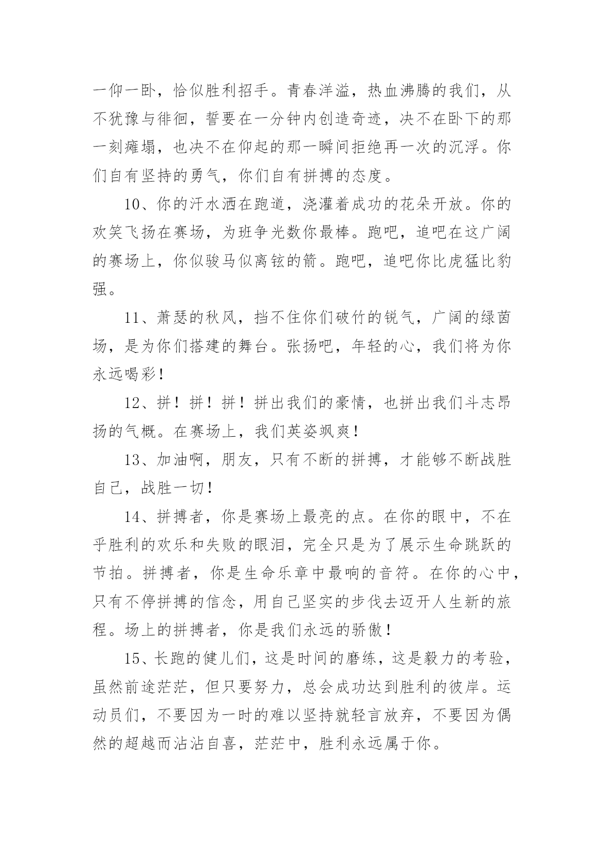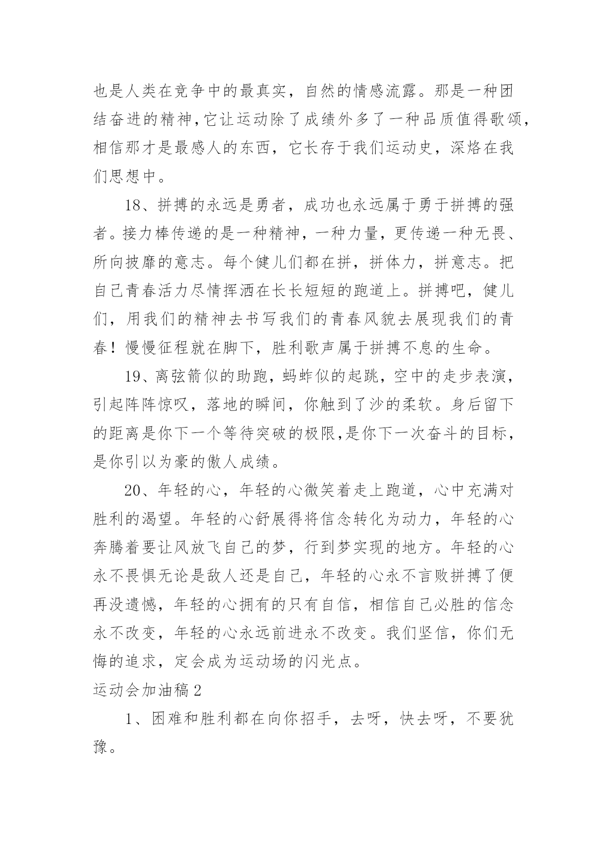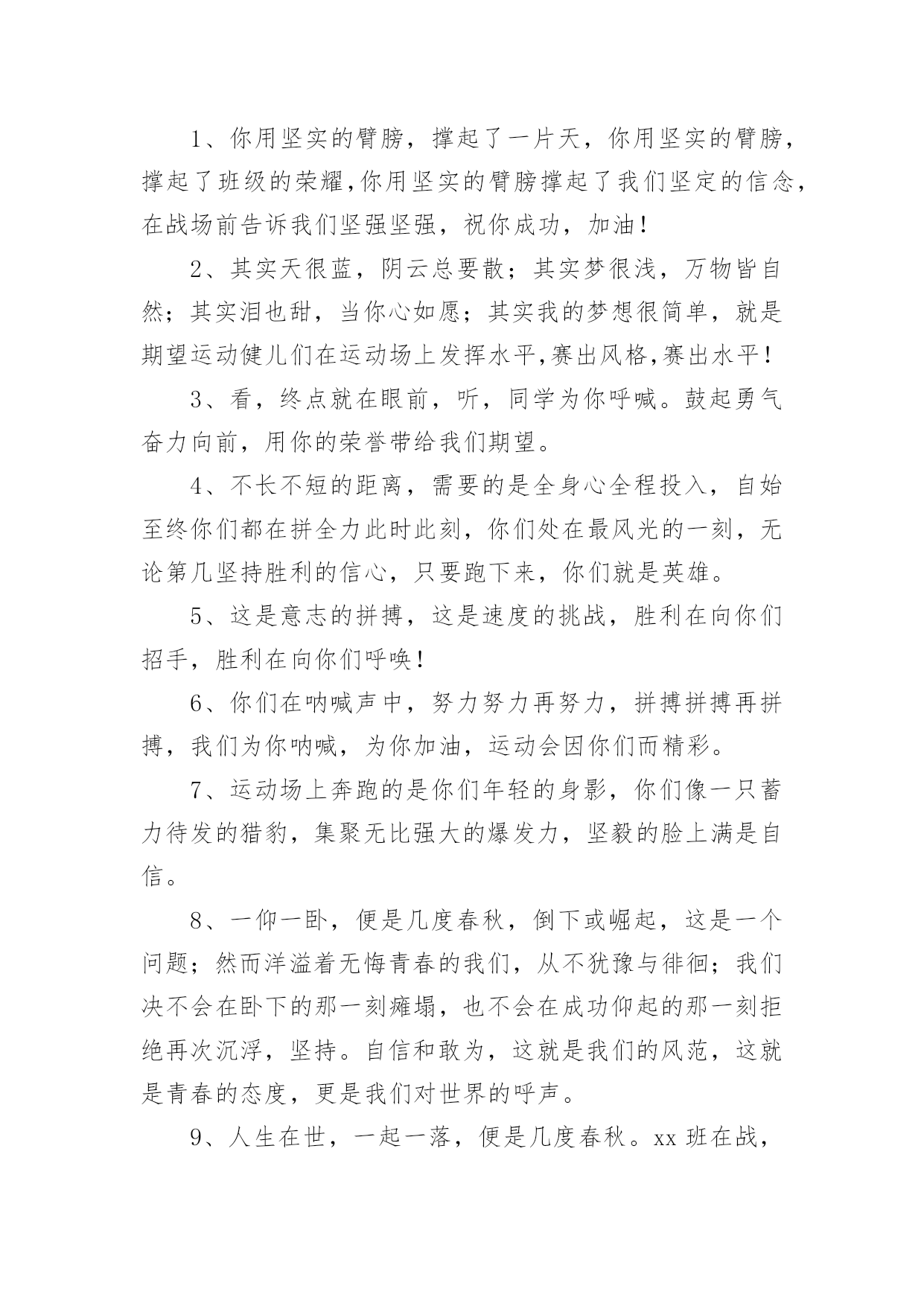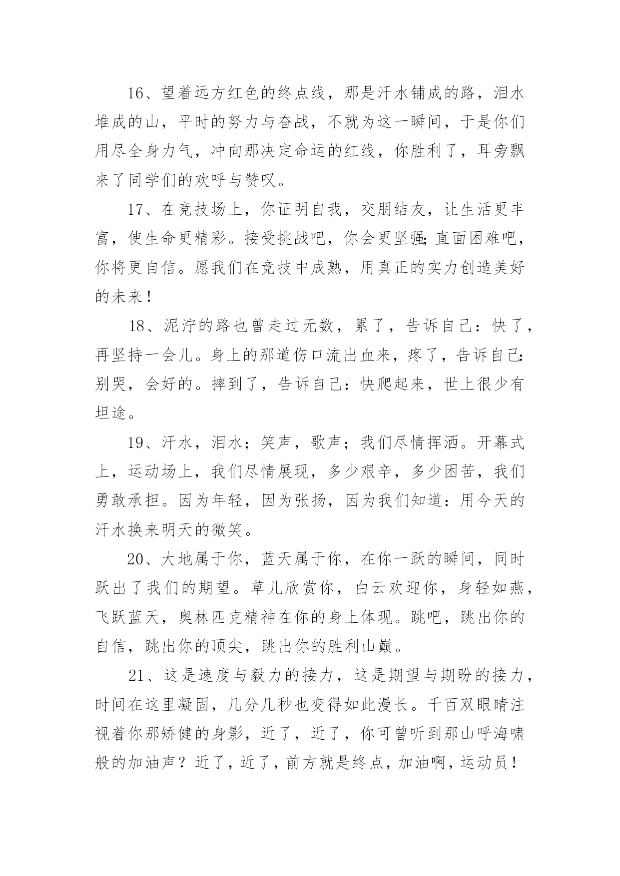 运动会加油稿(精选)运动会加油稿在社会发展不断提速的今天,需要使用加油稿的场合越来越多,借助加油稿可以表达对对方的鼓励和支持。为了让您在写加油稿时更加简单方便,下面是小编整理的运动会加油稿,欢迎大家分享。运动会加油稿11、人生如赛场,路途似跑道。在这秋高气爽的季节里,在这远离城市喧嚣的战地,所有的激情,都在那一阵阵呐喊声中凝结,所有的希望在呐喊声放飞了,所有的力量也在呐喊声中凝结了。就在激昂的喊声中,运动员们接受了一次的挑战,一次次超越了自我。他们以自己的行动,充分展现了自己的实力,展现了真我的风采,展现了自己的坚强拼搏的精神。我们期待运动员们成功的喜悦,我们也随时准备送上失败的鼓励。加油吧,健儿们!让你们的成功与我们喜悦凝结在那一秒钟凝结,变成永恒!2、无论乌云有几分阴沉,他给大地是一种感慨;无论荆棘有几多稠密,它给目光是一片风景;无论生活有几多泥潭,它给生命是一种考验!一根竹笋,如果从头到饱满沧桑,也许能成为一首凯歌;一株小草,如果能承受寒霜考验,也许能长成一片绿洲。朋友们,不要坚持不放弃,你就是这场战斗中的胜者!但无论成功或是失败,无论欢笑或是泪水,我们永远铭记,这充满奋斗的日子。3、诺大的竞技场期待着你矫健的身影,瑟瑟的秋风为你送来爽朗的气息。朋友,在你踏上跑道的那一刻,告诉自己----将信心进行到底,无论成功与否,请微笑着跑完全程,只要年轻的心还在蓬勃的跳动,就要大声告诉自己----将信心进行到底。4、不为掌声的诠释,不为刻意的征服,只有辛勤的汗水化作追求的脚步。心中坚定的信念,脚下沉稳的步伐,你用行动诉说着一个不变的真理。没有比脚更长的路,没有比人更高的山,希望在终点向你招手。努力吧!用你坚韧不拔的意志,去迎接终点的掌声,相信成功属于你。5、一个盼望出发,一个盼望到达。烈日骄阳下的奔驰,蓝天白云下的拼搏,总想为你高声呐喊,却怕被天空误解。总想为你放声歌唱,却又怕惊动了白云。把内心最美的祝愿挂在跑道线上,微风中每一次振动是又一次的衷心祝愿。加油吧!6、一秒钟的差异,一厘米的距离,在赛场上这些最细小的差距却决定了一个运动员奋力拼搏的成果。试想,没有严格的执法,如何会有秩序尽然的赛场;试想,没有精准的测量,如何会有一次次的突破和超越;试想,没有公平的裁决,如何会有令人信服的结果。运动员的精彩背后是你们专业的付出,每次欢呼与尖叫背后都有你们以职业道德做出的保证——你们是成绩和光荣的授予者,你们是公平和公正的诠释者,你们是运动精神的捍卫者。让我们在为胜利欢呼的同时,也为你们送上最真挚的感谢。7、人类的力量在那一刹那展现,拼搏在那一瞬间化为生命的起点,在那一须臾万物化为虚有。在一圈又一圈的轮回之后,胜利看似并不再不遥远,抬起头望望前面,终点线已依稀可见。可只有你知道,这个将在今日兑现的承诺耗费了多少个日日夜夜的辛劳。洒一把艰辛的汗水,继续抬起疲倦的脚步,爆发的一吼气贯长虹,继续向前,冲向心驰已久的胜利。请知道,不论成功与否,在终点震惊四周的欢呼,为你的勇气而起,为你的坚持而起,为了你不曾放弃的梦想而起。8、—滴滴汗水,飘洒在绿茵场上,伴随着矫健的步伐,奏出希望的乐章。一种种信念,放在蔚蓝的天空,伴随着你那深沉的眼光,画出美丽的弧线。人生能有几回搏?恰同学少年,风华正茂;书生意气,挥斥方遒。千百双眼睛注视着你,为了希望、为了胜利,跑出青春的梦想。9、你是运动场的心脏,跳动梦想;你是漫长路的精神,激励辉煌;你们是将上下求索的人!风为你加油,云为你助兴,坚定,执着,耐力与希望,在延伸的白色跑道中点点凝聚!力量,信念,拼搏与奋斗,在遥远的终点线上渐渐明亮!时代的强音正在你的脚下踏响。漫漫长路,你愿一人独撑,忍受着孤独与寂寞,承受着体力与精神的压迫,只任汗水溶于泪水,可脚步却从不停歇。也许桂冠最后不适于你,可坚持的你,定会赢得最后的掌声。11、站在投掷区里的你,手里紧握那沉重的铅球。它凝集了你的希望,沉重如同你的理想。当你汇集全身的力量,推出的一刻,你推出的是激荡在心里理想,推出的是在脑海里盘桓已久希望。铅球在空中闪亮,理想在空中发光,希望之光在心中照亮人生的.骄傲。12、站在平地上冲向蓝天,是人类一直的向往。跨出的脚踩在云层,飞跃的心儿在沸腾,轻捷如燕,威猛如鹰,欢乐扬起了臂膀,沉浸在反复轮回的场面中。跃起的,不仅是身体的高度,更是梦想的高度。一跃而过的瞬间,汗水淌过的过去,泪水泡过昨天,同心中的喜悦一起在太阳下发出璀璨的光芒。你知道,越过今天的高度,是为了下一次更高的目标,为了更激烈的挑战。勇士们,张开双臂,去超越自己的极限吧,我们在成功的变等待着为你的辉煌而欢呼!13、一根细细的杆子横放在半空中,它细,然而却像你生命中的坎,不可怕,不要怕,只要你有决心,只要你有信心,这又算得了什么?在步伐优美的助跑后,一跃,身体在空中划出一道