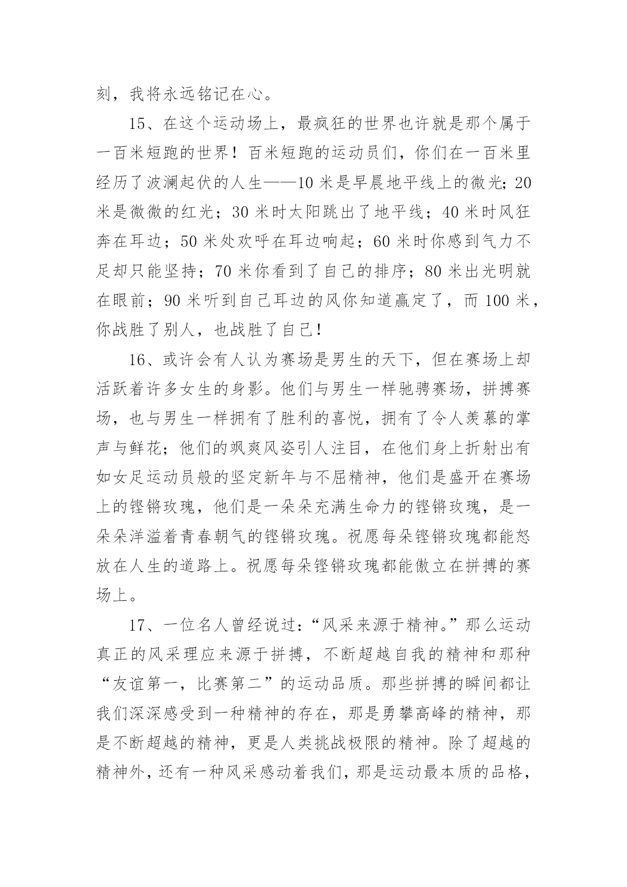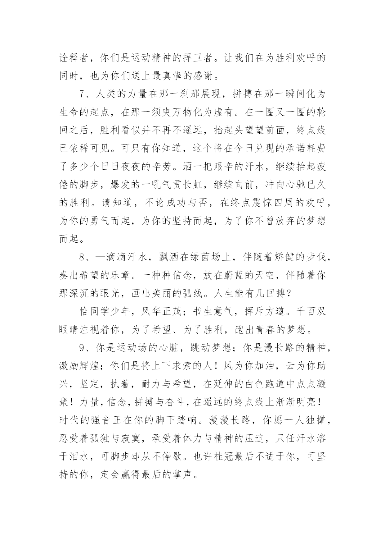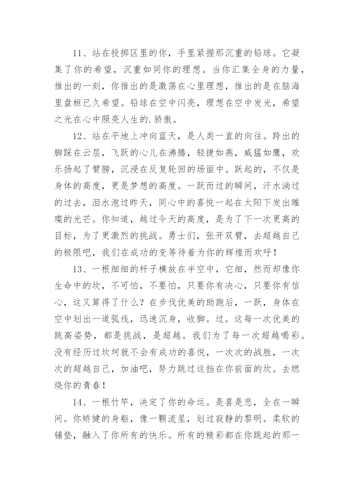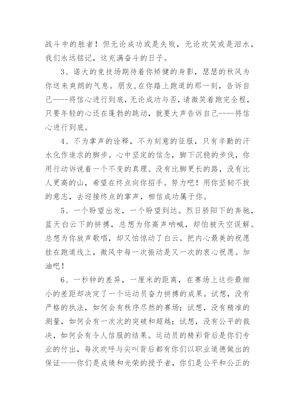 运动会加油稿(精选)运动会加油稿在社会发展不断提速的今天,需要使用加油稿的场合越来越多,借助加油稿可以表达对对方的鼓励和支持。为了让您在写加油稿时更加简单方便,下面是小编整理的运动会加油稿,欢迎大家分享。运动会加油稿11、人生如赛场,路途似跑道。在这秋高气爽的季节里,在这远离城市喧嚣的战地,所有的激情,都在那一阵阵呐喊声中凝结,所有的希望在呐喊声放飞了,所有的力量也在呐喊声中凝结了。就在激昂的喊声中,运动员们接受了一次的挑战,一次次超越了自我。他们以自己的行动,充分展现了自己的实力,展现了真我的风采,展现了自己的坚强拼搏的精神。我们期待运动员们成功的喜悦,我们也随时准备送上失败的鼓励。加油吧,健儿们!让你们的成功与我们喜悦凝结在那一秒钟凝结,变成永恒!2、无论乌云有几分阴沉,他给大地是一种感慨;无论荆棘有几多稠密,它给目光是一片风景;无论生活有几多泥潭,它给生命是一种考验!一根竹笋,如果从头到饱满沧桑,也许能成为一首凯歌;一株小草,如果能承受寒霜考验,也许能长成一片绿洲。朋友们,不要坚持不放弃,你就是这场战斗中的胜者!但无论成功或是失败,无论欢笑或是泪水,我们永远铭记,这充满奋斗的日子。3、诺大的竞技场期待着你矫健的身影,瑟瑟的秋风为你送来爽朗的气息。朋友,在你踏上跑道的那一刻,告诉自己----将信心进行到底,无论成功与否,请微笑着跑完全程,只要年轻的心还在蓬勃的跳动,就要大声告诉自己----将信心进行到底。4、不为掌声的诠释,不为刻意的征服,只有辛勤的汗水化作追求的脚步。心中坚定的信念,脚下沉稳的步伐,你用行动诉说着一个不变的真理。没有比脚更长的路,没有比人更高的山,希望在终点向你招手。努力吧!用你坚韧不拔的意志,去迎接终点的掌声,相信成功属于你。5、一个盼望出发,一个盼望到达。烈日骄阳下的奔驰,蓝天白云下的拼搏,总想为你高声呐喊,却怕被天空误解。总想为你放声歌唱,却又怕惊动了白云。把内心最美的祝愿挂在跑道线上,微风中每一次振动是又一次的衷心祝愿。加油吧!6、一秒钟的差异,一厘米的距离,在赛场上这些最细小的差距却决定了一个运动员奋力拼搏的成果。试想,没有严格的执法,如何会有秩序尽然的赛场;试想,没有精准的测量,如何会有一次次的突破和超越;试想,没有公平的裁决,如何会有令人信服的结果。运动员的精彩背后是你们专业的付出,每次欢呼与尖叫背后都有你们以职业道德做出的保证——你们是成绩和光荣的授予者,你们是公平和公正的诠释者,你们是运动精神的捍卫者。让我们在为胜利欢呼的同时,也为你们送上最真挚的感谢。7、人类的力量在那一刹那展现,拼搏在那一瞬间化为生命的起点,在那一须臾万物化为虚有。在一圈又一圈的轮回之后,胜利看似并不再不遥远,抬起头望望前面,终点线已依稀可见。可只有你知道,这个将在今日兑现的承诺耗费了多少个日日夜夜的辛劳。洒一把艰辛的汗水,继续抬起疲倦的脚步,爆发的一吼气贯长虹,继续向前,冲向心驰已久的胜利。请知道,不论成功与否,在终点震惊四周的欢呼,为你的勇气而起,为你的坚持而起,为了你不曾放弃的梦想而起。8、—滴滴汗水,飘洒在绿茵场上,伴随着矫健的步伐,奏出希望的乐章。一种种信念,放在蔚蓝的天空,伴随着你那深沉的眼光,画出美丽的弧线。人生能有几回搏?恰同学少年,风华正茂;书生意气,挥斥方遒。千百双眼睛注视着你,为了希望、为了胜利,跑出青春的梦想。9、你是运动场的心脏,跳动梦想;你是漫长路的精神,激励辉煌;你们是将上下求索的人!风为你加油,云为你助兴,坚定,执着,耐力与希望,在延伸的白色跑道中点点凝聚!力量,信念,拼搏与奋斗,在遥远的终点线上渐渐明亮!时代的强音正在你的脚下踏响。漫漫长路,你愿一人独撑,忍受着孤独与寂寞,承受着体力与精神的压迫,只任汗水溶于泪水,可脚步却从不停歇。也许桂冠最后不适于你,可坚持的你,定会赢得最后的掌声。11、站在投掷区里的你,手里紧握那沉重的铅球。它凝集了你的希望,沉重如同你的理想。当你汇集全身的力量,推出的一刻,你推出的是激荡在心里理想,推出的是在脑海里盘桓已久希望。铅球在空中闪亮,理想在空中发光,希望之光在心中照亮人生的.骄傲。12、站在平地上冲向蓝天,是人类一直的向往。跨出的脚踩在云层,飞跃的心儿在沸腾,轻捷如燕,威猛如鹰,欢乐扬起了臂膀,沉浸在反复轮回的场面中。跃起的,不仅是身体的高度,更是梦想的高度。一跃而过的瞬间,汗水淌过的过去,泪水泡过昨天,同心中的喜悦一起在太阳下发出璀璨的光芒。你知道,越过今天的高度,是为了下一次更高的目标,为了更激烈的挑战。勇士们,张开双臂,去超越自己的极限吧,我们在成功的变等待着为你的辉煌而欢呼!13、一根细细的杆子横放在半空中,它细,然而却像你生命中的坎,不可怕,不要怕,只要你有决心,只要你有信心,这又算得了什么?在步伐优美的助跑后,一跃,身体在空中划出一道