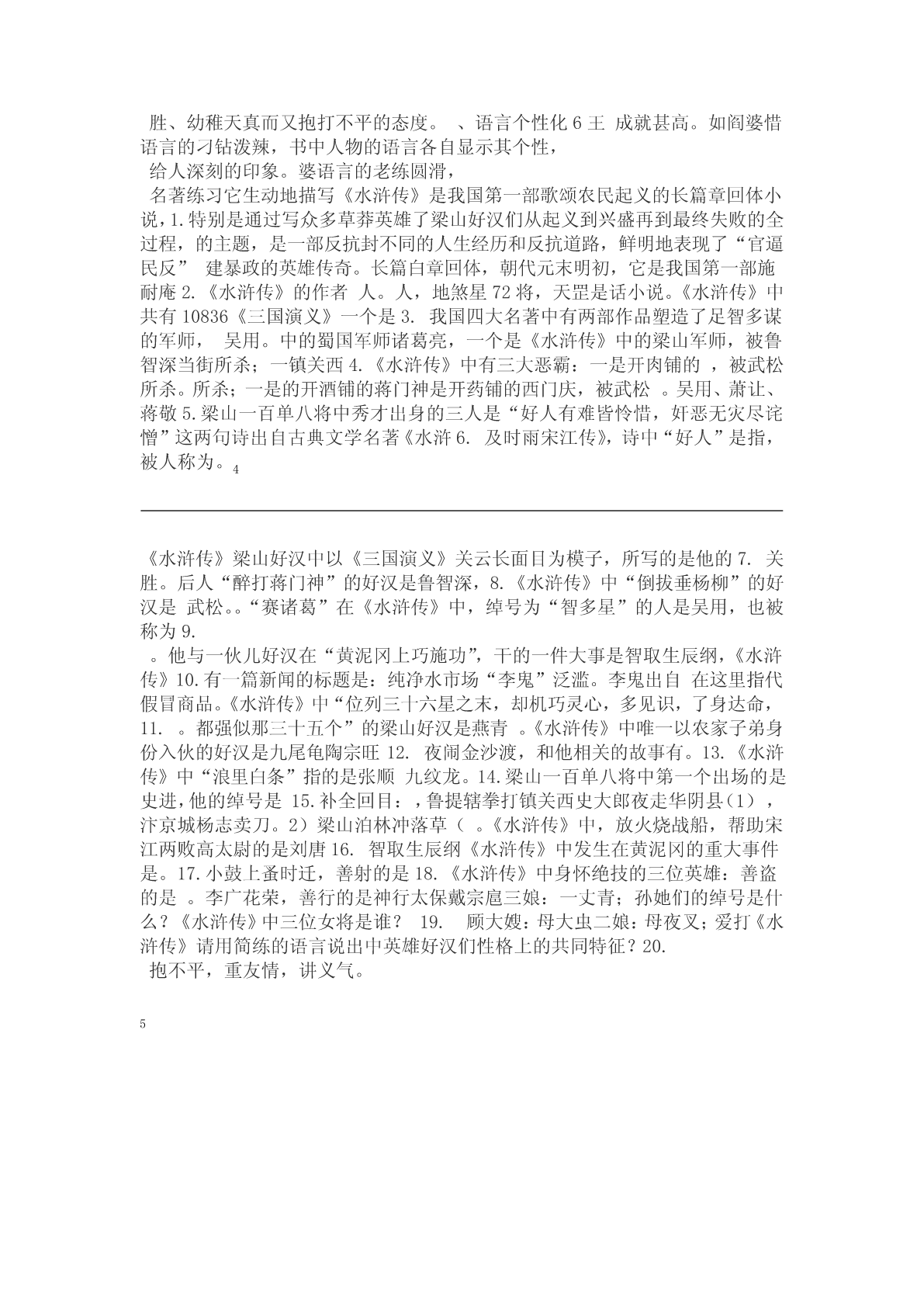 作者简介),原名彦端,字肇瑞,号子安,别号耐庵,元1370—约施耐庵(约1296岁入13末明初小说家。江苏兴化人,祖籍苏州,舟人之子,生于兴化新垛镇,岁之间官钱塘二载,40岁中进士。36岁至私塾,19岁中秀才,29岁中举人,36征聘不应;张士诚据苏,)六十岁,后与当道不合,复归苏州。至正十六年(1356岁迁兴化,7271岁或与张士诚部将卞元亨相友善,后流寓江阴,在祝塘镇教书。74岁。族迁白驹场、施家桥。朱元璋屡征不应;最后居淮安卒,终年创作背景人南宋时,梁山英雄故事流传甚广。当时的画家、文学家龚开的《宋江36人的故事已遍及大街小巷;画家也执笔为他们图形绘影。称:宋江等36赞并序》《水浒传》最早的蓝本是宋人的《宣和遗事》,它着力描写了杨志卖刀、晁盖等结伙劫生辰纲和宋江杀阎婆惜等事,对林冲、李逵、武松、鲁智深等主要人物也都作了描写。宋元之际,还有不少取材于水浒故事的话本。在元杂剧中,梁人。36人发展到108山英雄已由选择、故事加以汇集、话本和杂剧等“水浒”施耐庵把宋元以来史书、传说、加工、创作而写成《水浒传》。主要内容它生动地描写了《水浒传》是我国第一部歌颂农民起义的长篇章回体小说,特别是通过写众多草莽英雄不梁山好汉们从起义到兴盛再到最终失败的全过程,同的人生经历和反抗道路,鲜明地表现了“官逼民反”的主题,是一部反抗封建暴政的英雄传奇。人物形象原名鲁达,系渭州经略府提辖。拳打镇关西后逃至花和尚——鲁智深:1、五台山出家,取法名智深。相关故事:拳打镇关西、倒拔垂杨柳、大闹五台山、大闹野猪林……他嫉恶如仇、侠肝义胆、脾气火爆,有时粗中有细,豁达明理。原为东京八十万禁军教头,为奸臣高俅父子谋害,刺豹子头——林冲:2、风雪山神庙、相关故事:火烧草料场后,配沧州。由柴进荐上梁山。误入白虎堂、1雪夜上梁山……他武艺高强,有勇有谋,有一定的社会地位,一直安分守己,逆来顺受,忍无可忍才被逼上梁山,是上层人物被迫造反的典型。三代将门之后,五侯杨令公之孙,曾应过武举,做到、青面兽——杨志:3后上梁山入伙。生辰纲,投鲁智深二龙山落草,殿司制使官。因先后失陷花石纲、相关故事:杨志卖刀……他精明能干、粗暴蛮横。字学究,道号加亮先生,人称智多星,也被称为“赛、智多星——吴用:4诸葛”。相关故事:智取生辰纲、智赚玉麒麟、智取大名府、智取文安县……他足智多谋、神机妙算。字公明,排行第三,面黑身矮。在家大孝,人唤孝义及时雨——宋江:5、黑三郎,江湖上唤作山东及时雨。精通刀笔,纯熟吏道,曾任郓城县押司,后因杀死阎婆惜刺配江州,被晁盖等人救上梁山。相关故事:私放晁天王、怒杀阎婆惜、三打祝家庄……宋江是个非常复杂的人物,他胸怀大志;身在公门,清明练达,深通谋略;又仗义疏财,广结江湖好汉,有组织和指挥能力。但他忠孝思想根深蒂固,一心想被招安。清河县人,排行第二,江湖上人称武二郎。相关故事:行者——武松:6、除恶蜈蚣岭……大闹飞云浦、血溅鸳鸯楼、血刃潘金莲、斗杀西门庆、醉打蒋门神、他崇尚忠义、勇而有谋、有仇必复、有恩必报(不足:滥杀无辜),是下层英雄好汉中最富有血性和传奇色彩的人物。因打死人流亡他乡,在江州做小牢子。他使的武器是黑旋风——李逵:7、两把板斧。大闹江州后救出宋江、戴宗上梁山入伙。相关故事:沂岭杀四虎、元又有些头脑简单,侠肝义胆、脾气火爆,扯诏骂钦差……他嫉恶如仇、夜闹东京、直爽率真。张青之妻。在孟州道十字坡与张青开酒店卖人肉,母夜叉——孙二娘:8、专干杀人夺货的勾当。武松被发配到孟州路过十字坡,险些遭到孙二娘的毒手。武松假装喝醉酒捉住了孙二娘,张青求饶,武松遂与张青、孙二娘夫妇相识。孙二娘后来跟随张青上了梁山,主持梁山西山酒店,迎来送往,打探消息,是梁山第一百零三条好汉。随宋江征讨方腊时,孙二娘阵亡。2北京城里的员外大户,一身好武艺,棍棒天下无双。玉麒麟——卢俊义:9、乘船逃走时被不敌而逃,被梁山泊吴用用计骗到梁山,卢俊义与梁山英雄大战,浪里白条张顺活捉。卢俊义不愿在梁山落草为寇,乘机逃走。回到北京城,妻子贾氏却与管家李固做了夫妻。卢俊义同时亦被官兵捉拿,屈打成招,下了死牢。杀了奸救出卢俊义,宋江率梁山泊英雄攻打北京城,拼命三郎石秀独力劫法场,受招安后卢俊义被封为武功大坐上了第二把交椅。夫淫妇。卢俊义投奔梁山后,夫、庐州安抚使兼兵马副总管。后被高俅用药酒毒伤,不能骑马,乘船时失足落水而死。艺术特色、深刻反映广阔的社会生活1在前七十回表现了北宋末年以宋江为首的梁《水浒传》的作者是施耐庵,深刻反映广阔的社会生活。山泊农民起义的酝酿、形成和发展过程,以示乱自上放在故事的开端来写,小说把高俅发迹和徽宗宠信他的故事,也歌作,体现了官