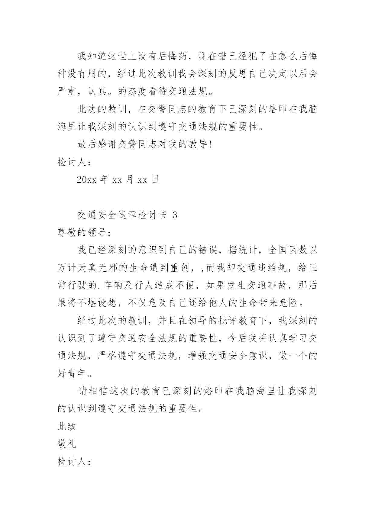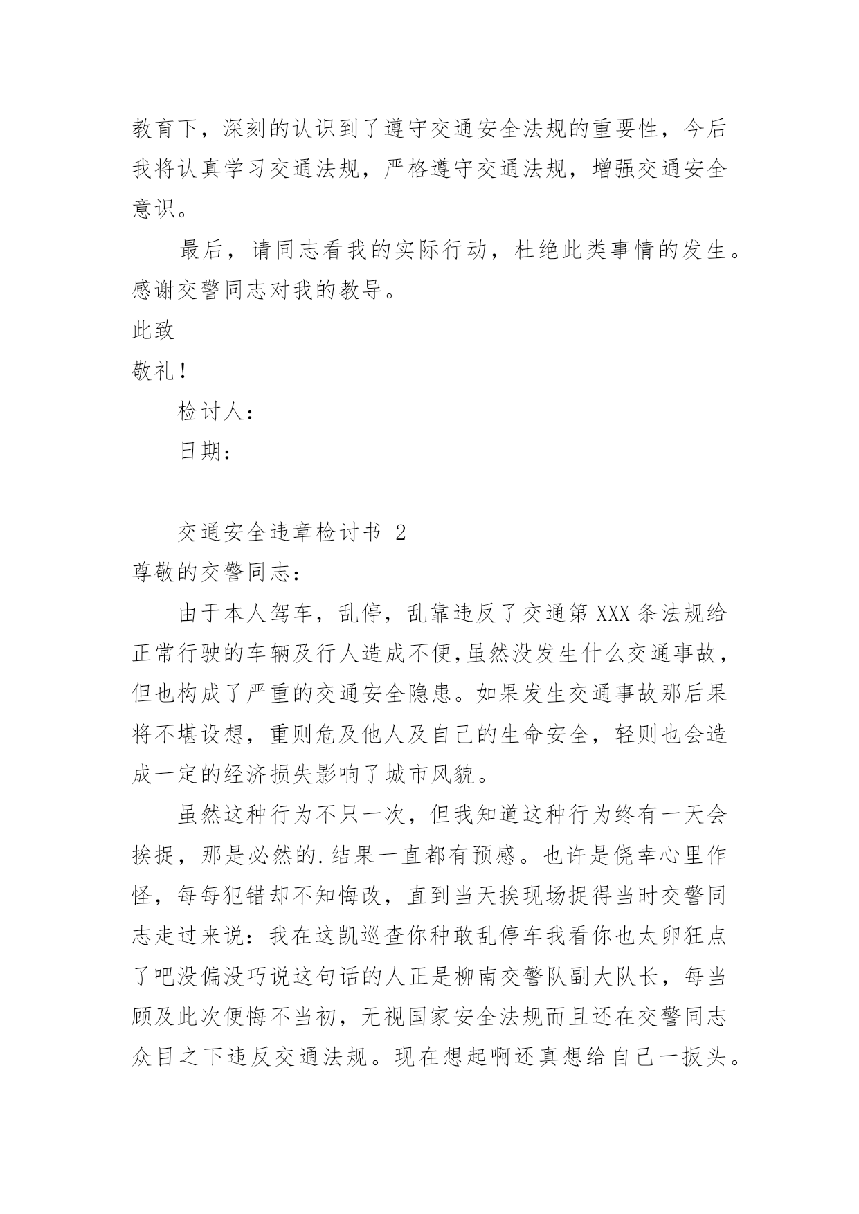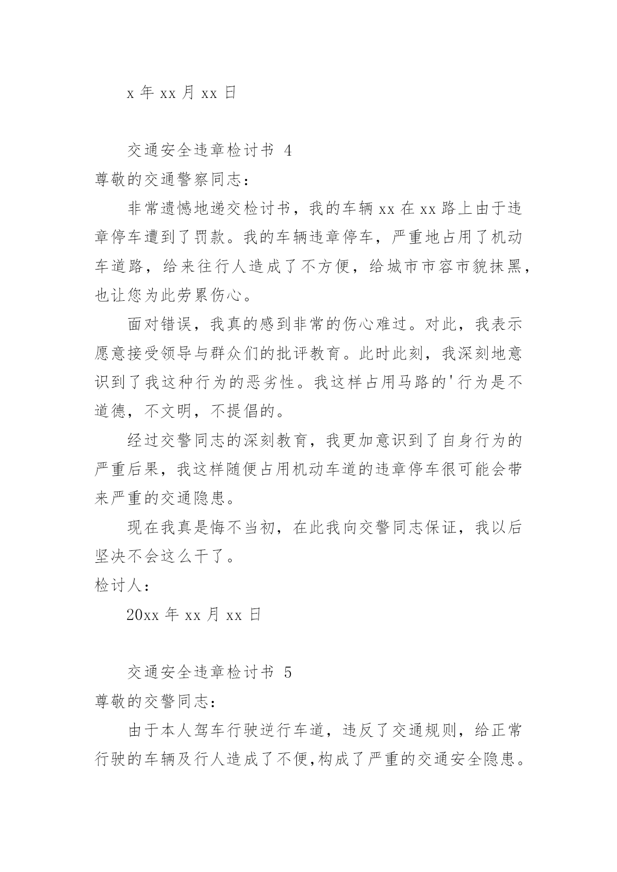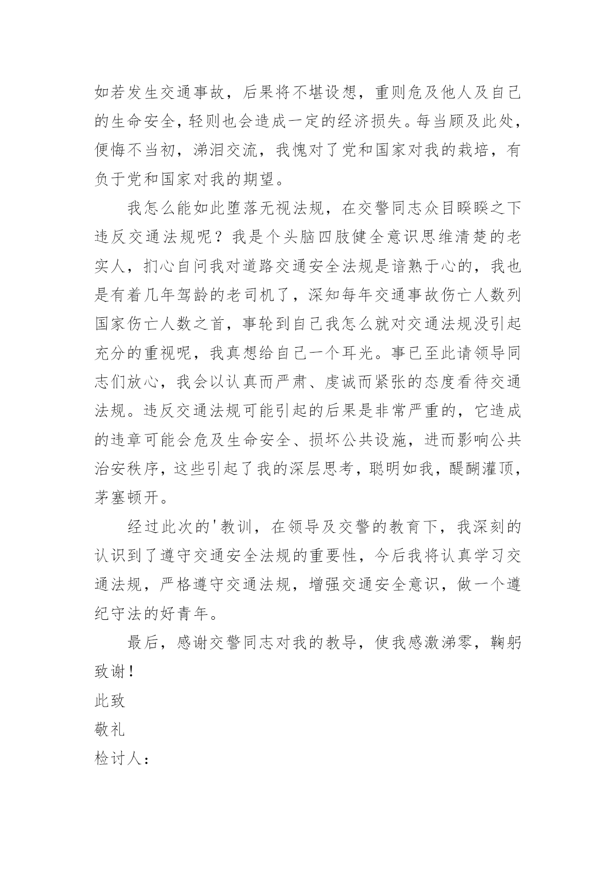 交通安全违章检讨书交通安全违章检讨书(精选10篇)在有过错的情况下,为了避免今后再出现此类事件,往往要写检讨书来自我反思,写检讨书尽量要写得深刻诚恳一些。写检讨书需要注意哪些问题呢?以下是小编整理的交通安全违章检讨书,欢迎阅读,希望大家能够喜欢。交通安全违章检讨书1尊敬的交警同志:由于本人驾车于x月x号下午在县交警队门口处违章停车卸货。之后来了两名巡警让我立刻开走,我给说让他们给我一分钟时间就好了。随后我就去关车门,于是他们就过来说不行,必须马上走。看他们态度如此恳切,于是我们发生了个小小的误会。当然,我知道此举违反了《中华人民共和国道路交通安全法》规定。给正常行驶的车辆及行人造成不便,虽然没发生什么交通事故。但也构成了严重的交通安全隐患。如果发生交通事故那后果将不堪设想。重则危及他人及自己的生命安全。轻则也会造成一定的经济损失影响了城市风貌。请同志们放心。我一定会以认真而严肃、虔诚而紧张的态度看待交通法规。违反交通法规可能引起的.后果是非常严重的,它造成的违章可能会危及生命安全、损坏公共设施,进而影响公共治安秩序,这些引起了我的深层思考。经过此次的教训,在交警的教育下,深刻的认识到了遵守交通安全法规的重要性,今后我将认真学习交通法规,严格遵守交通法规,增强交通安全意识。最后,请同志看我的实际行动,杜绝此类事情的发生。感谢交警同志对我的教导。此致敬礼!检讨人:日期:交通安全违章检讨书2尊敬的交警同志:由于本人驾车,乱停,乱靠违反了交通第XXX条法规给正常行驶的车辆及行人造成不便,虽然没发生什么交通事故,但也构成了严重的交通安全隐患。如果发生交通事故那后果将不堪设想,重则危及他人及自己的生命安全,轻则也会造成一定的经济损失影响了城市风貌。虽然这种行为不只一次,但我知道这种行为终有一天会挨捉,那是必然的.结果一直都有预感。也许是侥幸心里作怪,每每犯错却不知悔改,直到当天挨现场捉得当时交警同志走过来说:我在这凯巡查你种敢乱停车我看你也太卵狂点了吧没偏没巧说这句话的人正是柳南交警队副大队长,每当顾及此次便悔不当初,无视国家安全法规而且还在交警同志众目之下违反交通法规。现在想起啊还真想给自己一扳头。我知道这世上没有后悔药,现在错已经犯了在怎么后悔种没有用的,经过此次教训我会深刻的反思自己决定以后会严肃,认真。的态度看待交通法规。此次的教训,在交警同志的教育下已深刻的烙印在我脑海里让我深刻的认识到遵守交通法规的重要性。最后感谢交警同志对我的教导!检讨人:20xx年xx月xx日交通安全违章检讨书3尊敬的领导:我已经深刻的意识到自己的错误,据统计,全国因数以万计天真无邪的生命遭到重创,,而我却交通违给规,给正常行驶的.车辆及行人造成不便,如果发生交通事故,那后果将不堪设想,不仅危及自己还给他人的生命带来危险。经过此次的教训,并且在领导的批评教育下,我深刻的认识到了遵守交通安全法规的重要性,今后我将认真学习交通法规,严格遵守交通法规,增强交通安全意识,做一个的好青年。请相信这次的教育已深刻的烙印在我脑海里让我深刻的认识到遵守交通法规的重要性。此致敬礼检讨人:x年xx月xx日交通安全违章检讨书4尊敬的交通警察同志:非常遗憾地递交检讨书,我的车辆xx在xx路上由于违章停车遭到了罚款。我的车辆违章停车,严重地占用了机动车道路,给来往行人造成了不方便,给城市市容市貌抹黑,也让您为此劳累伤心。面对错误,我真的感到非常的伤心难过。对此,我表示愿意接受领导与群众们的批评教育。此时此刻,我深刻地意识到了我这种行为的恶劣性。我这样占用马路的'行为是不道德,不文明,不提倡的。经过交警同志的深刻教育,我更加意识到了自身行为的严重后果,我这样随便占用机动车道的违章停车很可能会带来严重的交通隐患。现在我真是悔不当初,在此我向交警同志保证,我以后坚决不会这么干了。检讨人:20xx年xx月xx日交通安全违章检讨书5尊敬的交警同志:由于本人驾车行驶逆行车道,违反了交通规则,给正常行驶的车辆及行人造成了不便,构成了严重的交通安全隐患。如若发生交通事故,后果将不堪设想,重则危及他人及自己的生命安全,轻则也会造成一定的经济损失。每当顾及此处,便悔不当初,涕泪交流,我愧对了党和国家对我的栽培,有负于党和国家对我的期望。我怎么能如此堕落无视法规,在交警同志众目睽睽之下违反交通法规呢?我是个头脑四肢健全意识思维清楚的老实人,扪心自问我对道路交通安全法规是谙熟于心的,我也是有着几年驾龄的老司机了,深知每年交通事故伤亡人数列国家伤亡人数之首,事轮到自己我怎么就对交通法规没引起充分的重视呢,我真想给自己一个耳光。事已至此请领导同志们放心,我会以认真而严肃、虔诚而紧张的态度看待交通法规。违反交通法规可能引起的后果是非常严重的,它造成的违章可能会危及生命安全、损坏公共设施,进而影响公共治安秩序