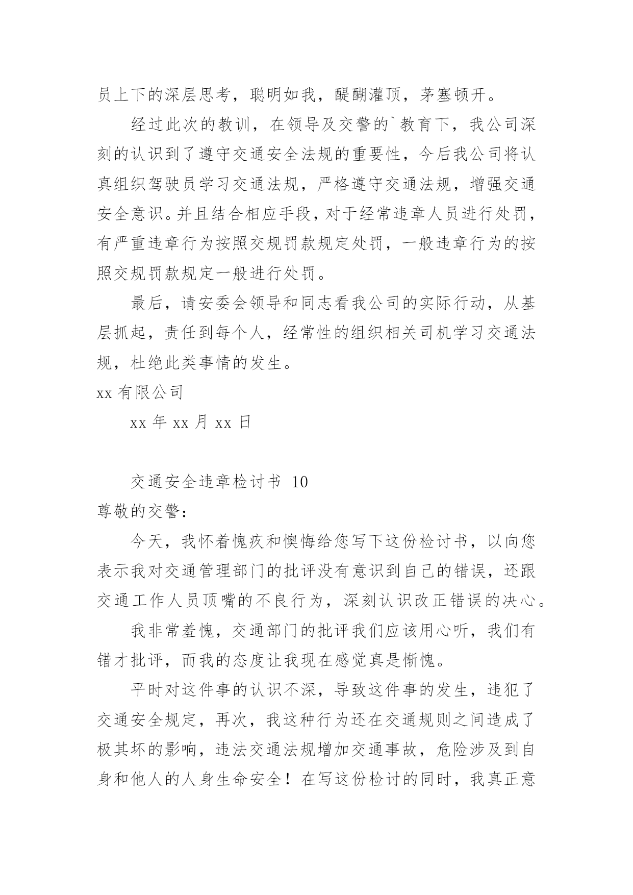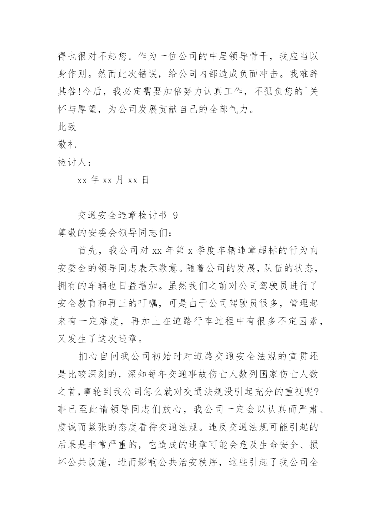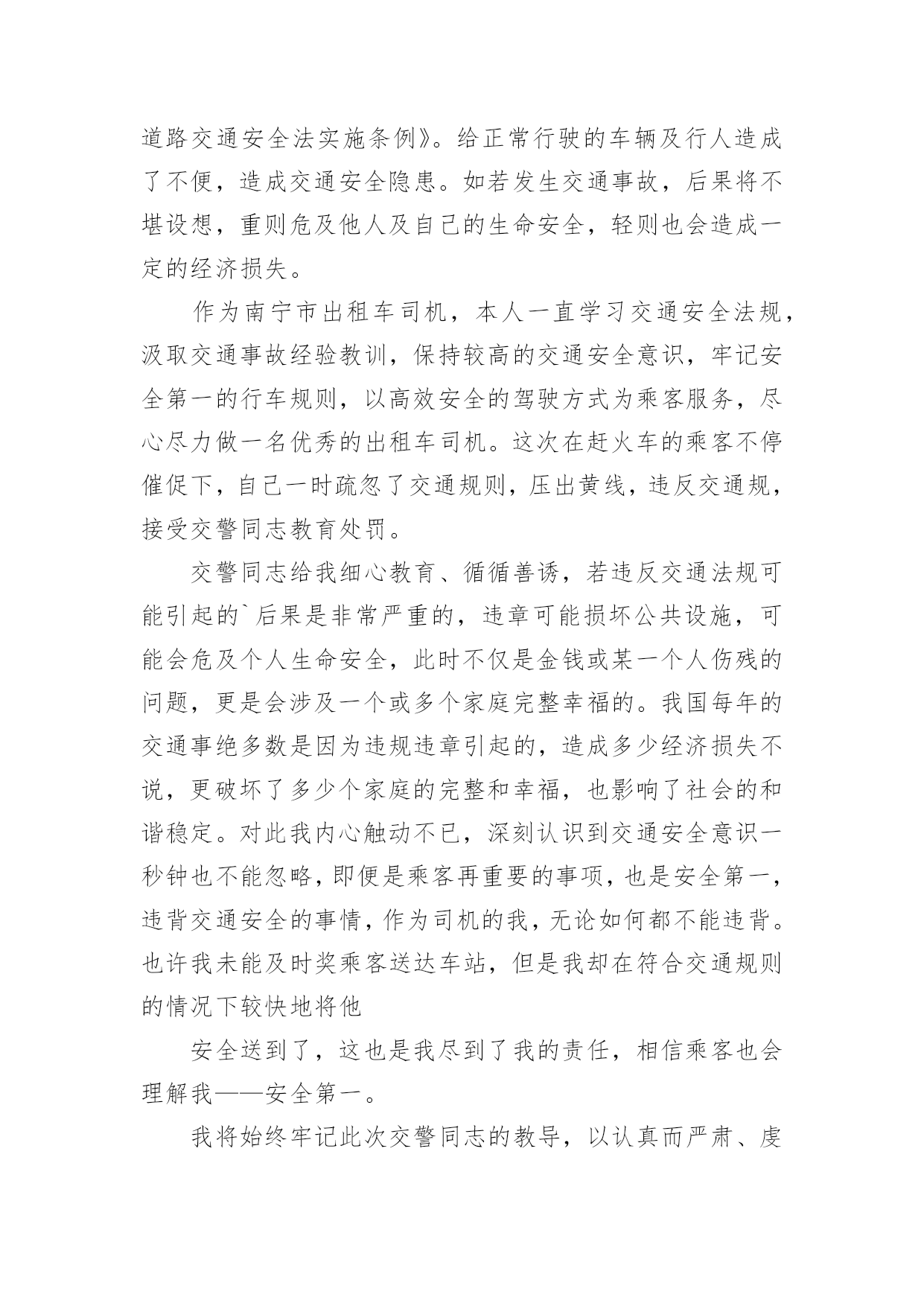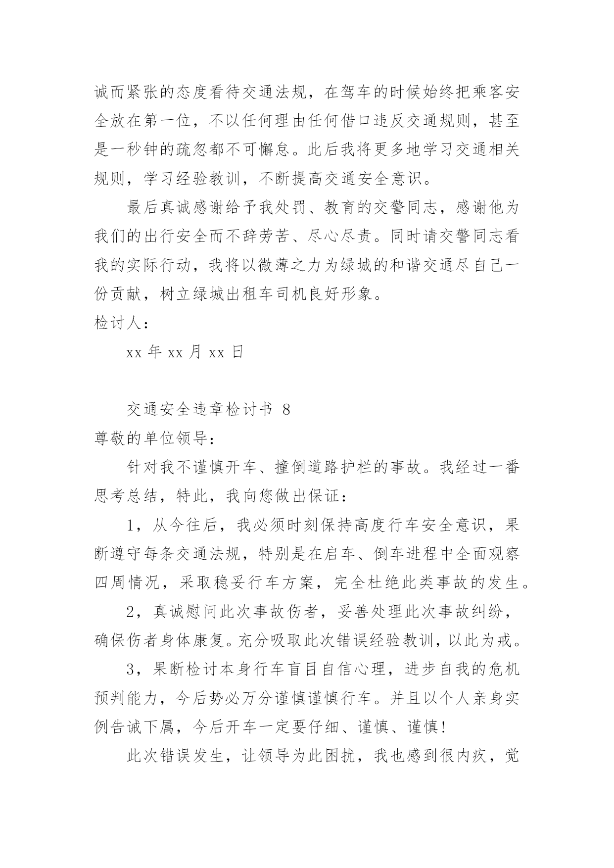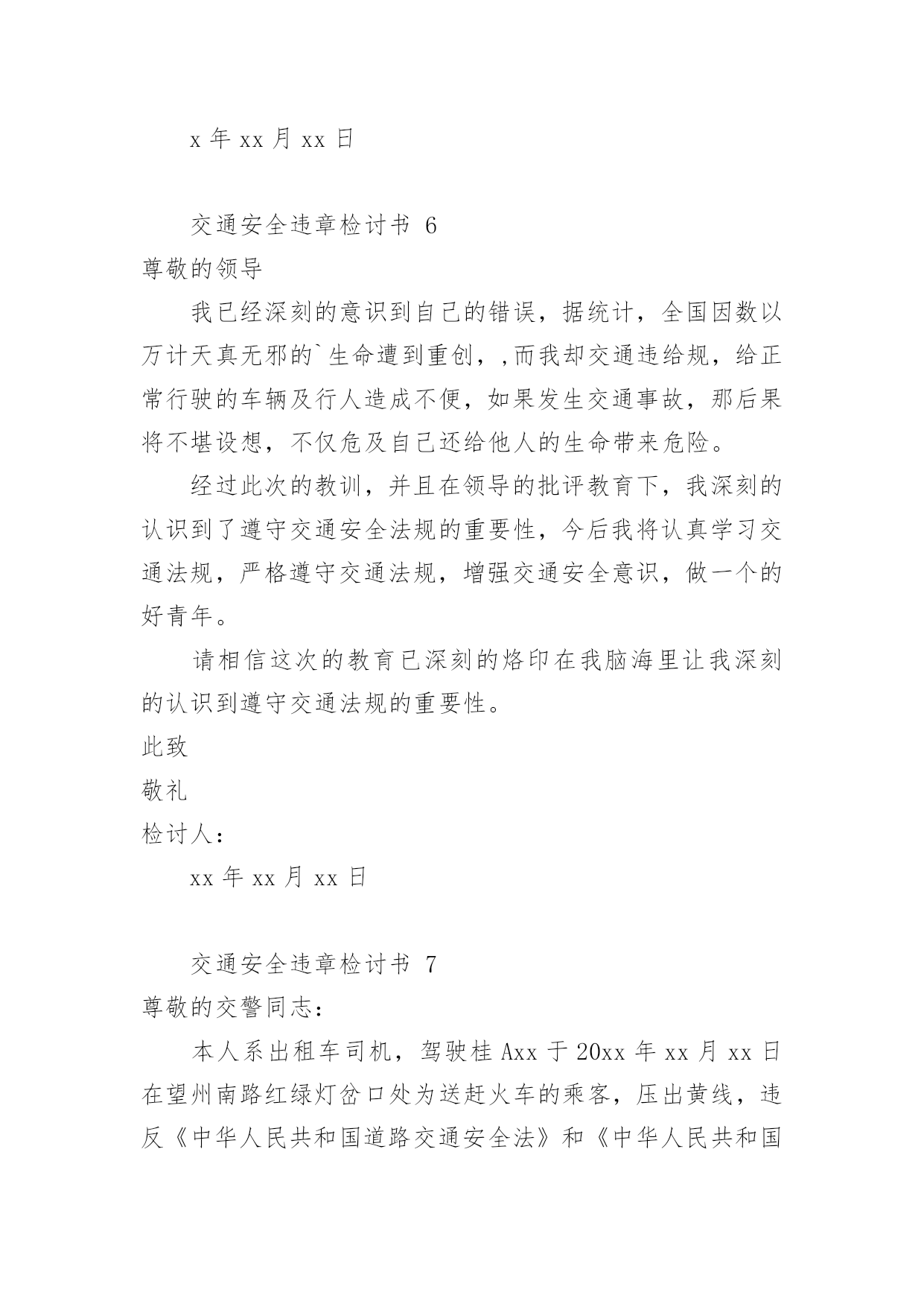 交通安全违章检讨书交通安全违章检讨书(精选10篇)在有过错的情况下,为了避免今后再出现此类事件,往往要写检讨书来自我反思,写检讨书尽量要写得深刻诚恳一些。写检讨书需要注意哪些问题呢?以下是小编整理的交通安全违章检讨书,欢迎阅读,希望大家能够喜欢。交通安全违章检讨书1尊敬的交警同志:由于本人驾车于x月x号下午在县交警队门口处违章停车卸货。之后来了两名巡警让我立刻开走,我给说让他们给我一分钟时间就好了。随后我就去关车门,于是他们就过来说不行,必须马上走。看他们态度如此恳切,于是我们发生了个小小的误会。当然,我知道此举违反了《中华人民共和国道路交通安全法》规定。给正常行驶的车辆及行人造成不便,虽然没发生什么交通事故。但也构成了严重的交通安全隐患。如果发生交通事故那后果将不堪设想。重则危及他人及自己的生命安全。轻则也会造成一定的经济损失影响了城市风貌。请同志们放心。我一定会以认真而严肃、虔诚而紧张的态度看待交通法规。违反交通法规可能引起的.后果是非常严重的,它造成的违章可能会危及生命安全、损坏公共设施,进而影响公共治安秩序,这些引起了我的深层思考。经过此次的教训,在交警的教育下,深刻的认识到了遵守交通安全法规的重要性,今后我将认真学习交通法规,严格遵守交通法规,增强交通安全意识。最后,请同志看我的实际行动,杜绝此类事情的发生。感谢交警同志对我的教导。此致敬礼!检讨人:日期:交通安全违章检讨书2尊敬的交警同志:由于本人驾车,乱停,乱靠违反了交通第XXX条法规给正常行驶的车辆及行人造成不便,虽然没发生什么交通事故,但也构成了严重的交通安全隐患。如果发生交通事故那后果将不堪设想,重则危及他人及自己的生命安全,轻则也会造成一定的经济损失影响了城市风貌。虽然这种行为不只一次,但我知道这种行为终有一天会挨捉,那是必然的.结果一直都有预感。也许是侥幸心里作怪,每每犯错却不知悔改,直到当天挨现场捉得当时交警同志走过来说:我在这凯巡查你种敢乱停车我看你也太卵狂点了吧没偏没巧说这句话的人正是柳南交警队副大队长,每当顾及此次便悔不当初,无视国家安全法规而且还在交警同志众目之下违反交通法规。现在想起啊还真想给自己一扳头。我知道这世上没有后悔药,现在错已经犯了在怎么后悔种没有用的,经过此次教训我会深刻的反思自己决定以后会严肃,认真。的态度看待交通法规。此次的教训,在交警同志的教育下已深刻的烙印在我脑海里让我深刻的认识到遵守交通法规的重要性。最后感谢交警同志对我的教导!检讨人:20xx年xx月xx日交通安全违章检讨书3尊敬的领导:我已经深刻的意识到自己的错误,据统计,全国因数以万计天真无邪的生命遭到重创,,而我却交通违给规,给正常行驶的.车辆及行人造成不便,如果发生交通事故,那后果将不堪设想,不仅危及自己还给他人的生命带来危险。经过此次的教训,并且在领导的批评教育下,我深刻的认识到了遵守交通安全法规的重要性,今后我将认真学习交通法规,严格遵守交通法规,增强交通安全意识,做一个的好青年。请相信这次的教育已深刻的烙印在我脑海里让我深刻的认识到遵守交通法规的重要性。此致敬礼检讨人:x年xx月xx日交通安全违章检讨书4尊敬的交通警察同志:非常遗憾地递交检讨书,我的车辆xx在xx路上由于违章停车遭到了罚款。我的车辆违章停车,严重地占用了机动车道路,给来往行人造成了不方便,给城市市容市貌抹黑,也让您为此劳累伤心。面对错误,我真的感到非常的伤心难过。对此,我表示愿意接受领导与群众们的批评教育。此时此刻,我深刻地意识到了我这种行为的恶劣性。我这样占用马路的'行为是不道德,不文明,不提倡的。经过交警同志的深刻教育,我更加意识到了自身行为的严重后果,我这样随便占用机动车道的违章停车很可能会带来严重的交通隐患。现在我真是悔不当初,在此我向交警同志保证,我以后坚决不会这么干了。检讨人:20xx年xx月xx日交通安全违章检讨书5尊敬的交警同志:由于本人驾车行驶逆行车道,违反了交通规则,给正常行驶的车辆及行人造成了不便,构成了严重的交通安全隐患。如若发生交通事故,后果将不堪设想,重则危及他人及自己的生命安全,轻则也会造成一定的经济损失。每当顾及此处,便悔不当初,涕泪交流,我愧对了党和国家对我的栽培,有负于党和国家对我的期望。我怎么能如此堕落无视法规,在交警同志众目睽睽之下违反交通法规呢?我是个头脑四肢健全意识思维清楚的老实人,扪心自问我对道路交通安全法规是谙熟于心的,我也是有着几年驾龄的老司机了,深知每年交通事故伤亡人数列国家伤亡人数之首,事轮到自己我怎么就对交通法规没引起充分的重视呢,我真想给自己一个耳光。事已至此请领导同志们放心,我会以认真而严肃、虔诚而紧张的态度看待交通法规。违反交通法规可能引起的后果是非常严重的,它造成的违章可能会危及生命安全、损坏公共设施,进而影响公共治安秩序