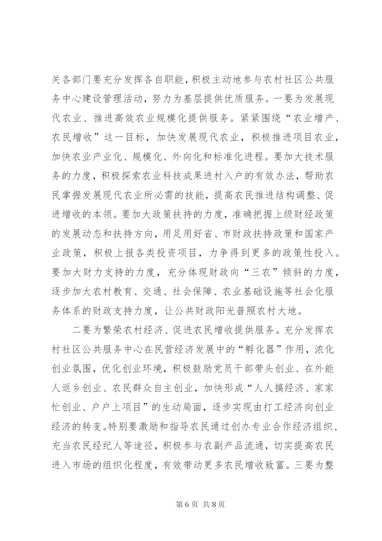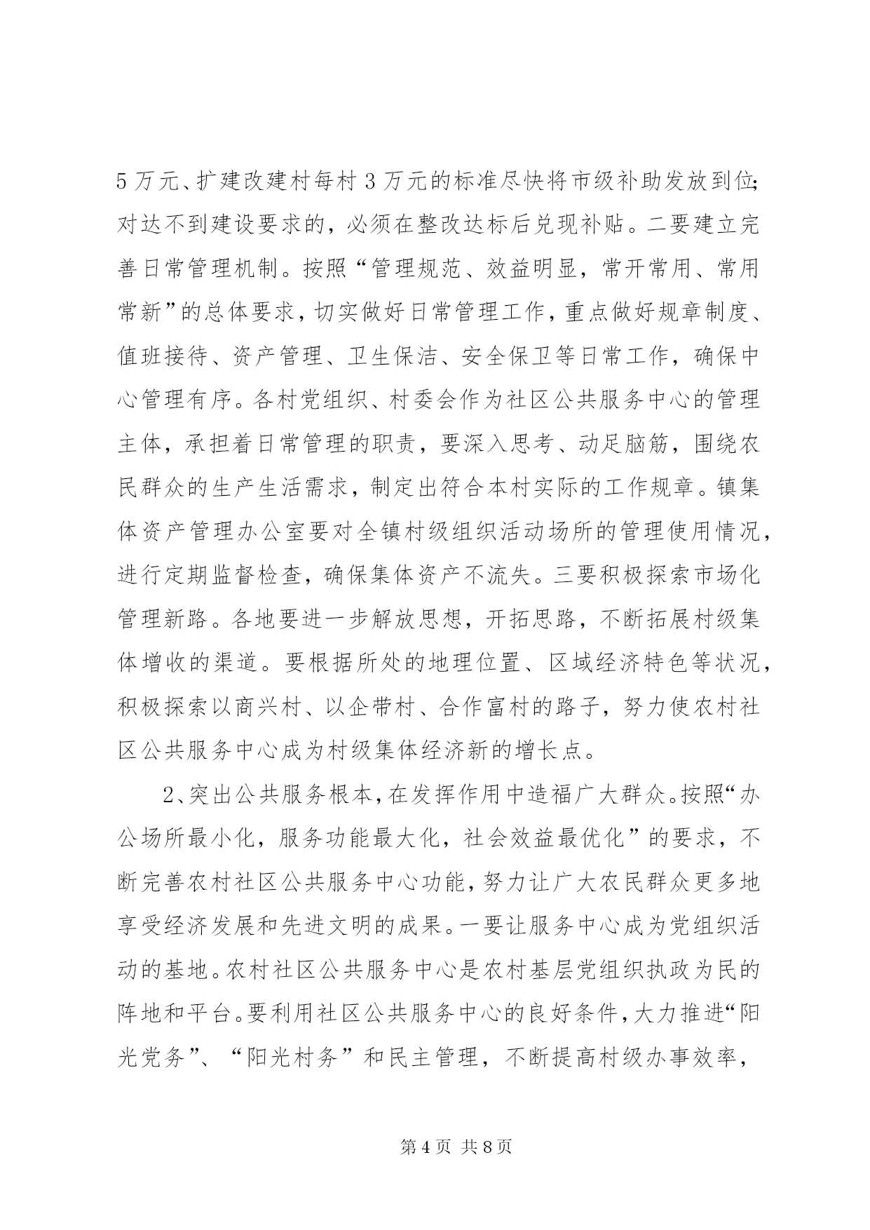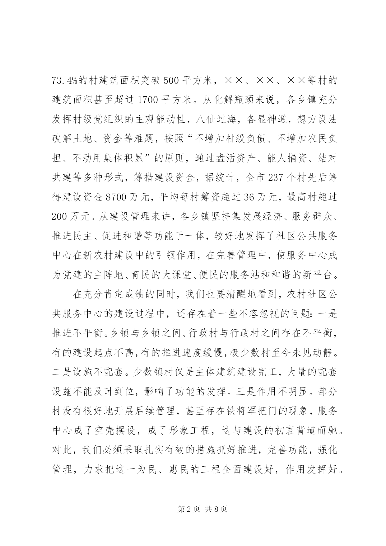 第PAGE\*Arabic\*MERGEFORMAT8页共NUMPAGES\*MERGEFORMAT8页市农村社区公共服务建设讲话同志们:今天,全市农村社区公共服务中心建设总结大会的主要任务是,回顾总结去年以来的建设情况,部署下阶段工作,动员全市上下进一步创新思路、落实举措、强化管理,不断完善农村社区公共服务中心规范化建设,努力把农村公共服务中心建设管理提高到一个新水平。刚才,××同志回顾总结了一年来的建设工作,并就加强规范化建设提出了明确的要求,讲得很好,我完全赞同,希望大家认真抓好贯彻落实。下面,我再强调三点意见:一、肯定成绩,正视不足,继续把农村社区公共服务中心建设放在重要位置去年以来,全市上下坚持把农村社区公共服务中心建设作为新农村建设的切入点和突破口,高点定位,强势推进,经过一年多的不懈努力,全市农村社区公共服务中心基本建成,并开始发挥作用。总结去年的工作,可以概括为三句话,即组织推进有力度,化解瓶颈有办法,建设管理有特色。从组织推进来讲,各地、各有关部门坚持把建设村级公共服务中心作为当前推进新农村建设的当务之急和一项重要的政治任务来抓,成立专门班子,创新工作思路,整合各类资源,实施挂图作战,协力组织推进,走出了一条又好又快建设村级公共服务中心的新路。目前,234个村已经完成建设任务,建筑面积全部超过400平方米的市定标准,73.4%的村建筑面积突破500平方米,××、××、××等村的建筑面积甚至超过1700平方米。从化解瓶颈来说,各乡镇充分发挥村级党组织的主观能动性,八仙过海,各显神通,想方设法破解土地、资金等难题,按照“不增加村级负债、不增加农民负担、不动用集体积累”的原则,通过盘活资产、能人捐资、结对共建等多种形式,筹措建设资金,据统计,全市237个村先后筹得建设资金8700万元,平均每村筹资超过36万元,最高村超过200万元。从建设管理来讲,各乡镇坚持集发展经济、服务群众、推进民主、促进和谐等功能于一体,较好地发挥了社区公共服务中心在新农村建设中的引领作用,在完善管理中,使服务中心成为党建的主阵地、育民的大课堂、便民的服务站和和谐的新平台。在充分肯定成绩的同时,我们也要清醒地看到,农村社区公共服务中心的建设过程中,还存在着一些不容忽视的问题:一是推进不平衡。乡镇与乡镇之间、行政村与行政村之间存在不平衡,有的建设起点不高,有的推进速度缓慢,极少数村至今未见动静。二是设施不配套。少数镇村仅是主体建筑建设完工,大量的配套设施不能及时到位,影响了功能的发挥。三是作用不明显。部分村没有很好地开展后续管理,甚至存在铁将军把门的现象,服务中心成了空壳摆设,成了形象工程,这与建设的初衷背道而驰。对此,我们必须采取扎实有效的措施抓好推进,完善功能,强化管理,力求把这一为民、惠民的工程全面建设好,作用发挥好。二、加强管理,延伸服务,把发挥作用作为农村社区公共服务中心建设的重中之重农村社区公共服务中心大楼的落成,只是基础设施建设的完成,更重要的任务在于如何发挥其作用。我们必须彻底摒弃传统意义上的党支部、村委会办公室建设的思维定势,严肃认真地思考其规范化管理问题,赋予服务中心新的内涵、新的功能。各地、各部门要充分认清推进农村社区公共服务中心规范化建设的重要意义,认真思考功能定位,精心研究制度内容,仔细策划整体布置,真正使公共服务中心内外兼修、相得益彰,真正成为展示组织形象、为民服务的平台。1、贯彻建管并重原则,在科学谋划中做好后续建设。坚持建管并重是推进公共服务中心建设的一个重要原则。做当前基础设施逐步到位的情况下,如何按照序时进度做好后续工作是当务之急。一要加快基础设施建设及功能配套工作。各项已建成且已投入使用的村,要积极拓展服务功能,紧紧围绕农民的生产生活需求,精心组织、扎实开展各项为农服务活动。基础设施已经建成的村,要加紧内部配套设施设备的完善,确保本月底之前能正常开展活动。因种种原因基础设施尚未建成的村,要千方百计克服困难,加快建设进度,确保上半年投入使用。市农村社区服务中心建设领导小组以及有关职能部门要认真对照建设标准,扎实抓好服务中心竣工验收工作。对建设达标的,要按照新建村每村5万元、扩建改建村每村3万元的标准尽快将市级补助发放到位;对达不到建设要求的,必须在整改达标后兑现补贴。二要建立完善日常管理机制。按照“管理规范、效益明显,常开常用、常用常新”的总体要求,切实做好日常管理工作,重点做好规章制度、值班接待、资产管理、卫生保洁、安全保卫等日常工作,确保中心管理有序。各村党组织、村委会作为社区公共服务中心的管理主体,承担着日常管理的职责,要深入思考、动足脑筋,围绕农民群众的生产生活需求,制定出符合本村实际的工作规章。镇集体资产管理办公室要对全镇村级组织活动场所的管理使用情况,进行定期监督检查,确