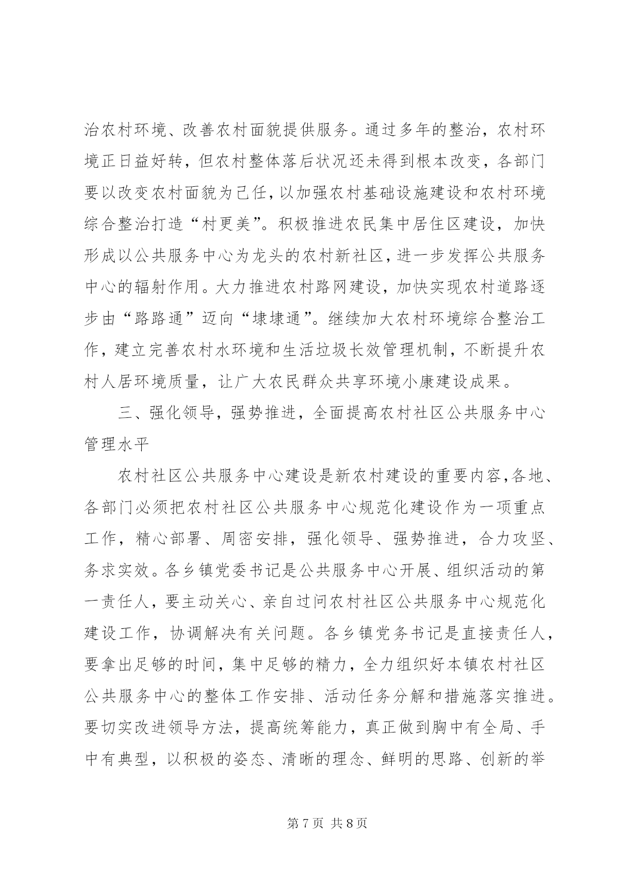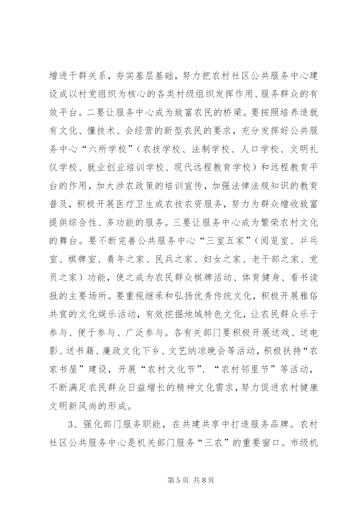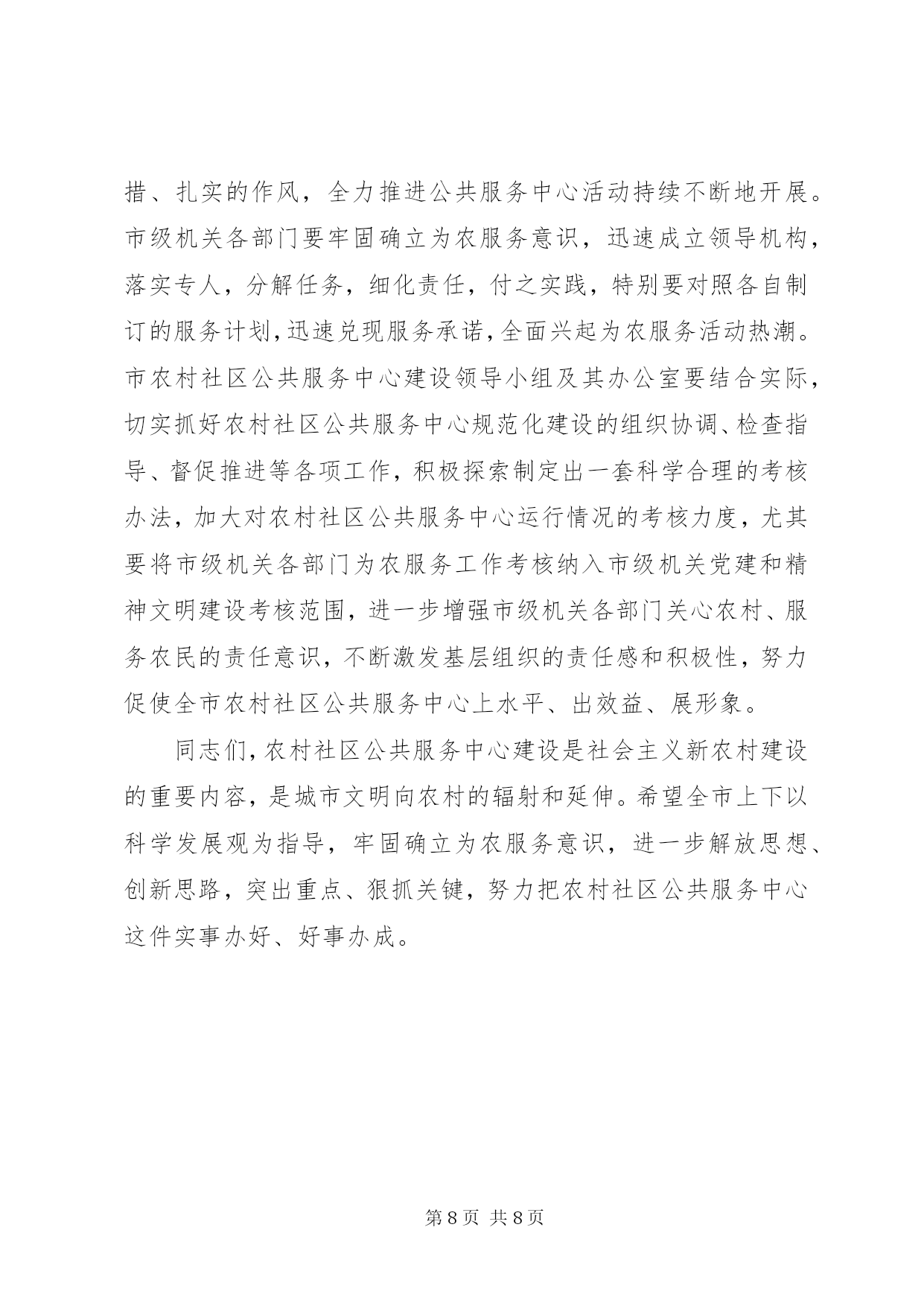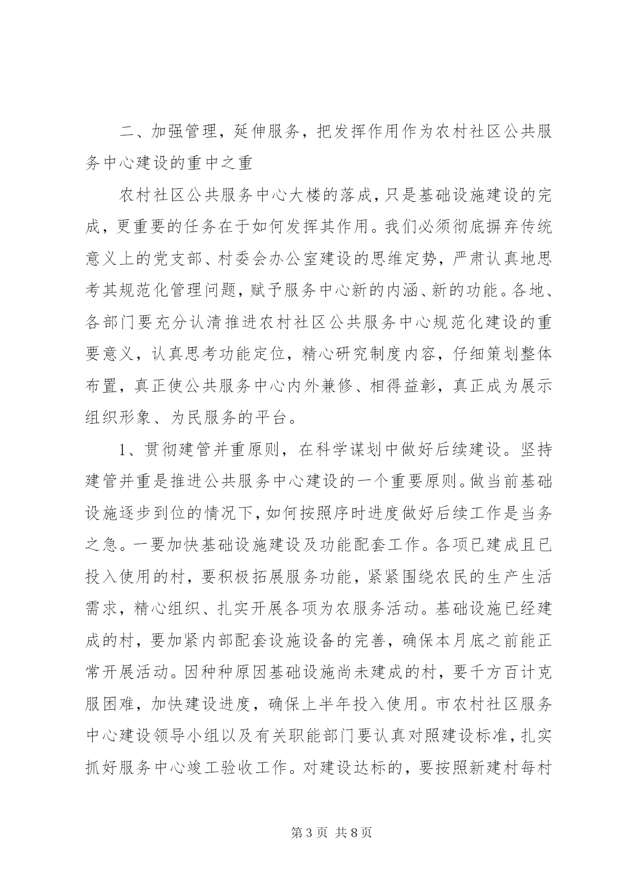 第PAGE\*Arabic\*MERGEFORMAT8页共NUMPAGES\*MERGEFORMAT8页市农村社区公共服务建设讲话同志们:今天,全市农村社区公共服务中心建设总结大会的主要任务是,回顾总结去年以来的建设情况,部署下阶段工作,动员全市上下进一步创新思路、落实举措、强化管理,不断完善农村社区公共服务中心规范化建设,努力把农村公共服务中心建设管理提高到一个新水平。刚才,××同志回顾总结了一年来的建设工作,并就加强规范化建设提出了明确的要求,讲得很好,我完全赞同,希望大家认真抓好贯彻落实。下面,我再强调三点意见:一、肯定成绩,正视不足,继续把农村社区公共服务中心建设放在重要位置去年以来,全市上下坚持把农村社区公共服务中心建设作为新农村建设的切入点和突破口,高点定位,强势推进,经过一年多的不懈努力,全市农村社区公共服务中心基本建成,并开始发挥作用。总结去年的工作,可以概括为三句话,即组织推进有力度,化解瓶颈有办法,建设管理有特色。从组织推进来讲,各地、各有关部门坚持把建设村级公共服务中心作为当前推进新农村建设的当务之急和一项重要的政治任务来抓,成立专门班子,创新工作思路,整合各类资源,实施挂图作战,协力组织推进,走出了一条又好又快建设村级公共服务中心的新路。目前,234个村已经完成建设任务,建筑面积全部超过400平方米的市定标准,73.4%的村建筑面积突破500平方米,××、××、××等村的建筑面积甚至超过1700平方米。从化解瓶颈来说,各乡镇充分发挥村级党组织的主观能动性,八仙过海,各显神通,想方设法破解土地、资金等难题,按照“不增加村级负债、不增加农民负担、不动用集体积累”的原则,通过盘活资产、能人捐资、结对共建等多种形式,筹措建设资金,据统计,全市237个村先后筹得建设资金8700万元,平均每村筹资超过36万元,最高村超过200万元。从建设管理来讲,各乡镇坚持集发展经济、服务群众、推进民主、促进和谐等功能于一体,较好地发挥了社区公共服务中心在新农村建设中的引领作用,在完善管理中,使服务中心成为党建的主阵地、育民的大课堂、便民的服务站和和谐的新平台。在充分肯定成绩的同时,我们也要清醒地看到,农村社区公共服务中心的建设过程中,还存在着一些不容忽视的问题:一是推进不平衡。乡镇与乡镇之间、行政村与行政村之间存在不平衡,有的建设起点不高,有的推进速度缓慢,极少数村至今未见动静。二是设施不配套。少数镇村仅是主体建筑建设完工,大量的配套设施不能及时到位,影响了功能的发挥。三是作用不明显。部分村没有很好地开展后续管理,甚至存在铁将军把门的现象,服务中心成了空壳摆设,成了形象工程,这与建设的初衷背道而驰。对此,我们必须采取扎实有效的措施抓好推进,完善功能,强化管理,力求把这一为民、惠民的工程全面建设好,作用发挥好。二、加强管理,延伸服务,把发挥作用作为农村社区公共服务中心建设的重中之重农村社区公共服务中心大楼的落成,只是基础设施建设的完成,更重要的任务在于如何发挥其作用。我们必须彻底摒弃传统意义上的党支部、村委会办公室建设的思维定势,严肃认真地思考其规范化管理问题,赋予服务中心新的内涵、新的功能。各地、各部门要充分认清推进农村社区公共服务中心规范化建设的重要意义,认真思考功能定位,精心研究制度内容,仔细策划整体布置,真正使公共服务中心内外兼修、相得益彰,真正成为展示组织形象、为民服务的平台。1、贯彻建管并重原则,在科学谋划中做好后续建设。坚持建管并重是推进公共服务中心建设的一个重要原则。做当前基础设施逐步到位的情况下,如何按照序时进度做好后续工作是当务之急。一要加快基础设施建设及功能配套工作。各项已建成且已投入使用的村,要积极拓展服务功能,紧紧围绕农民的生产生活需求,精心组织、扎实开展各项为农服务活动。基础设施已经建成的村,要加紧内部配套设施设备的完善,确保本月底之前能正常开展活动。因种种原因基础设施尚未建成的村,要千方百计克服困难,加快建设进度,确保上半年投入使用。市农村社区服务中心建设领导小组以及有关职能部门要认真对照建设标准,扎实抓好服务中心竣工验收工作。对建设达标的,要按照新建村每村5万元、扩建改建村每村3万元的标准尽快将市级补助发放到位;对达不到建设要求的,必须在整改达标后兑现补贴。二要建立完善日常管理机制。按照“管理规范、效益明显,常开常用、常用常新”的总体要求,切实做好日常管理工作,重点做好规章制度、值班接待、资产管理、卫生保洁、安全保卫等日常工作,确保中心管理有序。各村党组织、村委会作为社区公共服务中心的管理主体,承担着日常管理的职责,要深入思考、动足脑筋,围绕农民群众的生产生活需求,制定出符合本村实际的工作规章。镇集体资产管理办公室要对全镇村级组织活动场所的管理使用情况,进行定期监督检查,确