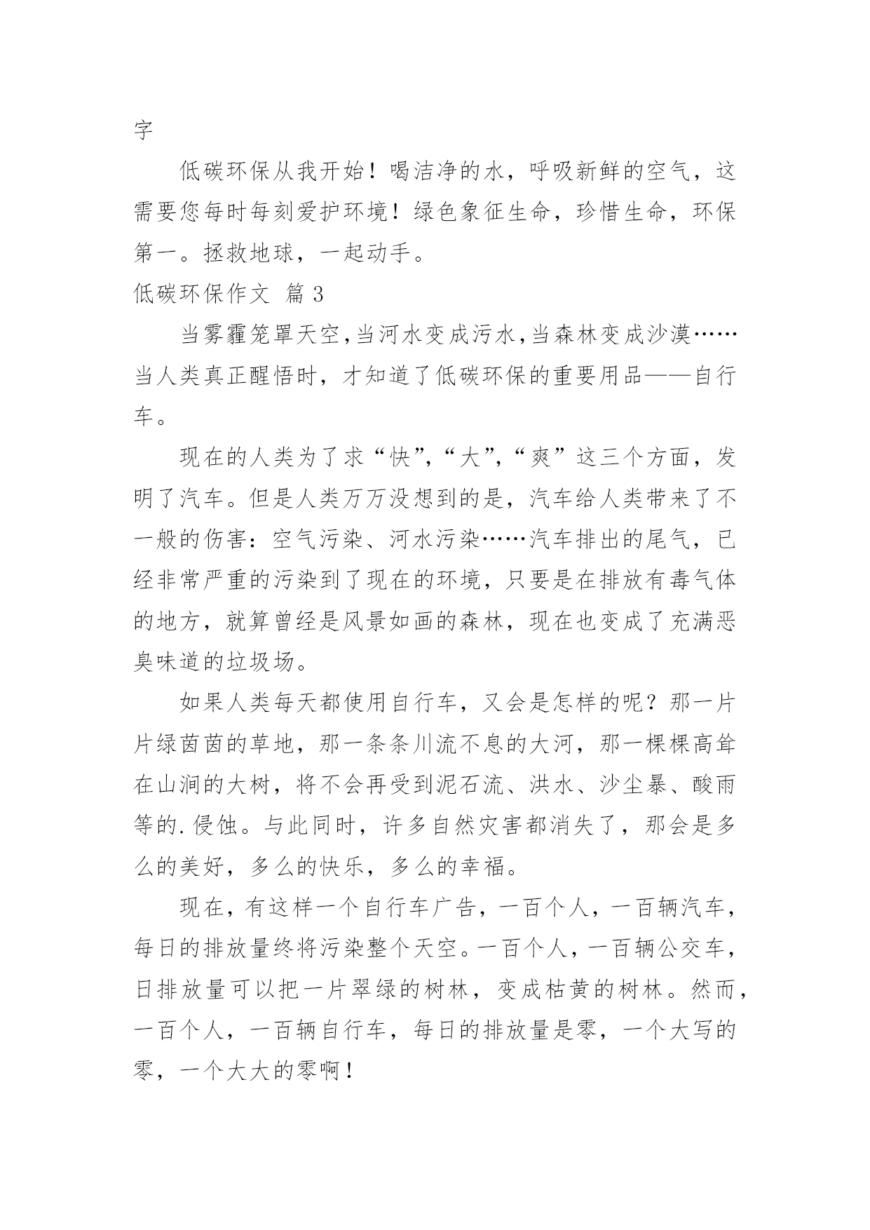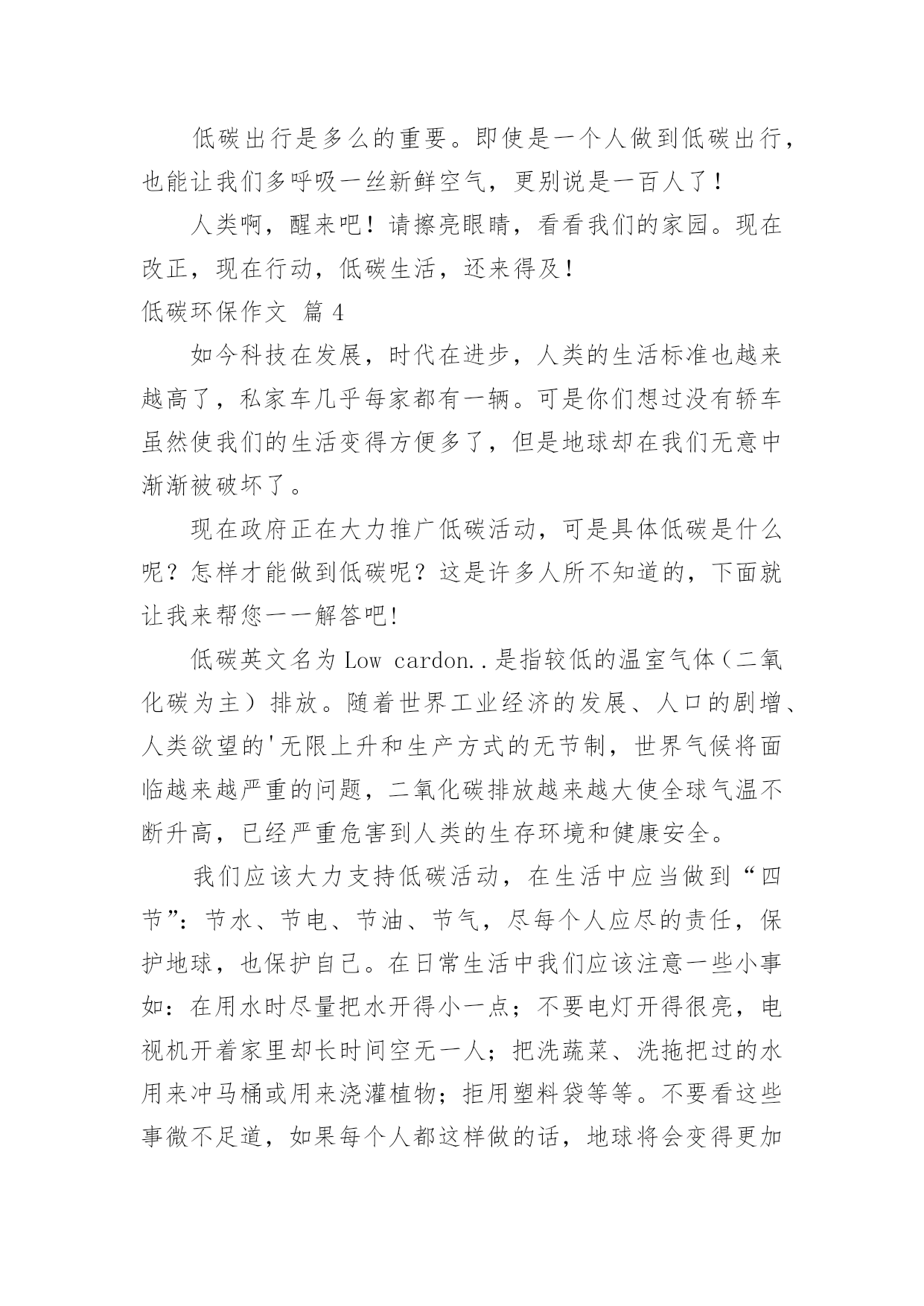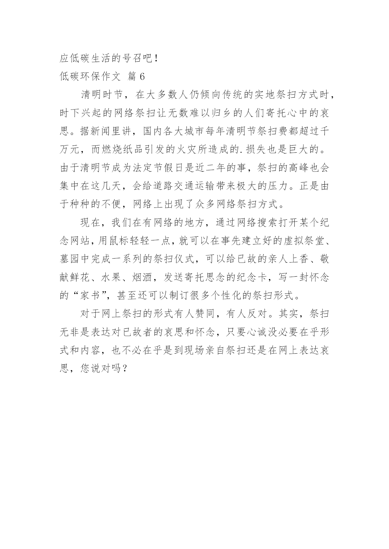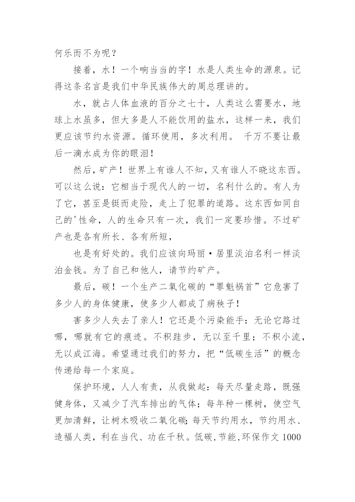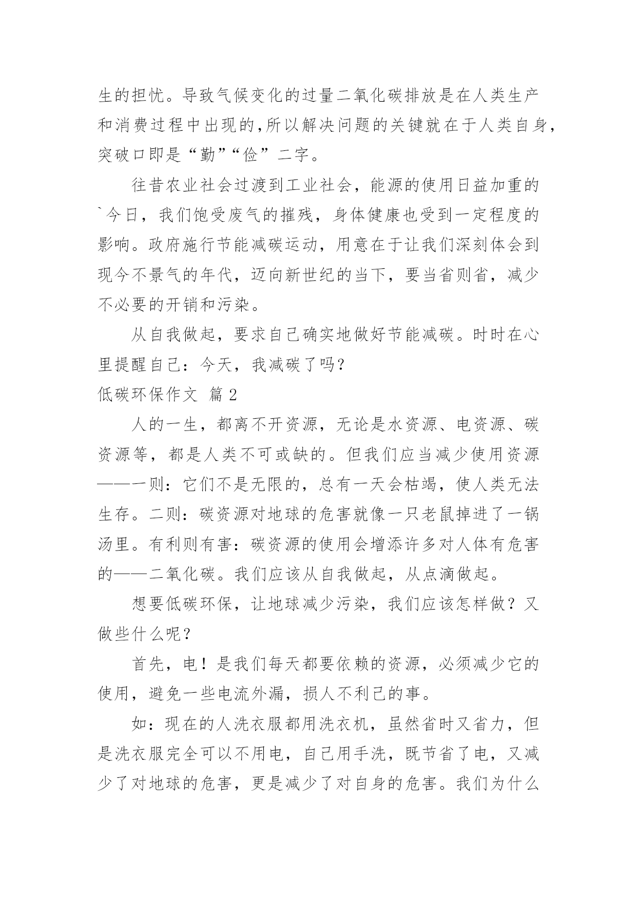 低碳环保作文低碳环保作文6篇(必备)在我们平凡的日常里,大家都经常接触到作文吧,作文是人们把记忆中所存储的有关知识、经验和思想用书面形式表达出来的记叙方式。写起作文来就毫无头绪?以下是小编为大家整理的低碳环保作文6篇,欢迎大家借鉴与参考,希望对大家有所帮助。低碳环保作文篇1时尚女孩追求的是“减肥”,上班族在意的是“减税”,学生关注的是“减负”。可是,我想问问,今天,你减碳了吗?现今科技日益发达,能源消耗相对就加重了许多,实行节能减碳就显得刻不容缓了。我们每个人都要有能源危机的潜意识,从自身做起,参与到这项造福人类的伟大工程中。节能减碳的益处无穷:它可以减少能源的开销,达到绿化的目标。节能减碳也很容易做到:少砍一棵树就可减少二氧化碳的含量;少用一个一次性塑料袋,就可减排二氧化碳0.1克;少开一天车,就可减排二氧化碳8000克;手洗一次衣物,可减排二氧化碳300克……只要我们有心,处处都可以做到“减碳”,为保护地球母亲,造福子孙后代奉献出自己的力量。“低碳生活”,是一个全新的概念,但提出的却是世界可持续发展的老问题,他反映了人类因气候变化而对未来产生的担忧。导致气候变化的过量二氧化碳排放是在人类生产和消费过程中出现的,所以解决问题的关键就在于人类自身,突破口即是“勤”“俭”二字。往昔农业社会过渡到工业社会,能源的使用日益加重的`今日,我们饱受废气的摧残,身体健康也受到一定程度的影响。政府施行节能减碳运动,用意在于让我们深刻体会到现今不景气的年代,迈向新世纪的当下,要当省则省,减少不必要的开销和污染。从自我做起,要求自己确实地做好节能减碳。时时在心里提醒自己:今天,我减碳了吗?低碳环保作文篇2人的一生,都离不开资源,无论是水资源、电资源、碳资源等,都是人类不可或缺的。但我们应当减少使用资源——一则:它们不是无限的,总有一天会枯竭,使人类无法生存。二则:碳资源对地球的危害就像一只老鼠掉进了一锅汤里。有利则有害:碳资源的使用会增添许多对人体有危害的——二氧化碳。我们应该从自我做起,从点滴做起。想要低碳环保,让地球减少污染,我们应该怎样做?又做些什么呢?首先,电!是我们每天都要依赖的资源,必须减少它的使用,避免一些电流外漏,损人不利己的事。如:现在的人洗衣服都用洗衣机,虽然省时又省力,但是洗衣服完全可以不用电,自己用手洗,既节省了电,又减少了对地球的危害,更是减少了对自身的危害。我们为什么何乐而不为呢?接着,水!一个响当当的字!水是人类生命的源泉。记得这条名言是我们中华民族伟大的周总理讲的。水,就占人体血液的百分之七十,人类这么需要水,地球上水虽多,但大多是人不能饮用的盐水,这样一来,我们更应该节约水资源。循环使用,多次利用。千万不要让最后一滴水成为你的眼泪!然后,矿产!世界上有谁人不知,又有谁人不晓这东西。可以这么说:它相当于现代人的一切,名利什么的。有人为了它,甚至是铤而走险,走上了犯罪的道路。这东西如同自己的'性命,人的生命只有一次,我们一定要珍惜。不过矿产也是各有所长、各有所短,也是有好处的。我们应该向玛丽·居里淡泊名利一样淡泊金钱。为了自己和他人,请节约矿产。最后,碳!一个生产二氧化碳的“罪魁祸首”它危害了多少人的身体健康,使多少人都成了病秧子!害多少人失去了亲人!它还是个污染能手:无论它路过哪,哪就有它的痕迹。不积跬步,无以至千里;不积小流,无以成江海。希望通过我们的努力,把“低碳生活”的概念传递给每一个家庭。保护环境,人人有责,从我做起:每天尽量走路,既强健身体,又减少了汽车排出的气体;每年种一棵树,使空气更加清鲜,让树木吸收二氧化碳;每天节约用水,节约用水、造福人类,利在当代、功在千秋。低碳,节能,环保作文1000字低碳环保从我开始!喝洁净的水,呼吸新鲜的空气,这需要您每时每刻爱护环境!绿色象征生命,珍惜生命,环保第一。拯救地球,一起动手。低碳环保作文篇3当雾霾笼罩天空,当河水变成污水,当森林变成沙漠……当人类真正醒悟时,才知道了低碳环保的重要用品——自行车。现在的人类为了求“快”,“大”,“爽”这三个方面,发明了汽车。但是人类万万没想到的是,汽车给人类带来了不一般的伤害:空气污染、河水污染……汽车排出的尾气,已经非常严重的污染到了现在的环境,只要是在排放有毒气体的地方,就算曾经是风景如画的森林,现在也变成了充满恶臭味道的垃圾场。如果人类每天都使用自行车,又会是怎样的呢?那一片片绿茵茵的草地,那一条条川流不息的大河,那一棵棵高耸在山涧的大树,将不会再受到泥石流、洪水、沙尘暴、酸雨等的.侵蚀。与此同时,许多自然灾害都消失了,那会是多么的美好,多么的快乐,多么的幸福。现在,有这样一个自行车广告,一百个人,一百辆汽车,每日的排放量终将污染整个天空。一百个人,一百辆公交车,日排放量可以把一片翠绿的树林,变成枯黄的树林。然而,一