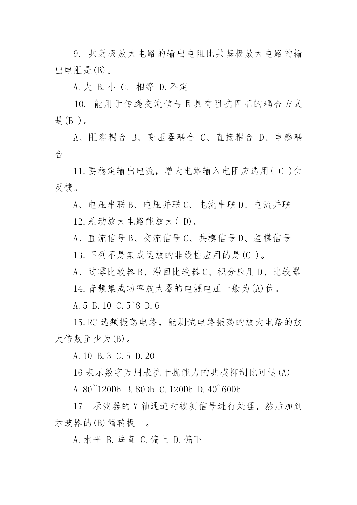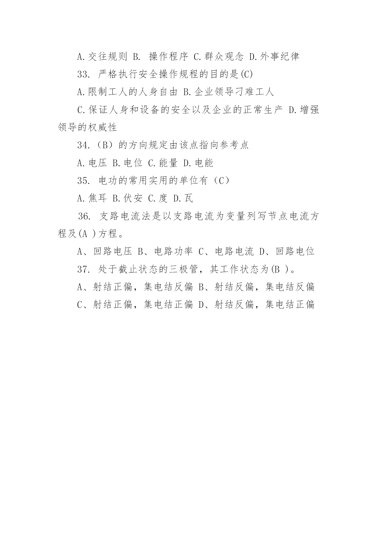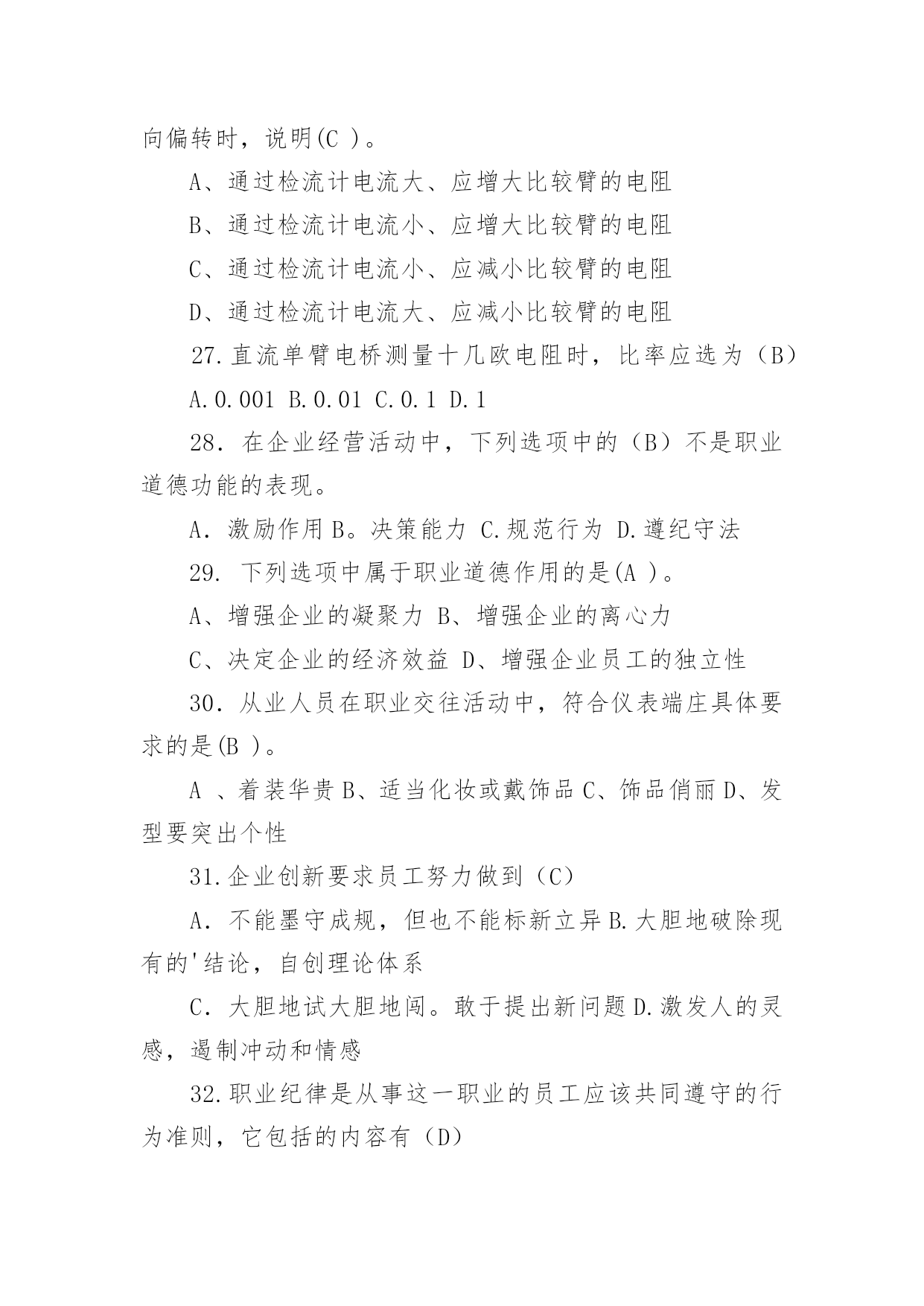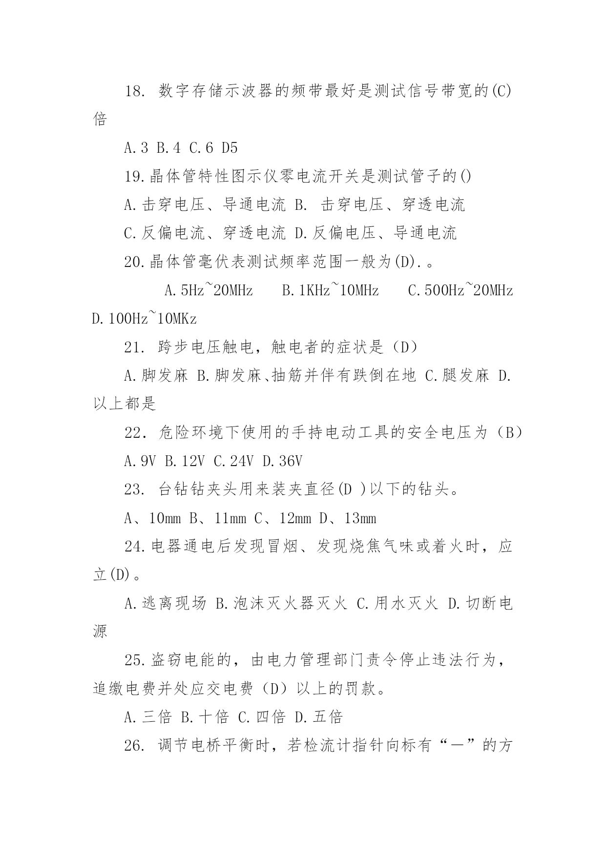 电工中级理论知识试卷及答案电工中级理论知识试卷及答案1.晶体管型号KS20-8中的8表示(A)A.允许的最高电压800VB.允许的最高电压80VC.允许的最高电压8VD.允许的最高电压8kV2.双向晶闸管是(A)半导体结构。A.四层B.五层C.三层D.两层3.单结晶体管的结构中有(B)个基极。A、1B、2C、3D、44.单结晶体管两个基极的文字符合是(D)。A.C1、C2B.D1、D2C.E1、E2D.B1、B25.理想集成运放输出电阻为(C)A.10B.100C.0D.1K6.分压式偏置共射放大电路,稳定工作点效果受(C)影响。A.RCB.RBC.RED.Uce7.固定偏置共射放大电路出现截止失真,是(B)。A、RB偏小B、RB偏大C、Rc偏小D、Rc偏大8.为了增加带负载能力,常用共集电极放大电路的(B)特性。A.输入电阻大B.输入电阻小C.输出电阻大D.输出电阻小9.共射极放大电路的输出电阻比共基极放大电路的输出电阻是(B)。A.大B.小C.相等D.不定10.能用于传递交流信号且具有阻抗匹配的耦合方式是(B)。A、阻容耦合B、变压器耦合C、直接耦合D、电感耦合11.要稳定输出电流,增大电路输入电阻应选用(C)负反馈。A、电压串联B、电压并联C、电流串联D、电流并联12.差动放大电路能放大(D)。A、直流信号B、交流信号C、共模信号D、差模信号13.下列不是集成运放的非线性应用的是(C)。A、过零比较器B、滞回比较器C、积分应用D、比较器14.音频集成功率放大器的电源电压一般为(A)伏。A.5B.10C.5~8D.615.RC选频振荡电路,能测试电路振荡的放大电路的放大倍数至少为(B)。A.10B.3C.5D.2016表示数字万用表抗干扰能力的共模抑制比可达(A)A.80~120DbB.80DbC.120DbD.40~60Db17.示波器的Y轴通道对被测信号进行处理,然后加到示波器的(B)偏转板上。A.水平B.垂直C.偏上D.偏下18.数字存储示波器的频带最好是测试信号带宽的(C)倍A.3B.4C.6D519.晶体管特性图示仪零电流开关是测试管子的()A.击穿电压、导通电流B.击穿电压、穿透电流C.反偏电流、穿透电流D.反偏电压、导通电流20.晶体管毫伏表测试频率范围一般为(D).。A.5Hz~20MHzB.1KHz~10MHzC.500Hz~20MHzD.100Hz~10MKz21.跨步电压触电,触电者的症状是(D)A.脚发麻B.脚发麻、抽筋并伴有跌倒在地C.腿发麻D.以上都是22.危险环境下使用的手持电动工具的安全电压为(B)A.9VB.12VC.24VD.36V23.台钻钻夹头用来装夹直径(D)以下的钻头。A、10mmB、11mmC、12mmD、13mm24.电器通电后发现冒烟、发现烧焦气味或着火时,应立(D)。A.逃离现场B.泡沫灭火器灭火C.用水灭火D.切断电源25.盗窃电能的,由电力管理部门责令停止违法行为,追缴电费并处应交电费(D)以上的罚款。A.三倍B.十倍C.四倍D.五倍26.调节电桥平衡时,若检流计指针向标有“-”的方向偏转时,说明(C)。A、通过检流计电流大、应增大比较臂的电阻B、通过检流计电流小、应增大比较臂的电阻C、通过检流计电流小、应减小比较臂的电阻D、通过检流计电流大、应减小比较臂的电阻27.直流单臂电桥测量十几欧电阻时,比率应选为(B)A.0.001B.0.01C.0.1D.128.在企业经营活动中,下列选项中的(B)不是职业道德功能的表现。A.激励作用B。决策能力C.规范行为D.遵纪守法29.下列选项中属于职业道德作用的是(A)。A、增强企业的凝聚力B、增强企业的离心力C、决定企业的经济效益D、增强企业员工的独立性30.从业人员在职业交往活动中,符合仪表端庄具体要求的是(B)。A、着装华贵B、适当化妆或戴饰品C、饰品俏丽D、发型要突出个性31.企业创新要求员工努力做到(C)A.不能墨守成规,但也不能标新立异B.大胆地破除现有的'结论,自创理论体系C.大胆地试大胆地闯。敢于提出新问题D.激发人的灵感,遏制冲动和情感32.职业纪律是从事这一职业的员工应该共同遵守的行为准则,它包括的内容有(D)A.交往规则B.操作程序C.群众观念D.外事纪律33.严格执行安全操作规程的目的是(C)A.限制工人的人身自由B.企业领导刁难工人C.保证人身和设备的安全以及企业的正常生产D.增强领导的权威性34.(B)的方向规定由该点指向参考点A.电压B.电位C.能量D.电能35.电功的常用实用的单位有(C)A.焦耳B.伏安C.度D.瓦36.支路电流法是以支路电流为变量列写节点电流方程及(A)方程。A、回路电压B、电路功率C、电路电流D、回路电位37.处于截止状态的三极管,其工作状态为(B)。A、射结正偏,集电结反