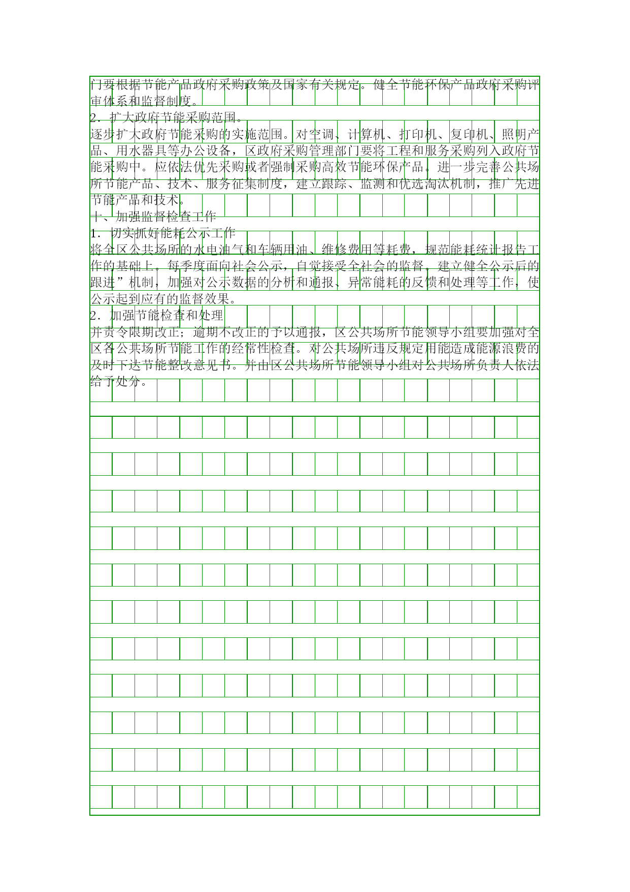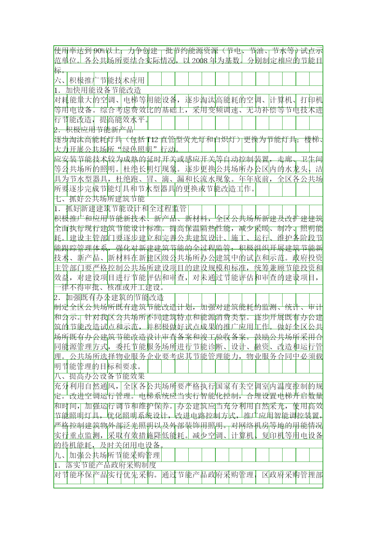 20×20公共场所节能工作方案一、成立区公共场所节能领导小组组长:略;成员:略。领导小组下设办公室:主任:副主任:二、加强公共节能培训及宣传1.大力开展节能宣传教育活动本单位、本系统,各公共场所要结合实际。有针对性地开展形式多样、内容丰富的节能宣传活动,要广泛利用各种媒介,宣传公共场所节能方针政策、法律法规及其在经济社会发展中的示范作用和重要意义,引导干部职工正确认识国情,增强节能意识,增强能源节约的紧迫感和责任感,做到人人崇尚俭朴节约,形成浪费可耻、节约光荣的良好风尚。2.构建节能工作交流平台促进公共场所节能工作和信息的交流,要利用工作研讨会、表彰会和节能技术、产品推介会等形式。激发广大干部职工的节约热情,增强节能工作的有效性。同时,要及时通报我区公共场所节能工作的进展情况和成效,宣传各单位在资源节约中的先进经验。3.做好节能培训工作分期分批对我区公共场所的物业管理人员和能耗统计人员进行节能知识培训,区政府办和有关职能部门要充分利用技术优势和信息优势。提高现有节能管理水平。同时,各公共场所要经常进行能源教育和日常节能技术、技巧培训,培养广大干部职工良好的用能、用水习惯,形成“人人节约、事事节约、处处节约”良好氛围。三、扎实开展能耗统计工作1.进行既有办公建筑分项计量改造按照先易后难、以点带面、循序推开的原则,全区公共场所的办公建筑要根据实际情况。加快既有办公建筑能源计量设施改造,逐步实现能源消耗分户、分类、分项计量,保证用能数据统计准确完善。2.建立能耗统计信息管理平台建立全区公共场所能耗数据库,依据全区公共场所能耗普查统计数据。并定期进行维护。此基础上,逐步建立起全区公共场所用能管理网络化、数字化信息平台,并根据用能情况,及时对部分能耗高的单位进行专项调查,不断提高我区公共场所用能管理效率,推动我区公共场所节能工作深入开展。四、降低公务用车油耗1.加强公务用车配置管理控制公务车辆编制和规模,严格执行公共场所公务车辆配备配置标准与管理办法。优先采购节能环保型汽车和清洁能源型汽车,加快淘汰高油耗、排放超标的车辆。2.加强公务用车日常管理完善区级公务用车档案,健全公务车辆使用管理制度。推行单车能耗核算,定期对公务用车油耗情况进行公示。加强公务用车动态管理,对公务用车车辆采购、检测维修、报废更新、能耗状况等实施动态管理,不断提高公务用车使用效率。五、降低水、电消耗(核准较上年降5%)2011年实现以下节能目标:全区公共场所单位建筑面积年耗电量(度)人均年耗水量(吨)单车耗油量(升)均下降5%节能灯具使用率达到90%以上;节能洁具使用率达到90%以上;力争创建一批节约能源资源(节电、节油、节水等)试点示范单位。各公共场所要结合实际情况,以2008年为基数。分别制定相应的节能目标。六、积极推广节能技术应用1.加快用能设备节能改造对耗能量大的空调、电梯等用能设备,逐步淘汰高能耗的空调、计算机、打印机等用电设备。综合考虑费效比的基础上,采用变频调速、无功补偿等节电技术进行节能改造,提高能效水平。2.积极应用节能新产品逐步淘汰高能耗灯具(包括T12直管型荧光灯和白炽灯)更换为节能灯具;楼梯、大力开展公共场所“绿色照明”行动。应安装节能技术较为成熟的延时开关或感应开关等自动控制装置,走廊、卫生间等公共场所的照明。杜绝长明灯现象。逐步更换公共场所办公区内的水龙头、洁具为节水型器具,杜绝跑、冒、滴、漏和长流水现象。年年底前,全区各公共场所要逐步完成节能灯具和节水型器具的更换或节能改造工作。七、抓好公共场所建筑节能1.抓好新建建筑节能设计和全过程监管积极推广和应用节能新技术、新产品、新材料,全区公共场所新建及改扩建建筑全面执行现行建筑节能设计标准。提高保温隔热性能,减少采暖、制冷、照明能耗。建设主管部门要逐步建立和完善公共建筑设计、施工、运行、维护各阶段节能跟踪管理体系,强化对新建建筑节能的全过程监管;积极组织开展建筑节能新技术、新产品、新材料在新建区级公共场所办公建筑中的试点和示范。政府投资主管部门要严格控制公共场所建设项目的建设规模和标准,统筹兼顾节能投资和效益,对建设项目进行节能评估和审查,对未通过节能评估和审查的建设项目,一律不得审批、核准或开工建设。2.加强既有办公建筑的节能改造制定全区公共场所既有建筑节能改造计划,加强对建筑能耗的监测、统计、审计和公示。针对我区公共场所不同建筑特点和能源消费类型。逐步开展既有办公建筑的节能改造试点和示范,并积极做好试点成果的推广应用工作。做好全区公共场所既有办公建筑节能改造设计审查备案和竣工验收备案。鼓励公共场所采用合同能源管理方式,委托节能服务场所进行节能诊断、设计、融资、改造和运行管理。公共场所选择物业服务企业要考虑其节能