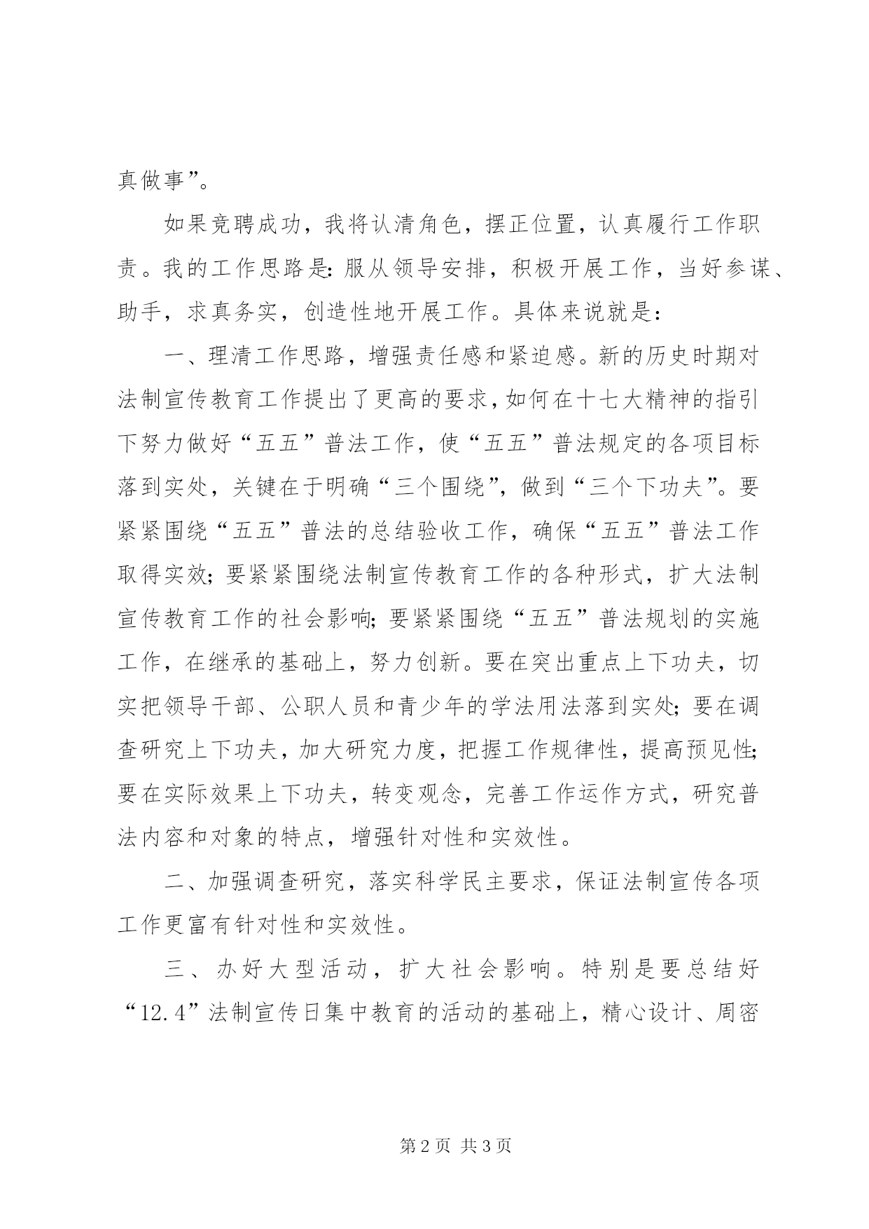 第PAGE\*Arabic\*MERGEFORMAT3页共NUMPAGES\*MERGEFORMAT3页司法局宣教科科长竞聘演讲稿尊敬的各位领导、各位评委、各位同事:大家好。首先,我要感谢组织和领导给我这次展示自我的舞台和施展才华的机会。我叫**,**年**月出生,**年**月通过国家公务员考试进入本单位。现在担任司法局公律科科员。我没有什么辉煌的过去,只求把握好现在和将来。我要竞争的岗位是宣教科科长。我认为自己有以下优势:一、从专业角度上讲是学以致用。我是法律专业科班出身,**年通过了国家司法考试,又通过了厦门大学法律系自学考试本科段的全部课程,因而能够充分发挥专业特点,便于开展法律宣传教育工作。二、在业务工作中,我始终本着严谨认真的工作态度和勤劳务实的工作作风,爱岗敬业,刻苦钻研,勤奋工作,坚忍不拔。在实践工作中也积累了一定的经验,能够经得起各项工作的考验。三、从性格上讲,我一直是光明磊落,以诚待人,品行正派,愿意和每一位同志建立健康的、友善的人际关系。我始终信守:关心和帮助同志是做人的基本准则。我有着吃苦耐劳、默默无闻的奉献精神,深深懂得“宝剑锋从磨砺出,梅花香自苦寒来”的道理;我有着虚心好学、开拓进取的创新意识;我有着严于律己、诚信为本的优良品质。我的人生格言是“堂堂正正做人,认认真真做事”。如果竞聘成功,我将认清角色,摆正位置,认真履行工作职责。我的工作思路是:服从领导安排,积极开展工作,当好参谋、助手,求真务实,创造性地开展工作。具体来说就是:一、理清工作思路,增强责任感和紧迫感。新的历史时期对法制宣传教育工作提出了更高的要求,如何在十七大精神的指引下努力做好“五五”普法工作,使“五五”普法规定的各项目标落到实处,关键在于明确“三个围绕”,做到“三个下功夫”。要紧紧围绕“五五”普法的总结验收工作,确保“五五”普法工作取得实效;要紧紧围绕法制宣传教育工作的各种形式,扩大法制宣传教育工作的社会影响;要紧紧围绕“五五”普法规划的实施工作,在继承的基础上,努力创新。要在突出重点上下功夫,切实把领导干部、公职人员和青少年的学法用法落到实处;要在调查研究上下功夫,加大研究力度,把握工作规律性,提高预见性;要在实际效果上下功夫,转变观念,完善工作运作方式,研究普法内容和对象的特点,增强针对性和实效性。二、加强调查研究,落实科学民主要求,保证法制宣传各项工作更富有针对性和实效性。三、办好大型活动,扩大社会影响。特别是要总结好“12.4”法制宣传日集中教育的活动的基础上,精心设计、周密安排、认真实施,开展多种形式的普法20周年纪念活动。