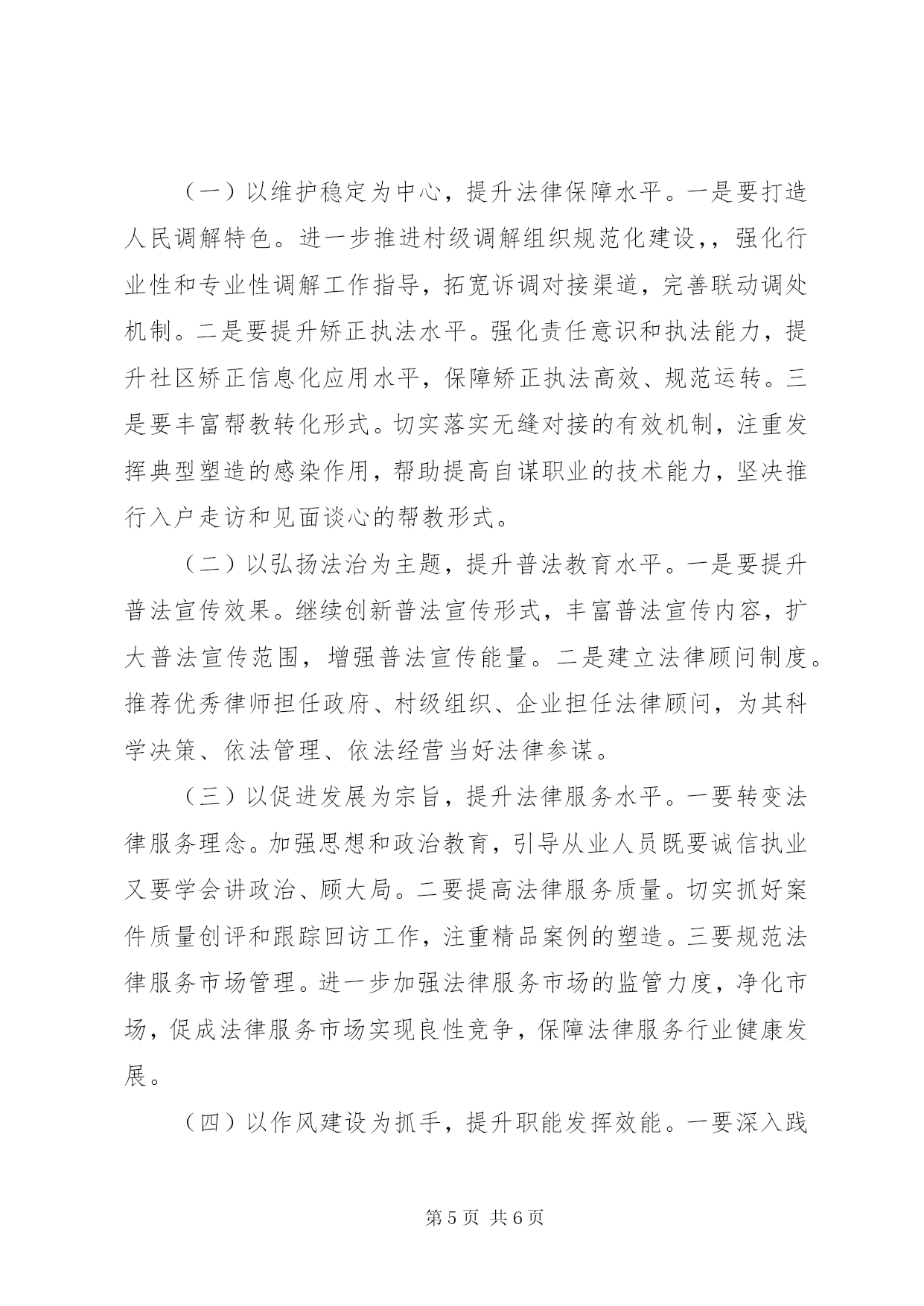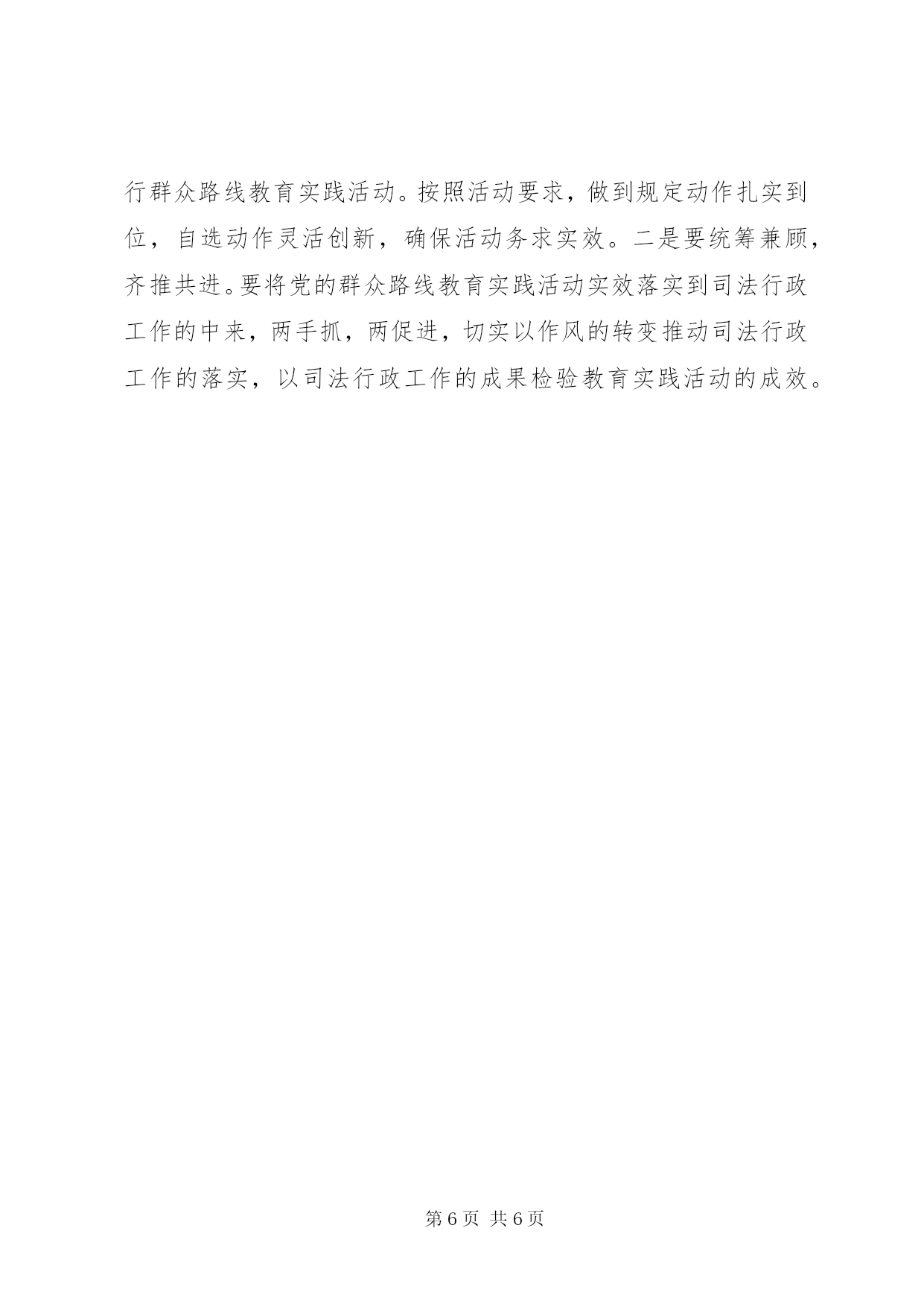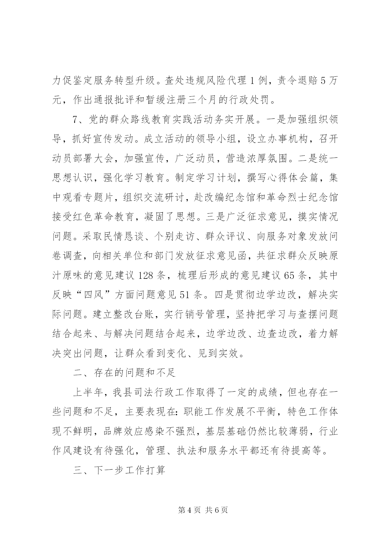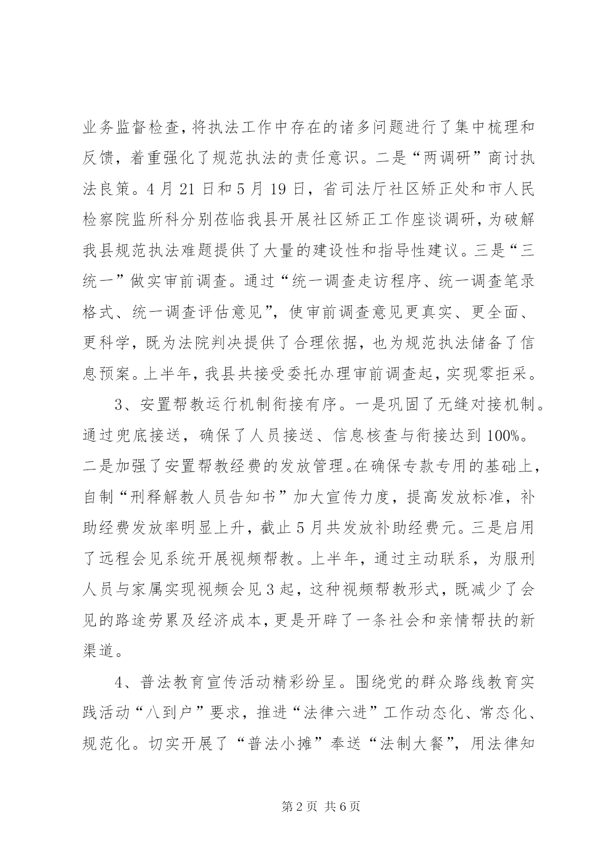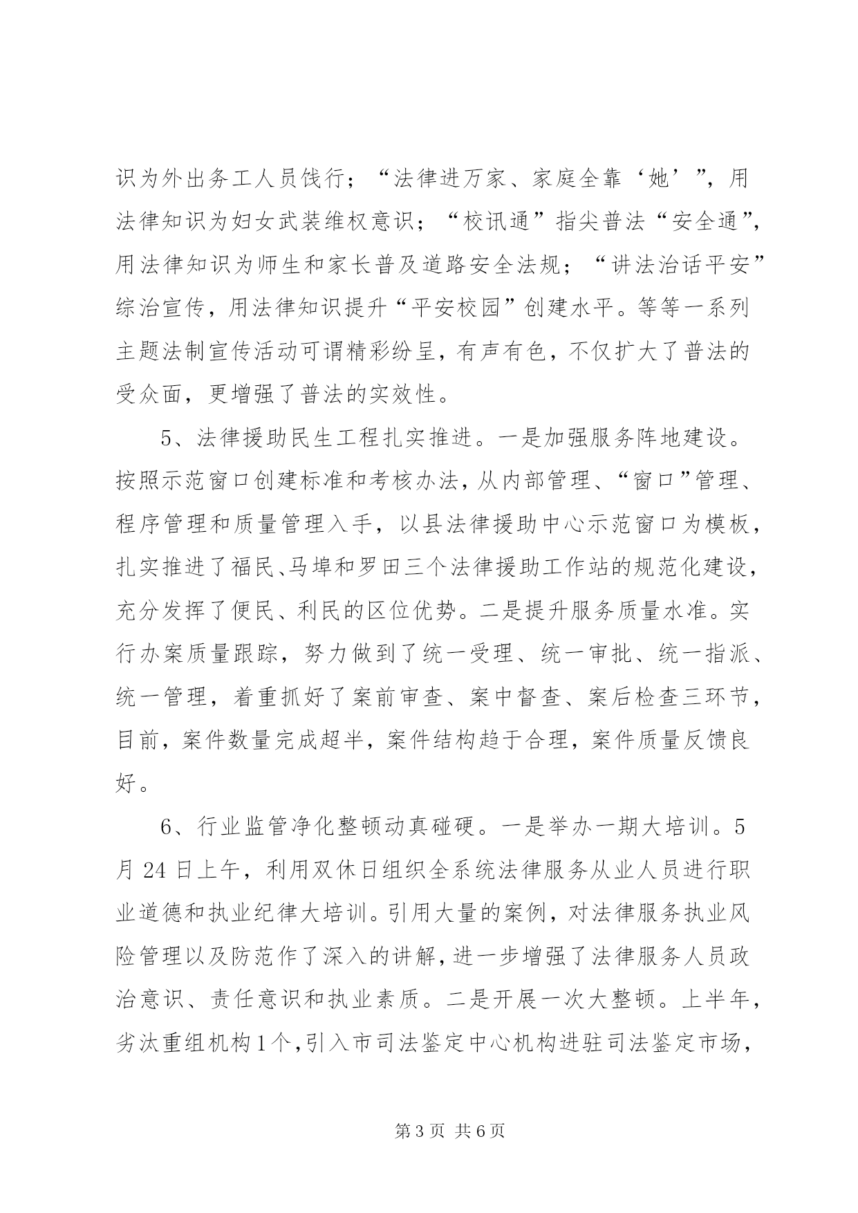 第PAGE\*Arabic\*MERGEFORMAT6页共NUMPAGES\*MERGEFORMAT6页司法行政系统上半年工作总结2014年上半年,我县司法行政工作紧密结合党的群众路线教育实践活动,按照“抓班子,带队伍,促工作,建和谐”的总体工作思路,坚决落实“维护社会大局稳定、促进社会公平正义、保障人民安居乐业”三大主要任务,为我县经济发展和社会稳定提供了优质高效的法律服务和法律保障。一、主要做法及成效1、人民调解实效举措作用明显。一是提高了“以案定补”的标准。在落实人民调解岗位津贴:16元/人、月基础上,将大案补贴:200-300元/件调整为个案补贴:200-300元/件、大案补贴:500-800元/件,有效激活了机制,增强了调解积极性。二是完善了医疗纠纷预防和调处机制。帮助医疗系统制定了科学的《医疗责任事故过错责任追究制度》,明确医生、科室和医院三方的赔付责任比例,增强了责任意识;启动“维护医疗秩序、打击渉医违法犯罪”专项行动,成立了“平安医院”创建工作机构,维护了医疗秩序;加大了《省医疗纠纷预防与处理条例》学习宣传,畅通了医患沟通信息。三是加大了“杨慧芝调解工作法”的推广。集中组织了《金牌调解-杨慧芝》经典调解案例的学习交流,使全县基层人民调解员学有榜样、追有目标、赶有动力。2、社区矫正规范执法酝酿充分。一是“一检查”掌握执法实情。年初,县检察院XX县区司法局联合开展了社区矫正专项业务监督检查,将执法工作中存在的诸多问题进行了集中梳理和反馈,着重强化了规范执法的责任意识。二是“两调研”商讨执法良策。4月21日和5月19日,省司法厅社区矫正处和市人民检察院监所科分别莅临我县开展社区矫正工作座谈调研,为破解我县规范执法难题提供了大量的建设性和指导性建议。三是“三统一”做实审前调查。通过“统一调查走访程序、统一调查笔录格式、统一调查评估意见”,使审前调查意见更真实、更全面、更科学,既为法院判决提供了合理依据,也为规范执法储备了信息预案。上半年,我县共接受委托办理审前调查起,实现零拒采。3、安置帮教运行机制衔接有序。一是巩固了无缝对接机制。通过兜底接送,确保了人员接送、信息核查与衔接达到100%。二是加强了安置帮教经费的发放管理。在确保专款专用的基础上,自制“刑释解教人员告知书”加大宣传力度,提高发放标准,补助经费发放率明显上升,截止5月共发放补助经费元。三是启用了远程会见系统开展视频帮教。上半年,通过主动联系,为服刑人员与家属实现视频会见3起,这种视频帮教形式,既减少了会见的路途劳累及经济成本,更是开辟了一条社会和亲情帮扶的新渠道。4、普法教育宣传活动精彩纷呈。围绕党的群众路线教育实践活动“八到户”要求,推进“法律六进”工作动态化、常态化、规范化。切实开展了“普法小摊”奉送“法制大餐”,用法律知识为外出务工人员饯行;“法律进万家、家庭全靠‘她’”,用法律知识为妇女武装维权意识;“校讯通”指尖普法“安全通”,用法律知识为师生和家长普及道路安全法规;“讲法治话平安”综治宣传,用法律知识提升“平安校园”创建水平。等等一系列主题法制宣传活动可谓精彩纷呈,有声有色,不仅扩大了普法的受众面,更增强了普法的实效性。5、法律援助民生工程扎实推进。一是加强服务阵地建设。按照示范窗口创建标准和考核办法,从内部管理、“窗口”管理、程序管理和质量管理入手,以县法律援助中心示范窗口为模板,扎实推进了福民、马埠和罗田三个法律援助工作站的规范化建设,充分发挥了便民、利民的区位优势。二是提升服务质量水准。实行办案质量跟踪,努力做到了统一受理、统一审批、统一指派、统一管理,着重抓好了案前审查、案中督查、案后检查三环节,目前,案件数量完成超半,案件结构趋于合理,案件质量反馈良好。6、行业监管净化整顿动真碰硬。一是举办一期大培训。5月24日上午,利用双休日组织全系统法律服务从业人员进行职业道德和执业纪律大培训。引用大量的案例,对法律服务执业风险管理以及防范作了深入的讲解,进一步增强了法律服务人员政治意识、责任意识和执业素质。二是开展一次大整顿。上半年,劣汰重组机构1个,引入市司法鉴定中心机构进驻司法鉴定市场,力促鉴定服务转型升级。查处违规风险代理1例,责令退赔5万元,作出通报批评和暂缓注册三个月的行政处罚。7、党的群众路线教育实践活动务实开展。一是加强组织领导,抓好宣传发动。成立活动的领导小组,设立办事机构,召开动员部署大会,加强宣传,广泛动员,营造浓厚氛围。二是统一思想认识,强化学习教育。制定学习计划,撰写心得体会篇,集中观看专题片,组织交流研讨,赴改编纪念馆和革命烈士纪念馆接受红色革命教育,凝固了思想。三是广泛征求意见,摸实情况问题。采取民情恳谈、个别走访、群众评议、向服务对象发放问卷调查,向相关单位和部门发放征求意见函,共征求群众