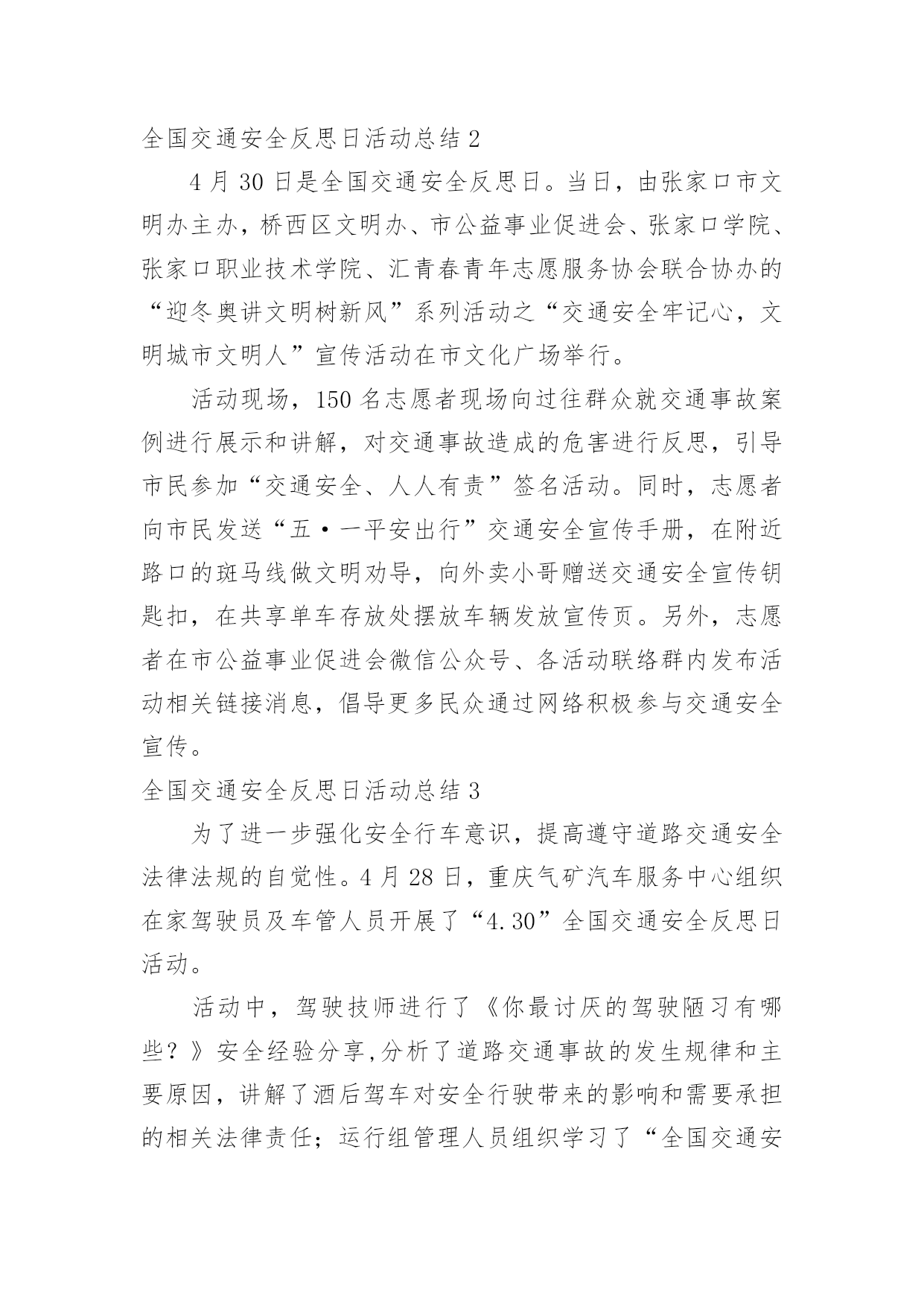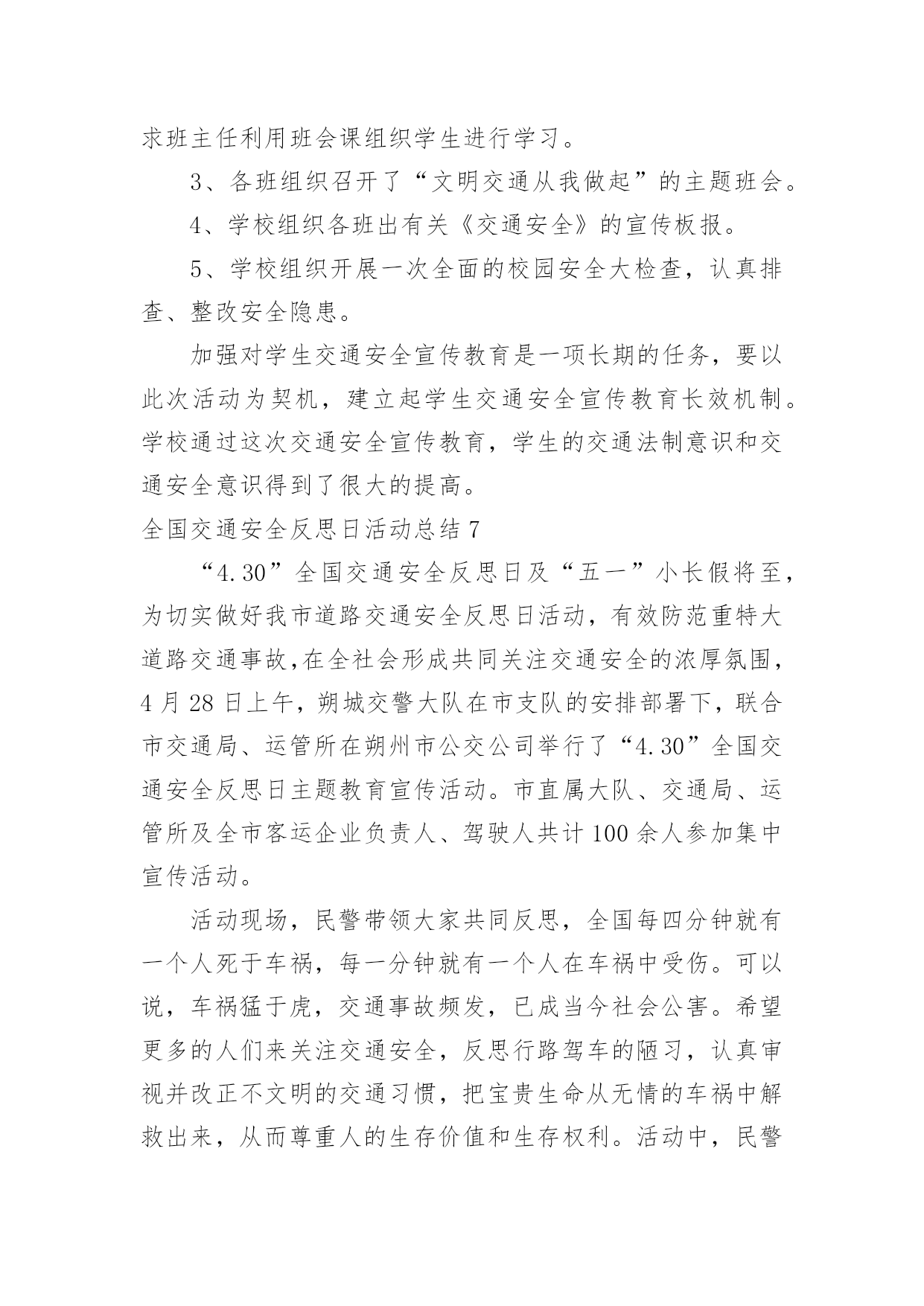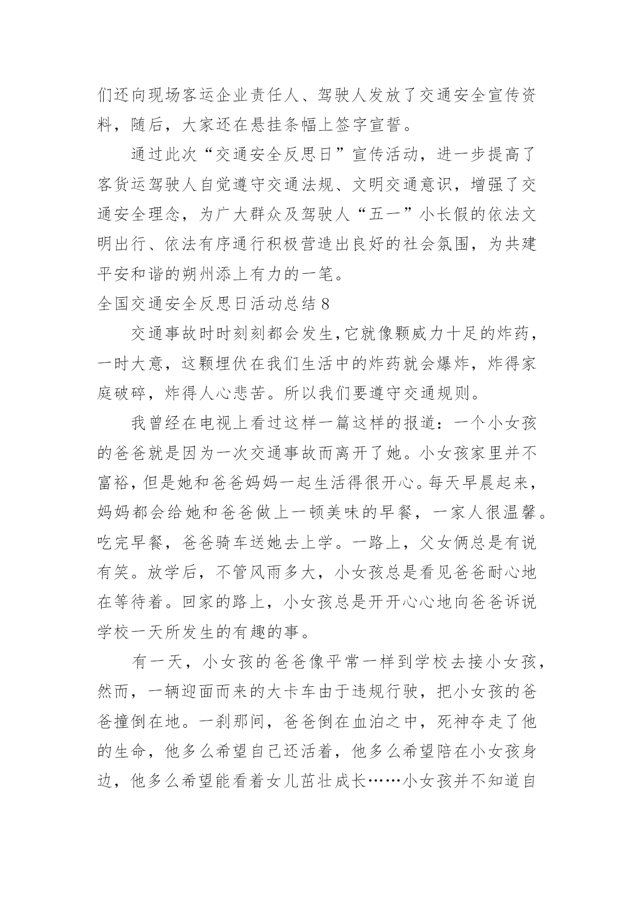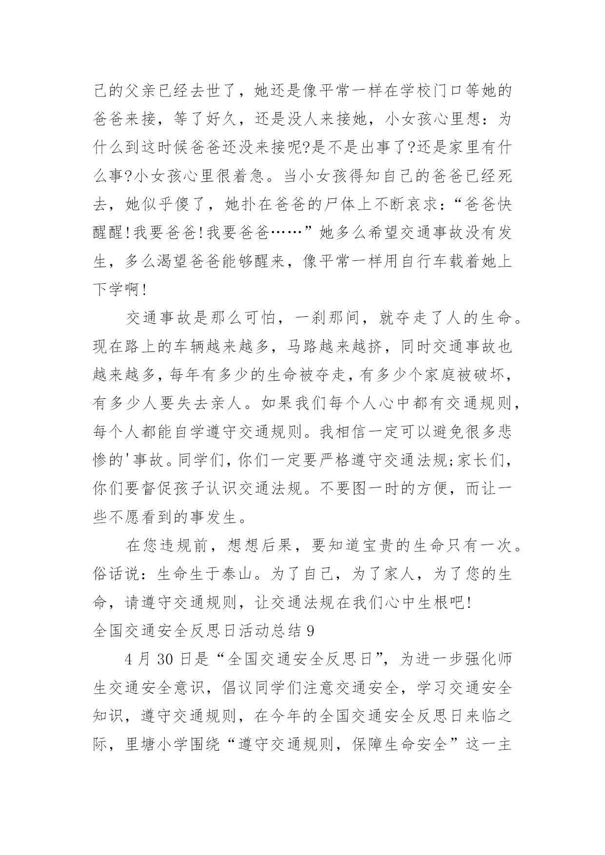 全国交通安全反思日活动总结全国交通安全反思日活动总结15篇总结是在某一特定时间段对学习和工作生活或其完成情况,包括取得的成绩、存在的问题及得到的经验和教训加以回顾和分析的书面材料,通过它可以正确认识以往学习和工作中的优缺点,是时候写一份总结了。那么你知道总结如何写吗?下面是小编整理的全国交通安全反思日活动总结,欢迎阅读,希望大家能够喜欢。全国交通安全反思日活动总结1安全是什么?安全是一个企业的生命,安全是一个家庭的幸福,是平安,更是一份珍爱人生的态度。春天去了还会来,花儿谢了还会开,然而,生命只拥有一次,安全上班,安全回家,安全学习,安全生活,会让亲人少一份牵挂,多一份宽慰,家庭多一份快乐。为了更好地提高同学们的安全意识,老师带领我们观看《全国道路交通事故典型案例警示片》。观看影片时心情很沉痛,播放的事故都是发生在我们身边的实人实事,事故所给本人及家庭带来的不幸也使我感到同情与遗憾。现在公路上的车辆川流不息,但许多人的交通意识淡薄,在车水马龙的公路上上演了一幕幕不可挽回的悲剧,一个个鲜活的生命消失于无情的车轮之下,有多少人因交通事故而失去自己宝贵的生命,有多少幸福美满的家庭妻离子散,家破人亡?而导致悲剧发生的一个重要原因,就是我们欠缺交通安全知识,自我保护能力太差。交通安全,是全世界真切呼吁的话题,是人类一个又一个永恒的话题。人的生命只有一次,生命的大权时刻掌握在自己的手中,而不是听天由命。也许你认为,我不开车,也很少坐车,这些事故似乎离我很遥远,有这种想法的人不在少数。但是事实证明,在大量的交通事故中,车祸中的伤亡者,并非都是汽车司机和乘客,路上的行人受到伤害的也不在少数。横穿公路,翻越公路中的隔离栏,隔离墩,闯红灯,不按规定行走,进入高速公路行走等这些违章行为,是交通事故中造成行人伤亡的最主要原因。由于人们严重缺乏忧患意识,交通安全法规意识淡薄,交通事故总在血淋淋的教训中诞生,血的教训再次提醒我们不要重蹈覆辙,“前车之鉴,后事之师”只有牢记这些惨痛的教训才能让心中的警钟长鸣。关爱生命,安全出行。希望大家可以通过观看本次交通安全影碟对交通安全有全新的认识以及树立正确的交通安全意识。“世界万物,唯有生命最为珍贵。没有生命就没有一切!失去生命就失去自我,失去生活的权利!”看完安全警示片让我更加真切,更加直观地感受到了安全的千钧之重,感受到了生命的弥足珍贵!什么都可以重来,唯有生命只给我们一次机会。希望我们每一个人能牢记安全,学好安全,用好安全!如果你爱你得家人,就请你首先珍惜自己的生命!全国交通安全反思日活动总结24月30日是全国交通安全反思日。当日,由张家口市文明办主办,桥西区文明办、市公益事业促进会、张家口学院、张家口职业技术学院、汇青春青年志愿服务协会联合协办的“迎冬奥讲文明树新风”系列活动之“交通安全牢记心,文明城市文明人”宣传活动在市文化广场举行。活动现场,150名志愿者现场向过往群众就交通事故案例进行展示和讲解,对交通事故造成的危害进行反思,引导市民参加“交通安全、人人有责”签名活动。同时,志愿者向市民发送“五·一平安出行”交通安全宣传手册,在附近路口的斑马线做文明劝导,向外卖小哥赠送交通安全宣传钥匙扣,在共享单车存放处摆放车辆发放宣传页。另外,志愿者在市公益事业促进会微信公众号、各活动联络群内发布活动相关链接消息,倡导更多民众通过网络积极参与交通安全宣传。全国交通安全反思日活动总结3为了进一步强化安全行车意识,提高遵守道路交通安全法律法规的自觉性。4月28日,重庆气矿汽车服务中心组织在家驾驶员及车管人员开展了“4.30”全国交通安全反思日活动。活动中,驾驶技师进行了《你最讨厌的驾驶陋习有哪些?》安全经验分享,分析了道路交通事故的发生规律和主要原因,讲解了酒后驾车对安全行驶带来的影响和需要承担的相关法律责任;运行组管理人员组织学习了“全国交通安全反思日”由来、目的和意义及《夏季行车安全提示》,同时展出了部分交通事故图片和观看了《校车事故》交通安全警示教育片,通过一个个血淋淋的事故教训,震撼人心,再一次提醒驾驶员进一步增强行车安全意识,自觉做到“酒后不开车,开车不超速”。最后,与会驾驶员人员纷纷表示:遵守交通规则,坚决做到安全出行,对于那些漠视自己和他人生命,对国家、对社会、对家庭不负责任造成不可挽回损失的行为和做法坚决抵制,确保中心保持良好的交通安全形势。全国交通安全反思日活动总结44月30日是“全国交通安全反思日”。为进一步加强我县学校交通法规宣传工作,提高广大师生交通安全法规意识和文明交通意识,增强中小学生自觉遵守交通法规,维护交通秩序,自我防范与保护能力,避免发生道路交通安全事故,在第九个全国交通安全反思日来临之际,青龙县教育局利用开展以“遵守交通规则,保障生命安全”为主题的交通安全宣传教育活动。本次“全国