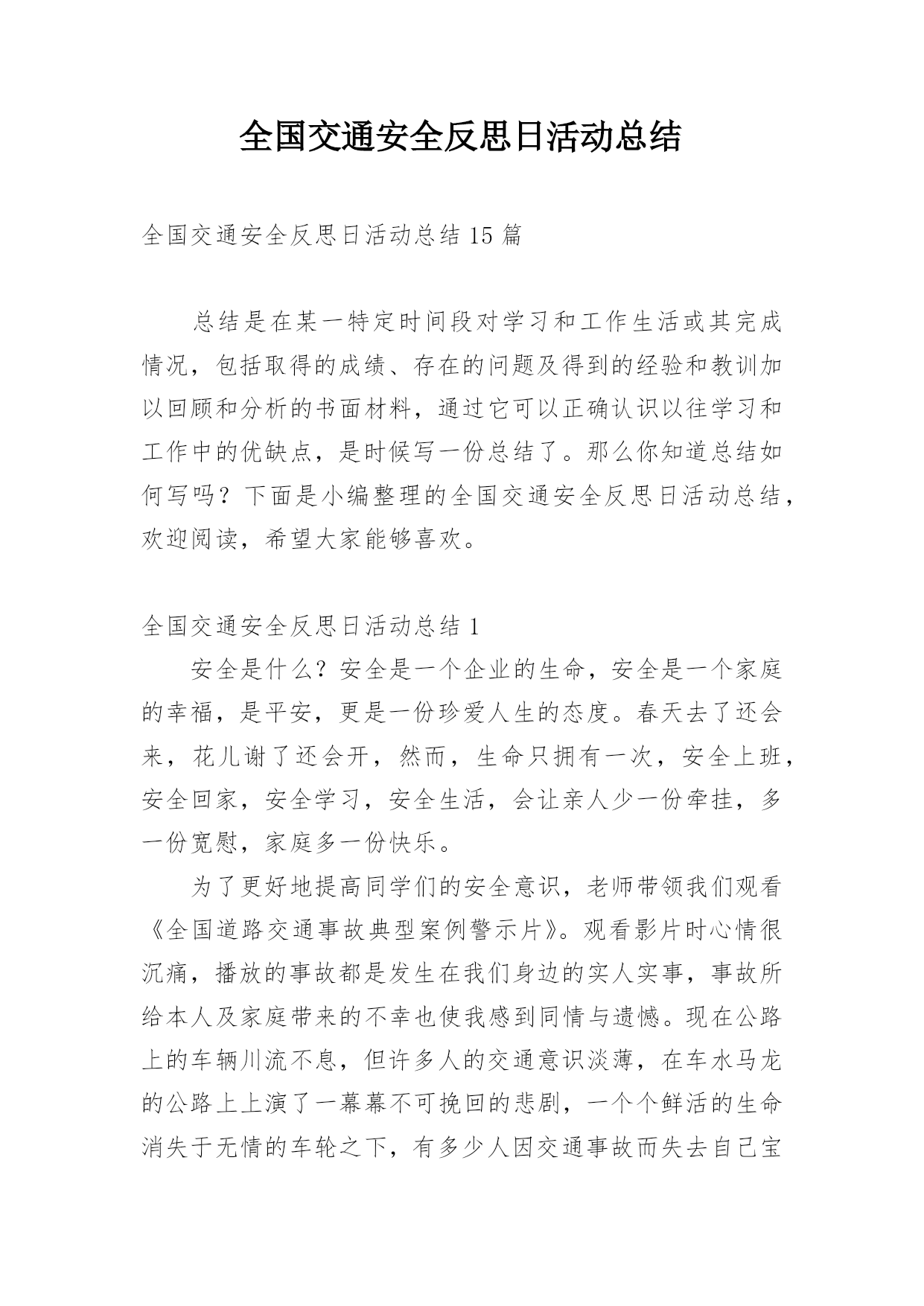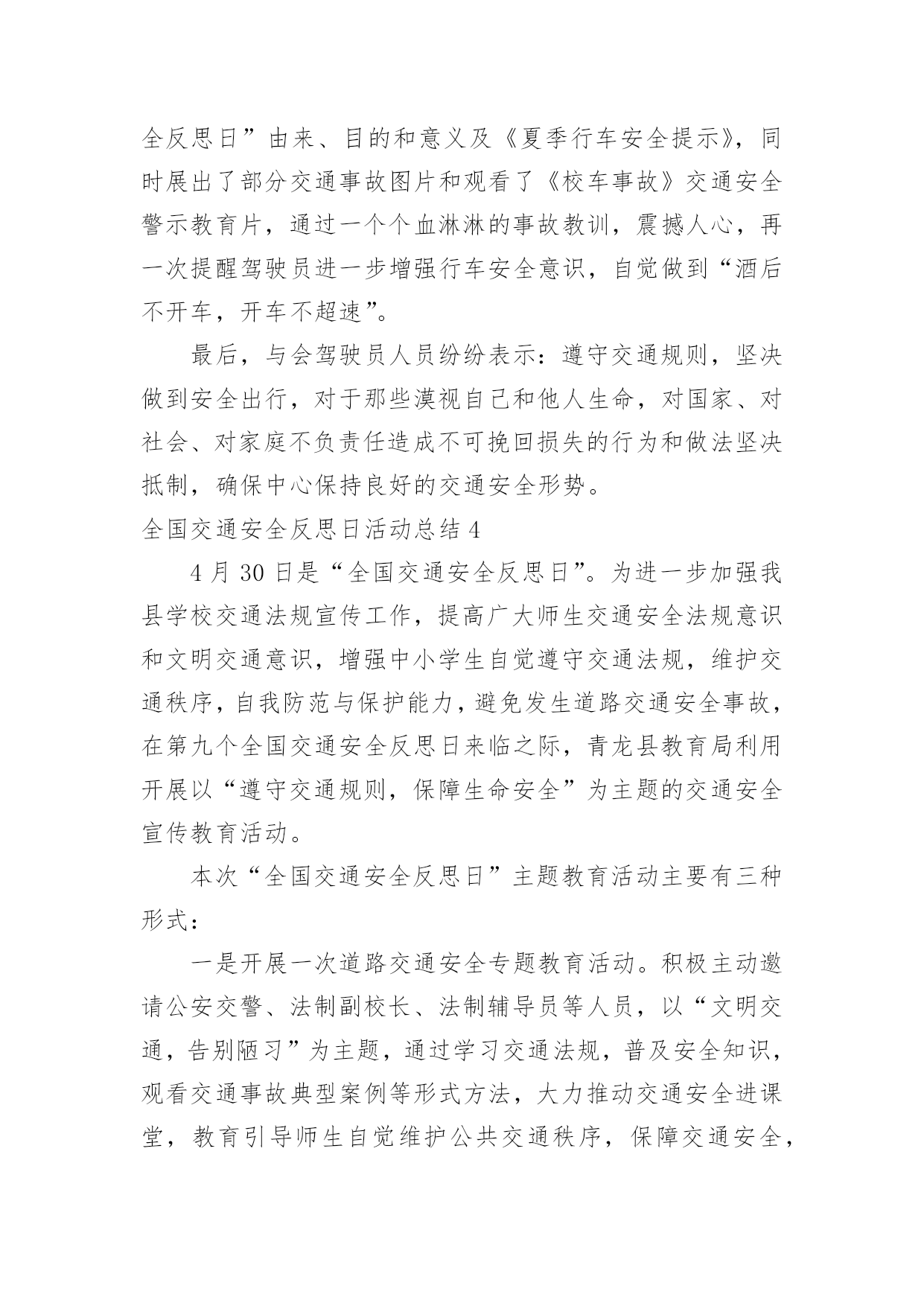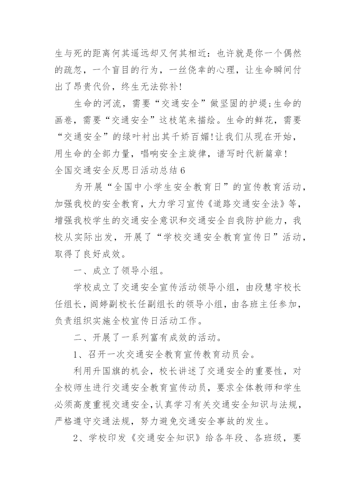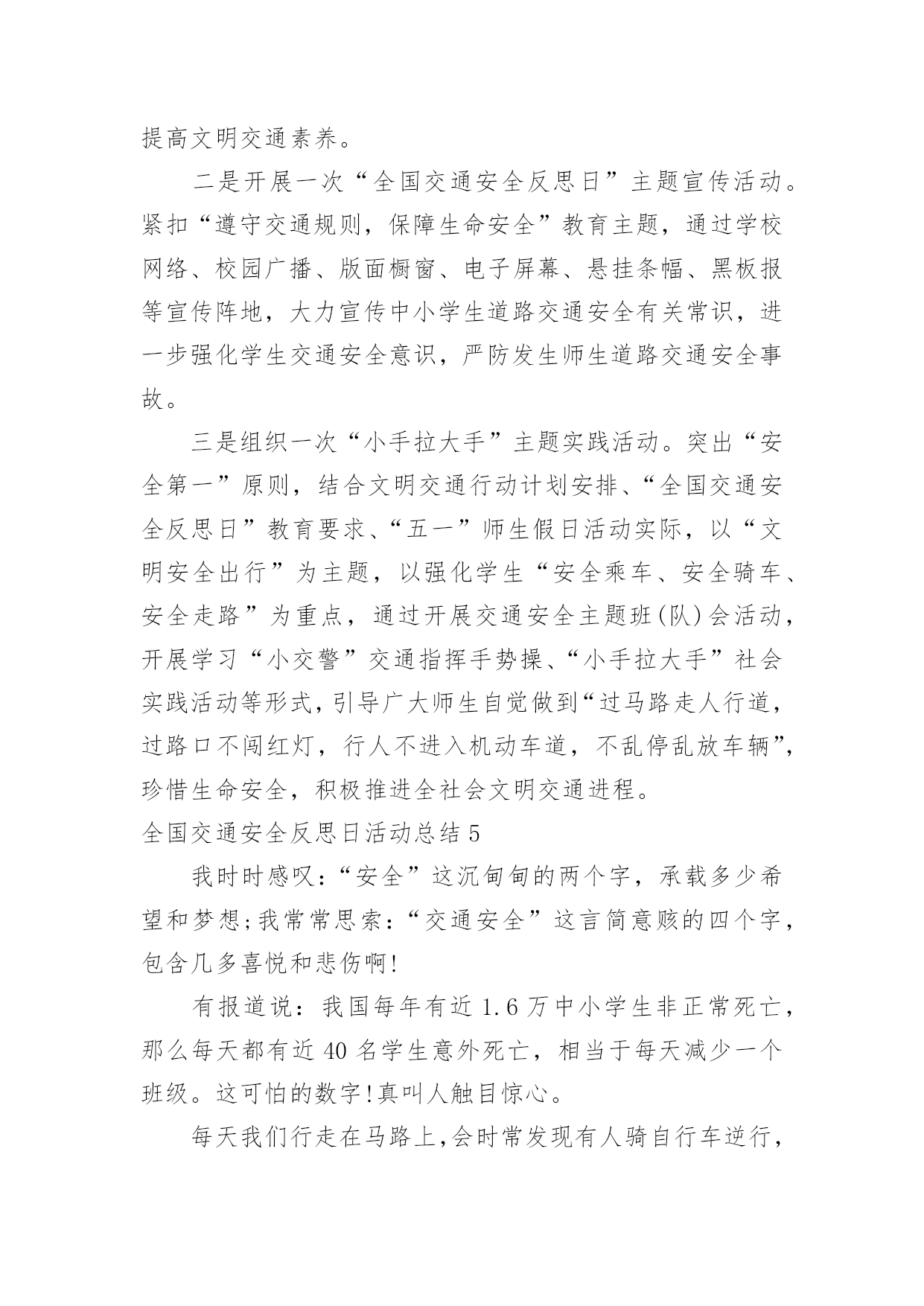 全国交通安全反思日活动总结全国交通安全反思日活动总结15篇总结是在某一特定时间段对学习和工作生活或其完成情况,包括取得的成绩、存在的问题及得到的经验和教训加以回顾和分析的书面材料,通过它可以正确认识以往学习和工作中的优缺点,是时候写一份总结了。那么你知道总结如何写吗?下面是小编整理的全国交通安全反思日活动总结,欢迎阅读,希望大家能够喜欢。全国交通安全反思日活动总结1安全是什么?安全是一个企业的生命,安全是一个家庭的幸福,是平安,更是一份珍爱人生的态度。春天去了还会来,花儿谢了还会开,然而,生命只拥有一次,安全上班,安全回家,安全学习,安全生活,会让亲人少一份牵挂,多一份宽慰,家庭多一份快乐。为了更好地提高同学们的安全意识,老师带领我们观看《全国道路交通事故典型案例警示片》。观看影片时心情很沉痛,播放的事故都是发生在我们身边的实人实事,事故所给本人及家庭带来的不幸也使我感到同情与遗憾。现在公路上的车辆川流不息,但许多人的交通意识淡薄,在车水马龙的公路上上演了一幕幕不可挽回的悲剧,一个个鲜活的生命消失于无情的车轮之下,有多少人因交通事故而失去自己宝贵的生命,有多少幸福美满的家庭妻离子散,家破人亡?而导致悲剧发生的一个重要原因,就是我们欠缺交通安全知识,自我保护能力太差。交通安全,是全世界真切呼吁的话题,是人类一个又一个永恒的话题。人的生命只有一次,生命的大权时刻掌握在自己的手中,而不是听天由命。也许你认为,我不开车,也很少坐车,这些事故似乎离我很遥远,有这种想法的人不在少数。但是事实证明,在大量的交通事故中,车祸中的伤亡者,并非都是汽车司机和乘客,路上的行人受到伤害的也不在少数。横穿公路,翻越公路中的隔离栏,隔离墩,闯红灯,不按规定行走,进入高速公路行走等这些违章行为,是交通事故中造成行人伤亡的最主要原因。由于人们严重缺乏忧患意识,交通安全法规意识淡薄,交通事故总在血淋淋的教训中诞生,血的教训再次提醒我们不要重蹈覆辙,“前车之鉴,后事之师”只有牢记这些惨痛的教训才能让心中的警钟长鸣。关爱生命,安全出行。希望大家可以通过观看本次交通安全影碟对交通安全有全新的认识以及树立正确的交通安全意识。“世界万物,唯有生命最为珍贵。没有生命就没有一切!失去生命就失去自我,失去生活的权利!”看完安全警示片让我更加真切,更加直观地感受到了安全的千钧之重,感受到了生命的弥足珍贵!什么都可以重来,唯有生命只给我们一次机会。希望我们每一个人能牢记安全,学好安全,用好安全!如果你爱你得家人,就请你首先珍惜自己的生命!全国交通安全反思日活动总结24月30日是全国交通安全反思日。当日,由张家口市文明办主办,桥西区文明办、市公益事业促进会、张家口学院、张家口职业技术学院、汇青春青年志愿服务协会联合协办的“迎冬奥讲文明树新风”系列活动之“交通安全牢记心,文明城市文明人”宣传活动在市文化广场举行。活动现场,150名志愿者现场向过往群众就交通事故案例进行展示和讲解,对交通事故造成的危害进行反思,引导市民参加“交通安全、人人有责”签名活动。同时,志愿者向市民发送“五·一平安出行”交通安全宣传手册,在附近路口的斑马线做文明劝导,向外卖小哥赠送交通安全宣传钥匙扣,在共享单车存放处摆放车辆发放宣传页。另外,志愿者在市公益事业促进会微信公众号、各活动联络群内发布活动相关链接消息,倡导更多民众通过网络积极参与交通安全宣传。全国交通安全反思日活动总结3为了进一步强化安全行车意识,提高遵守道路交通安全法律法规的自觉性。4月28日,重庆气矿汽车服务中心组织在家驾驶员及车管人员开展了“4.30”全国交通安全反思日活动。活动中,驾驶技师进行了《你最讨厌的驾驶陋习有哪些?》安全经验分享,分析了道路交通事故的发生规律和主要原因,讲解了酒后驾车对安全行驶带来的影响和需要承担的相关法律责任;运行组管理人员组织学习了“全国交通安全反思日”由来、目的和意义及《夏季行车安全提示》,同时展出了部分交通事故图片和观看了《校车事故》交通安全警示教育片,通过一个个血淋淋的事故教训,震撼人心,再一次提醒驾驶员进一步增强行车安全意识,自觉做到“酒后不开车,开车不超速”。最后,与会驾驶员人员纷纷表示:遵守交通规则,坚决做到安全出行,对于那些漠视自己和他人生命,对国家、对社会、对家庭不负责任造成不可挽回损失的行为和做法坚决抵制,确保中心保持良好的交通安全形势。全国交通安全反思日活动总结44月30日是“全国交通安全反思日”。为进一步加强我县学校交通法规宣传工作,提高广大师生交通安全法规意识和文明交通意识,增强中小学生自觉遵守交通法规,维护交通秩序,自我防范与保护能力,避免发生道路交通安全事故,在第九个全国交通安全反思日来临之际,青龙县教育局利用开展以“遵守交通规则,保障生命安全”为主题的交通安全宣传教育活动。本次“全国